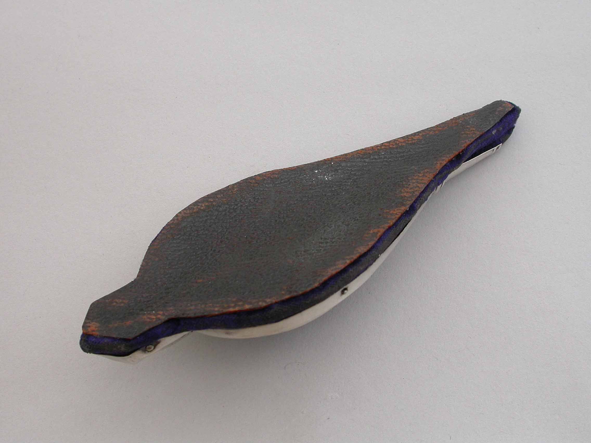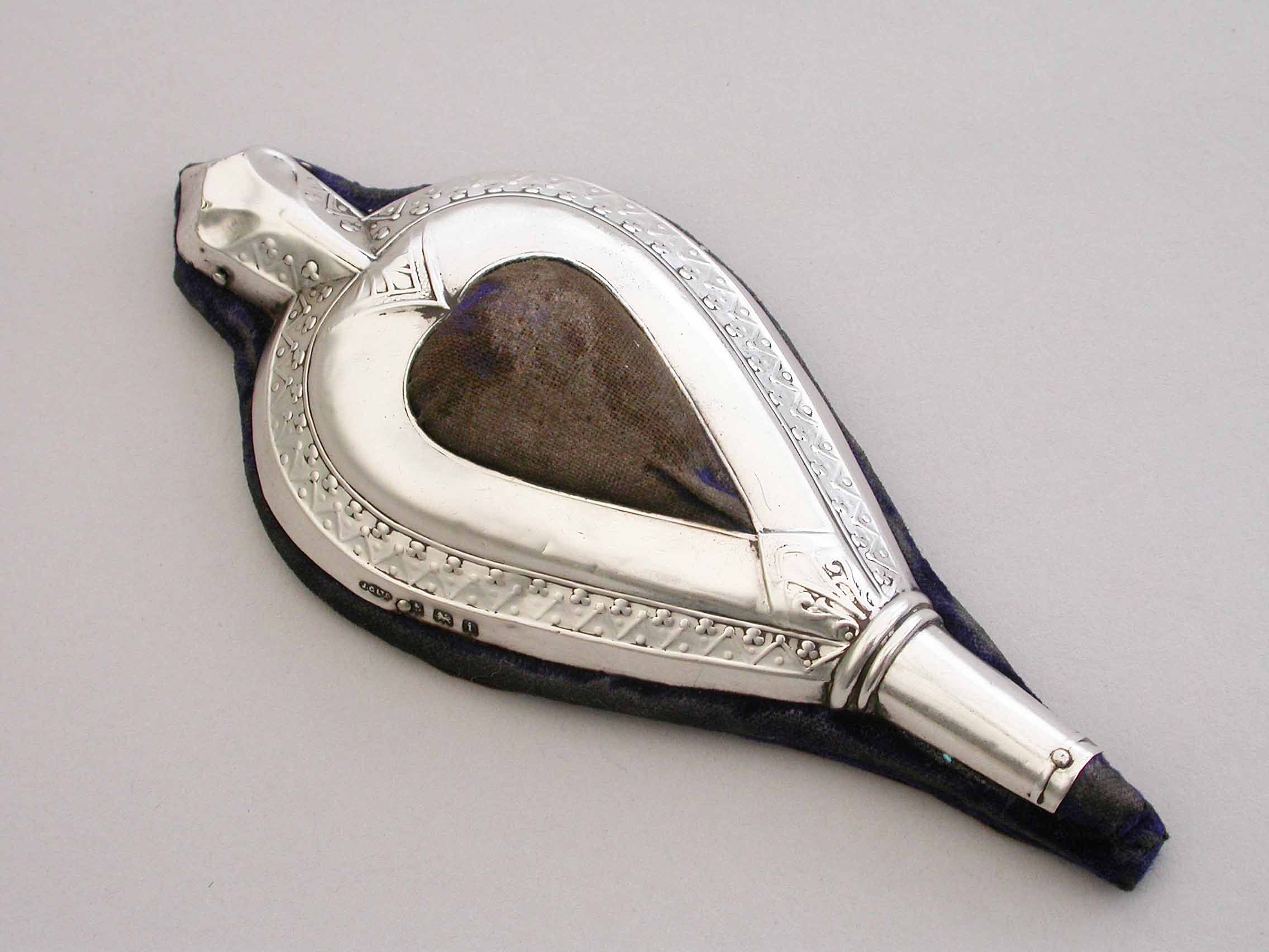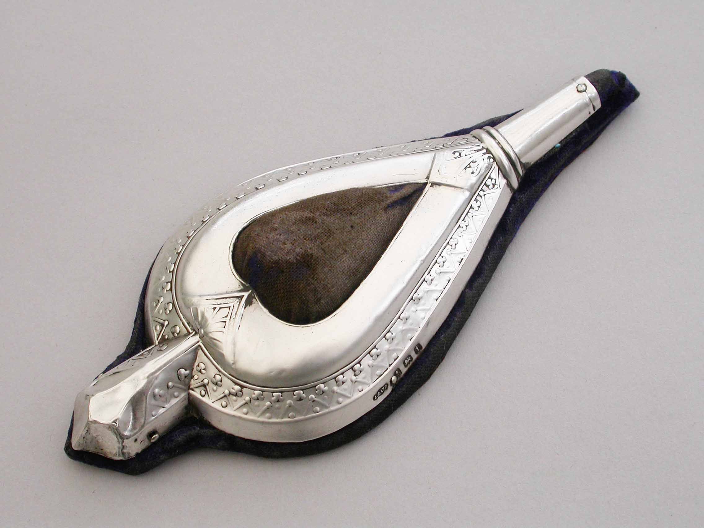 An Edwardian novelty silver pin cushion, made in the form of a vintage pair of bellows, with embossed silver frame and original blue velvet cushion.