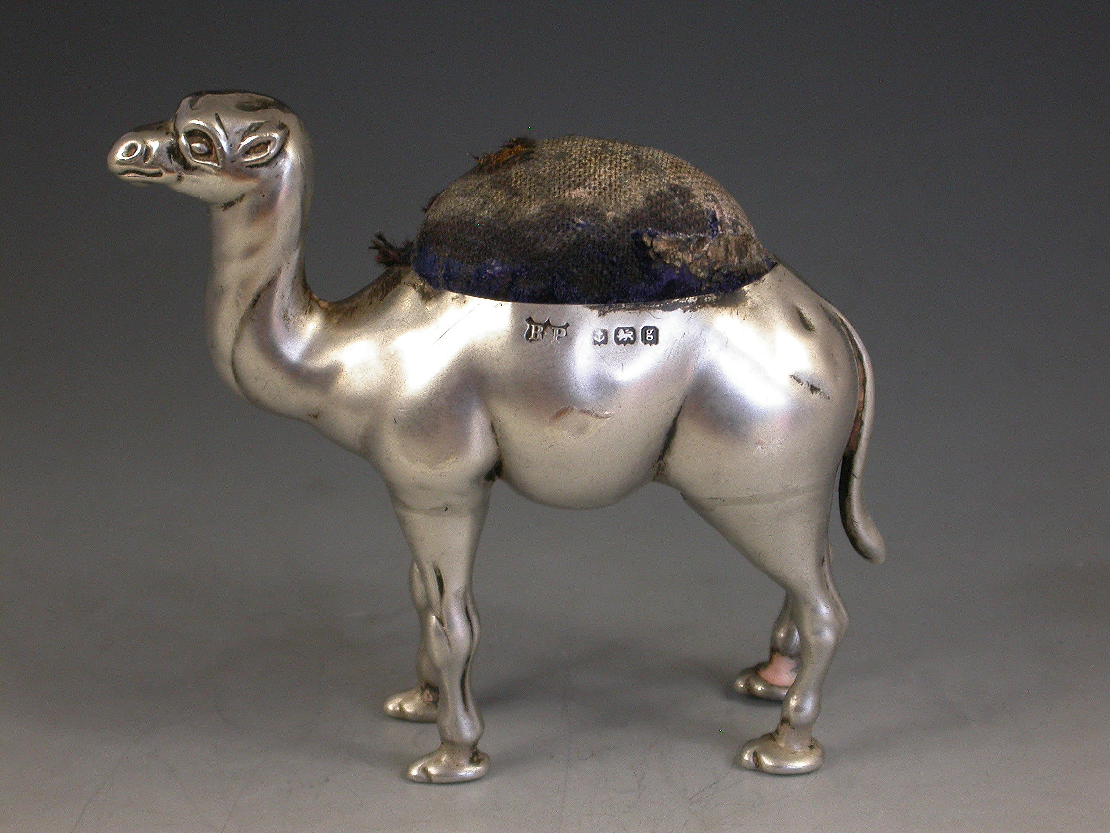 A rare Edwardian silver Pin Cushion modelled as a standing Camel. Complete with original blue velvet cushion.