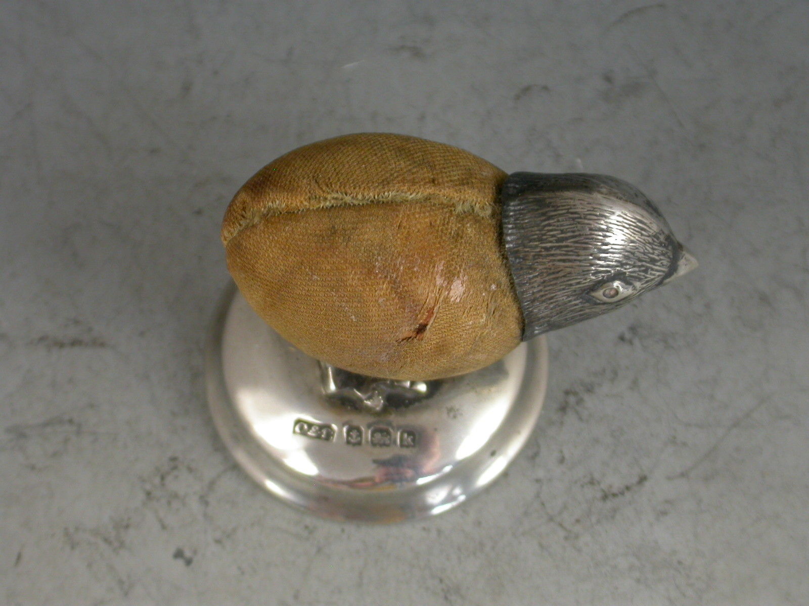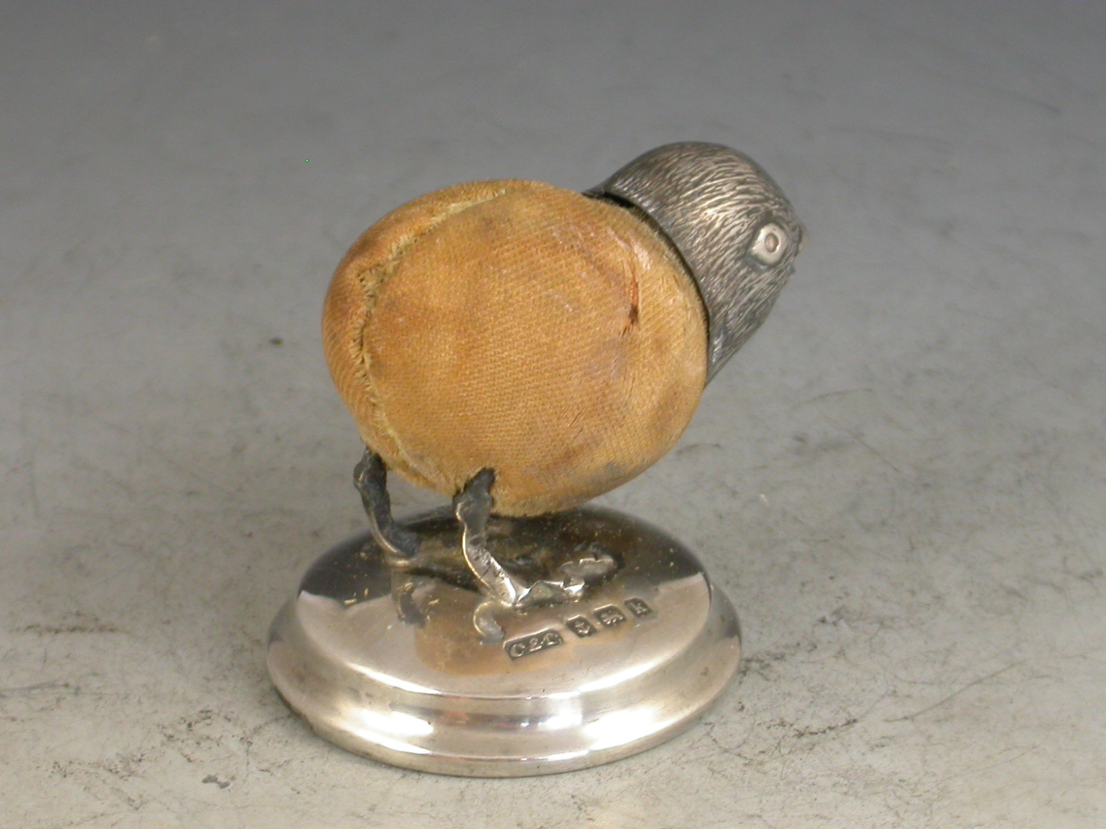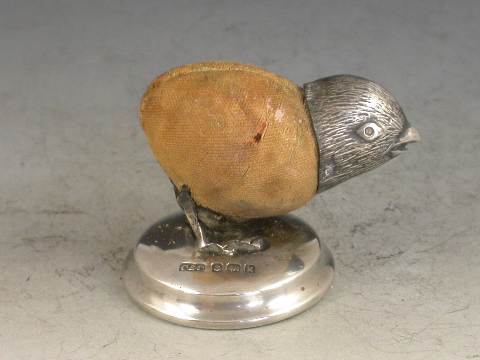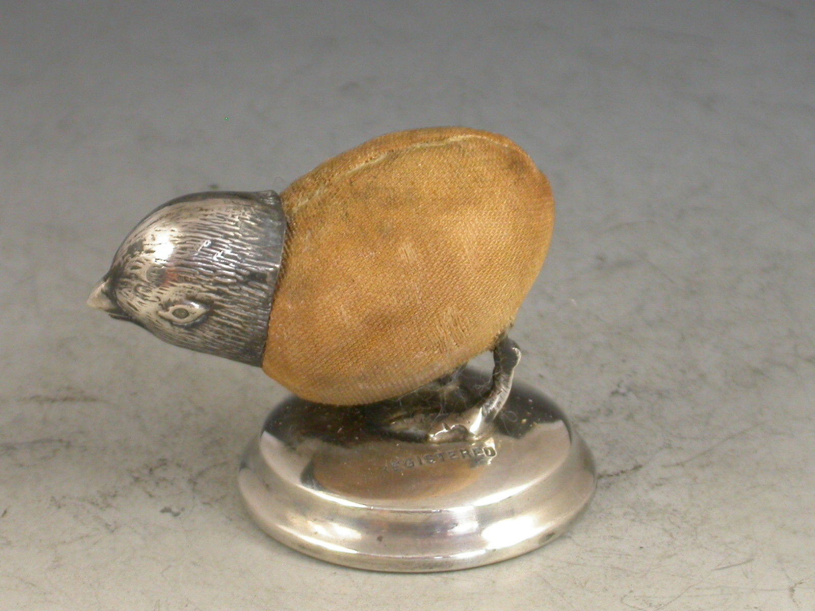 An unusual Edwardian novelty silver Pin Cushion made in the form of a chick standing on a circular pedestal base, the silver head attached to the egg shaped body covered in a hessian type material and forming the cushion.