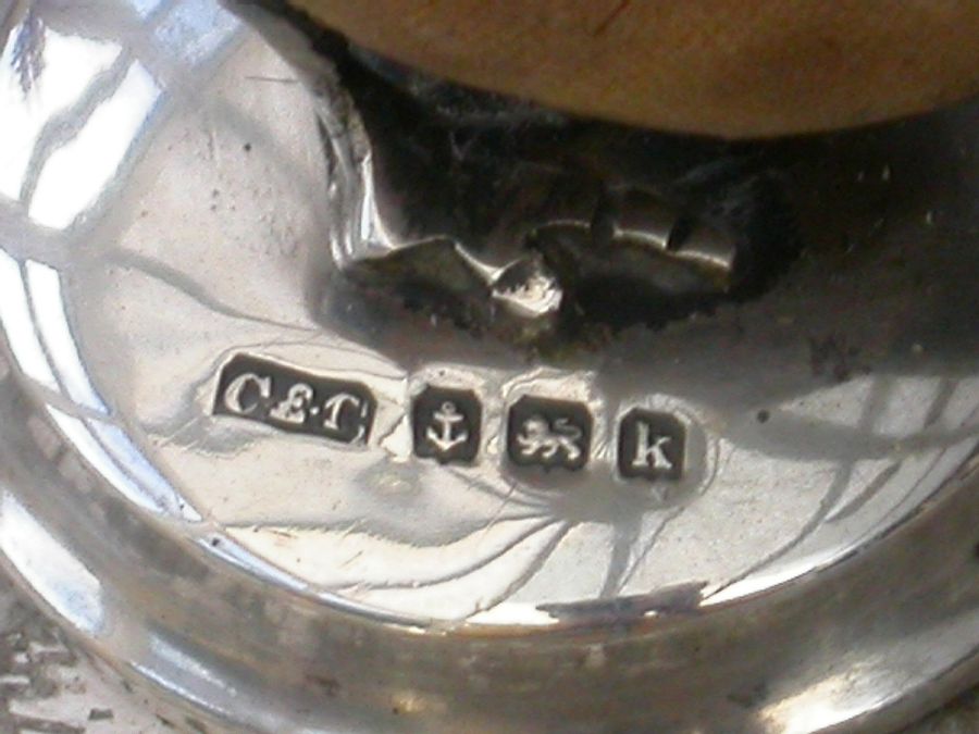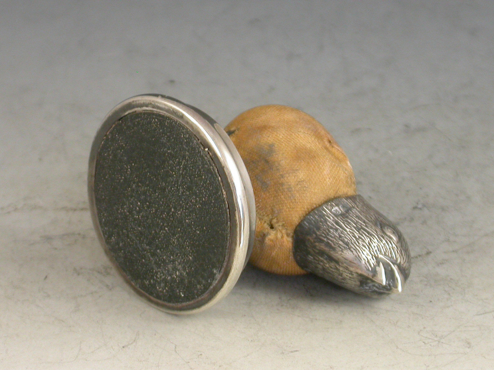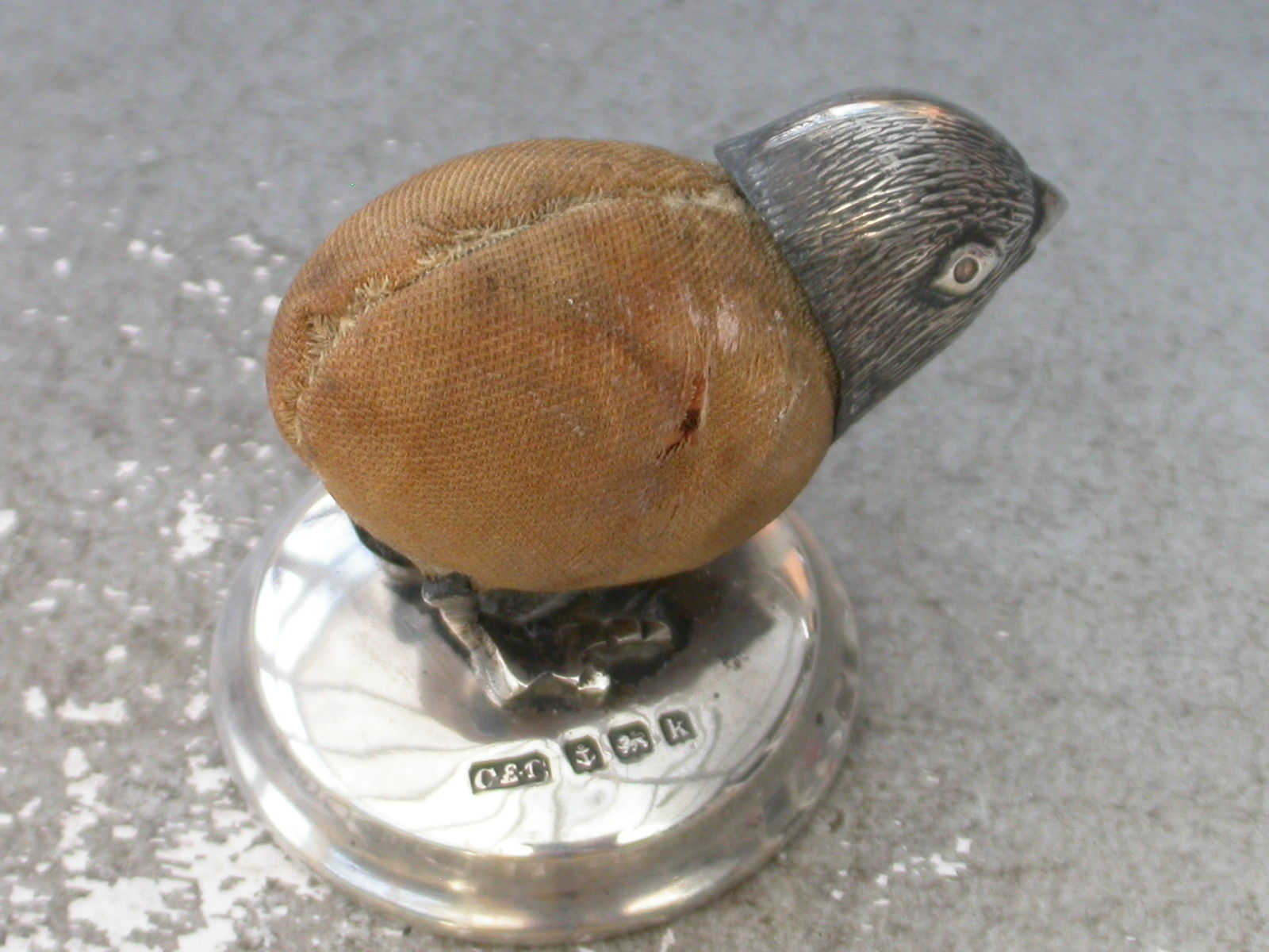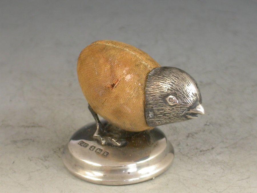 An unusual Edwardian novelty silver Pin Cushion made in the form of a chick standing on a circular pedestal base, the silver head attached to the egg shaped body covered in a hessian type material and forming the cushion.