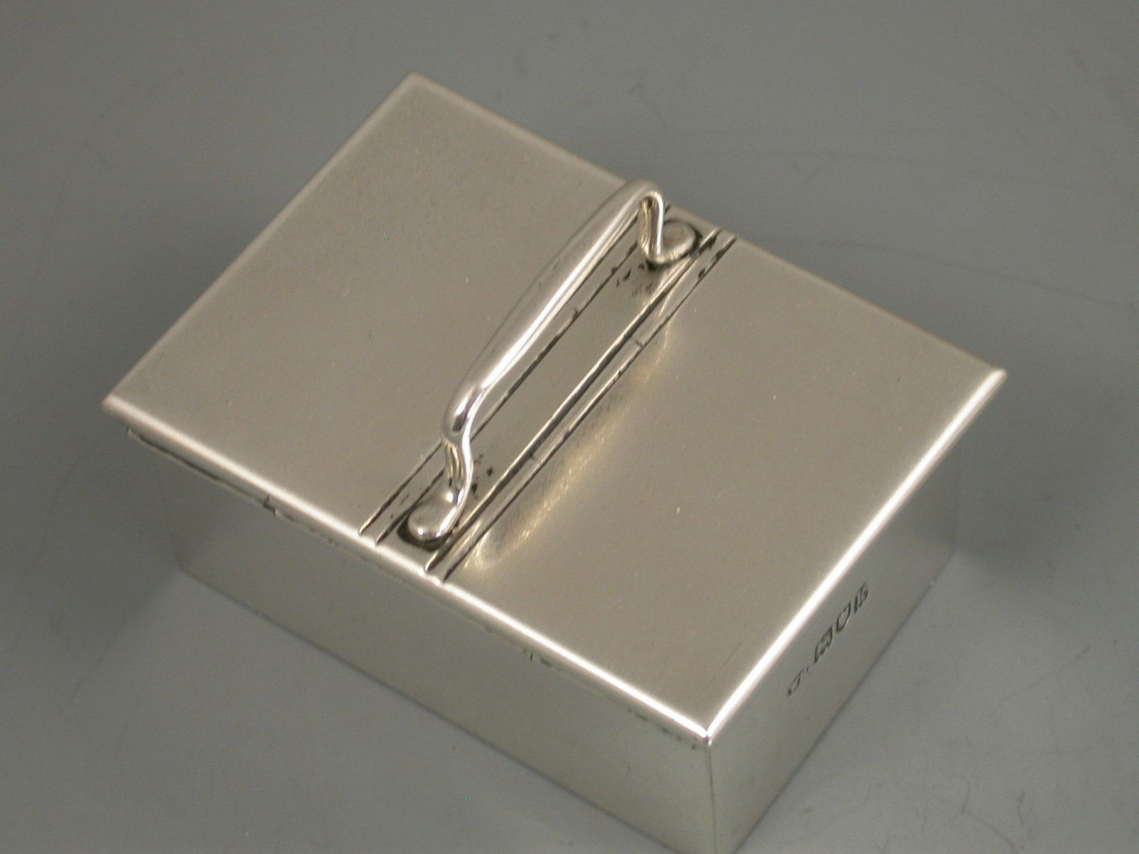 An Edwardian novelty silver Vesta Case made in the form of a cigar box, of rectangular form with sprung hinged lid with central handle, leather base and cedar wood lining.