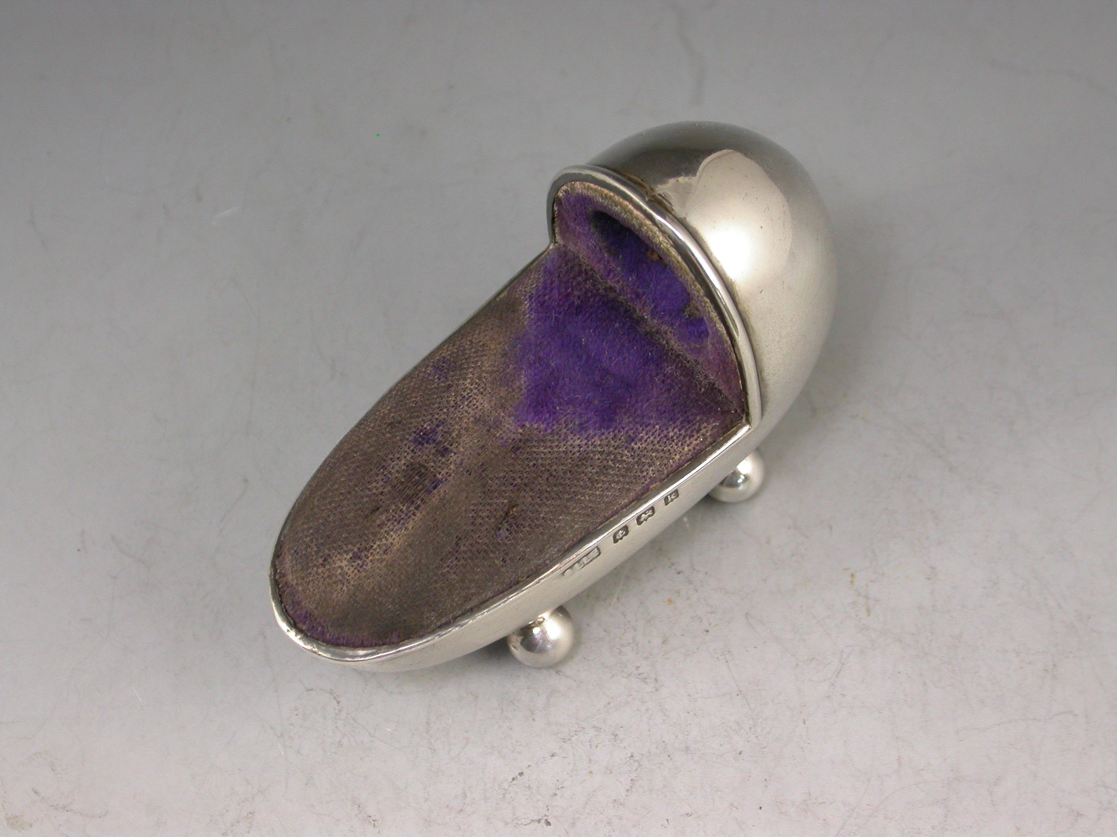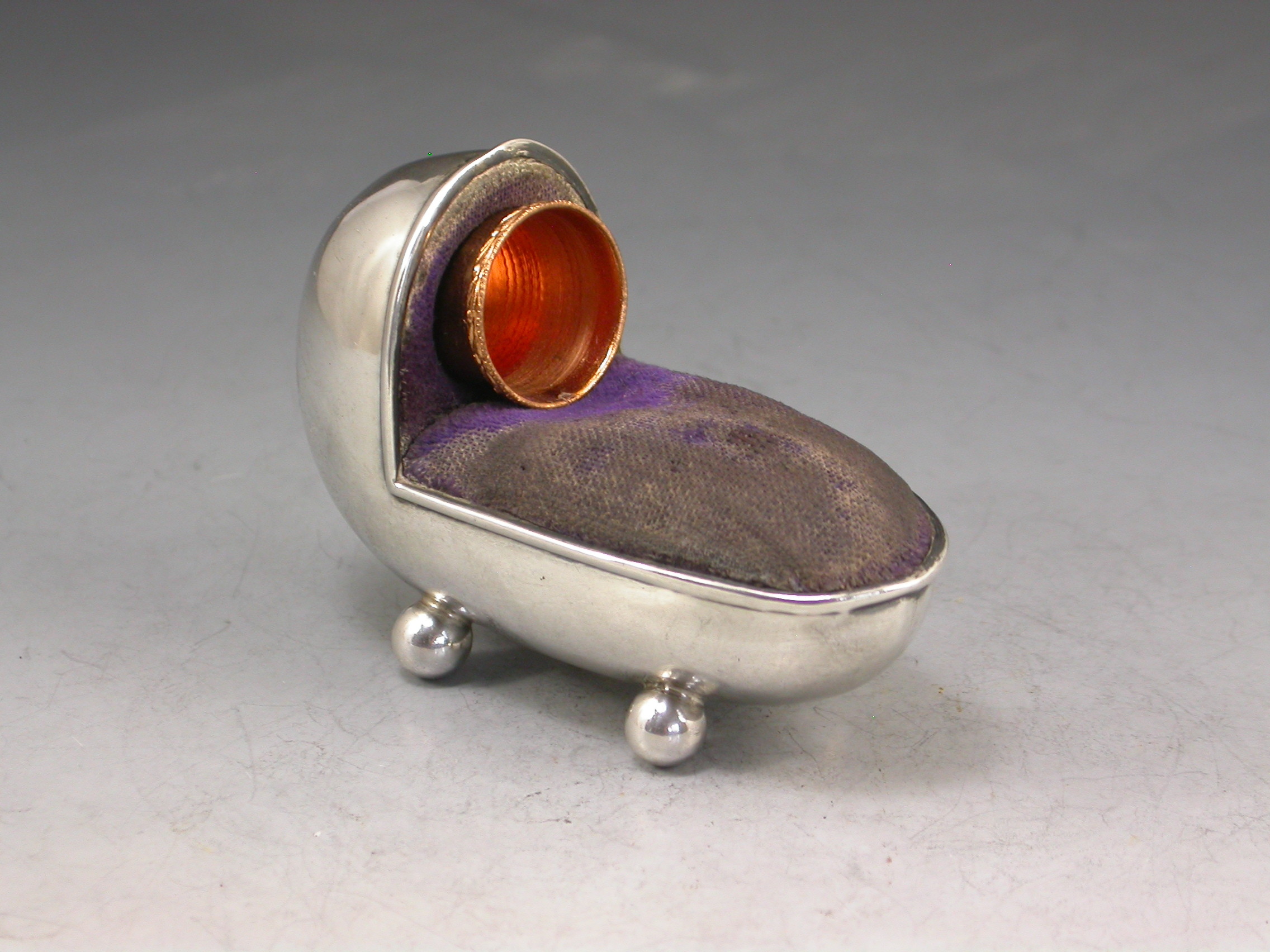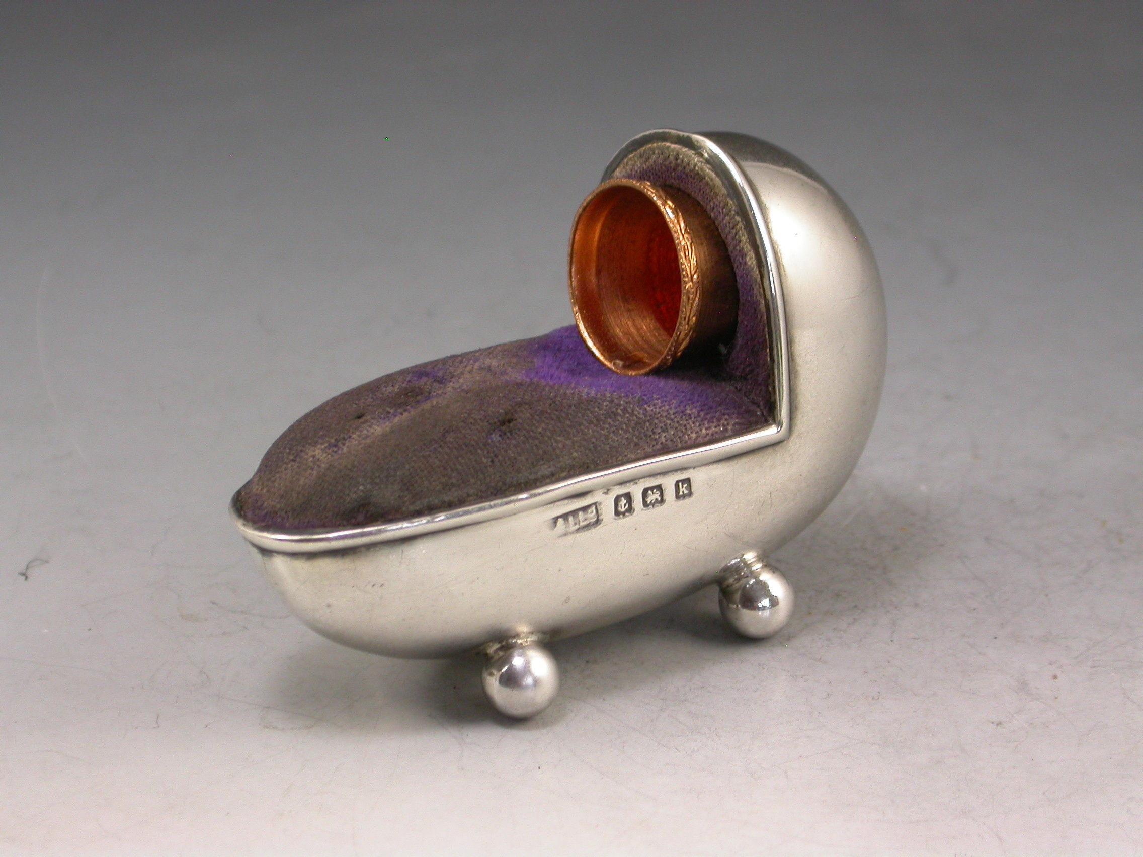 A good Edwardian novelty silver Pin Cushion made in the form of a Crib standing on four ball feet, complete with original blue velvet cushion and integral thimble holder with gilt metal thimble.