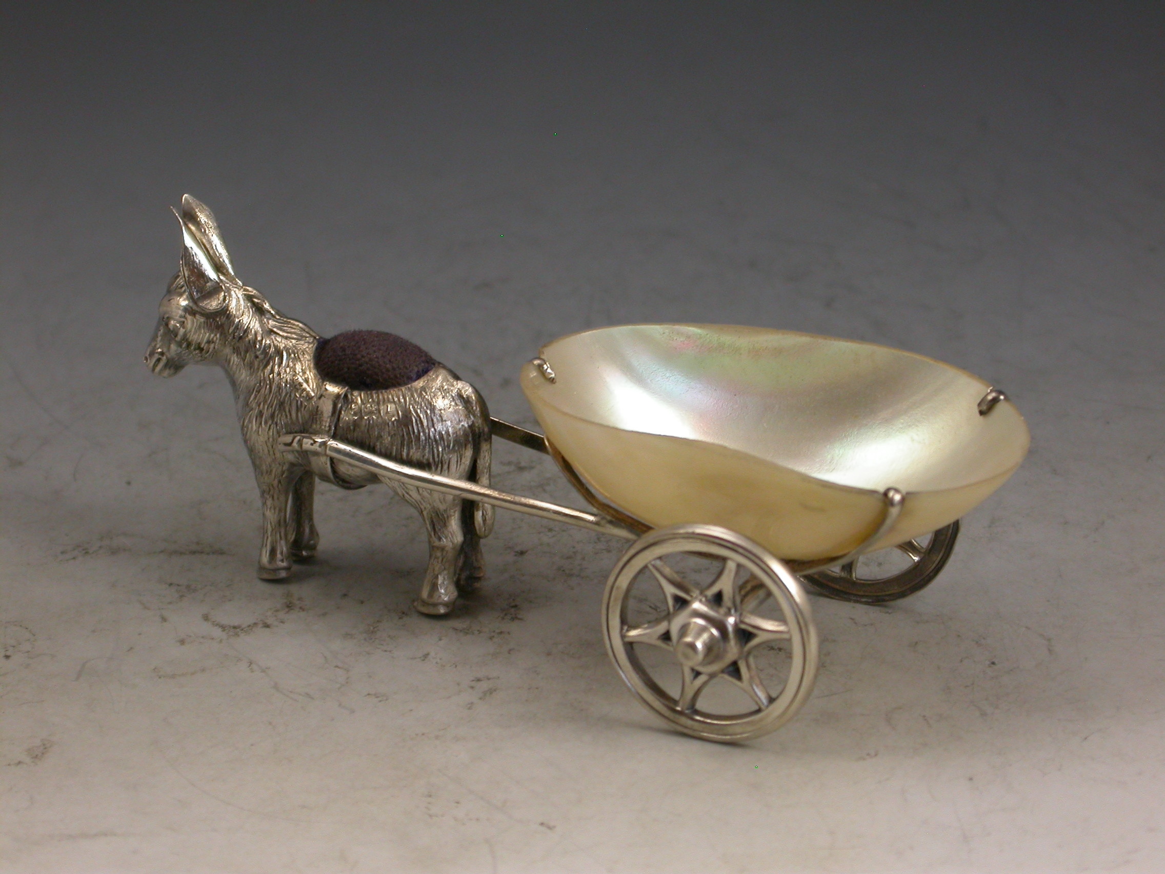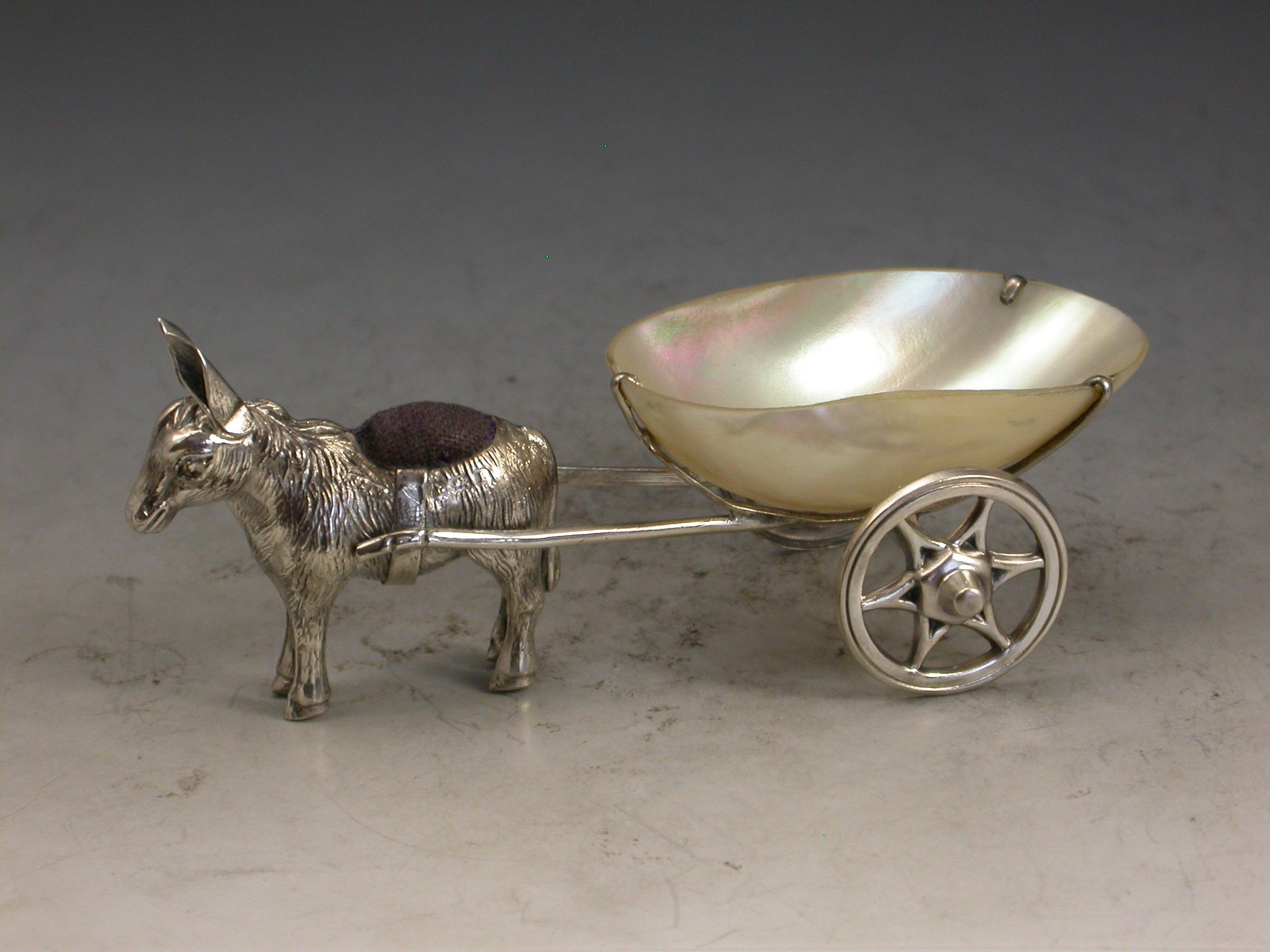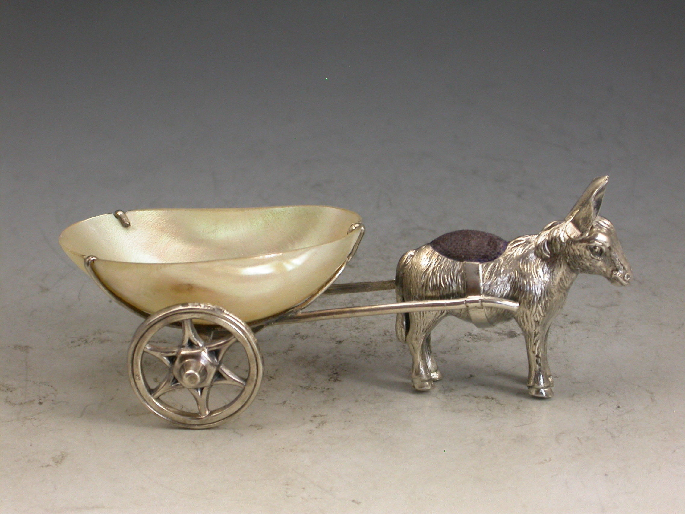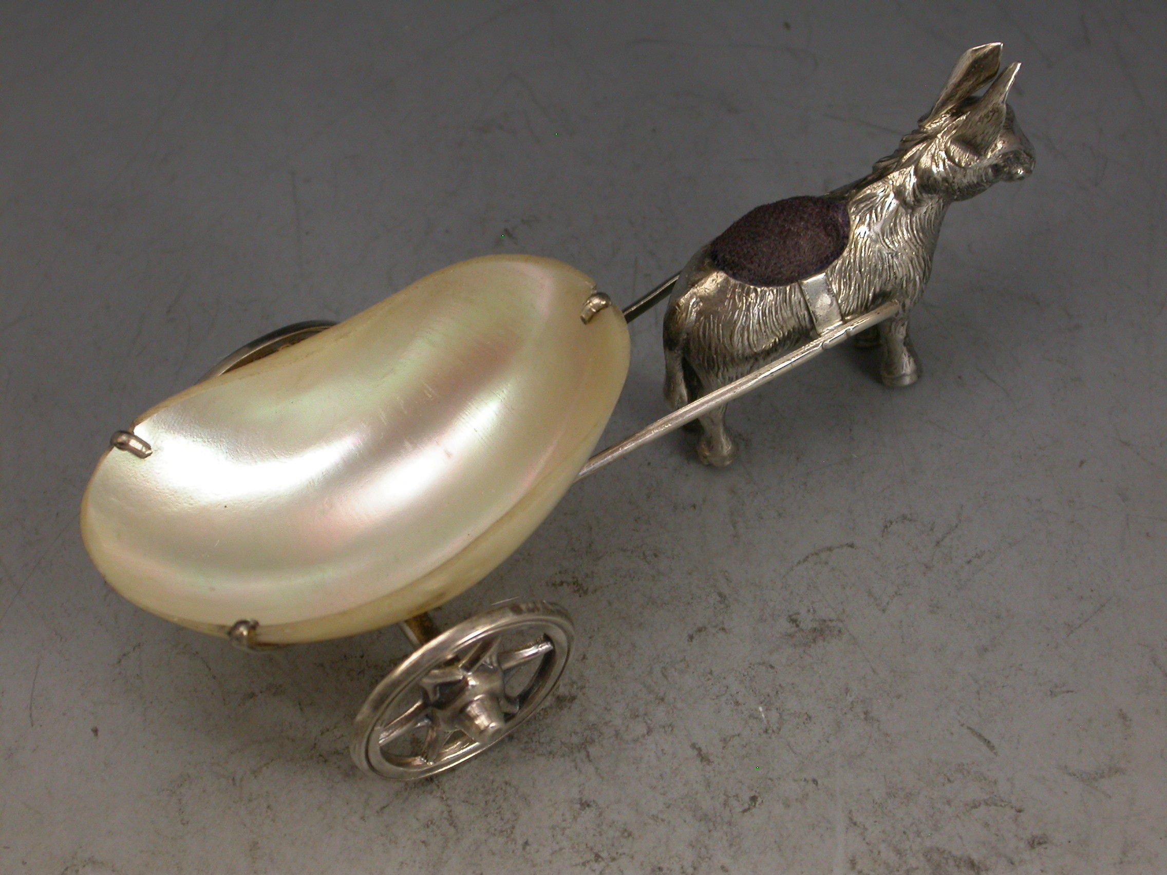 An extremely rare Edwardian novelty silver Pin Cushion modeled as a Donkey pulling a shaped Mother of Pearl Cart on two wheels. The Donkey realistically modeled with fine detail and complete with original velvet cushion.