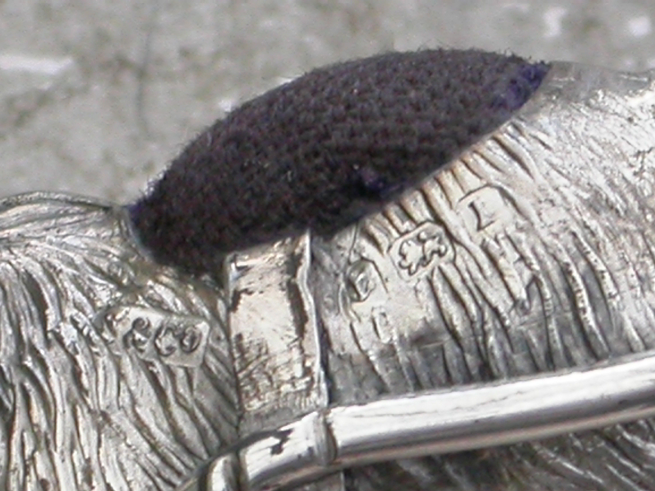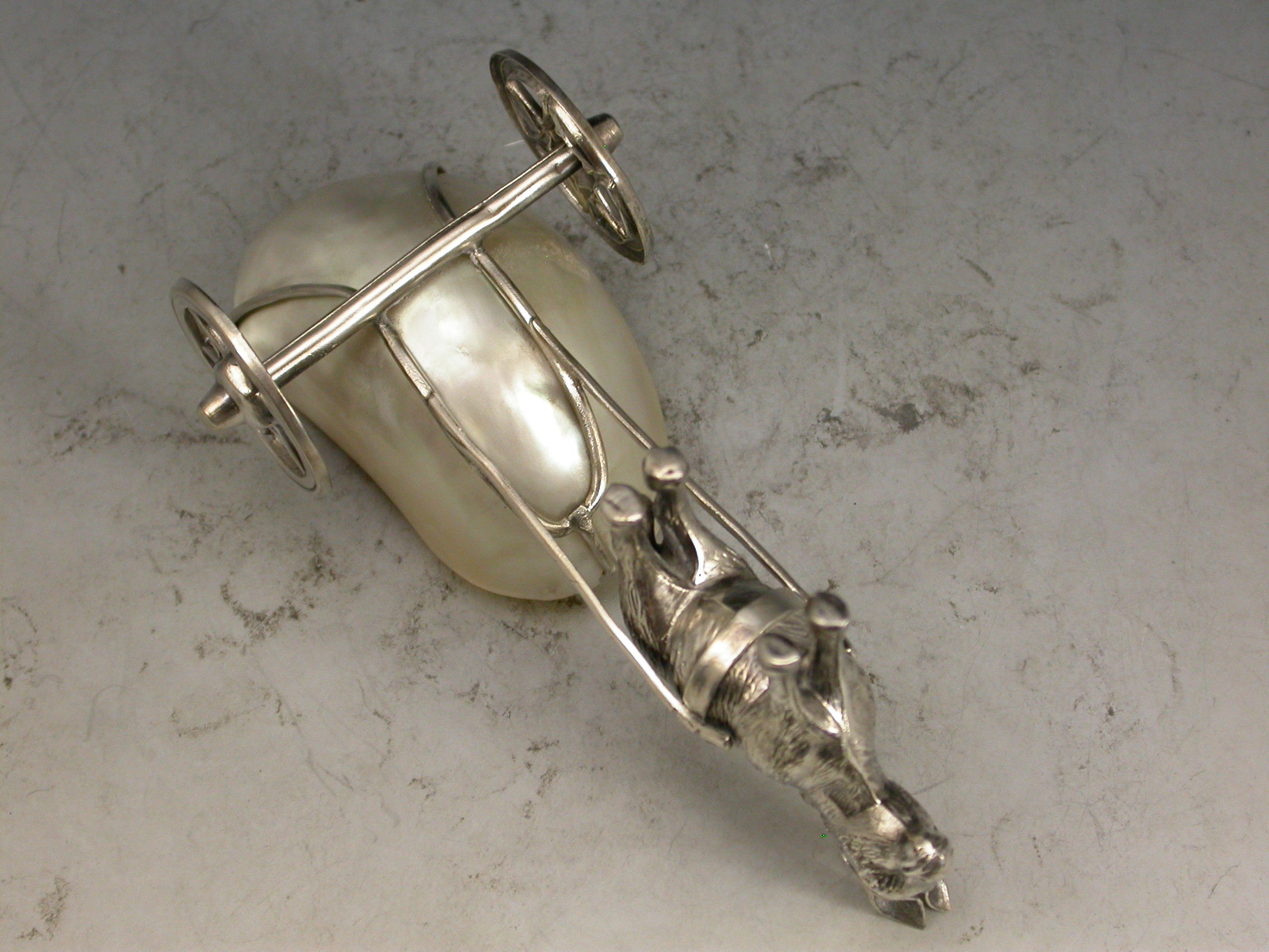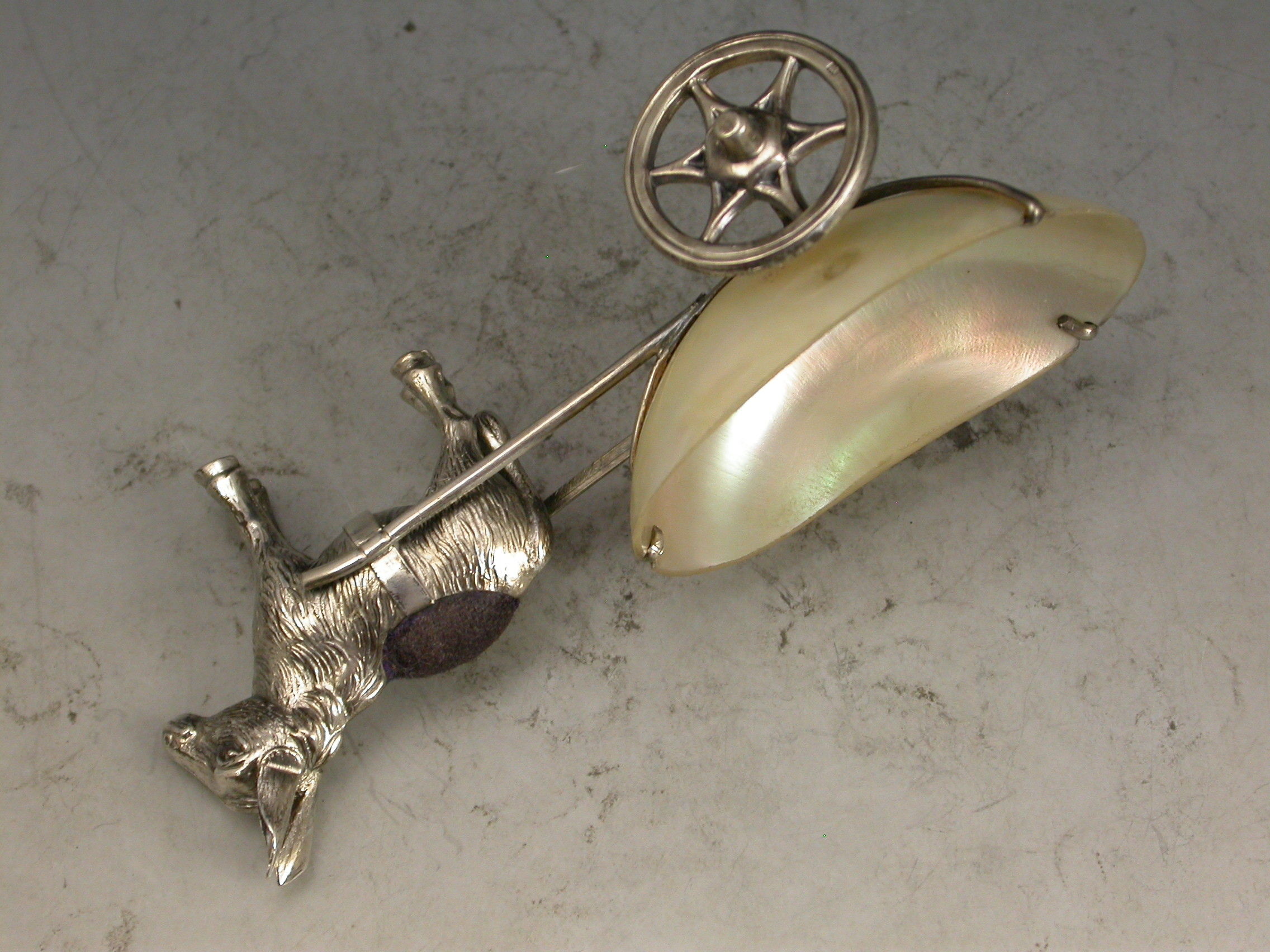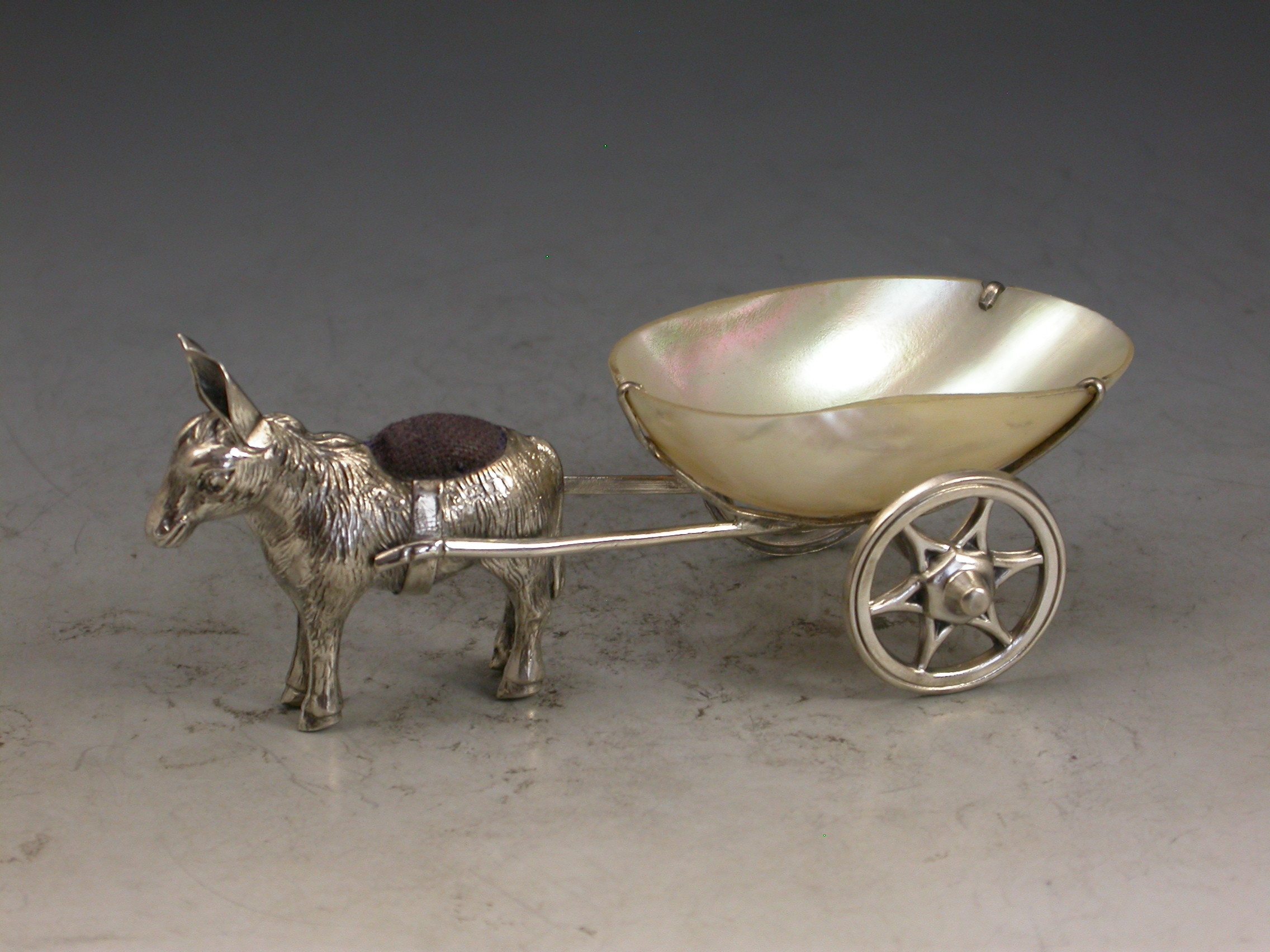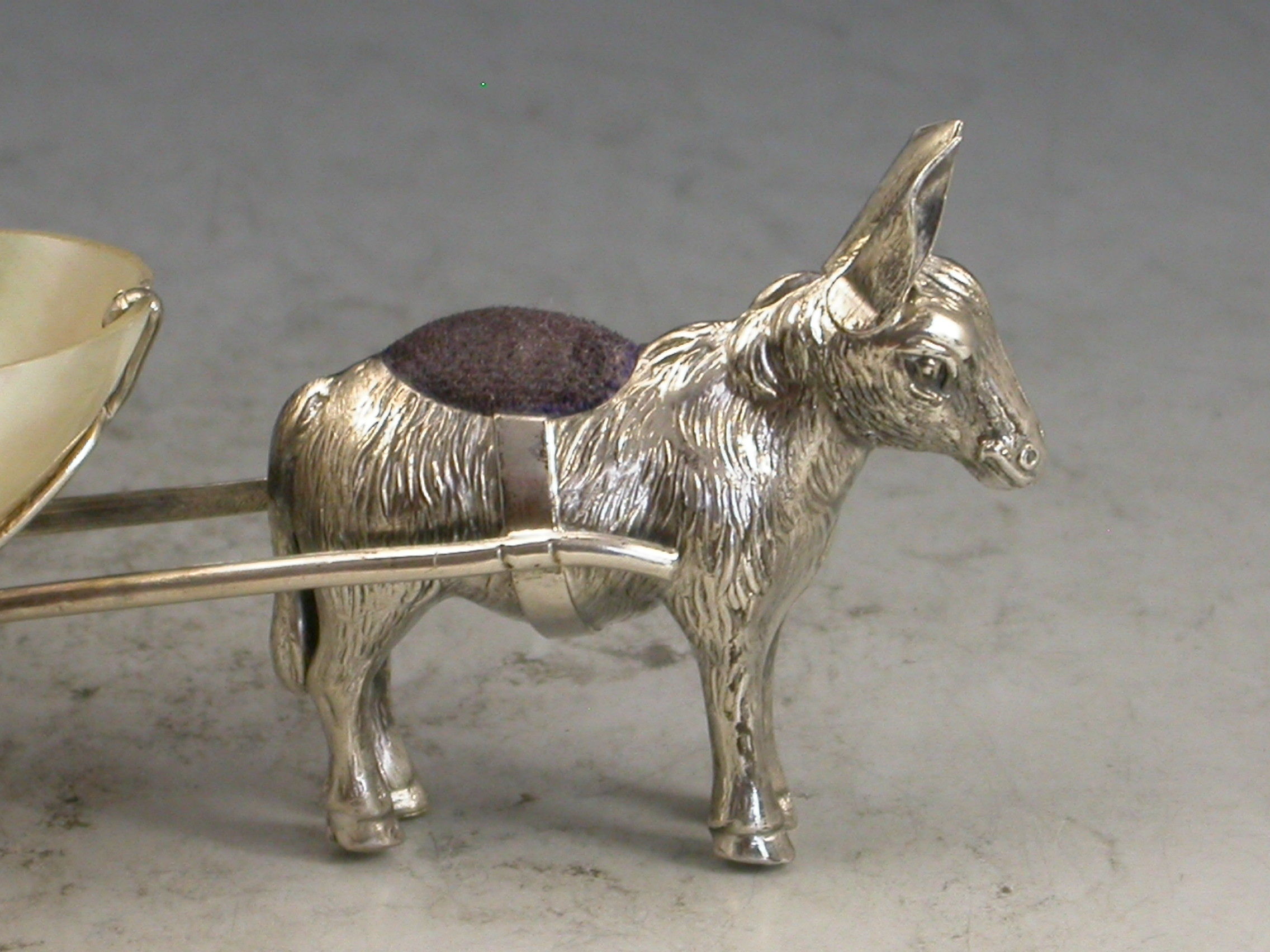 An extremely rare Edwardian novelty silver Pin Cushion modeled as a Donkey pulling a shaped Mother of Pearl Cart on two wheels. The Donkey realistically modeled with fine detail and complete with original velvet cushion.