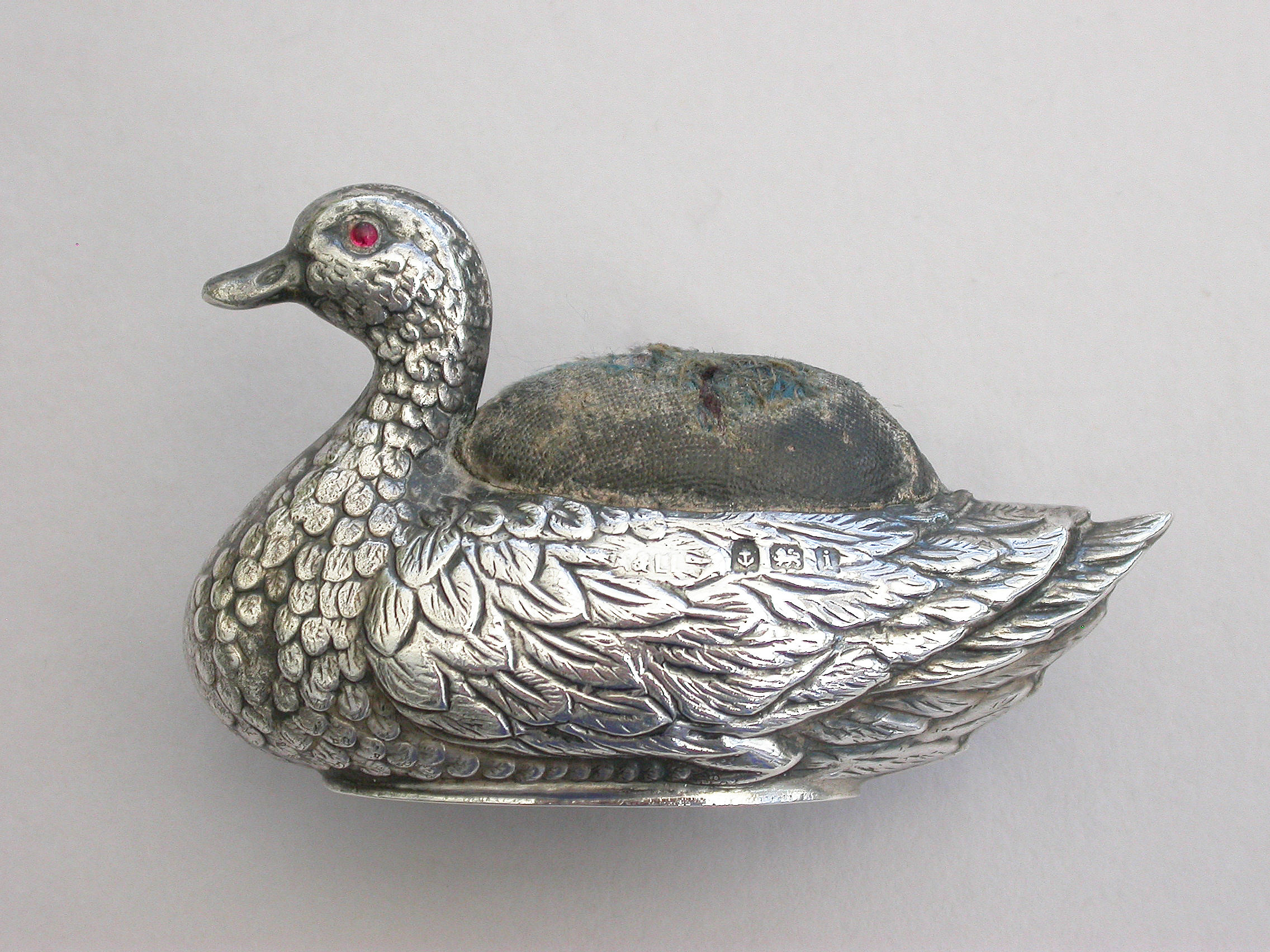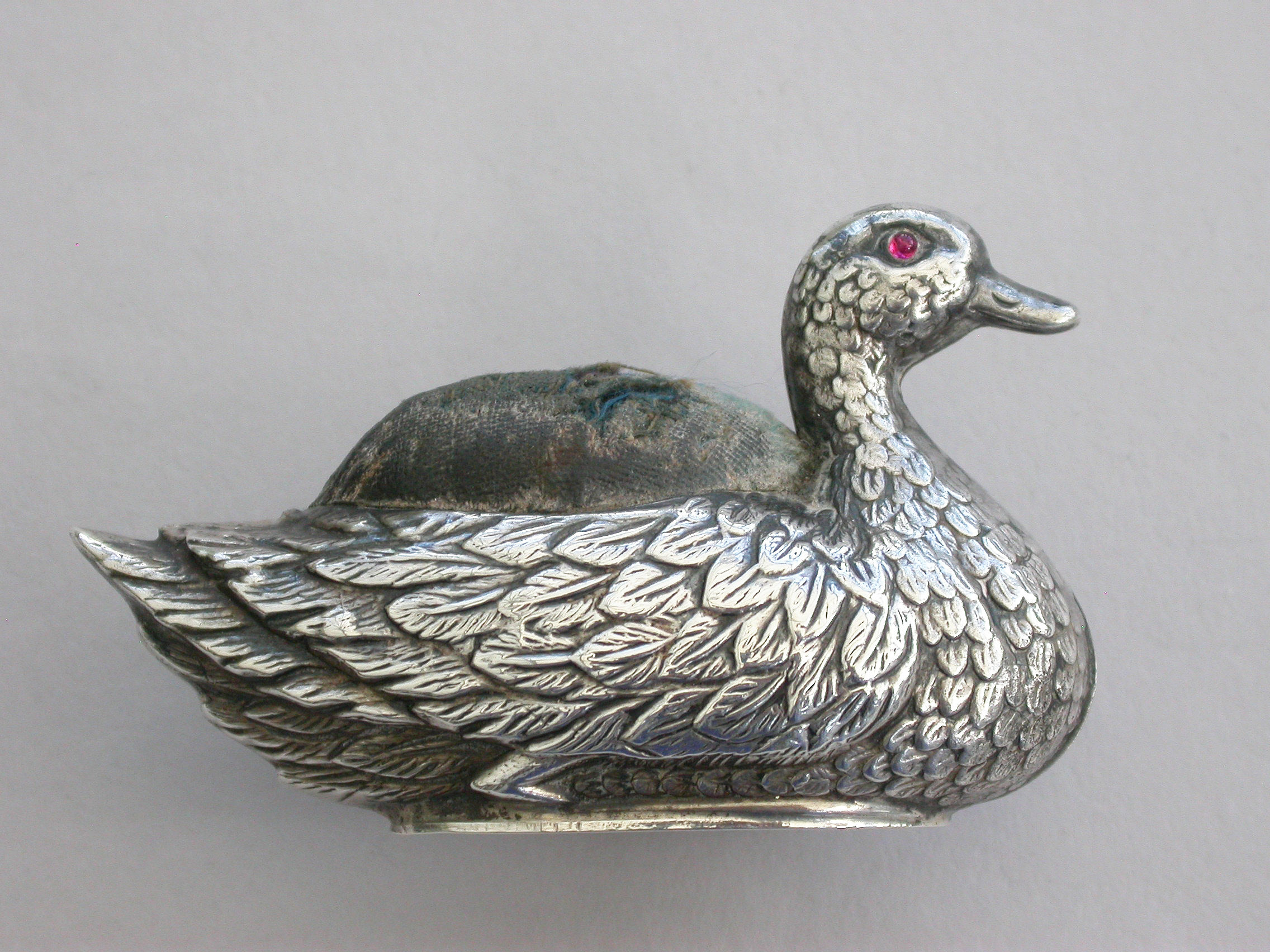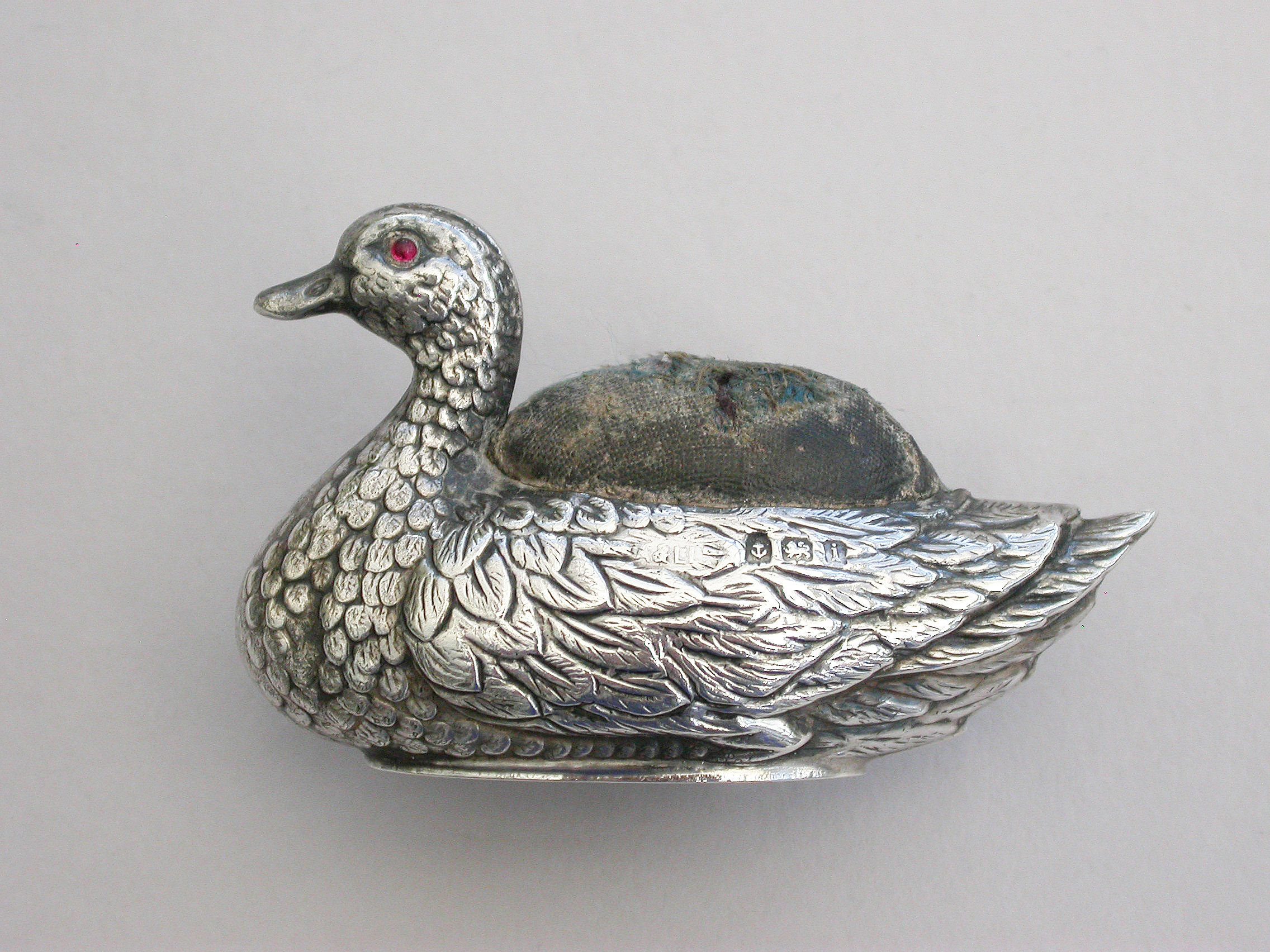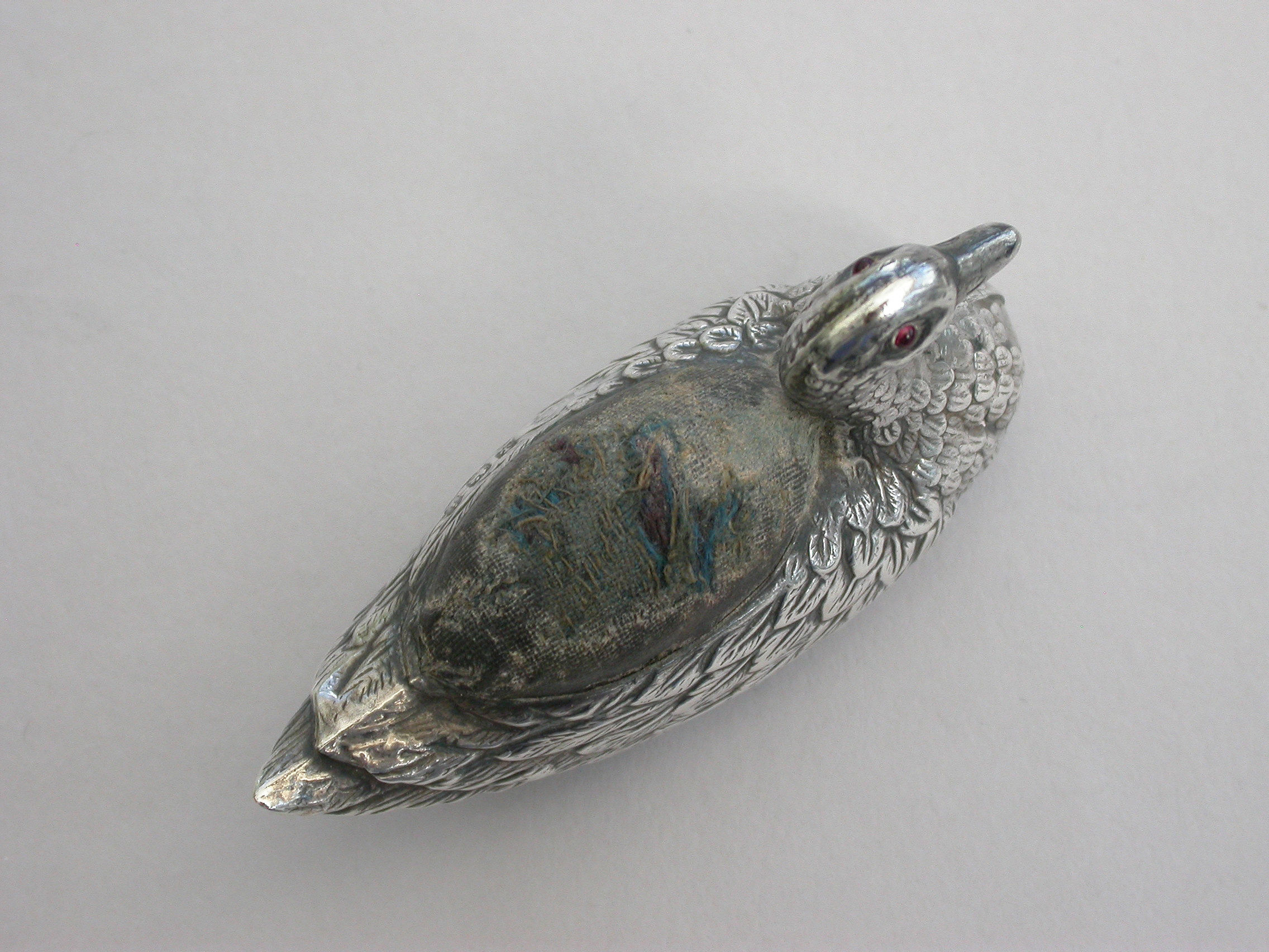 A good Edwardian novelty silver Pin Cushion, made in the form of a swimming duck, with textured feathers and complete with original velvet cushion and ruby glass eyes.