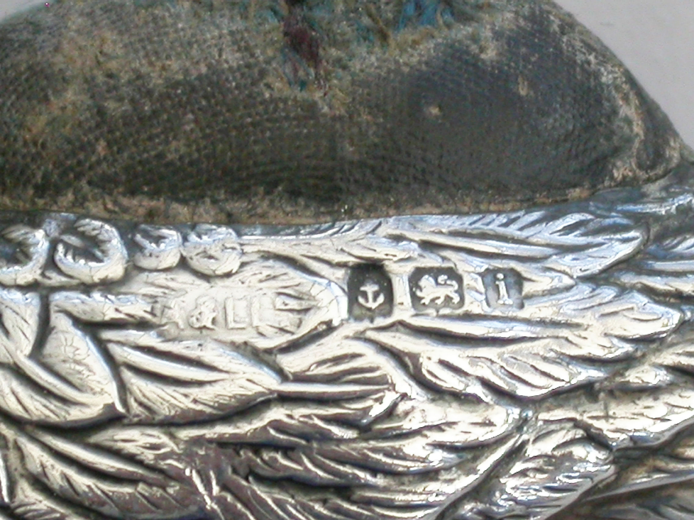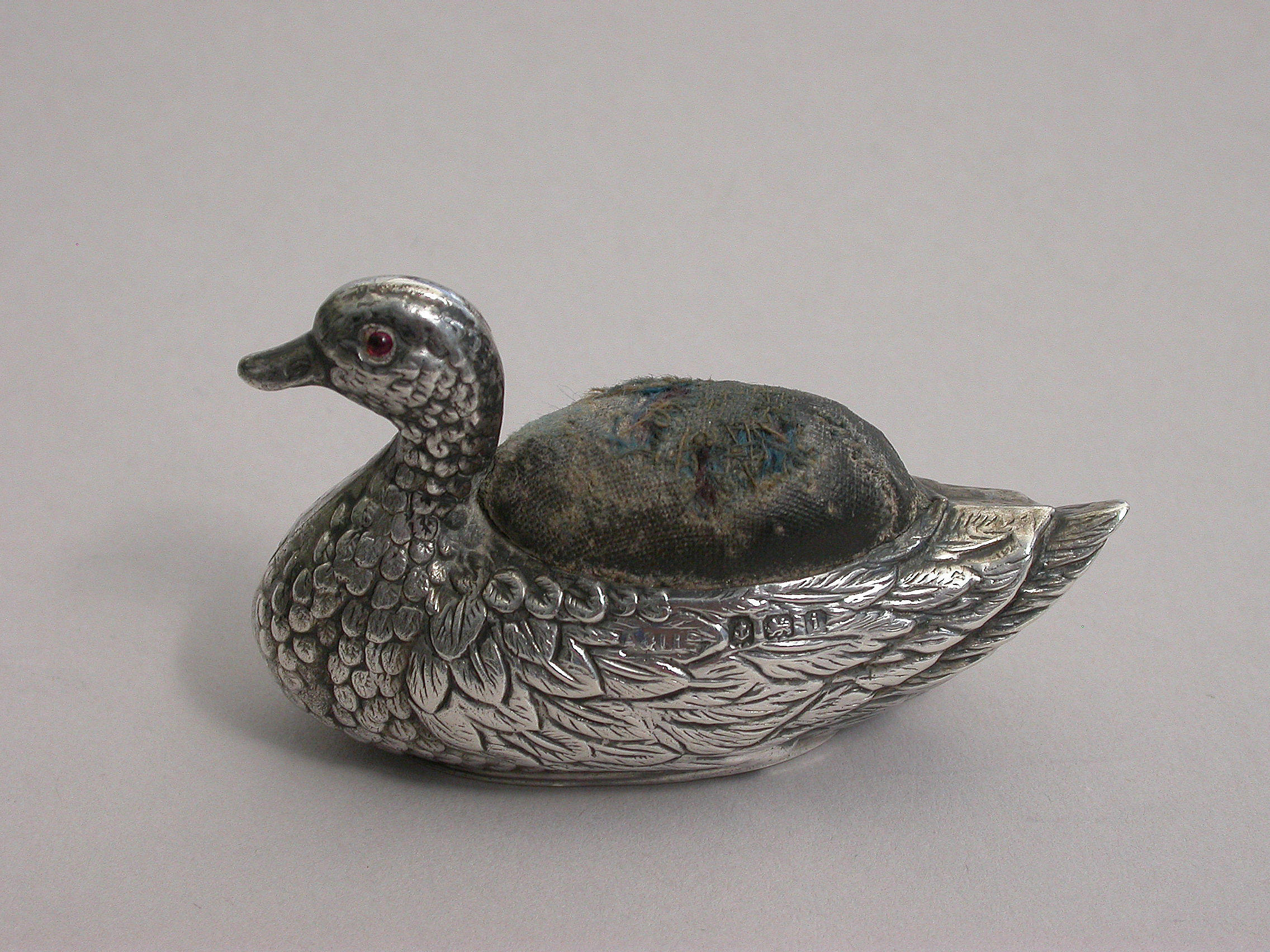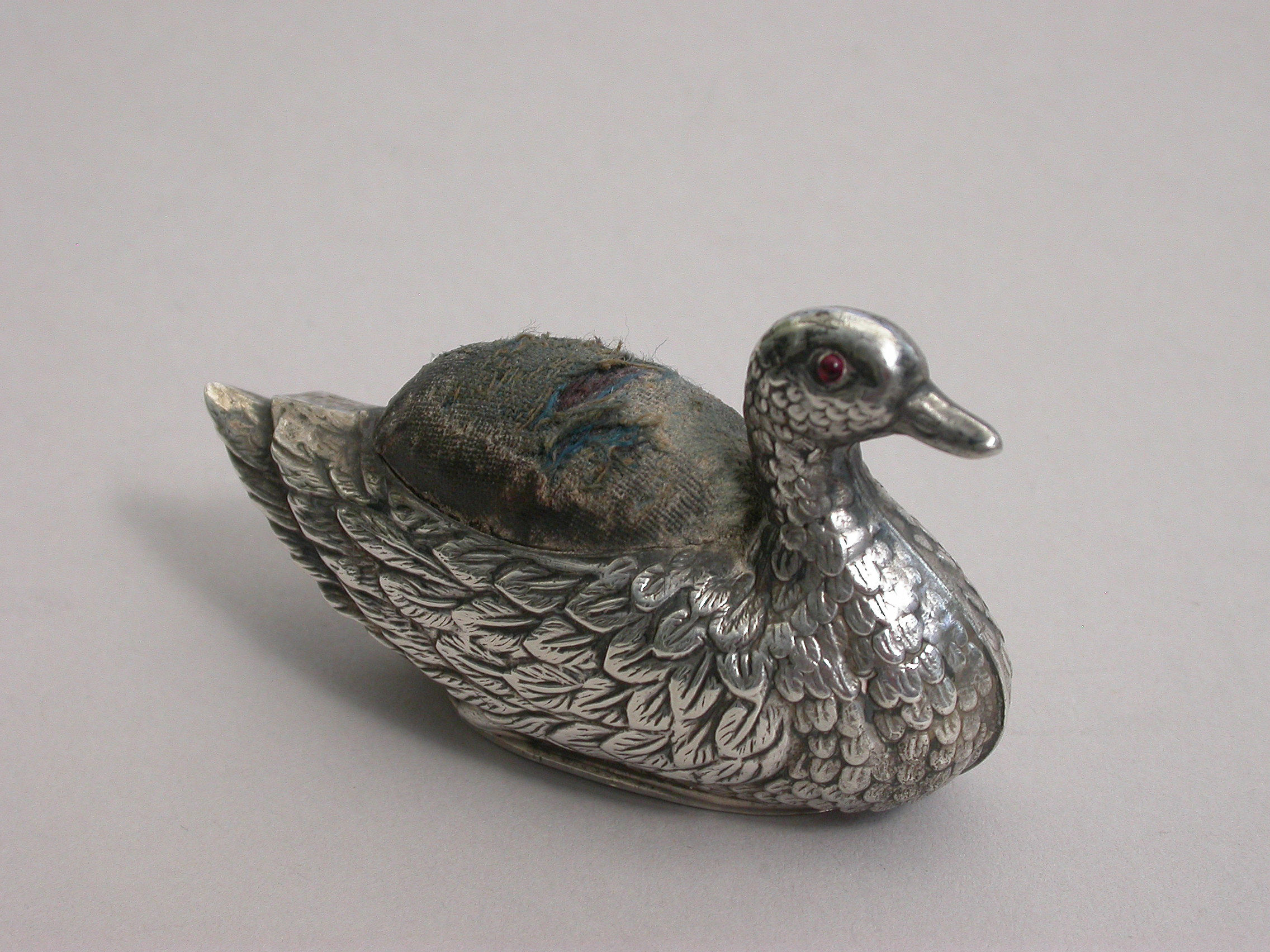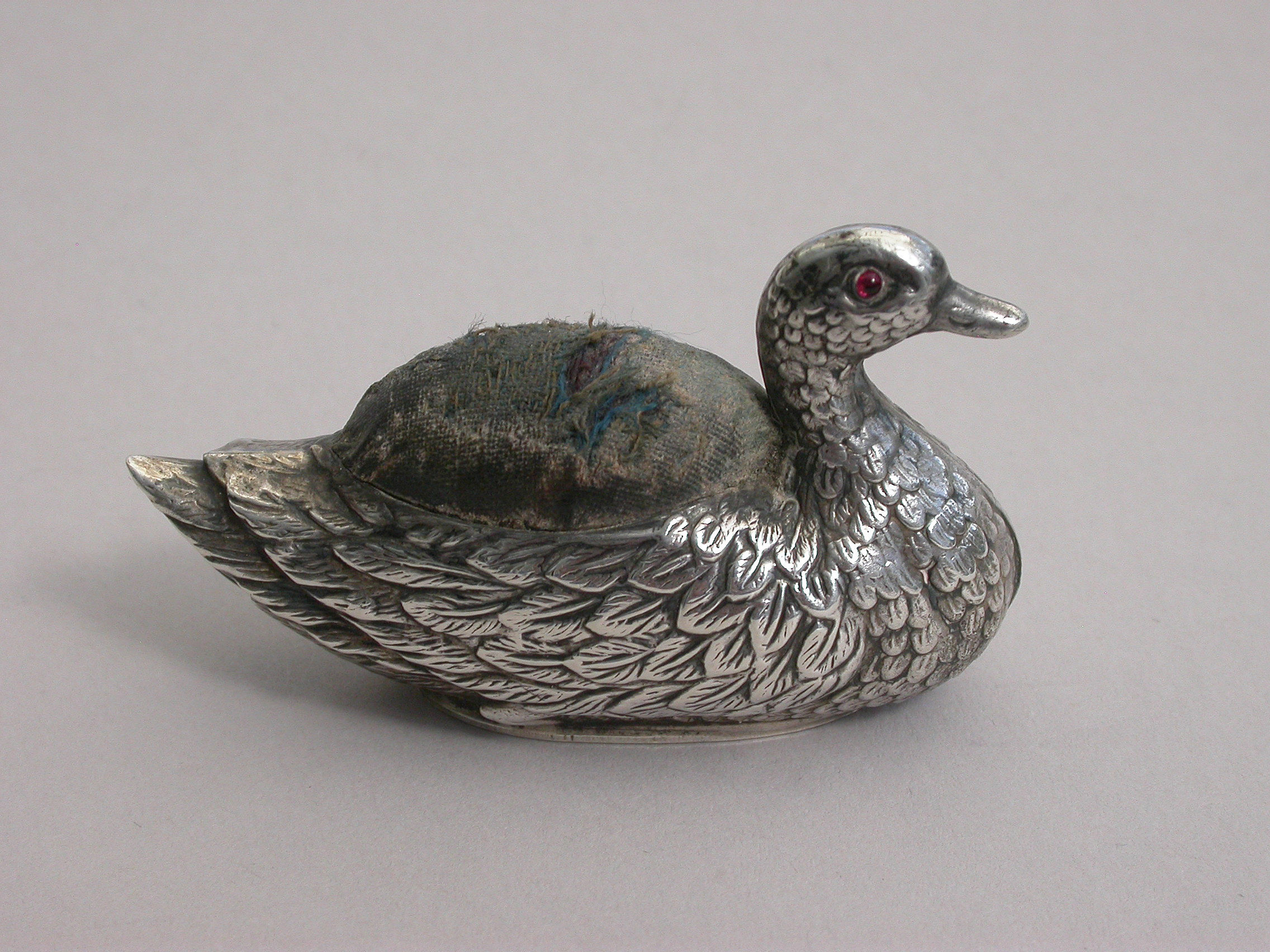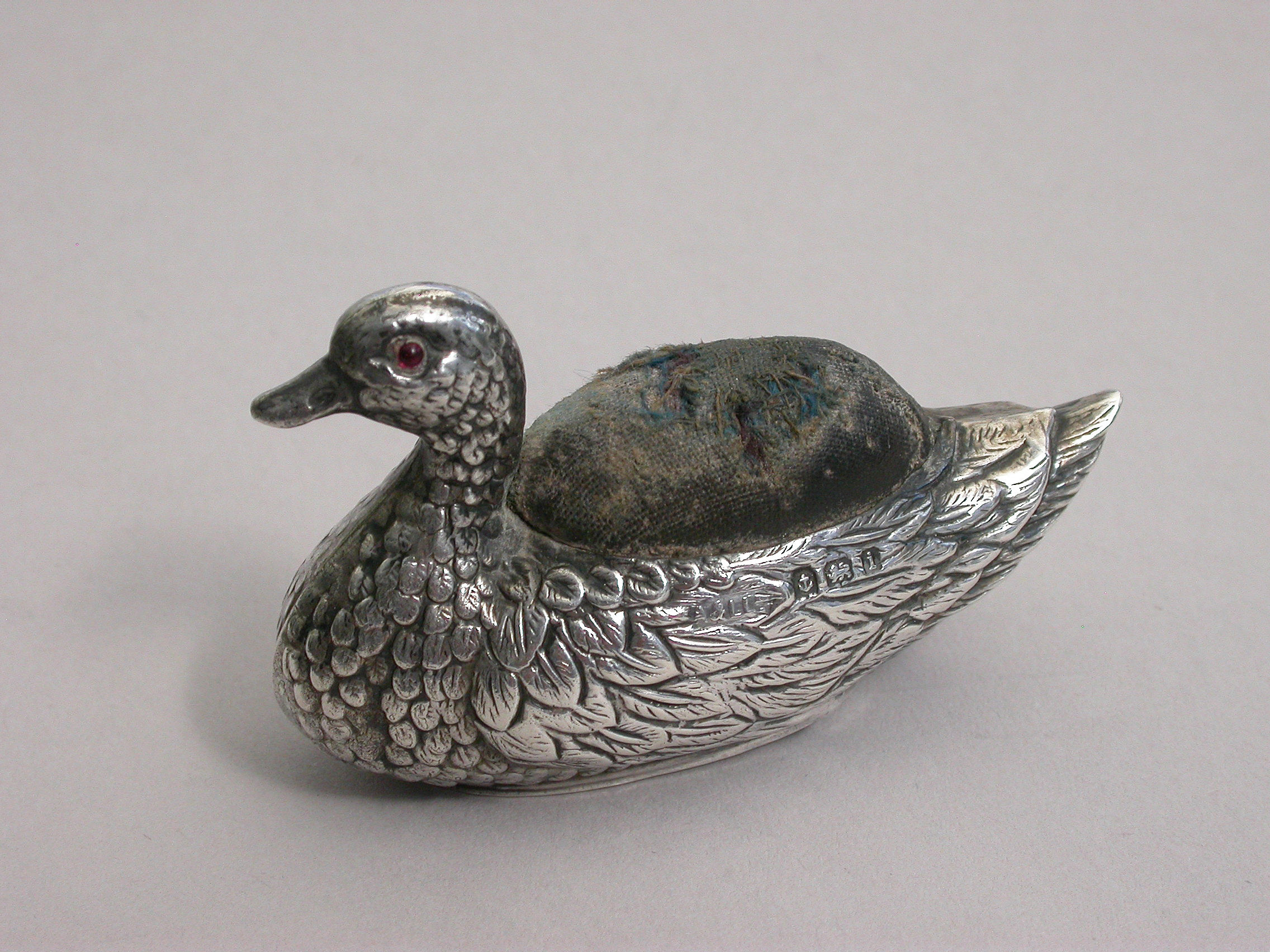 A good Edwardian novelty silver Pin Cushion, made in the form of a swimming duck, with textured feathers and complete with original velvet cushion and ruby glass eyes.