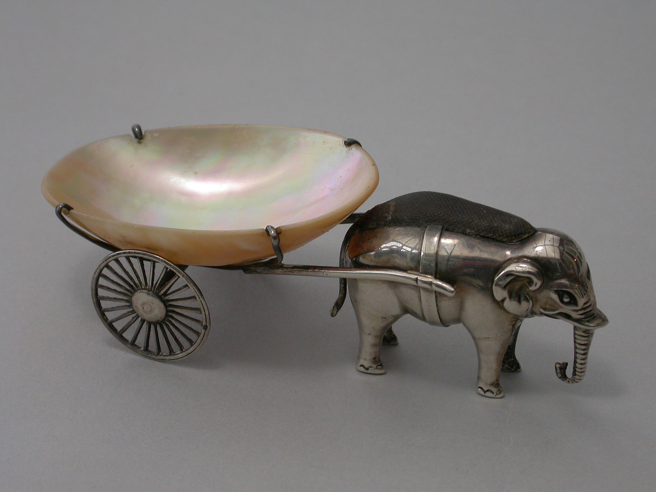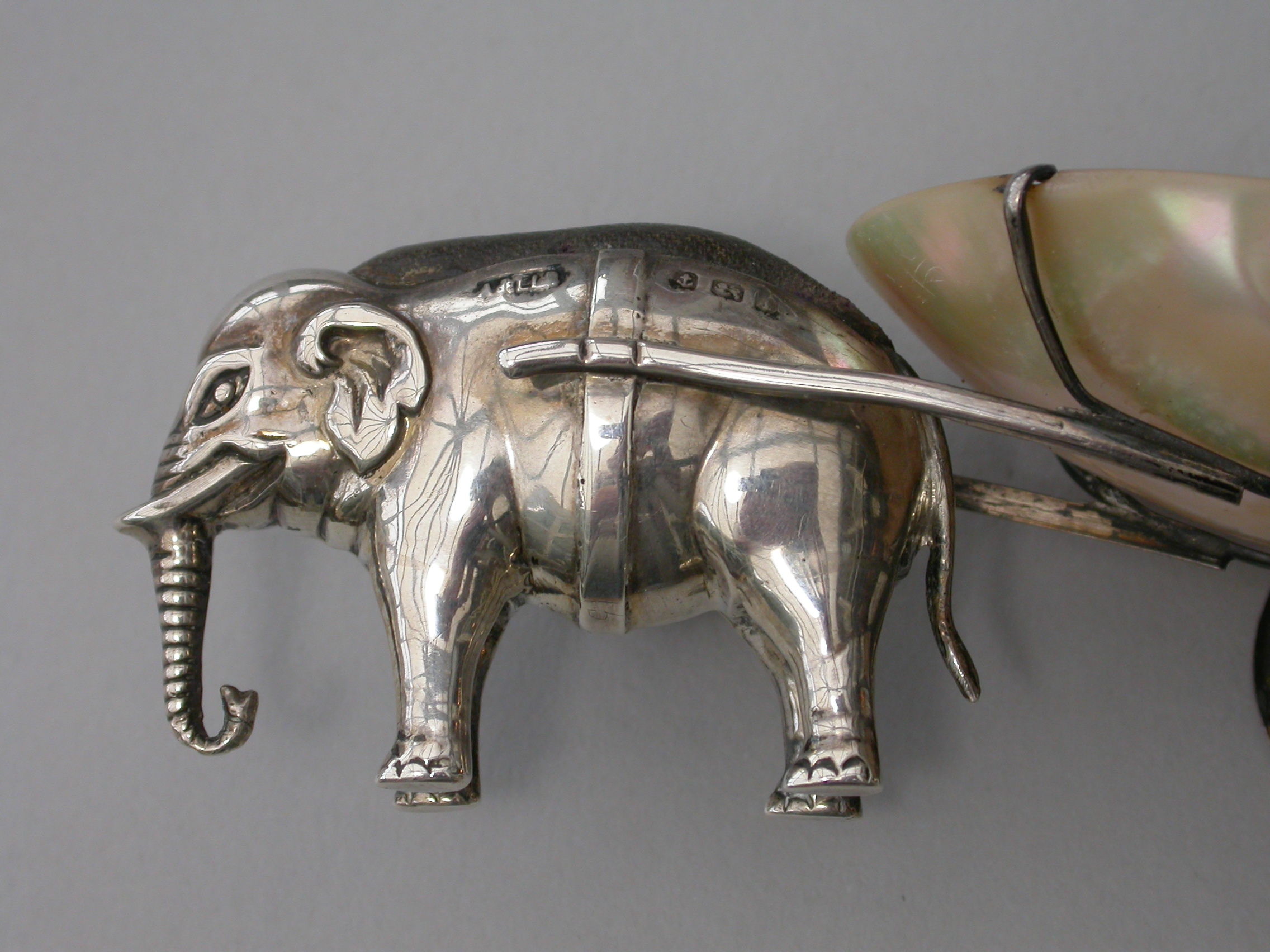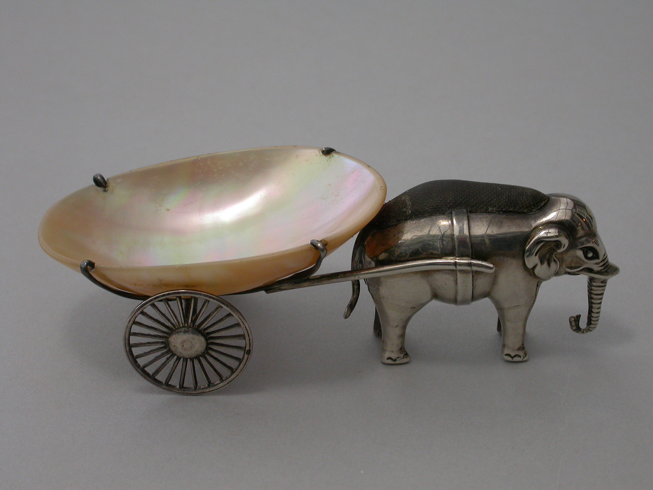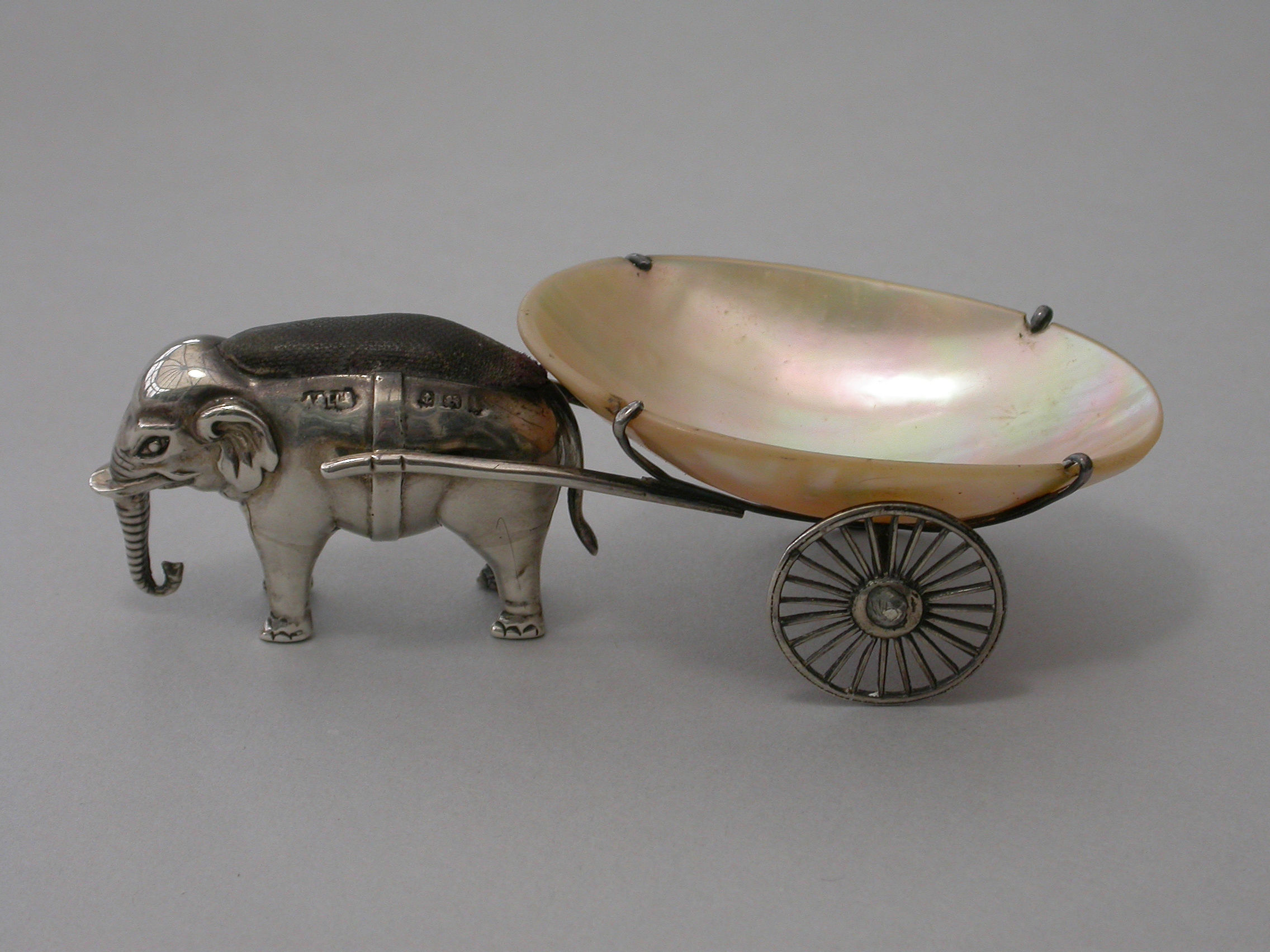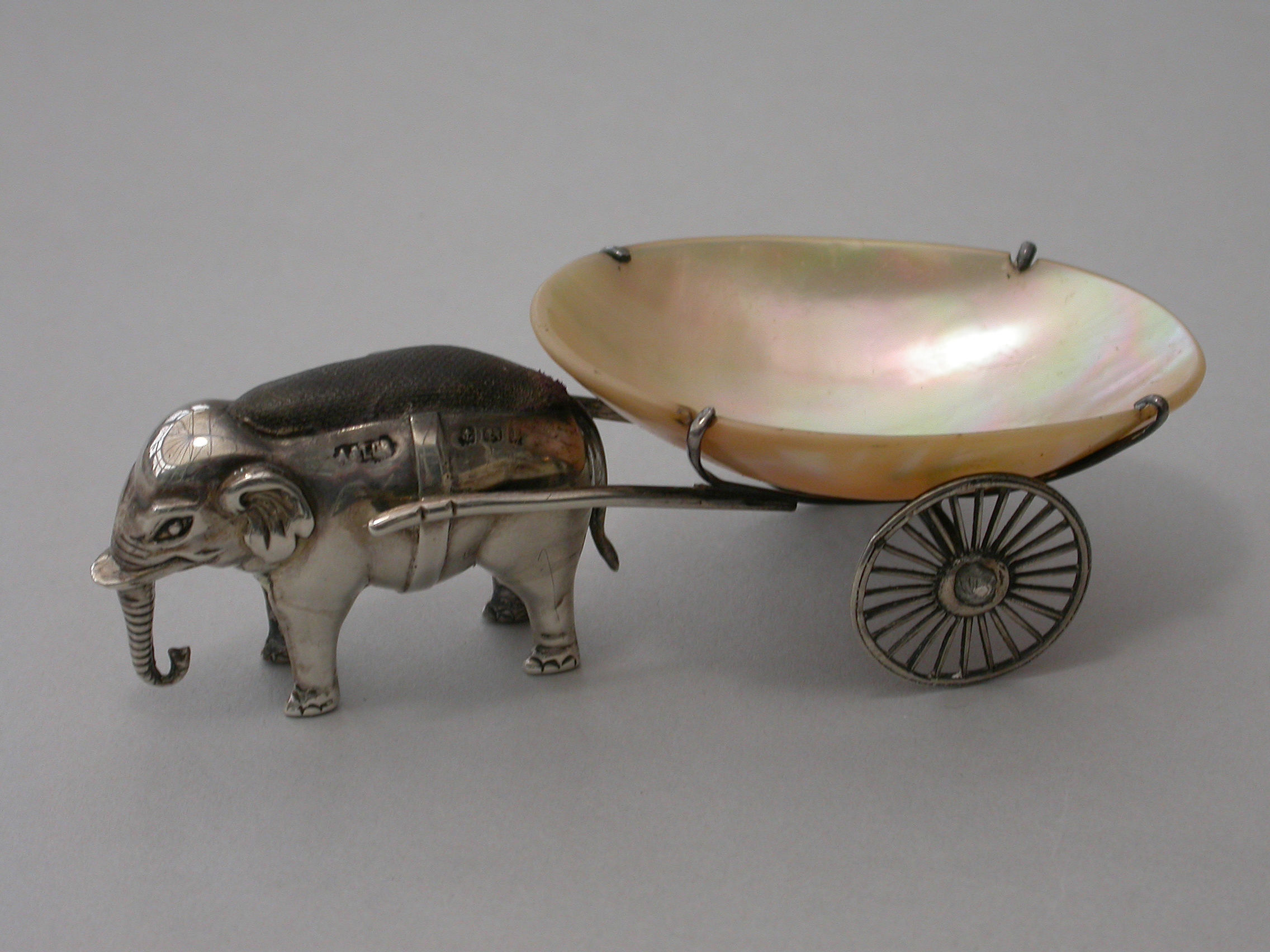 A rare Edwardian novelty silver Pin cushion made in the form of an elephant pulling a mother of pearl cart.