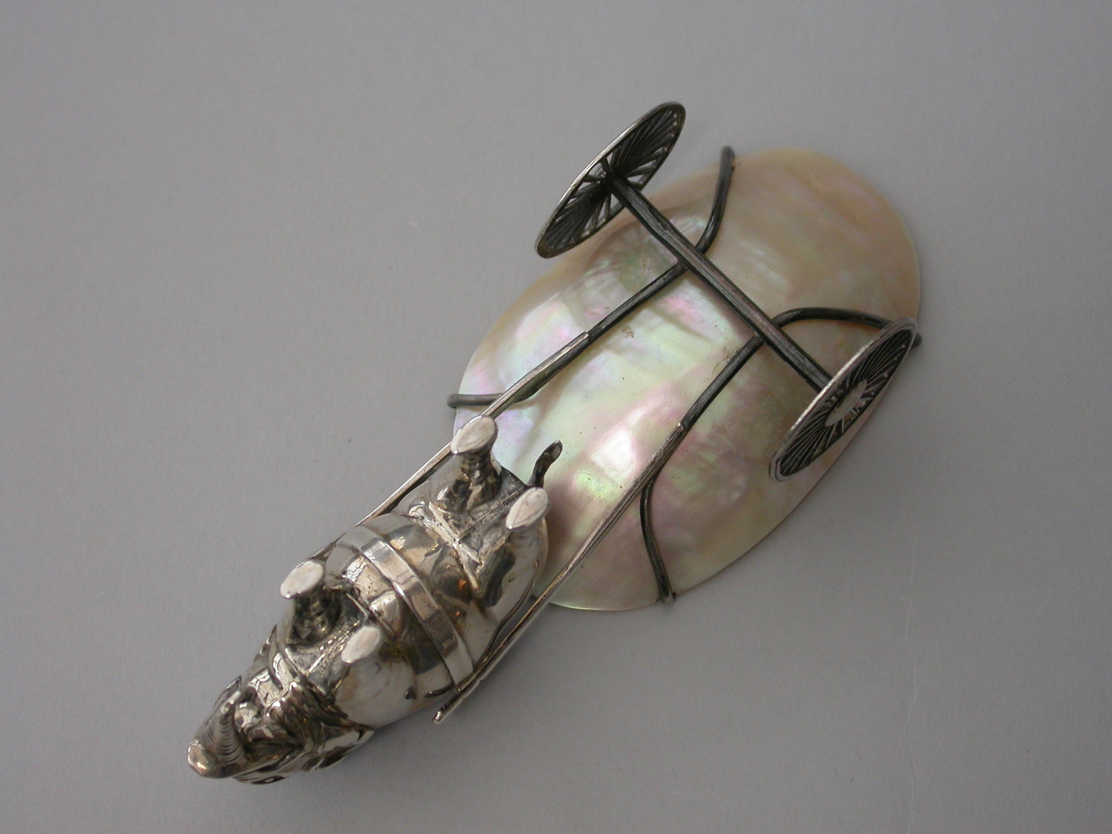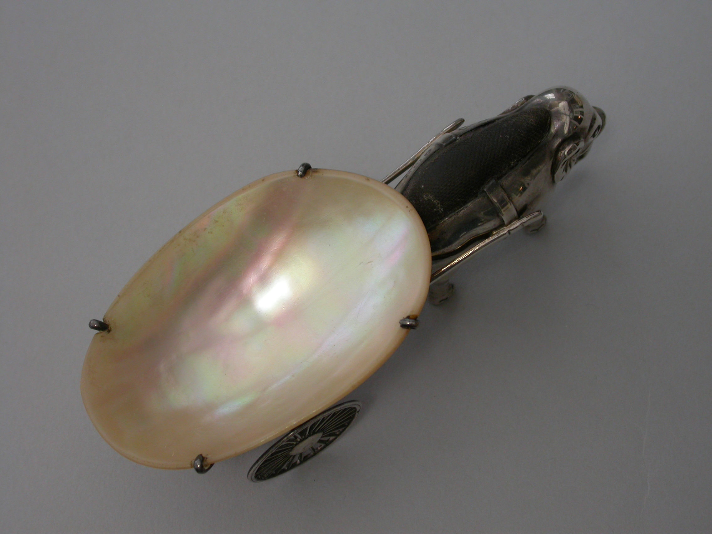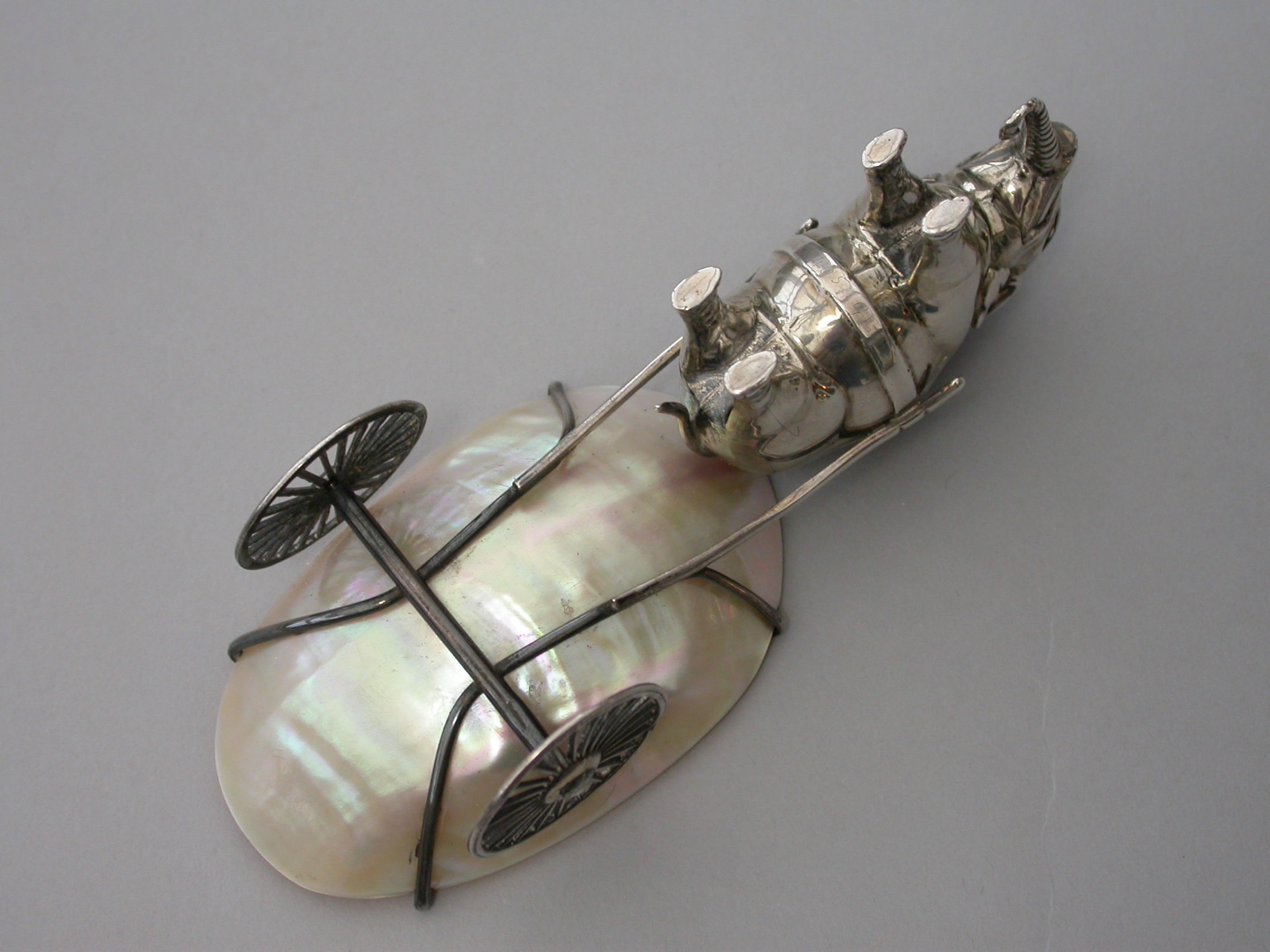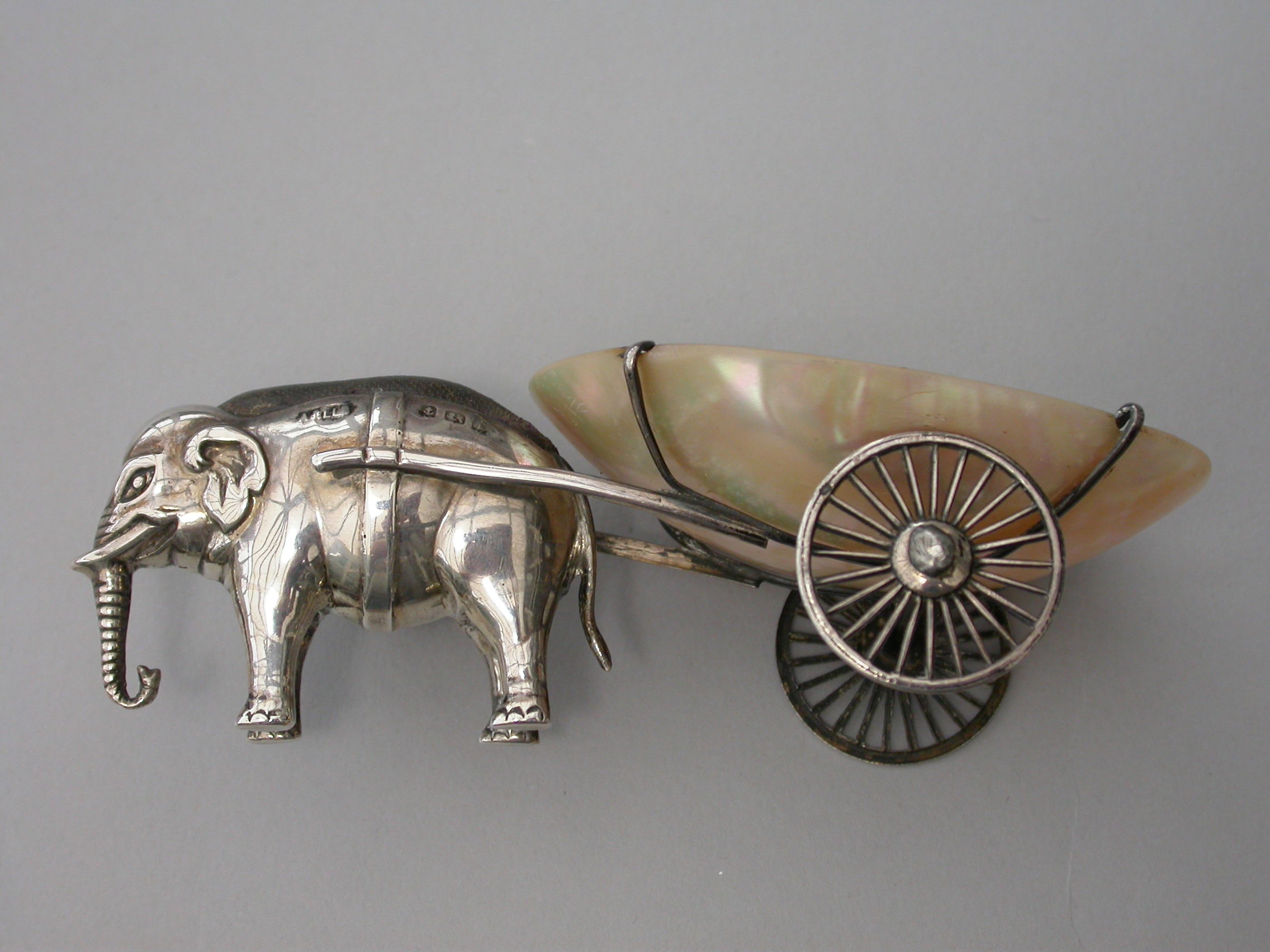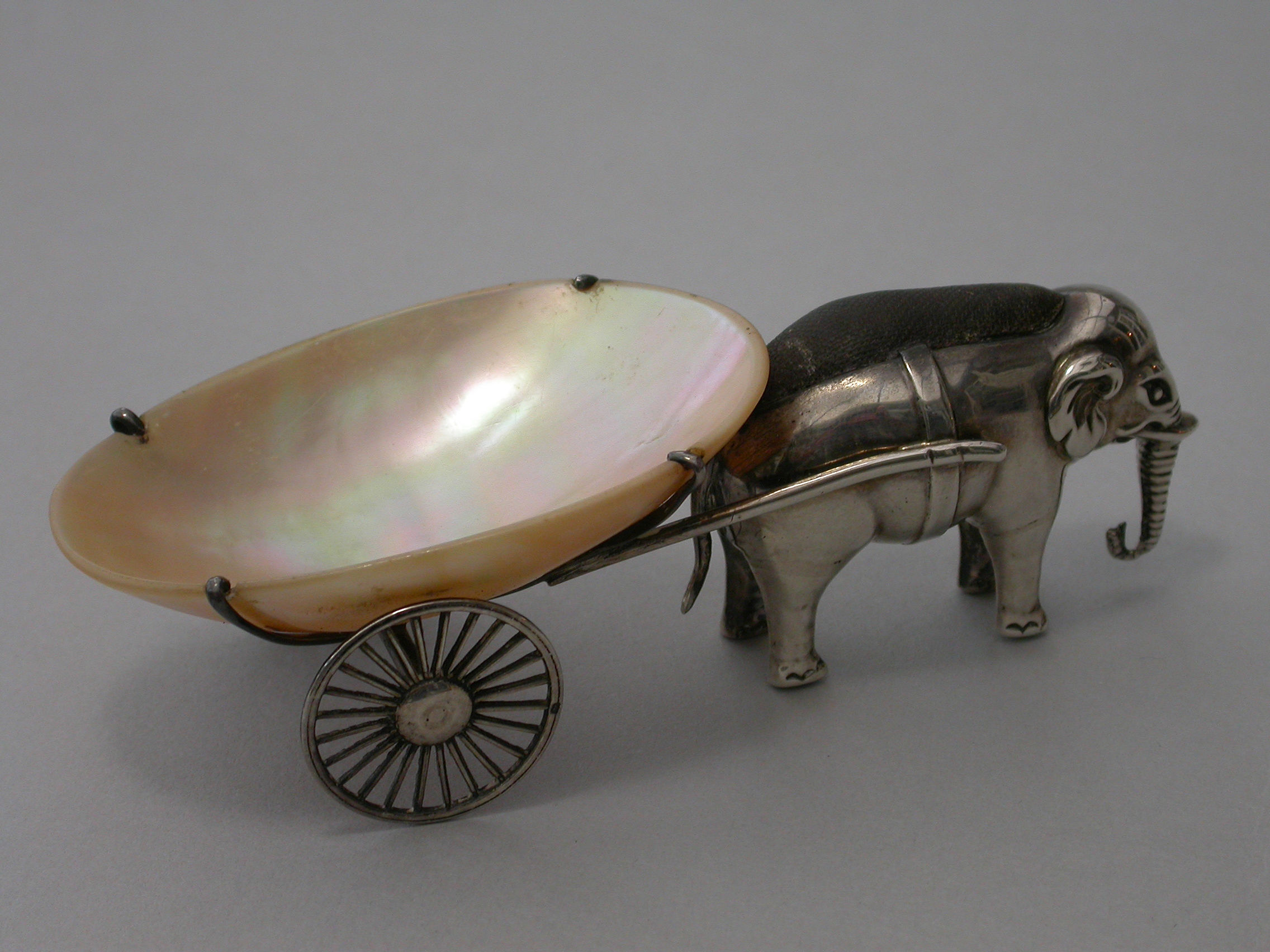 A rare Edwardian novelty silver Pin cushion made in the form of an elephant pulling a mother of pearl cart.