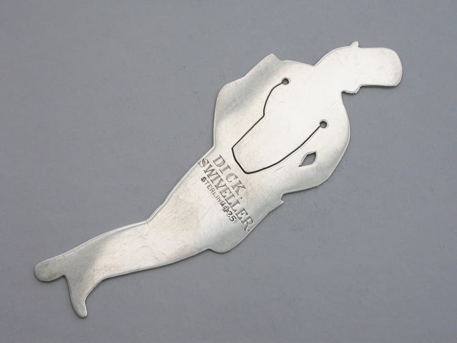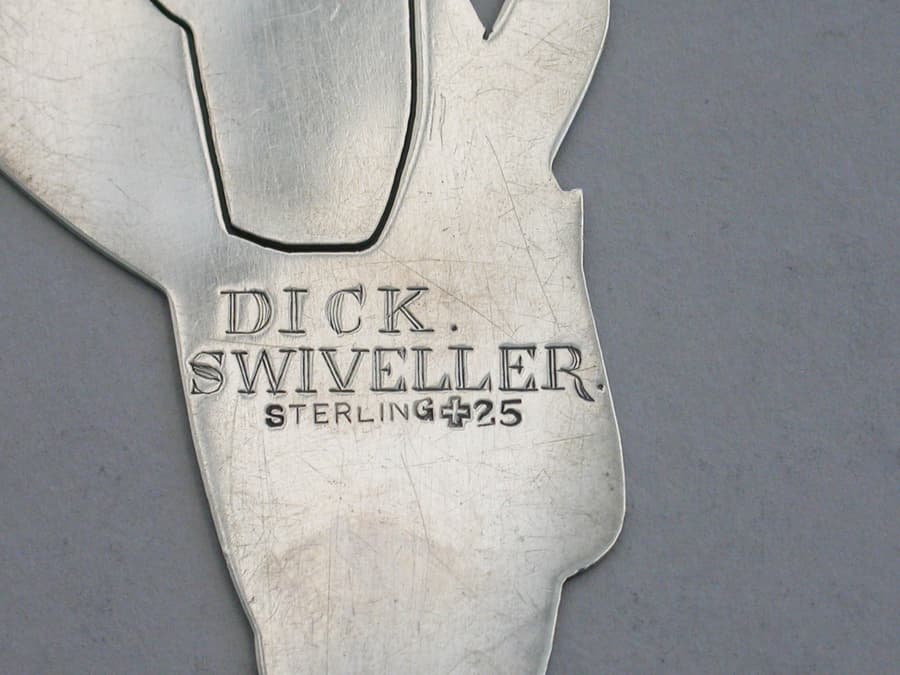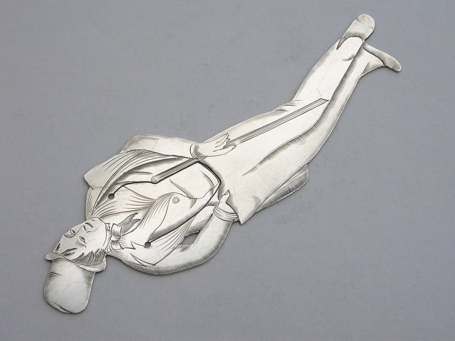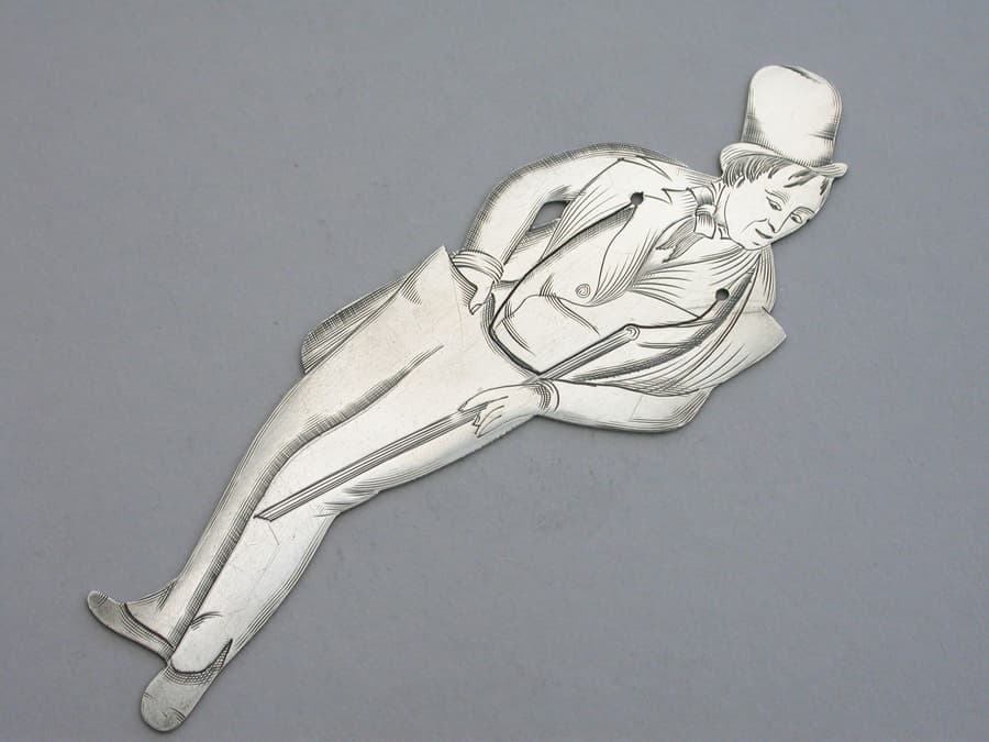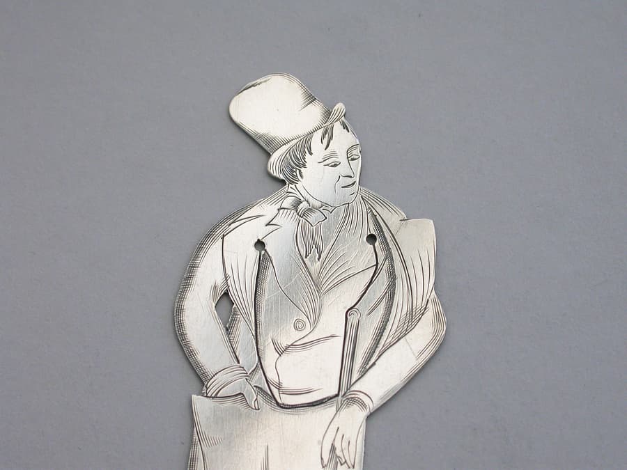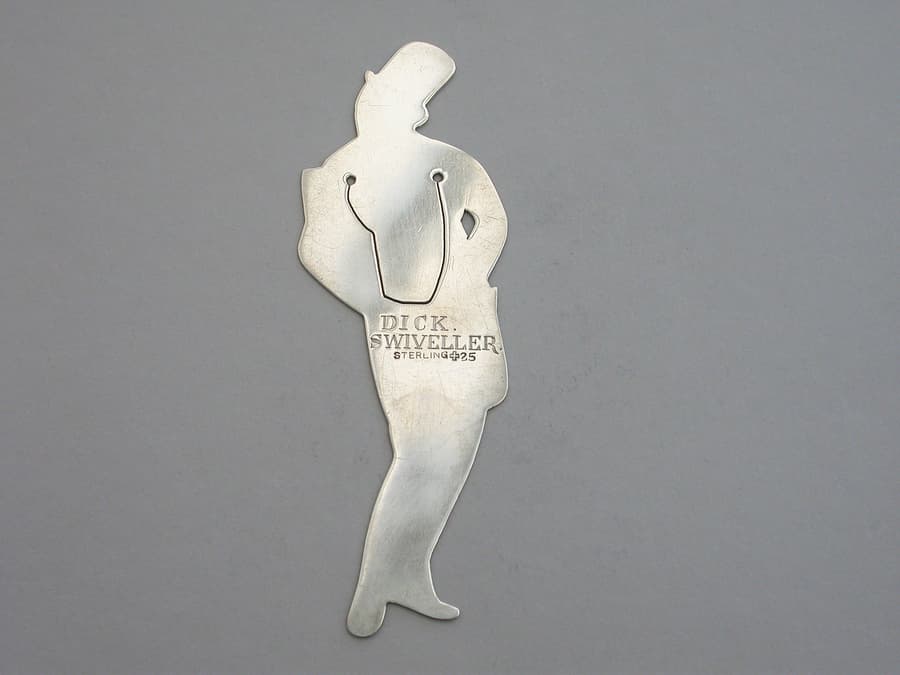 A rare early 20th century American novelty silver figural Bookmark, depicting the character Dick Swiveller from The Charles Dickens novel, The Old Curiosity Shop.