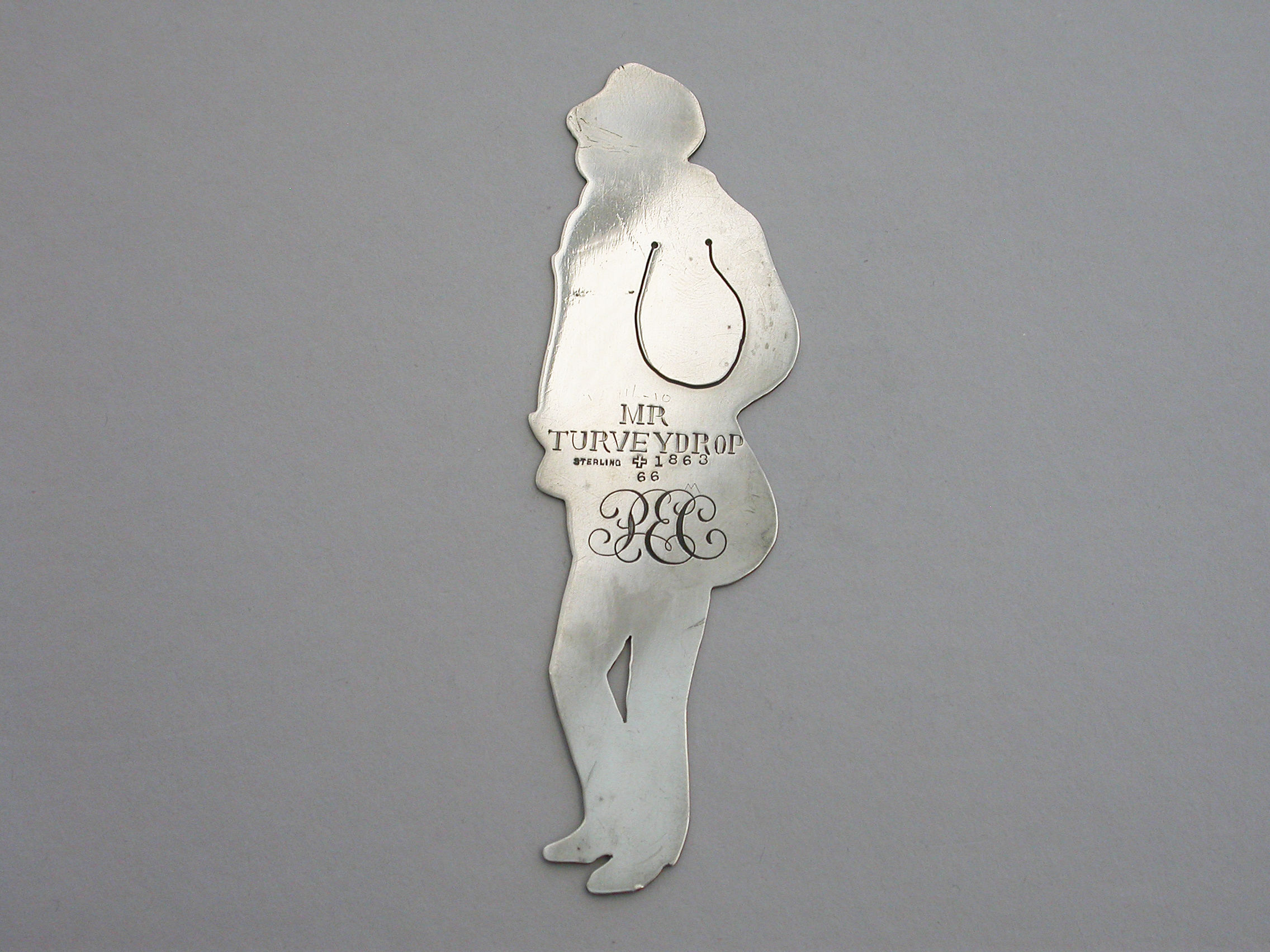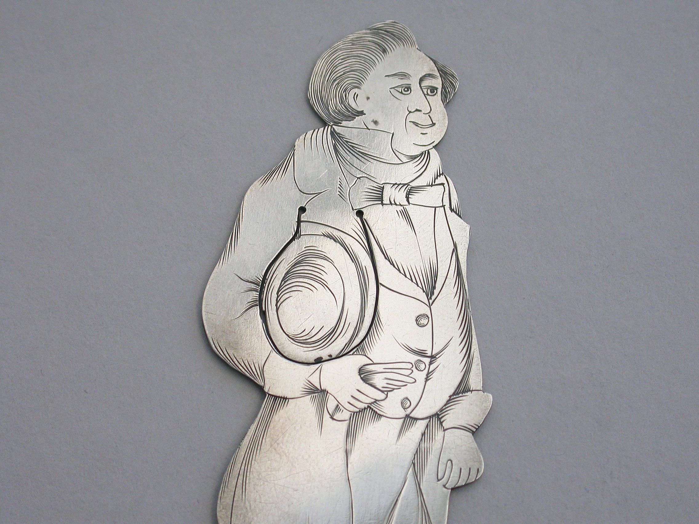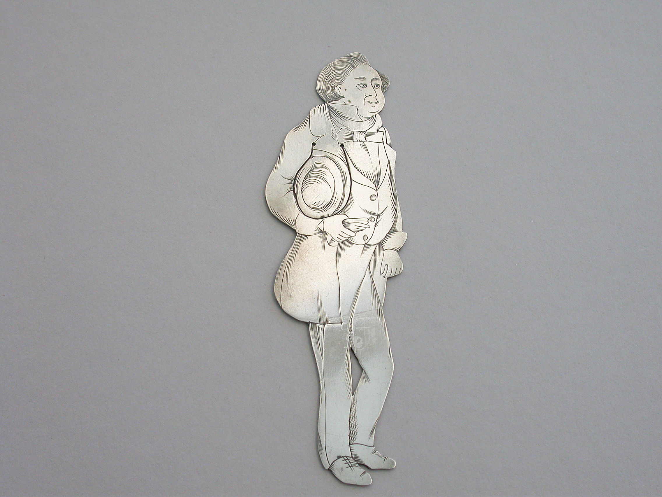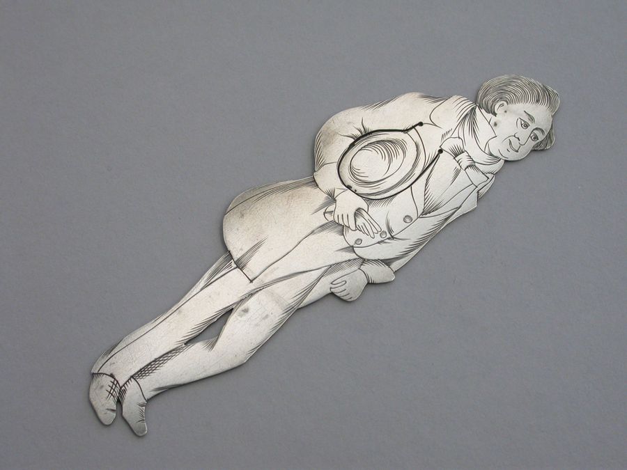 A rare early 20th century American novelty silver figural Bookmark, depicting the character Mr Turveydrop from the Charles Dickens novel Bleak House.