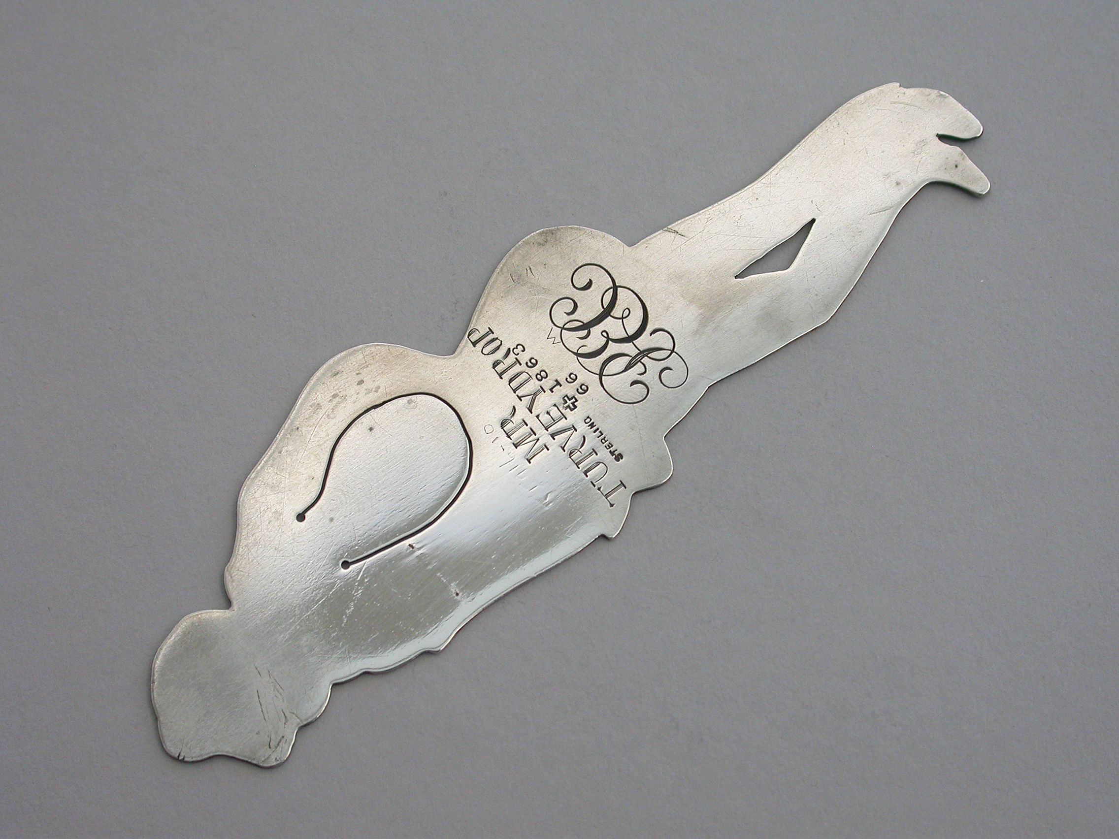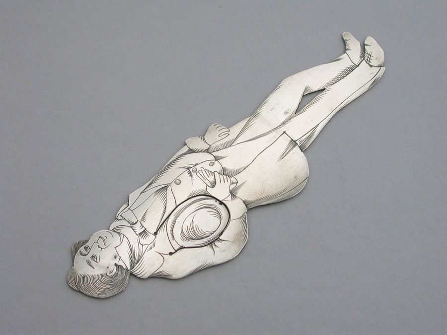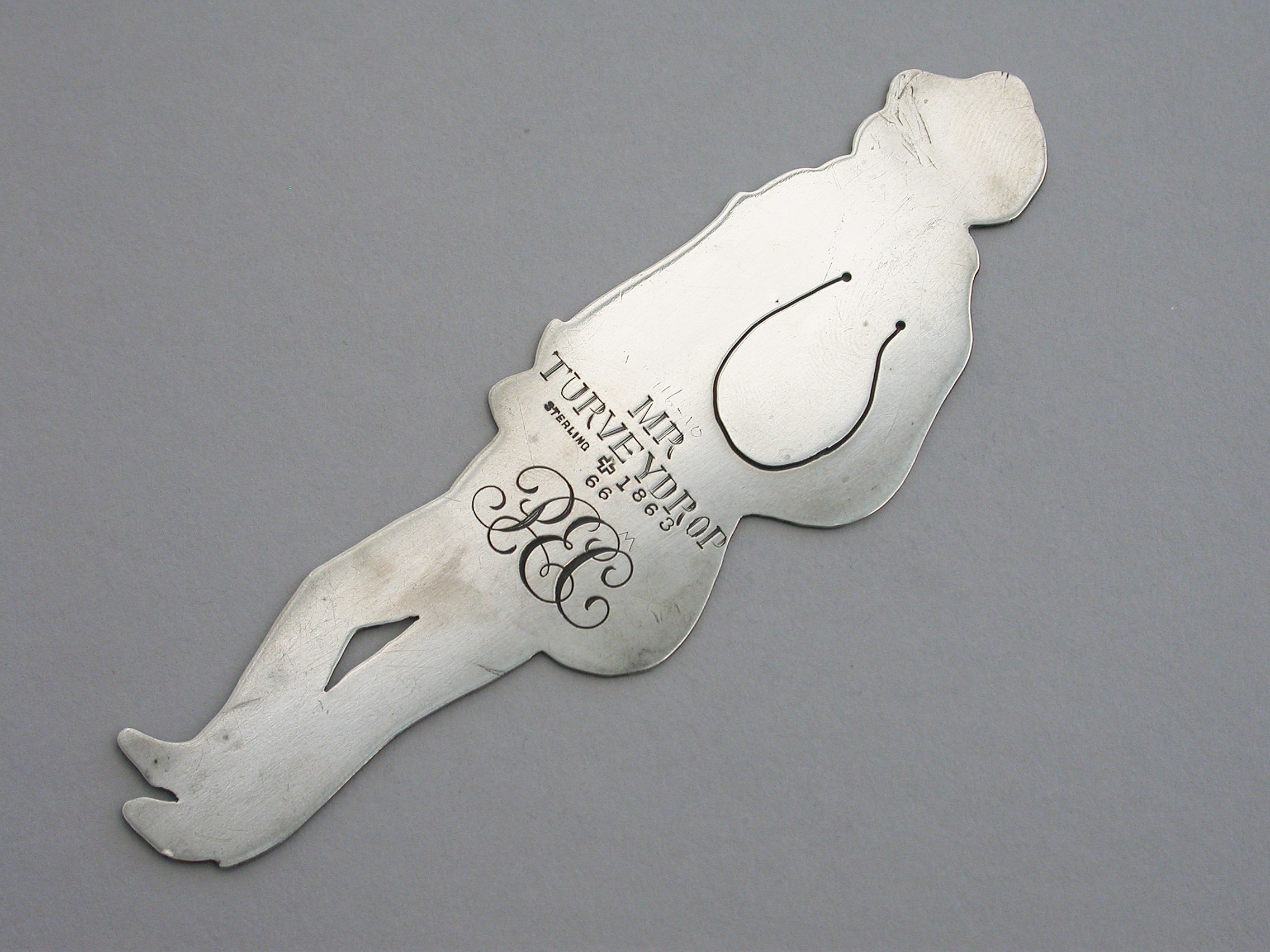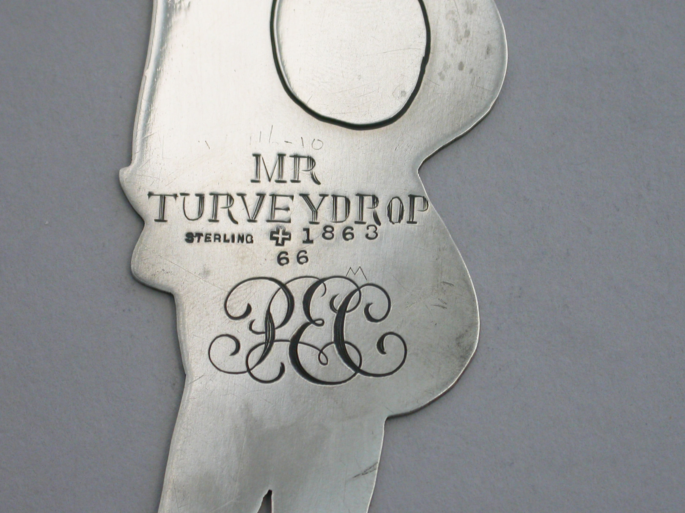 A rare early 20th century American novelty silver figural Bookmark, depicting the character Mr Turveydrop from the Charles Dickens novel Bleak House.