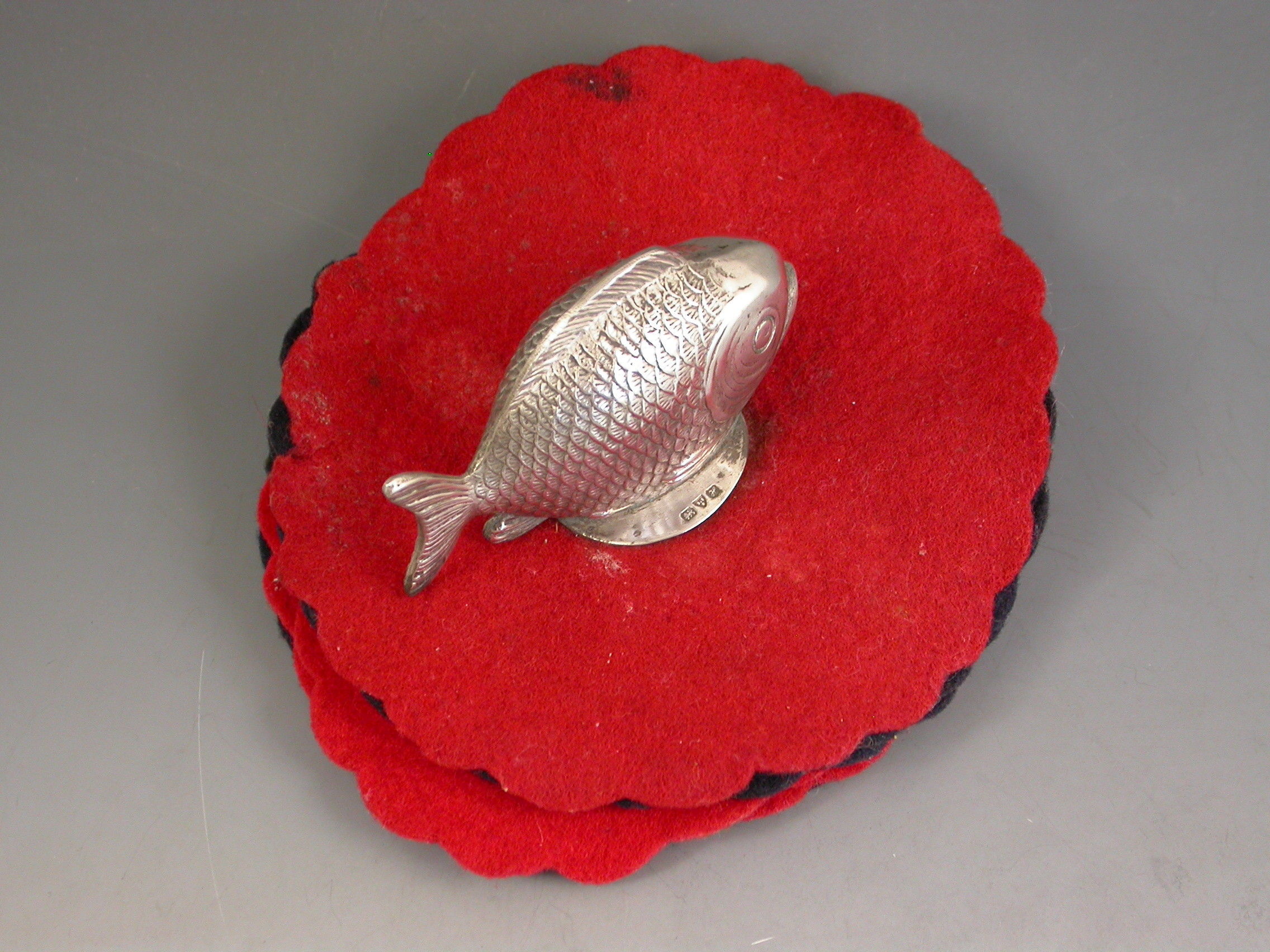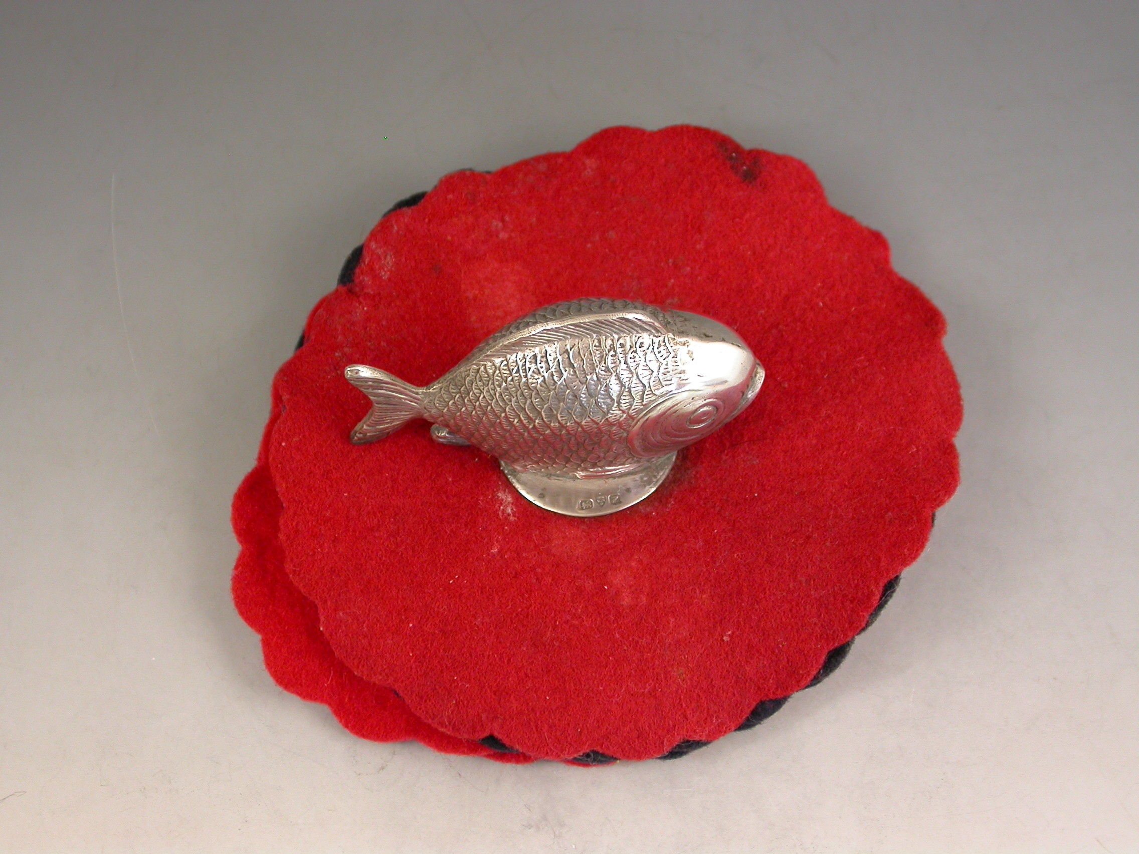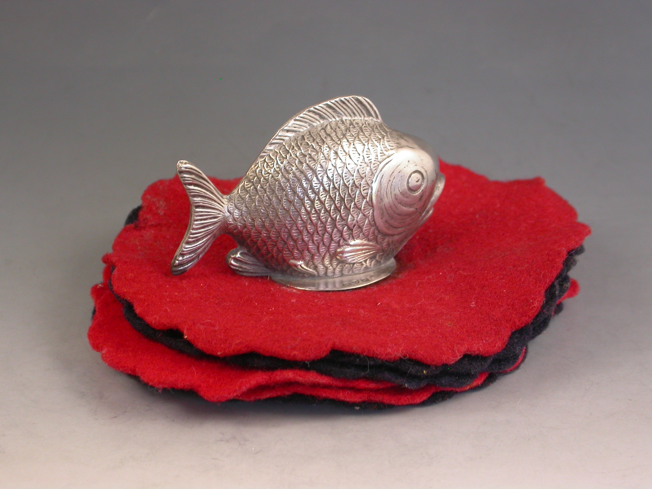 A rare Edwardian novelty silver Pen Wipe mounted with a figure of a Fish, on a multi-layered red and black felt base.