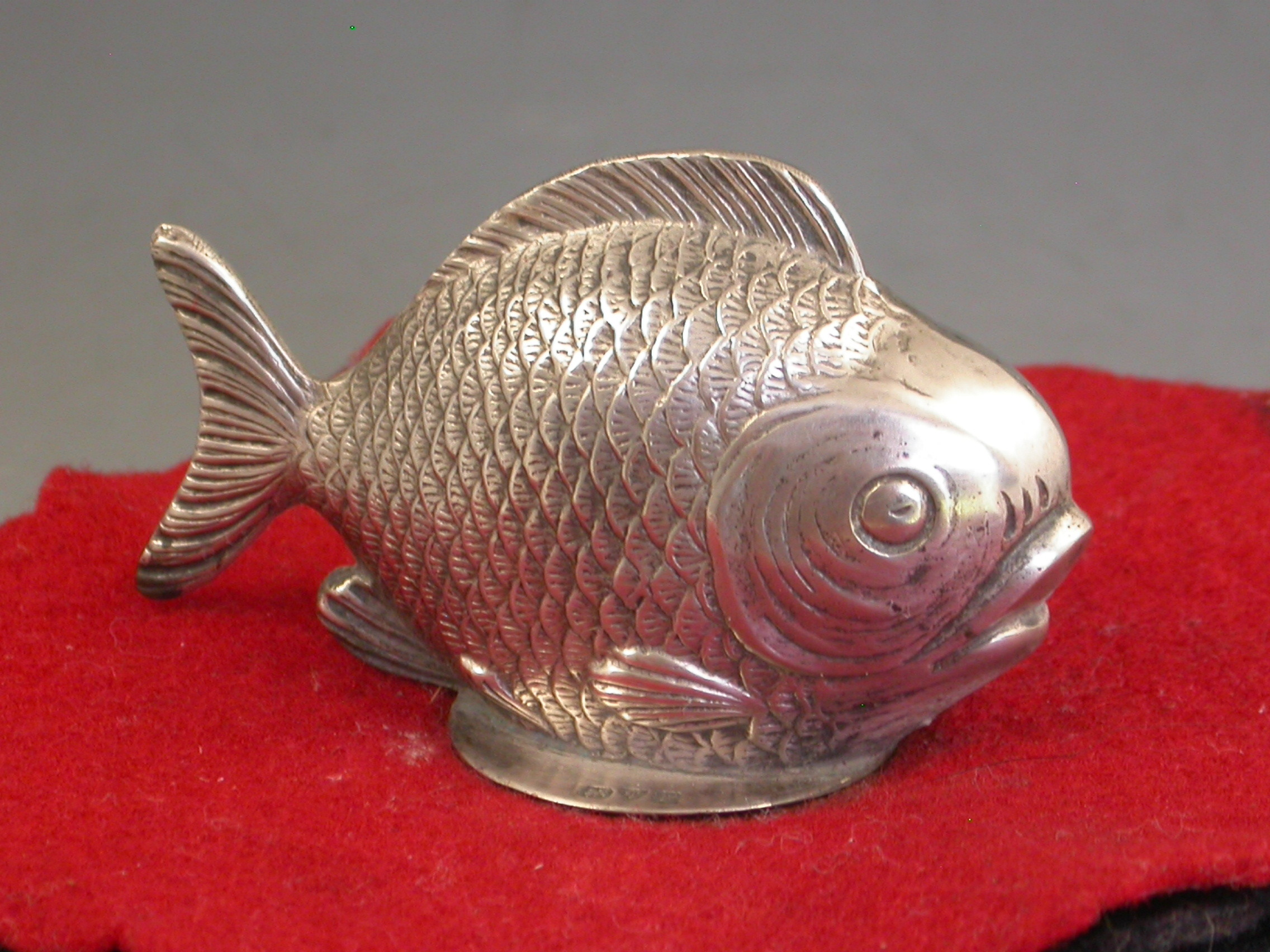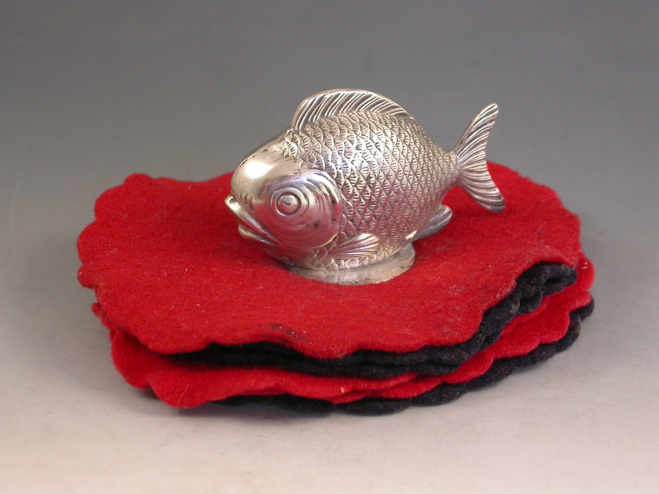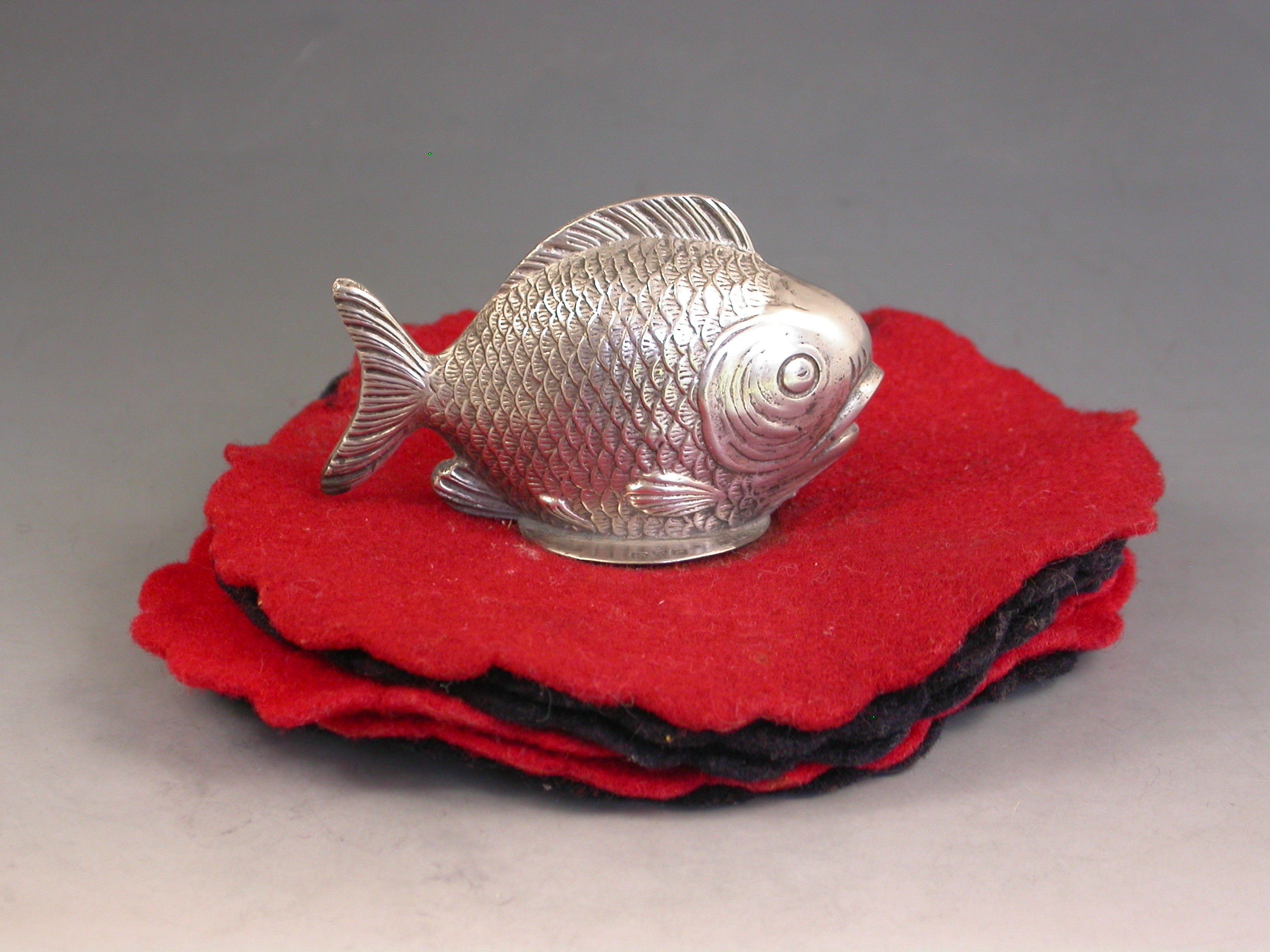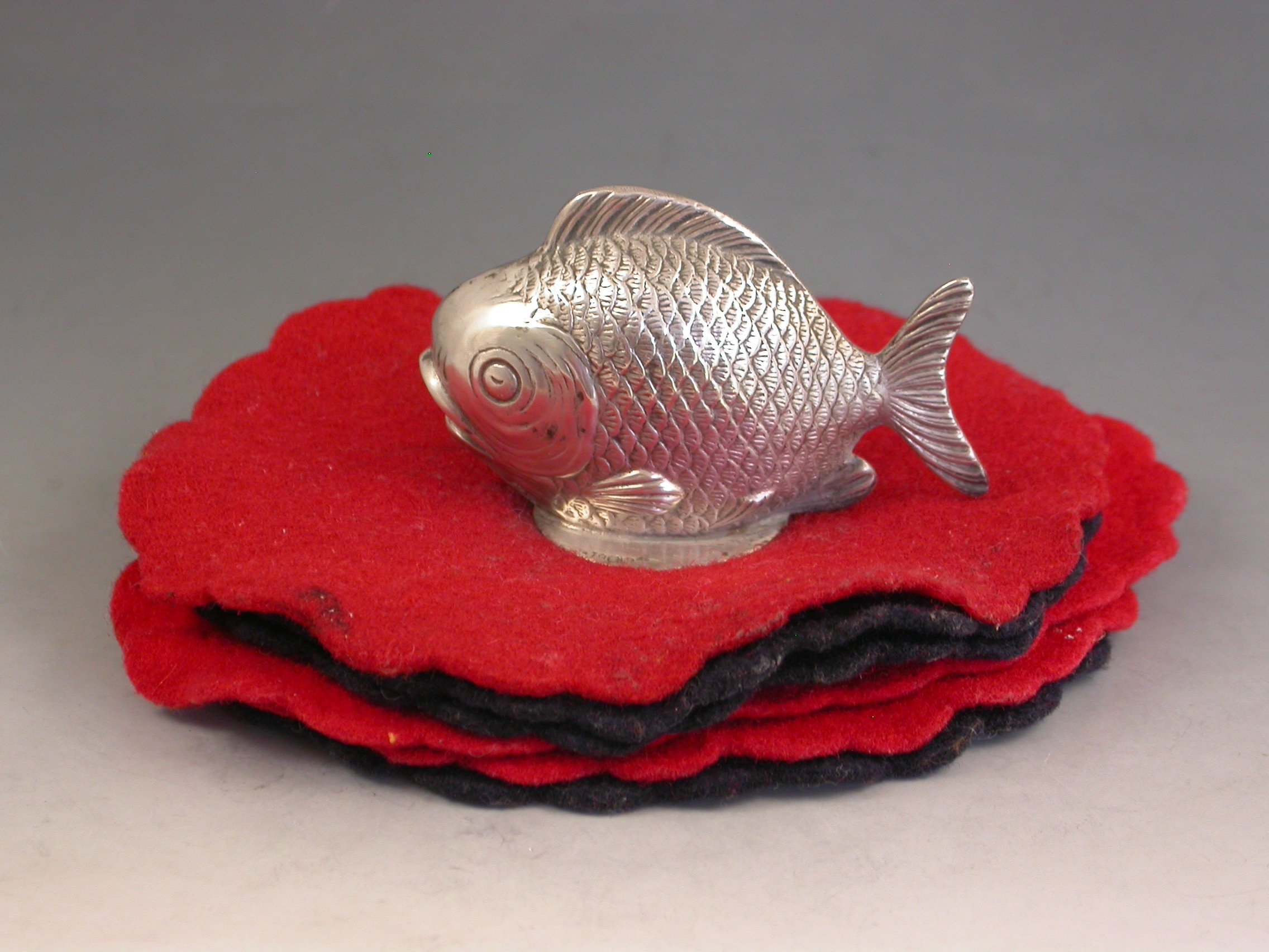 A rare Edwardian novelty silver Pen Wipe mounted with a figure of a Fish, on a multi-layered red and black felt base.