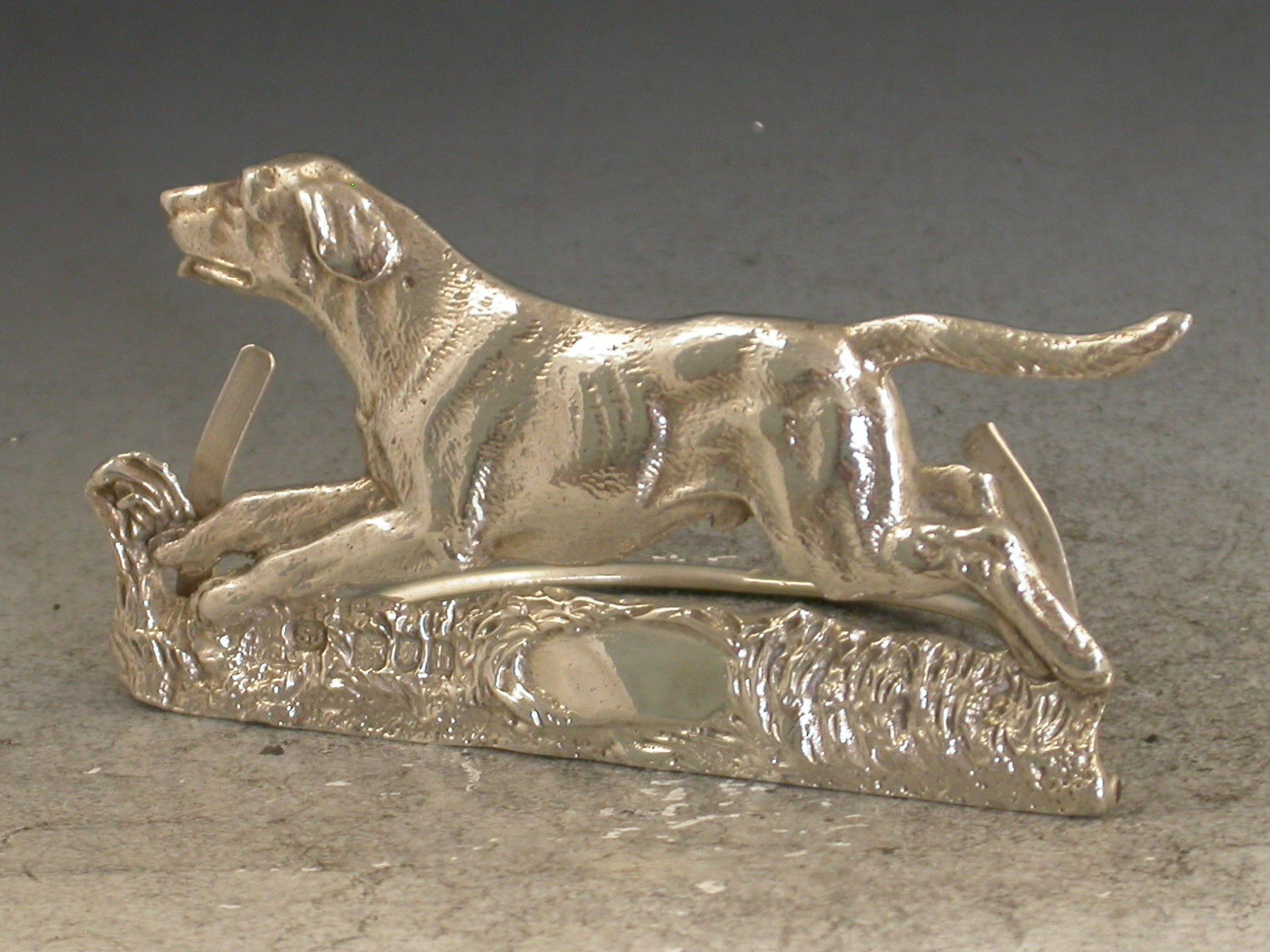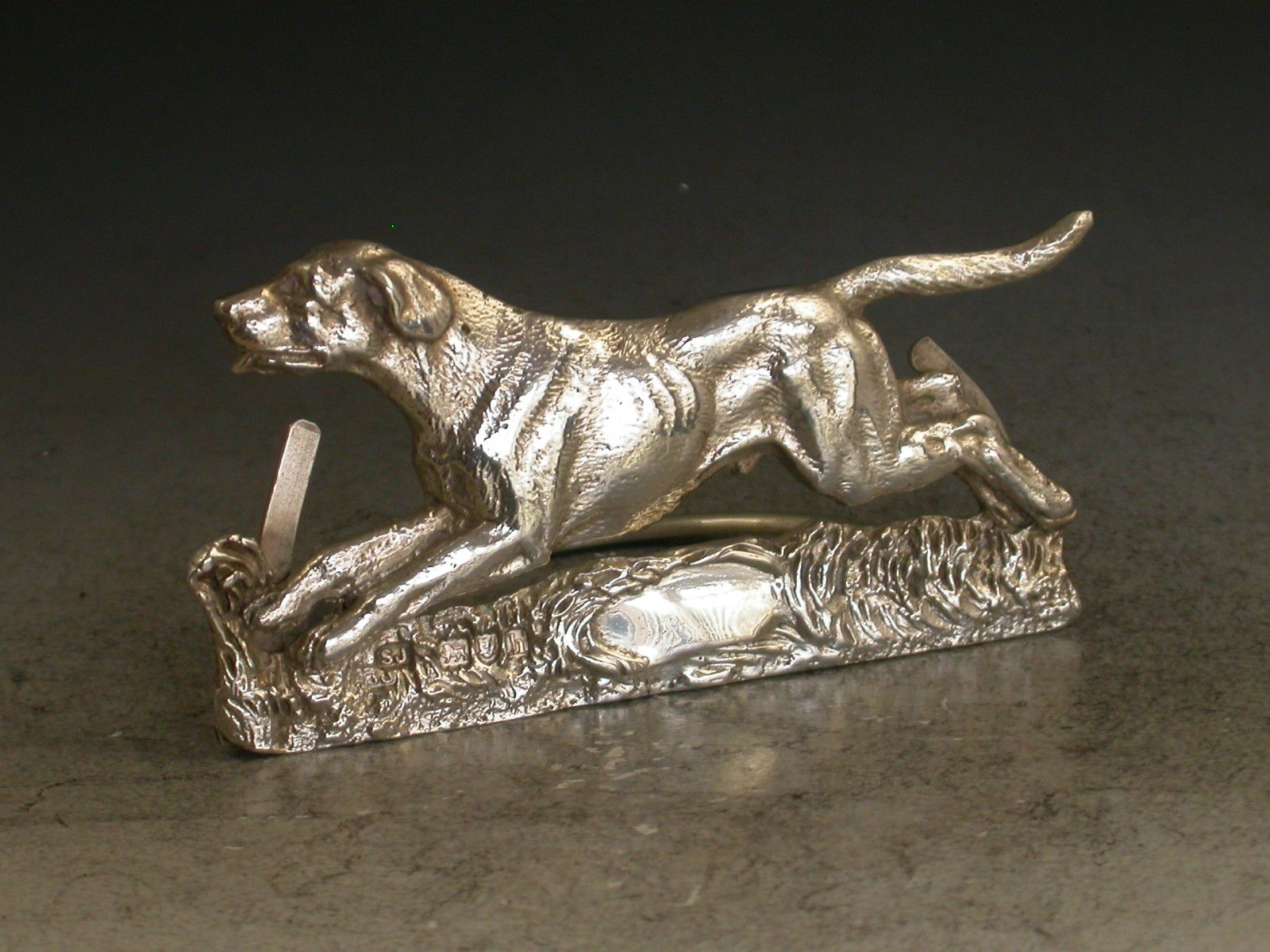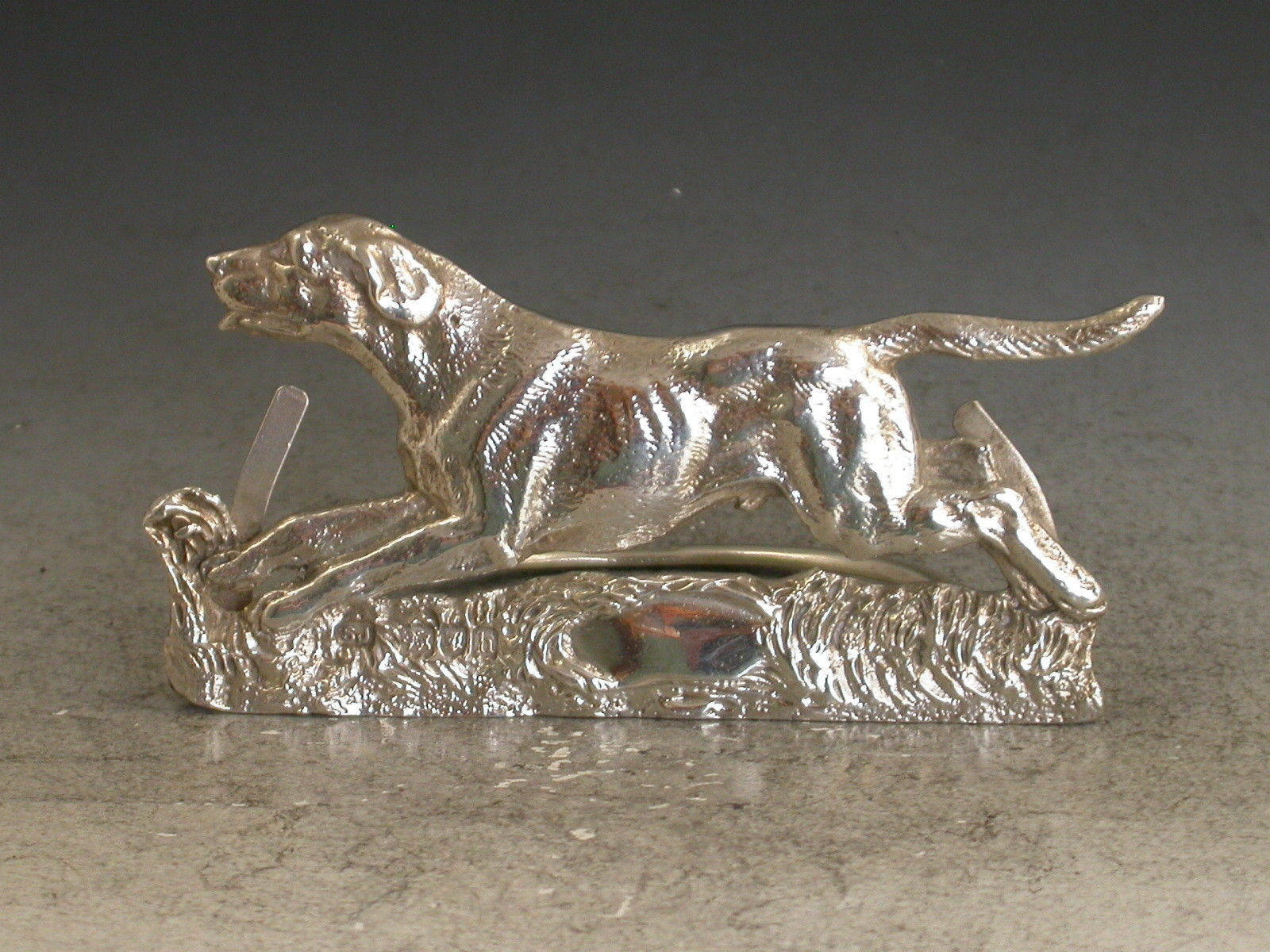 A good quality Edwardian novelty cast silver Menu Holder made in the form of a running Foxhound, on hinged 'D' shaped base.
