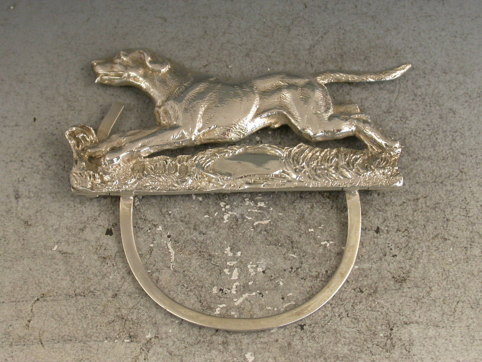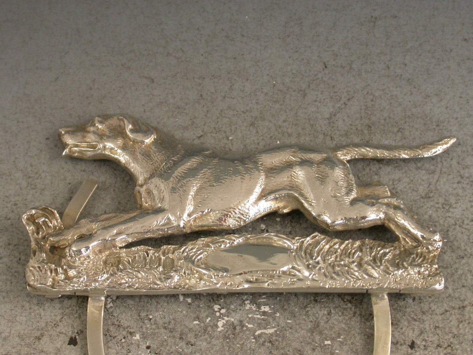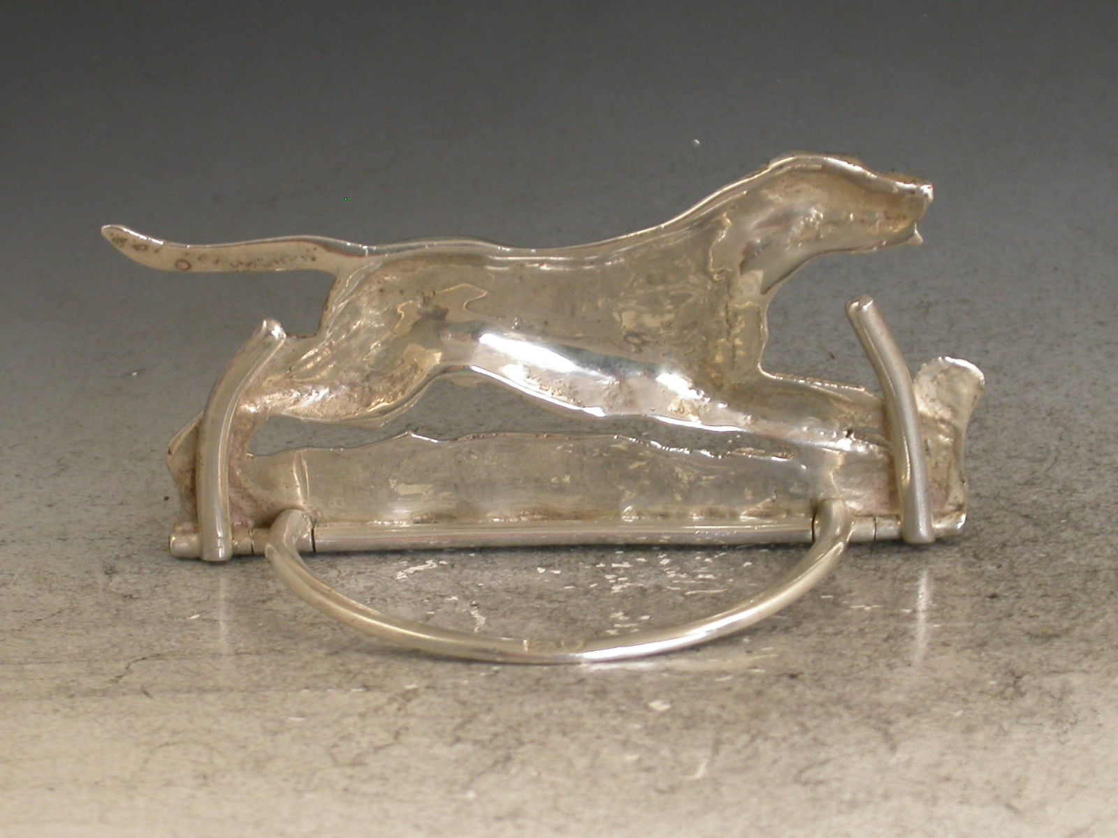 A good quality Edwardian novelty cast silver Menu Holder made in the form of a running Foxhound, on hinged 'D' shaped base.