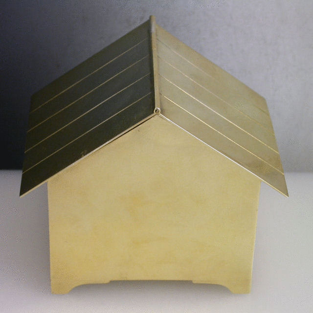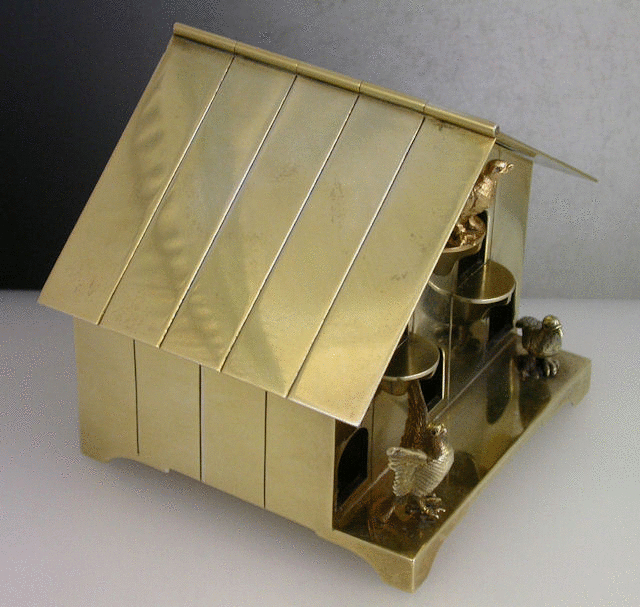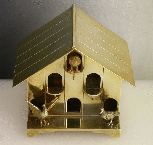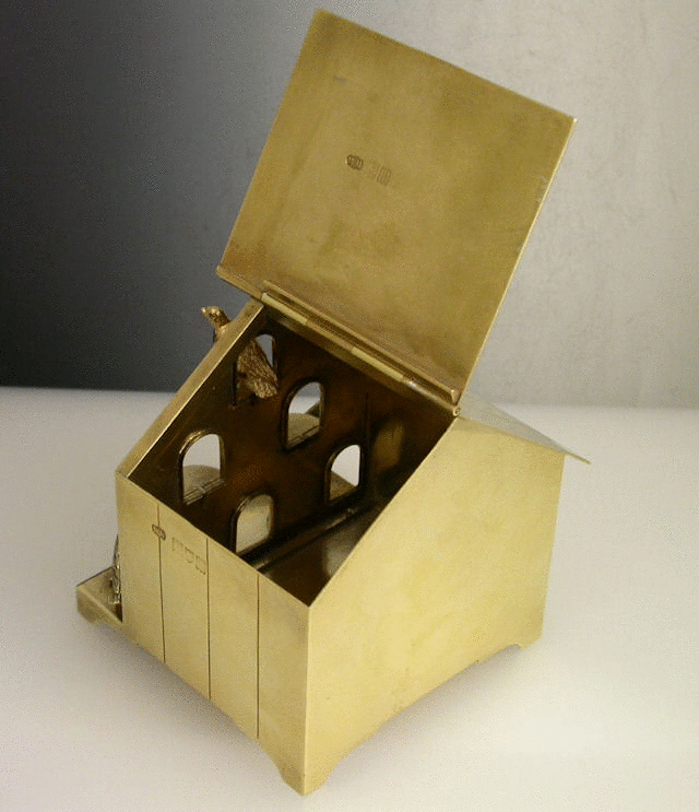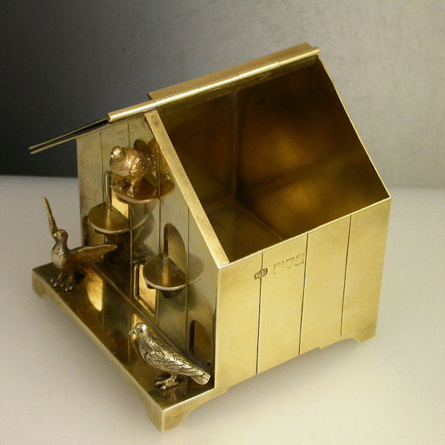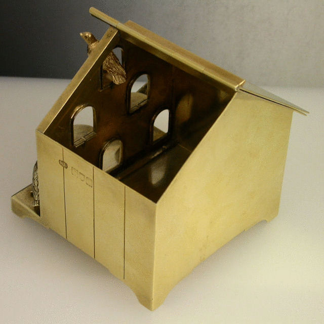 A very unusual Edwardian Novelty silver gilt Box, made in the form of an English wooden Dovecote with six entrance holes and with three birds emerging, standing on four panel feet, the roof with hinged lid.