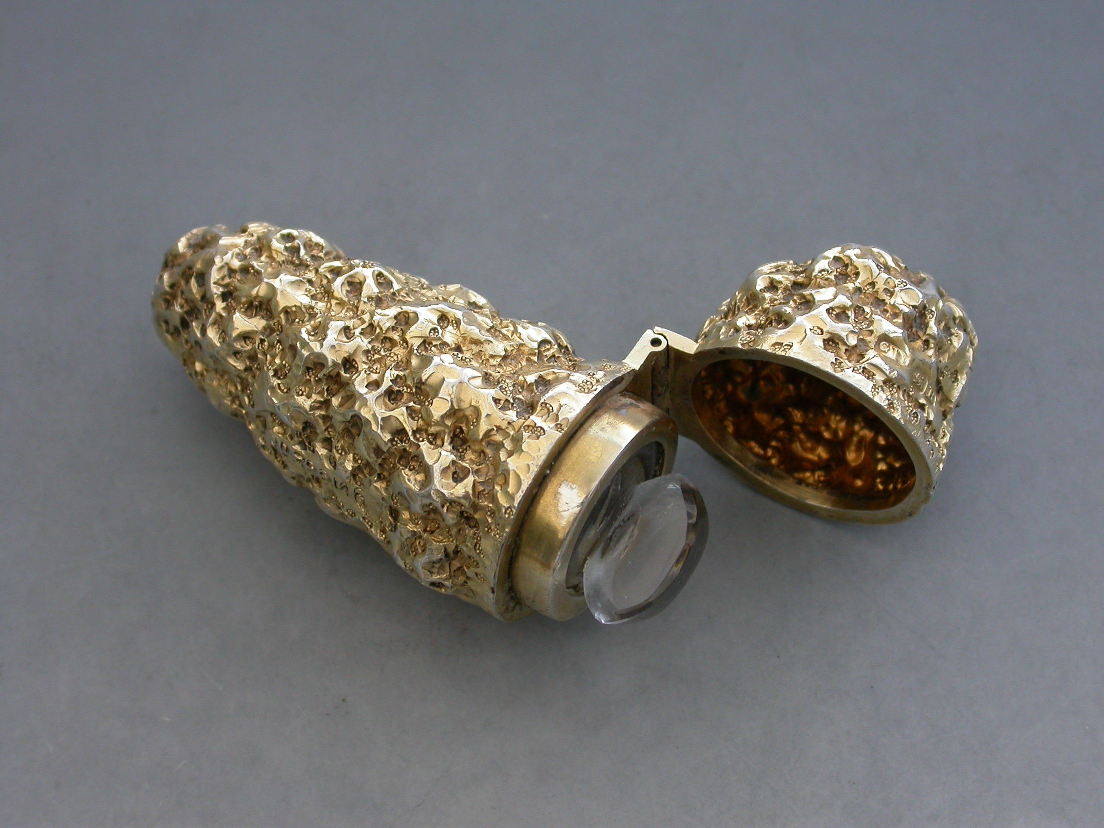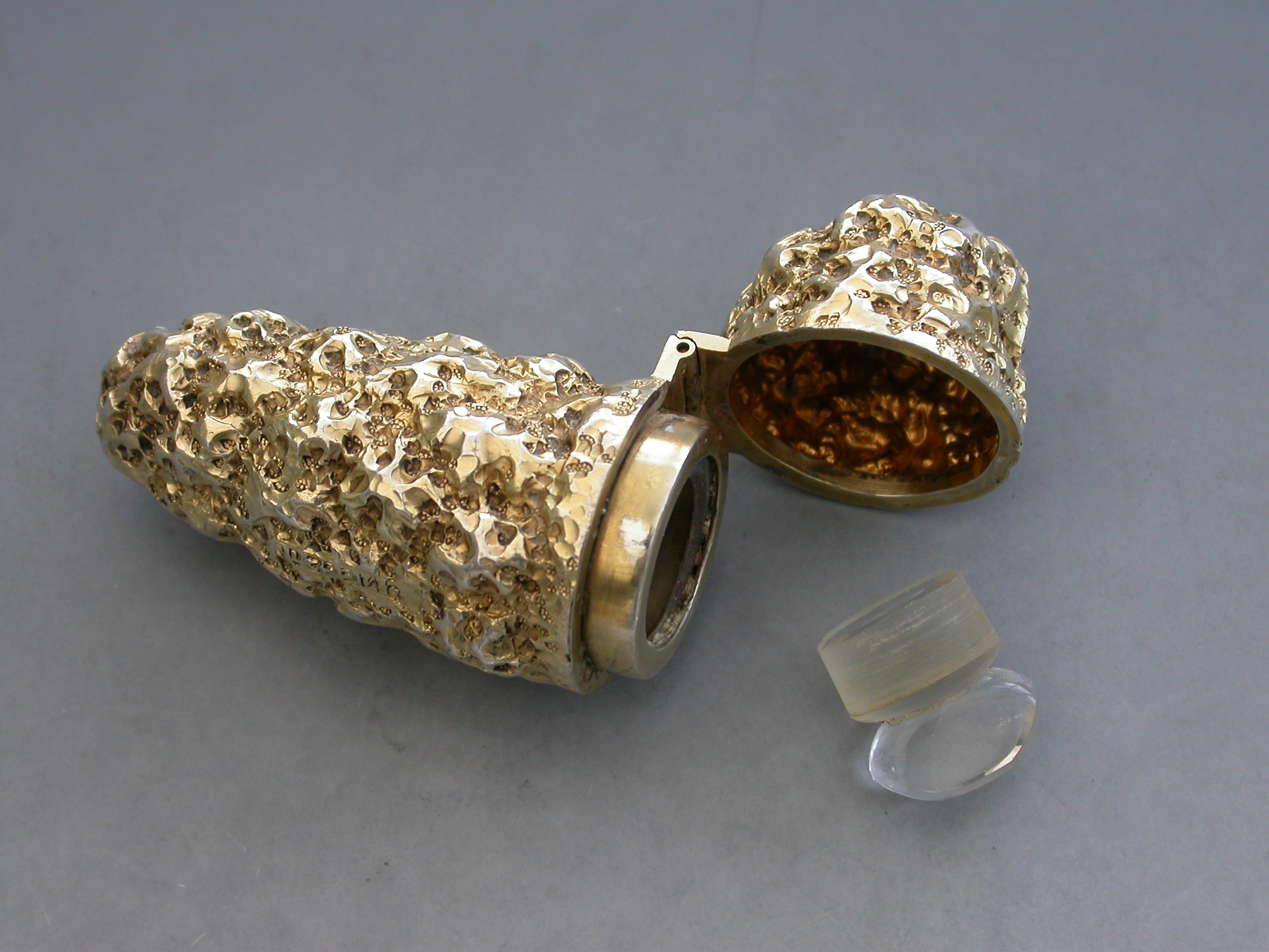 A rare and unusual Edwardian novelty silver gilt Scent Bottle formed as a Gold Nugget, with hinged lid, glass liner and stopper.