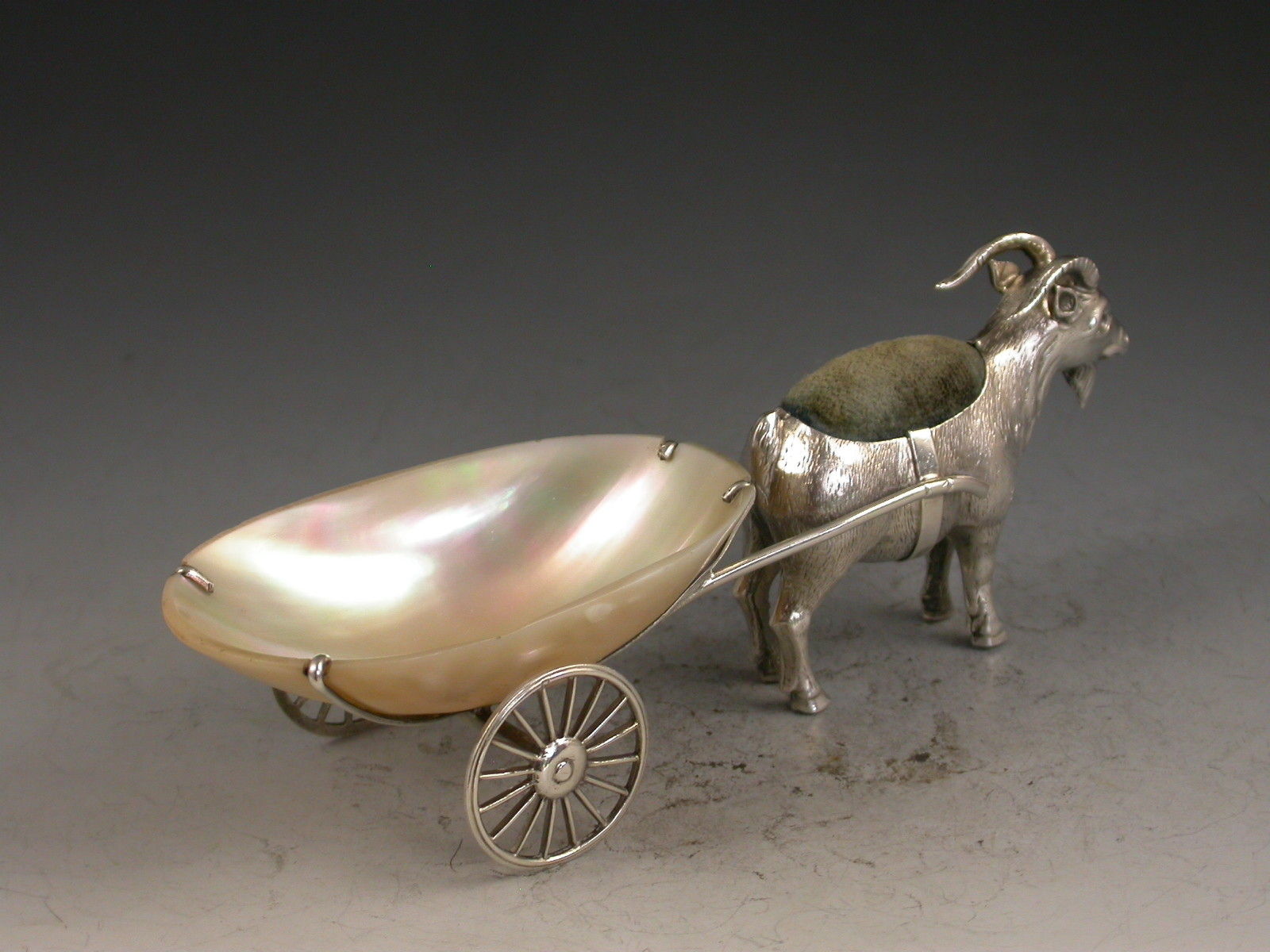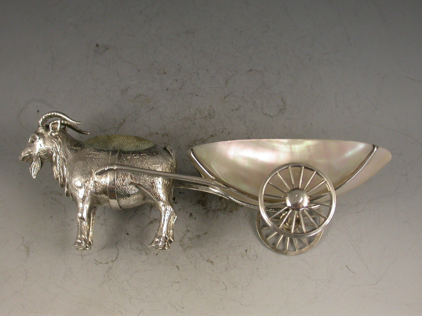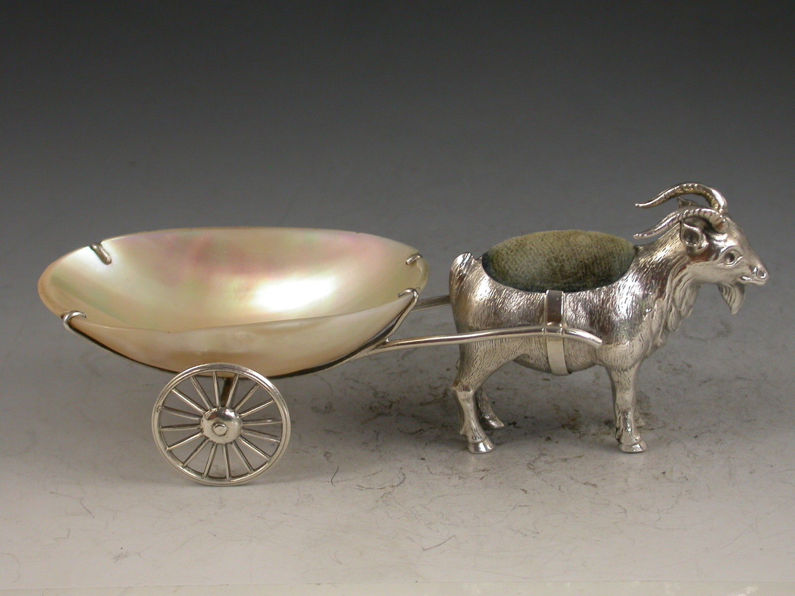 A rare Edwardian novelty silver Pin cushion made in the form of a Goat pulling a mother of pearl cart with two revolving silver wheels.