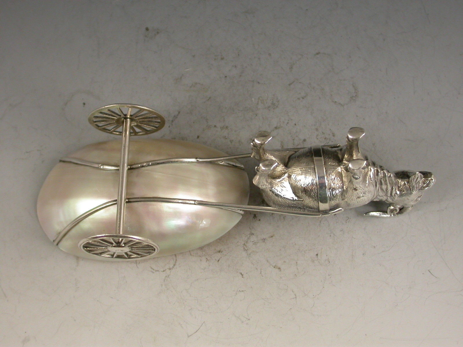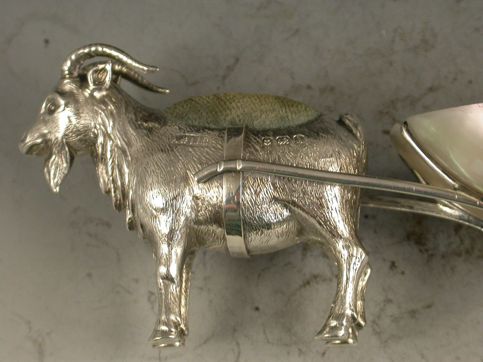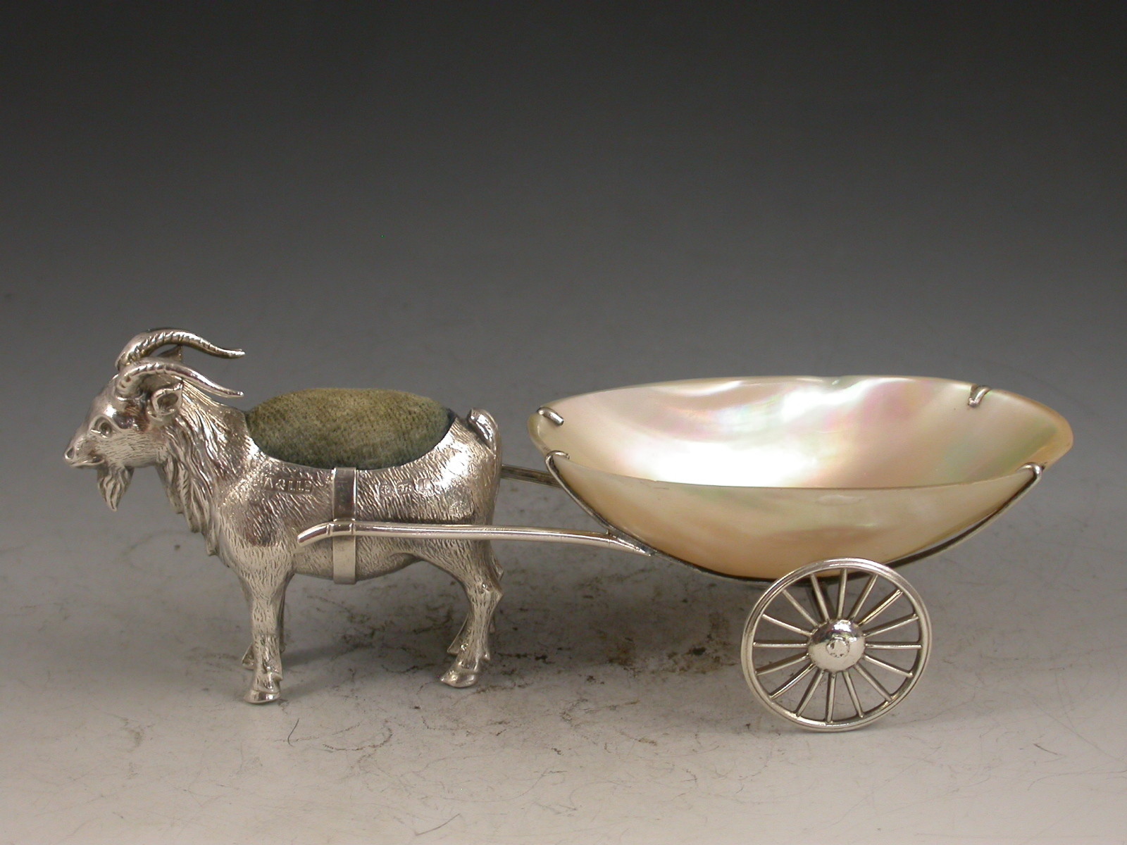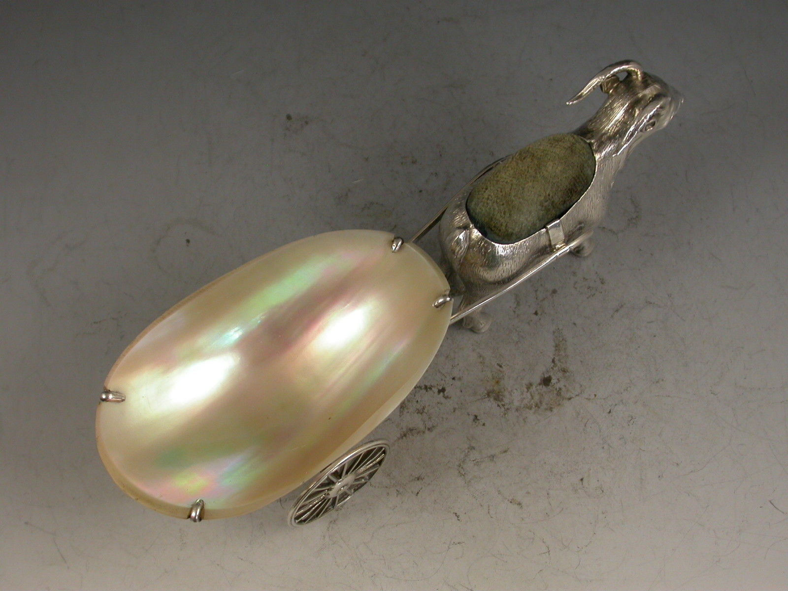 A rare Edwardian novelty silver Pin cushion made in the form of a Goat pulling a mother of pearl cart with two revolving silver wheels.