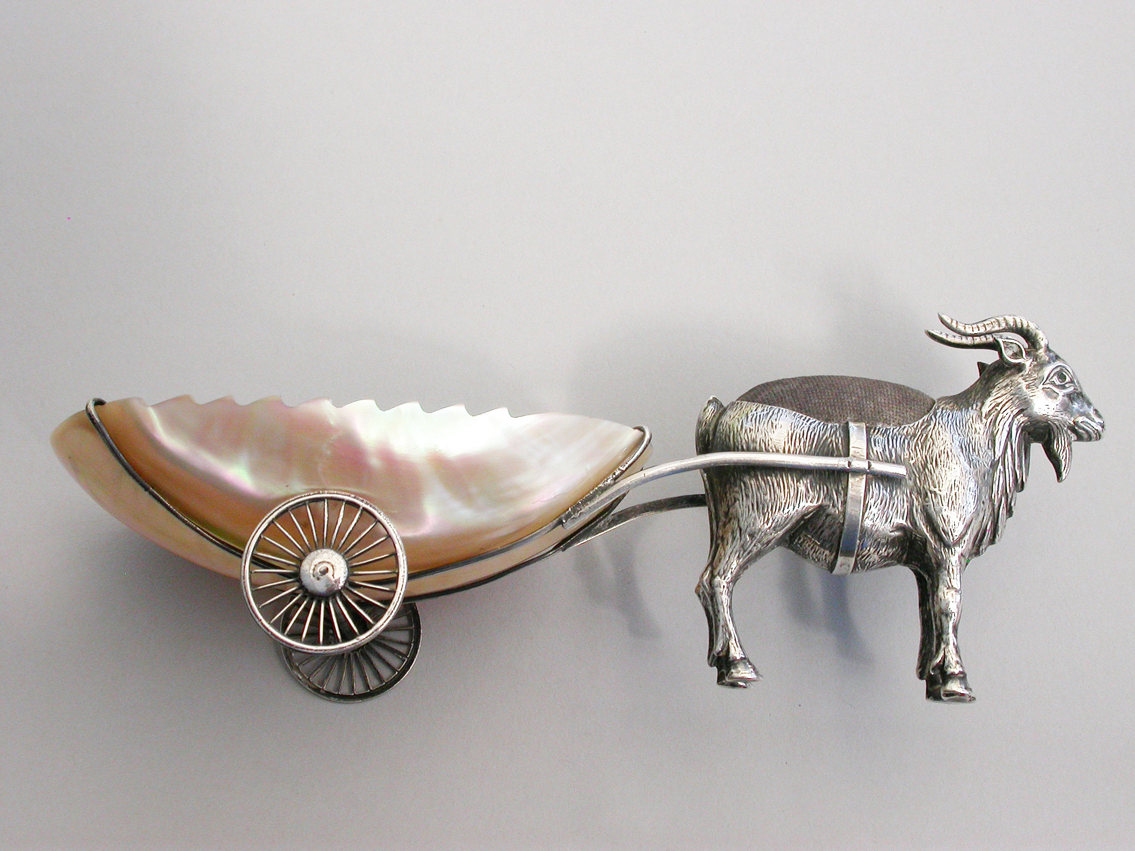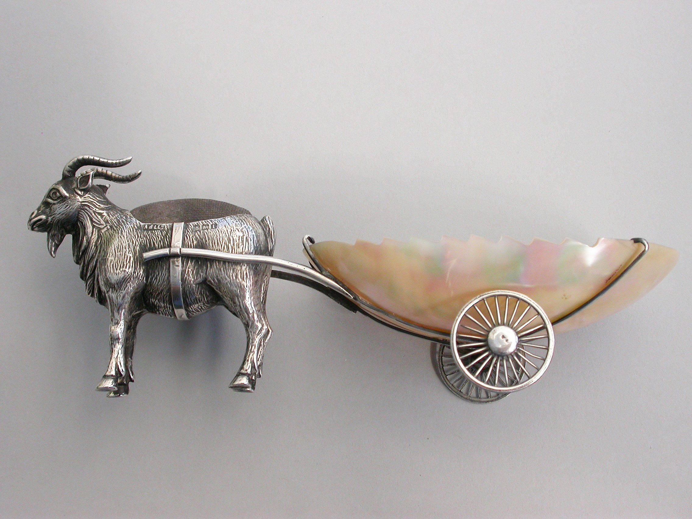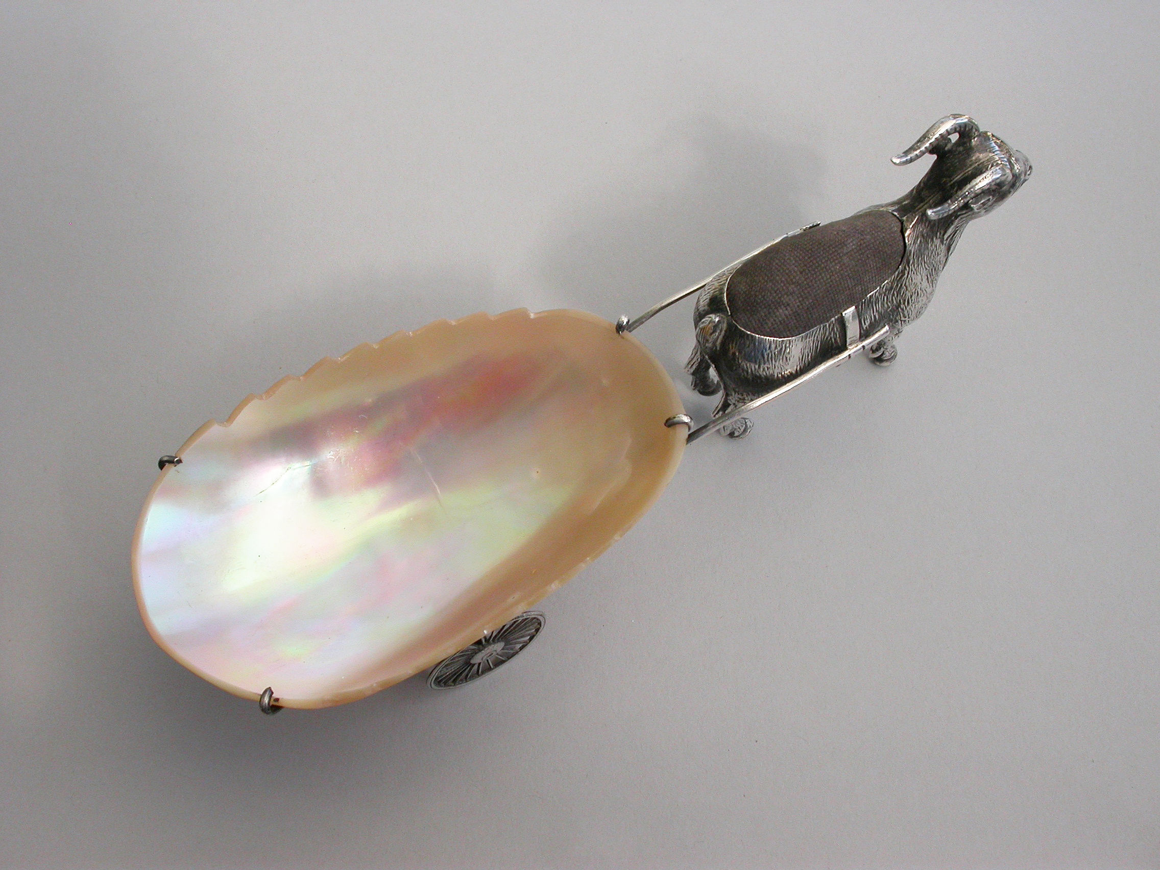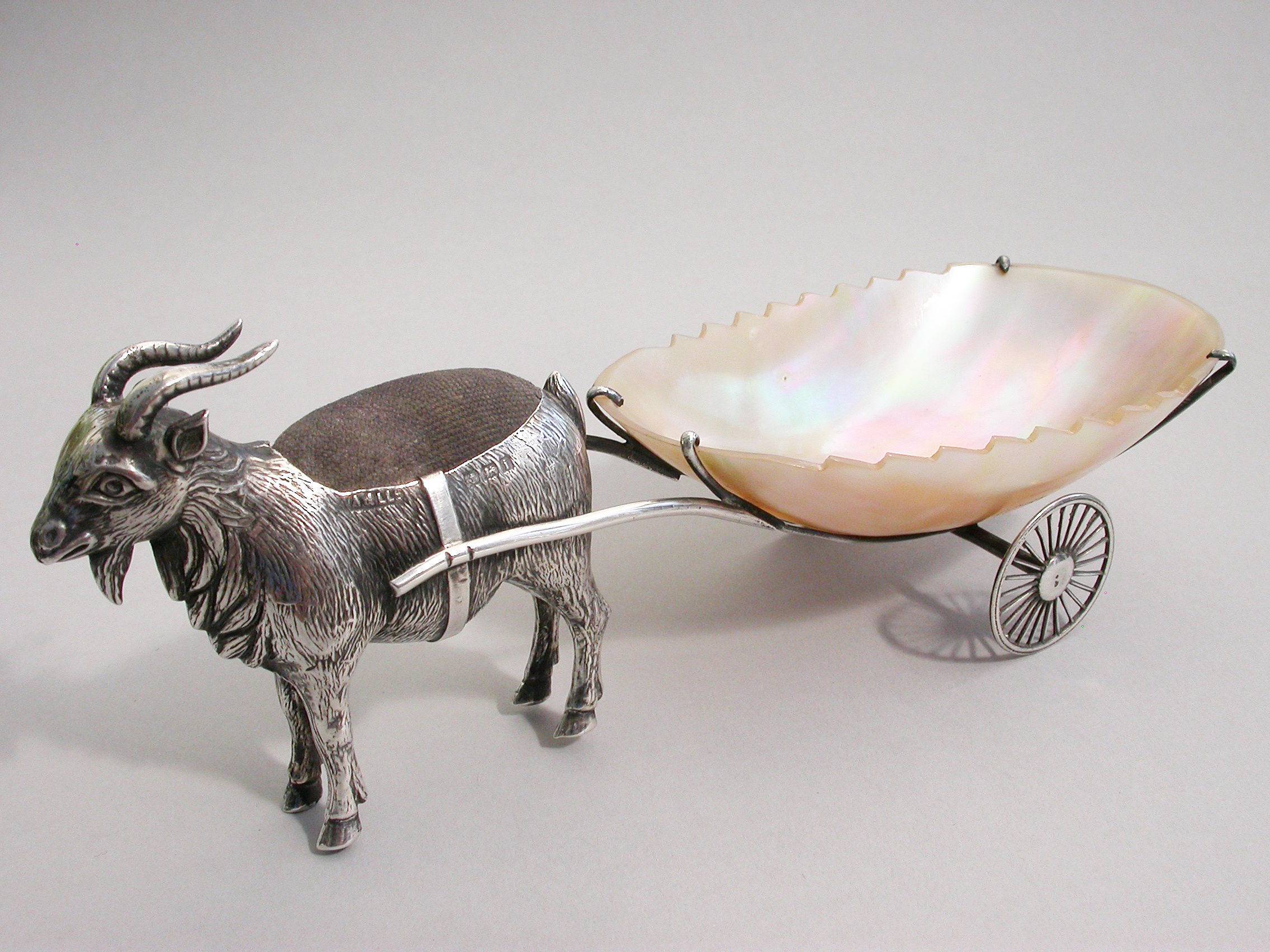 An extremely rare Edwardian novelty silver Pin Cushion, modeled as a Goat pulling a shaped Mother of Pearl cart on two wheels. The Goat realistically modeled with fine detail and complete with original velvet cushion.
