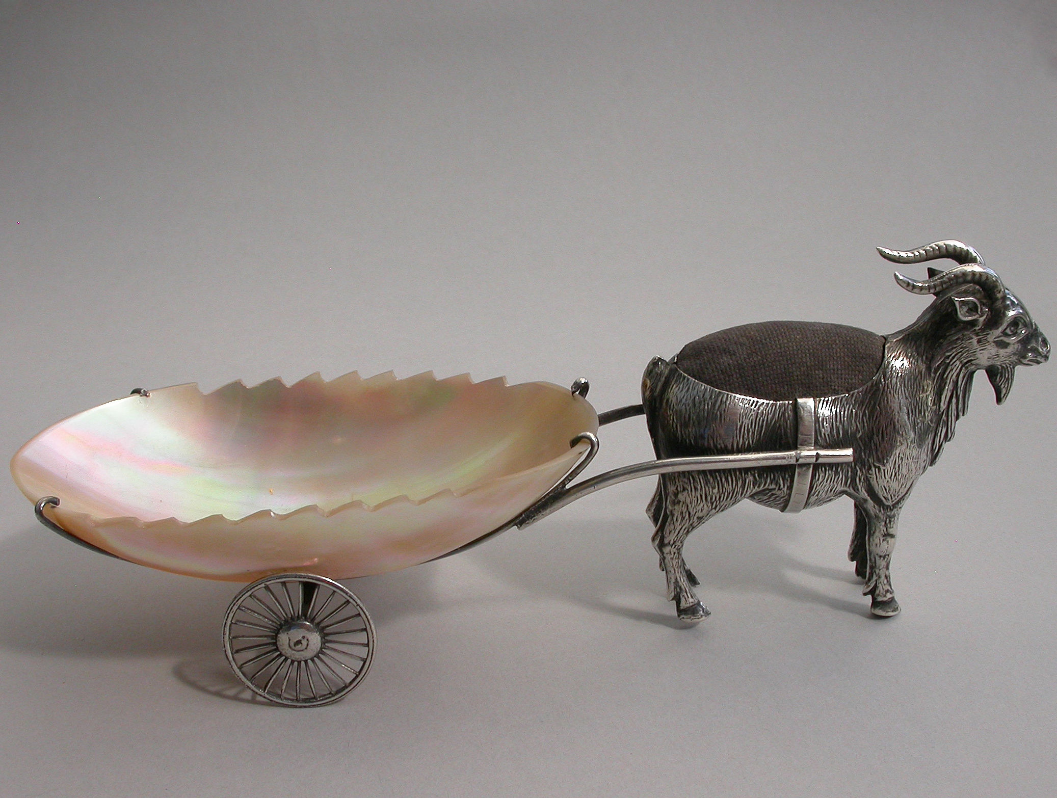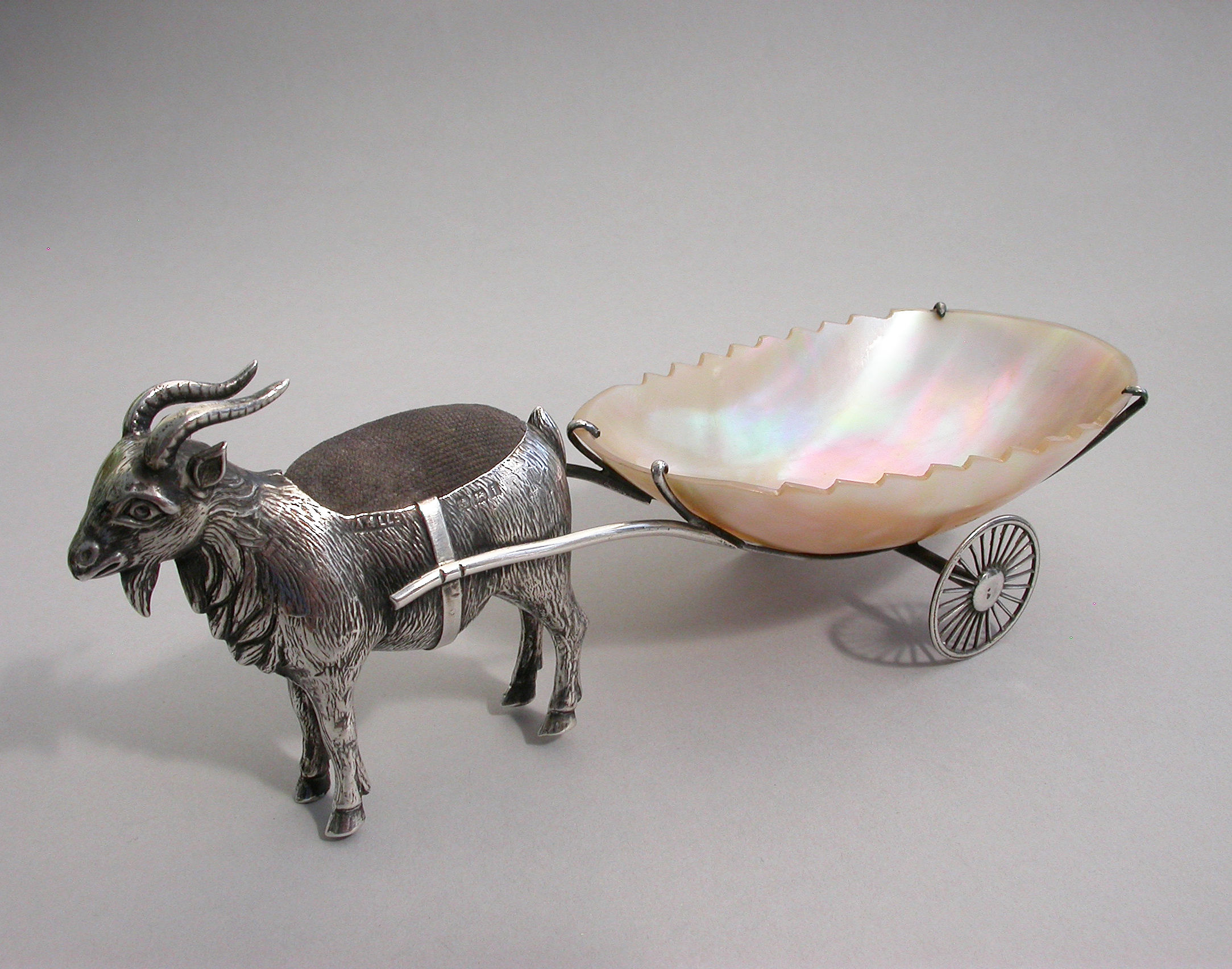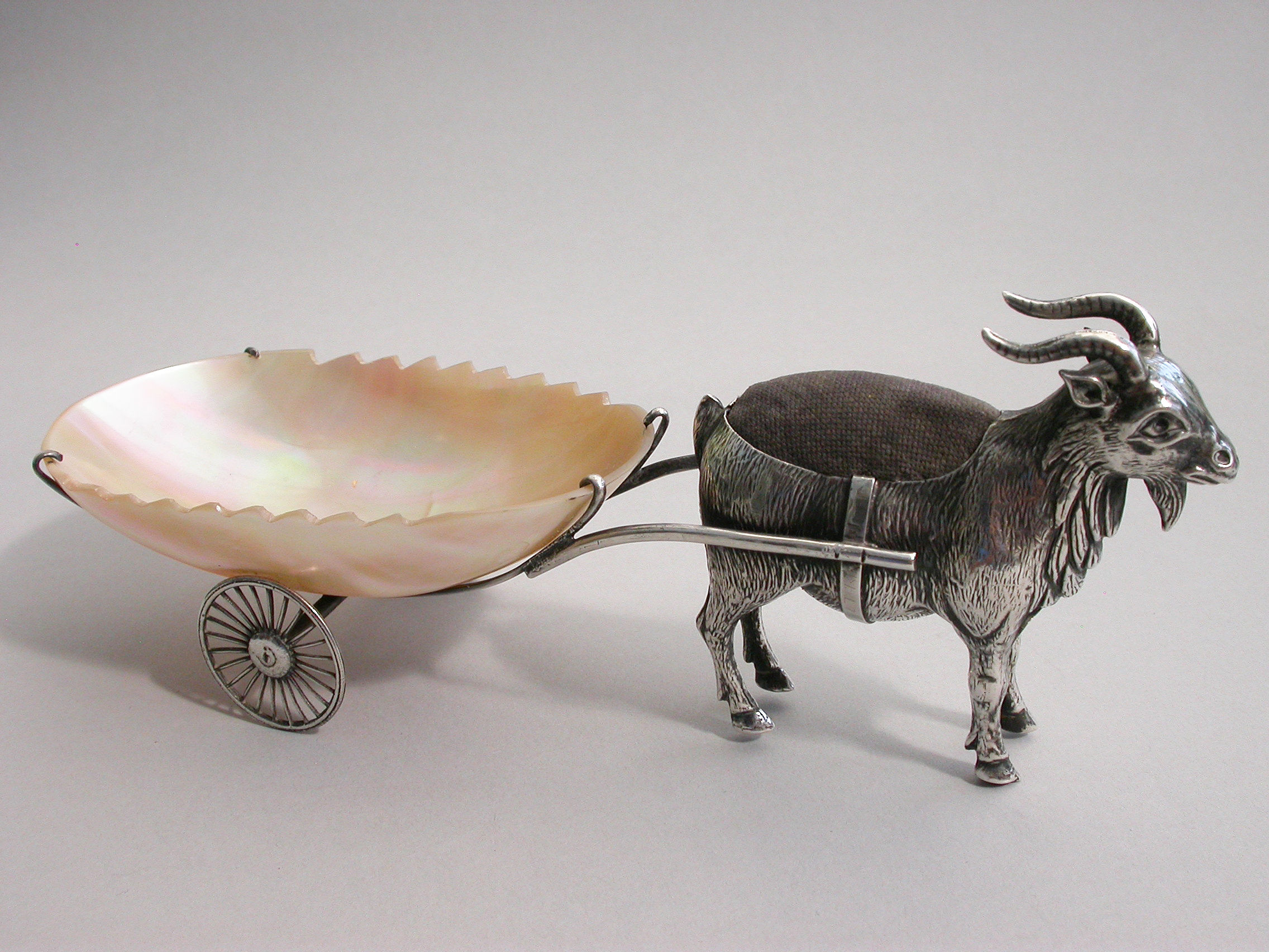An extremely rare Edwardian novelty silver Pin Cushion, modeled as a Goat pulling a shaped Mother of Pearl cart on two wheels. The Goat realistically modeled with fine detail and complete with original velvet cushion.
