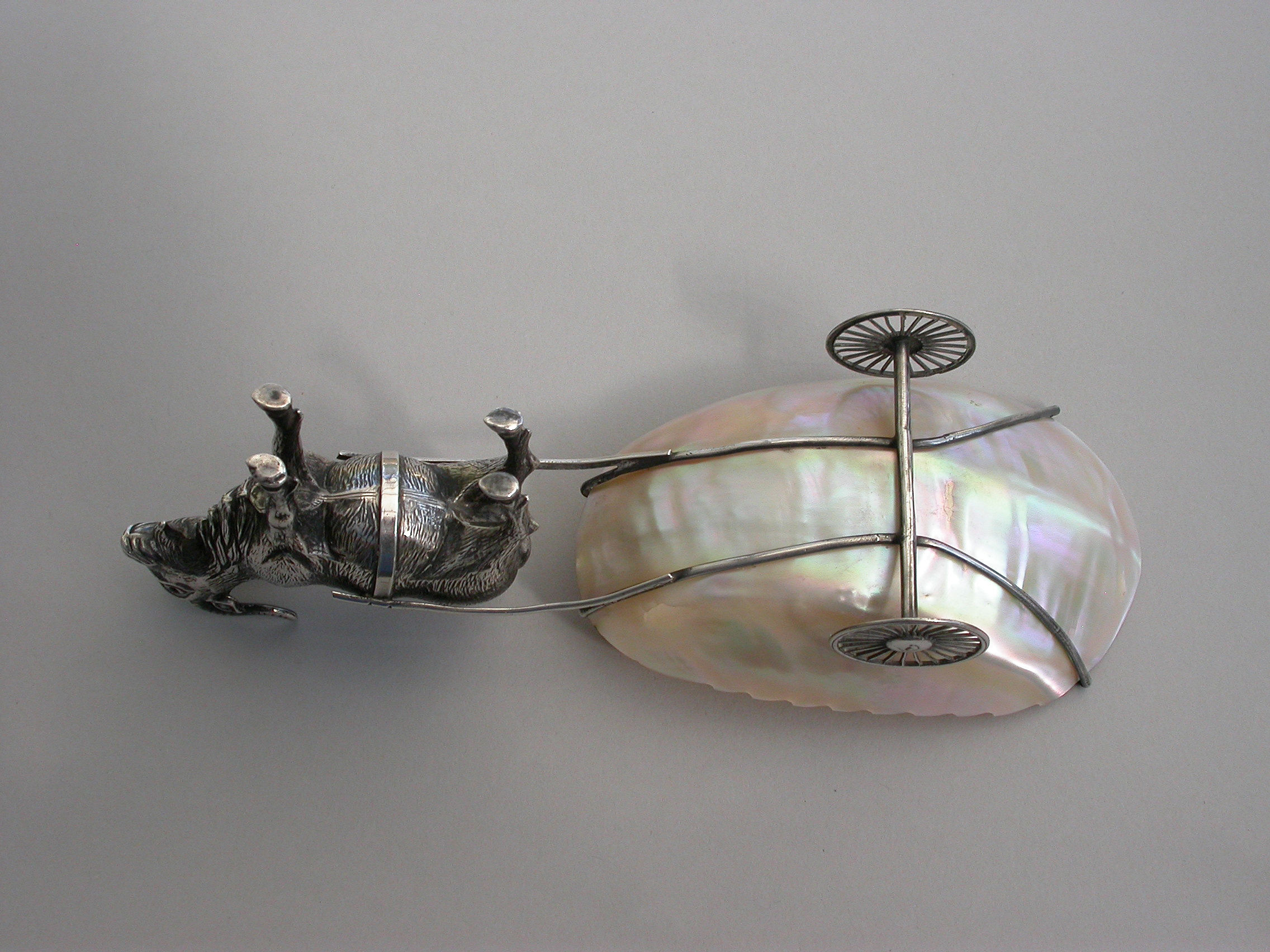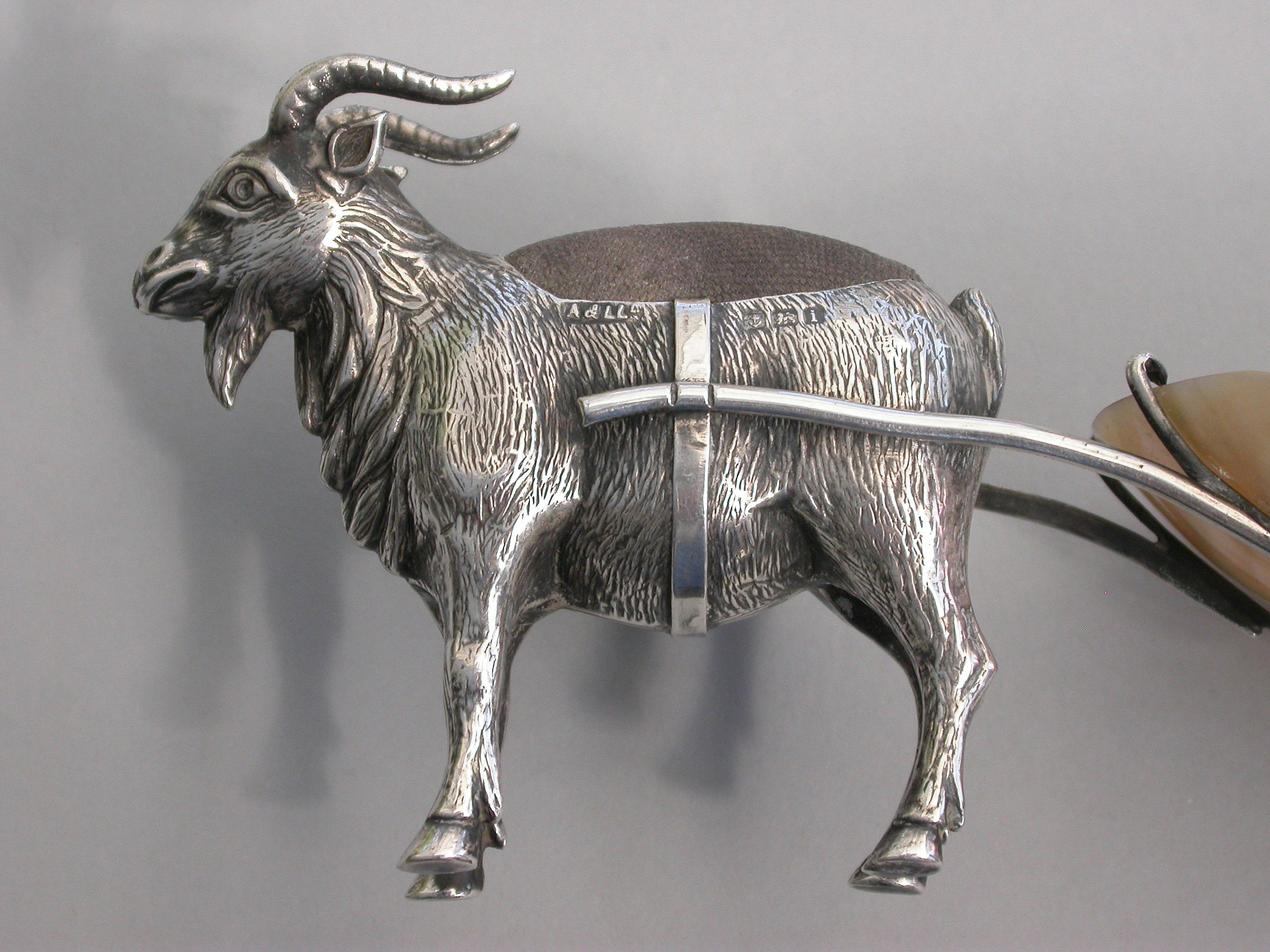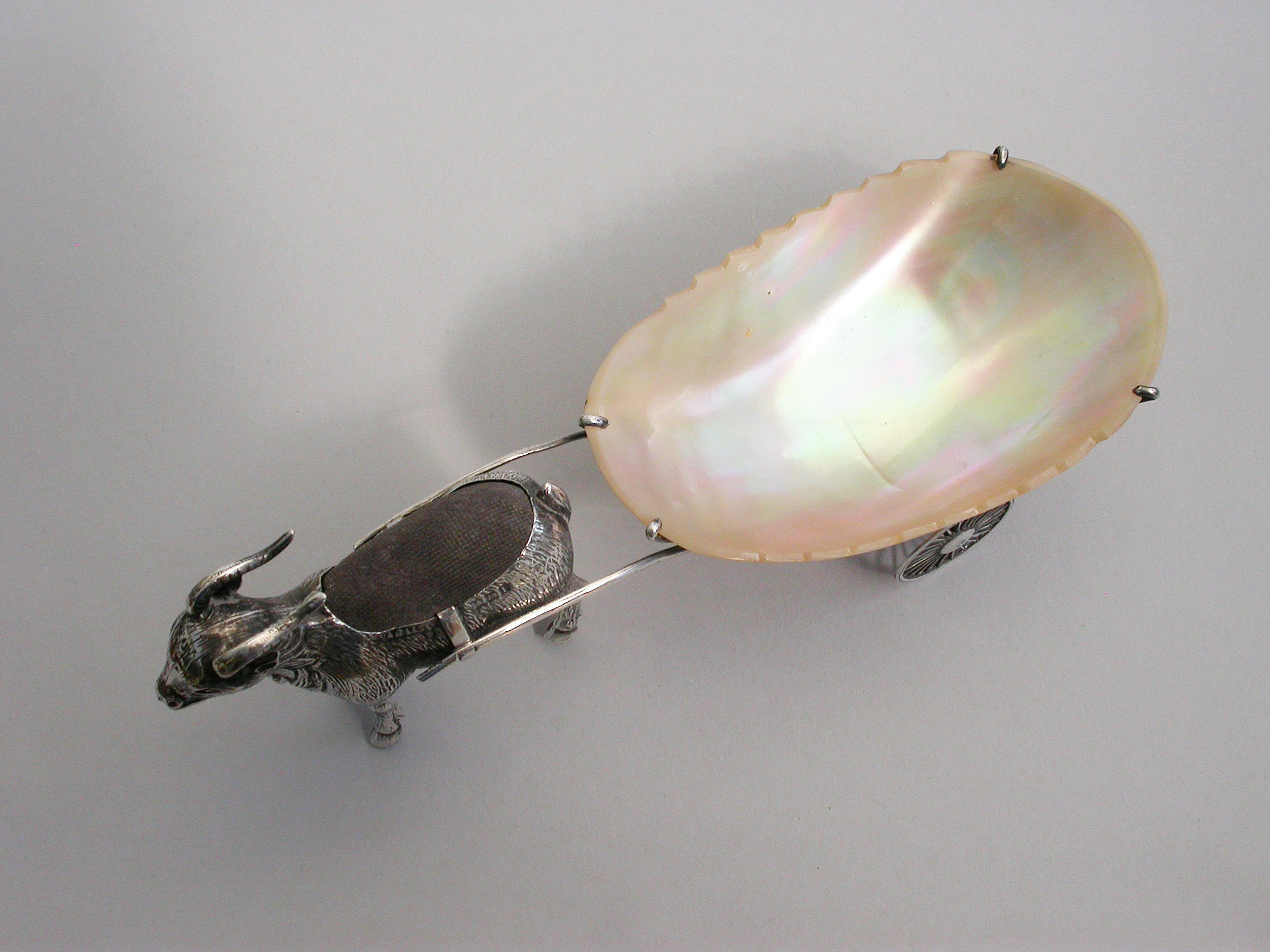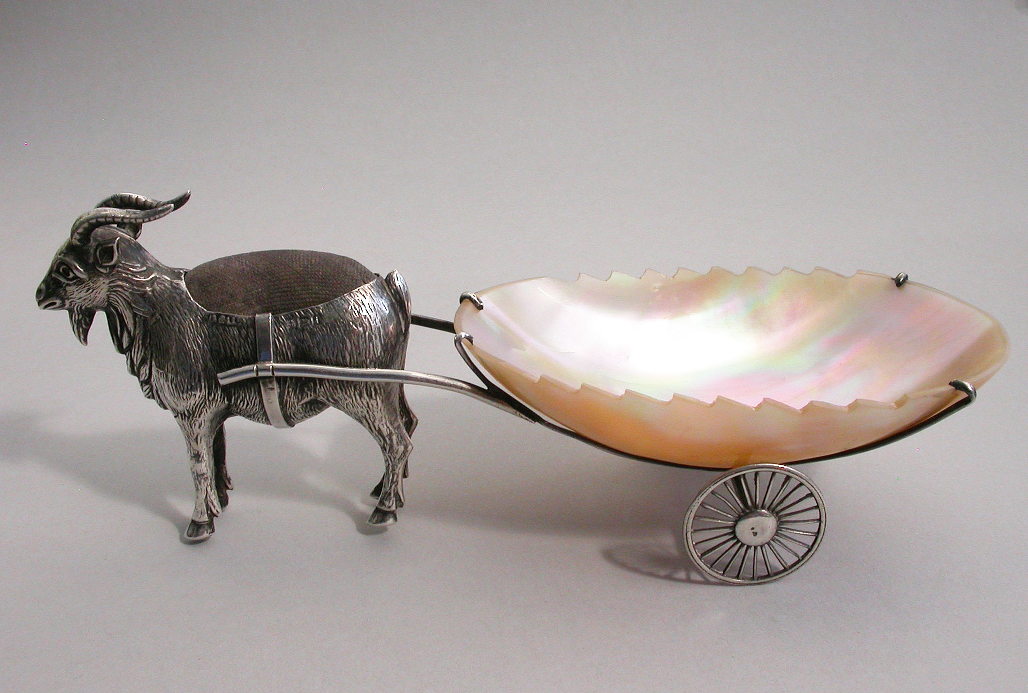 An extremely rare Edwardian novelty silver Pin Cushion, modeled as a Goat pulling a shaped Mother of Pearl cart on two wheels. The Goat realistically modeled with fine detail and complete with original velvet cushion.