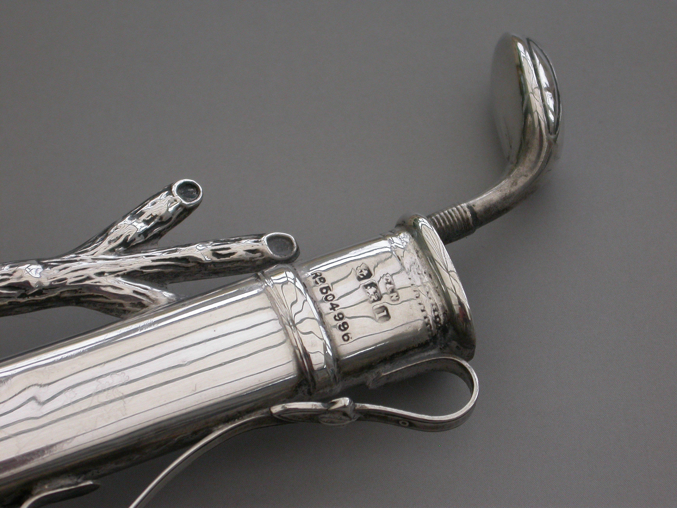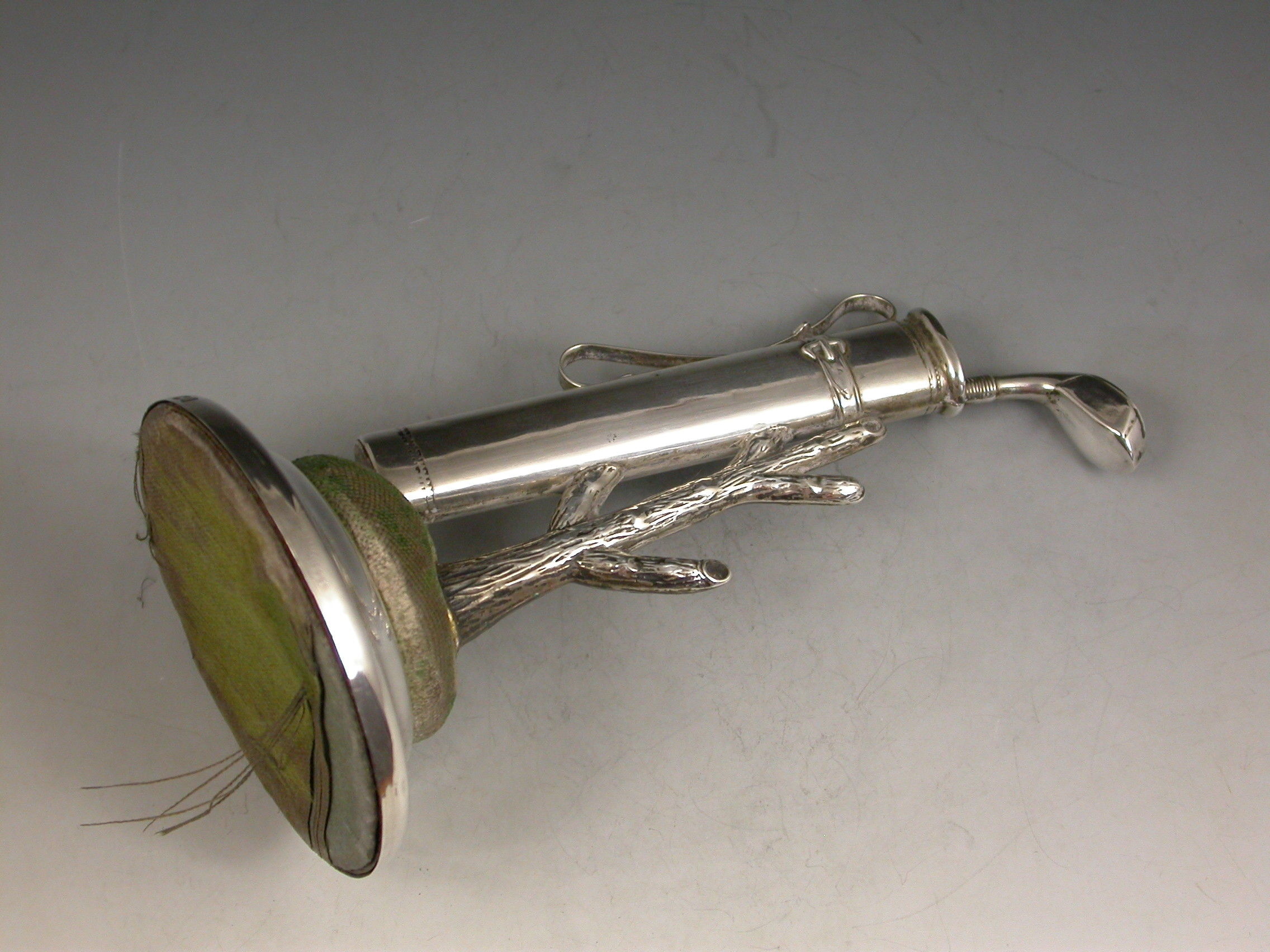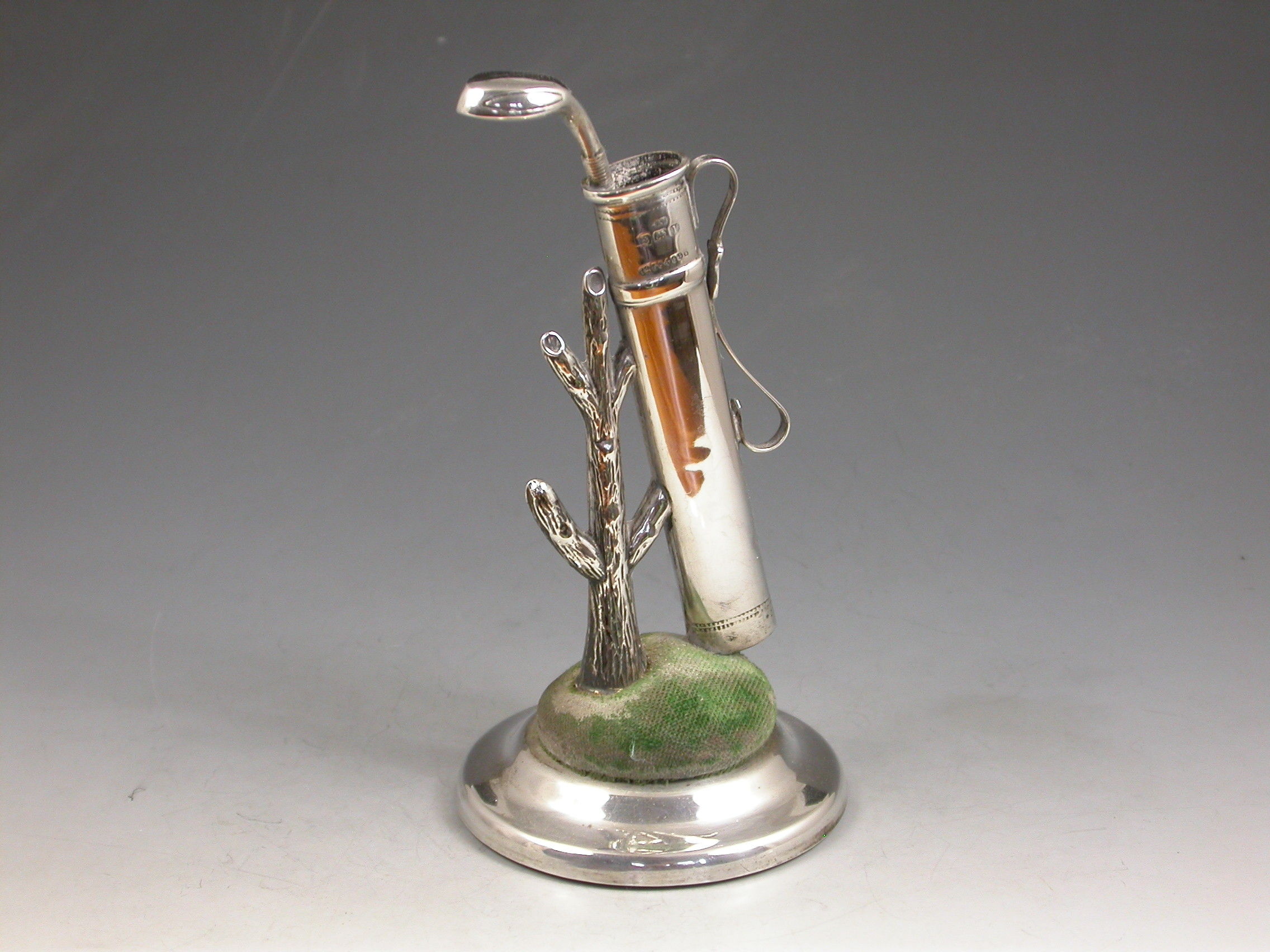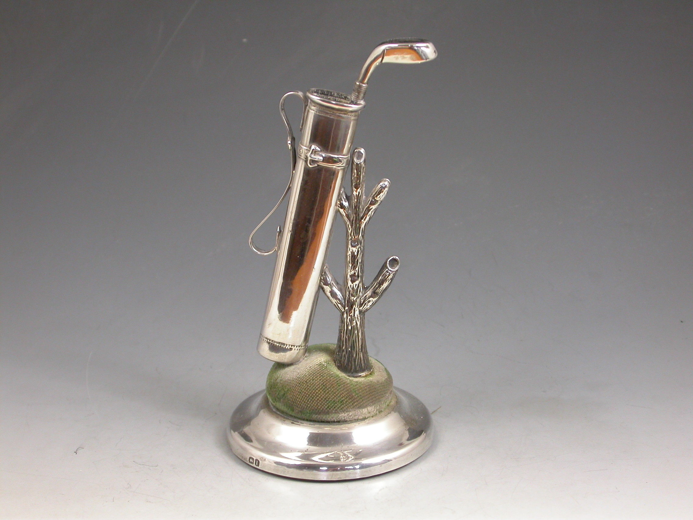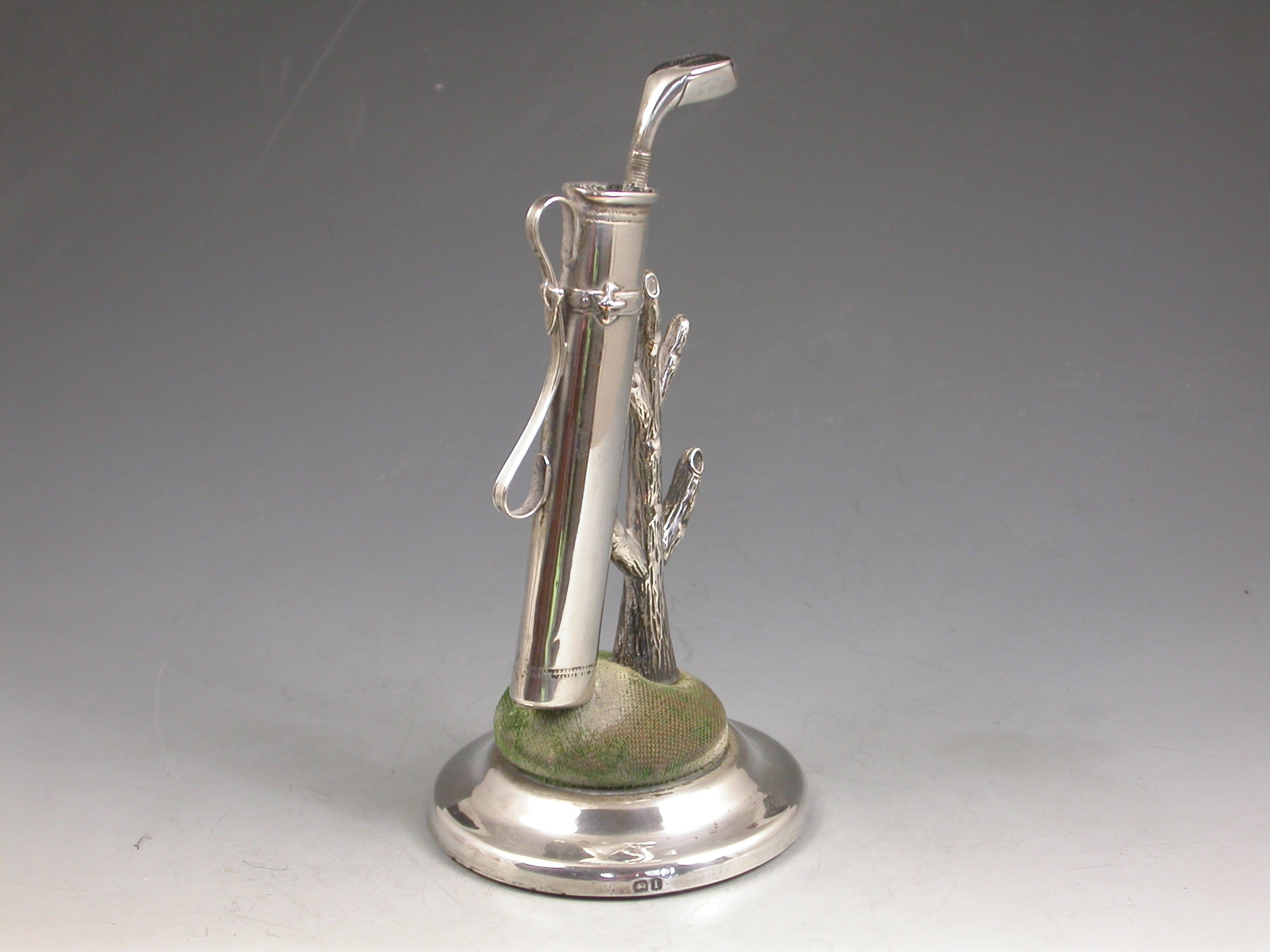 A good Edwardian novelty silver combined Hat Pin Cushion and Ring Tree modeled as a golf bag containing a single golf club leaning against a tree stump. Complete with original green velvet cushion on circular silver pedestal base.