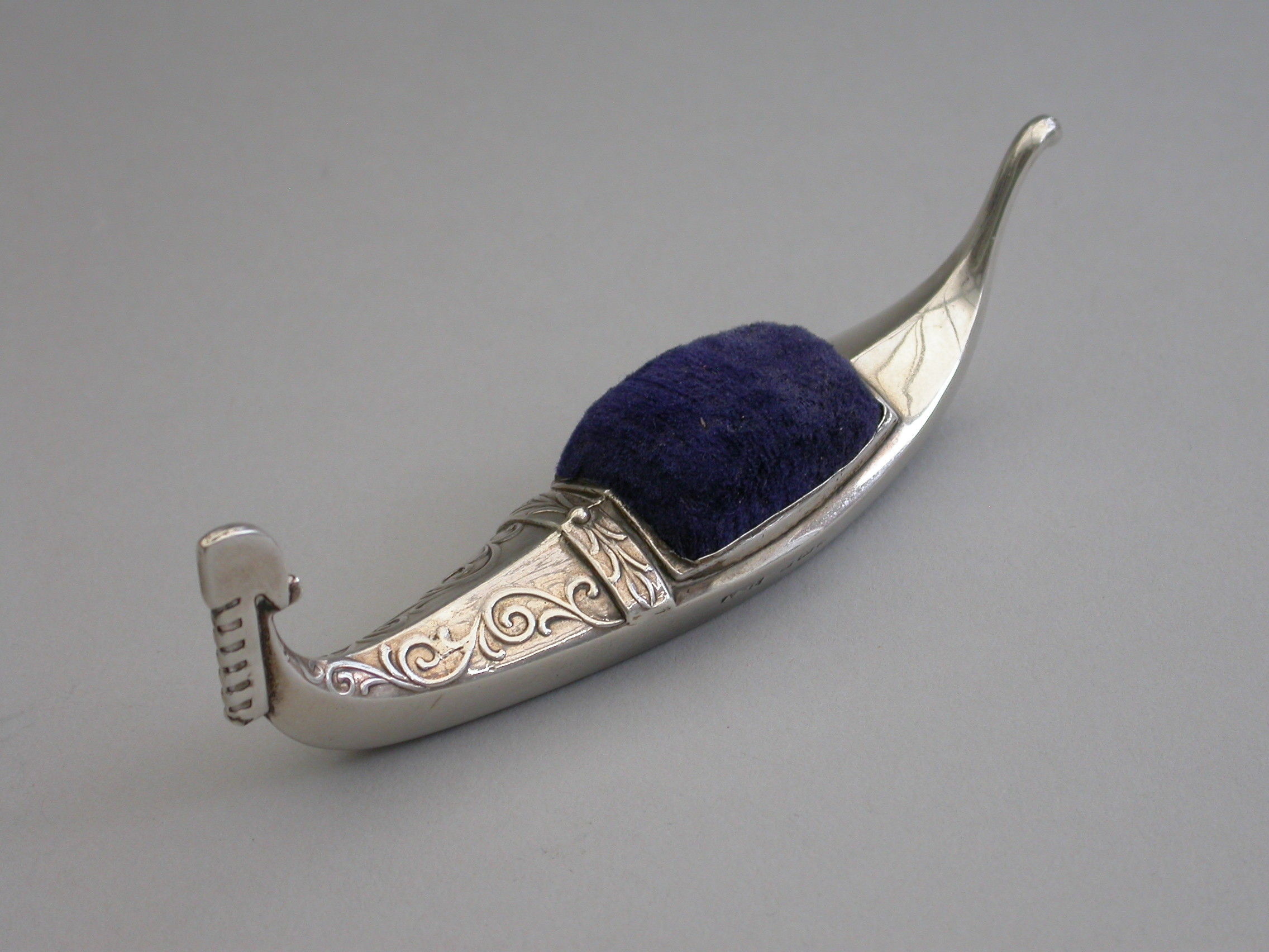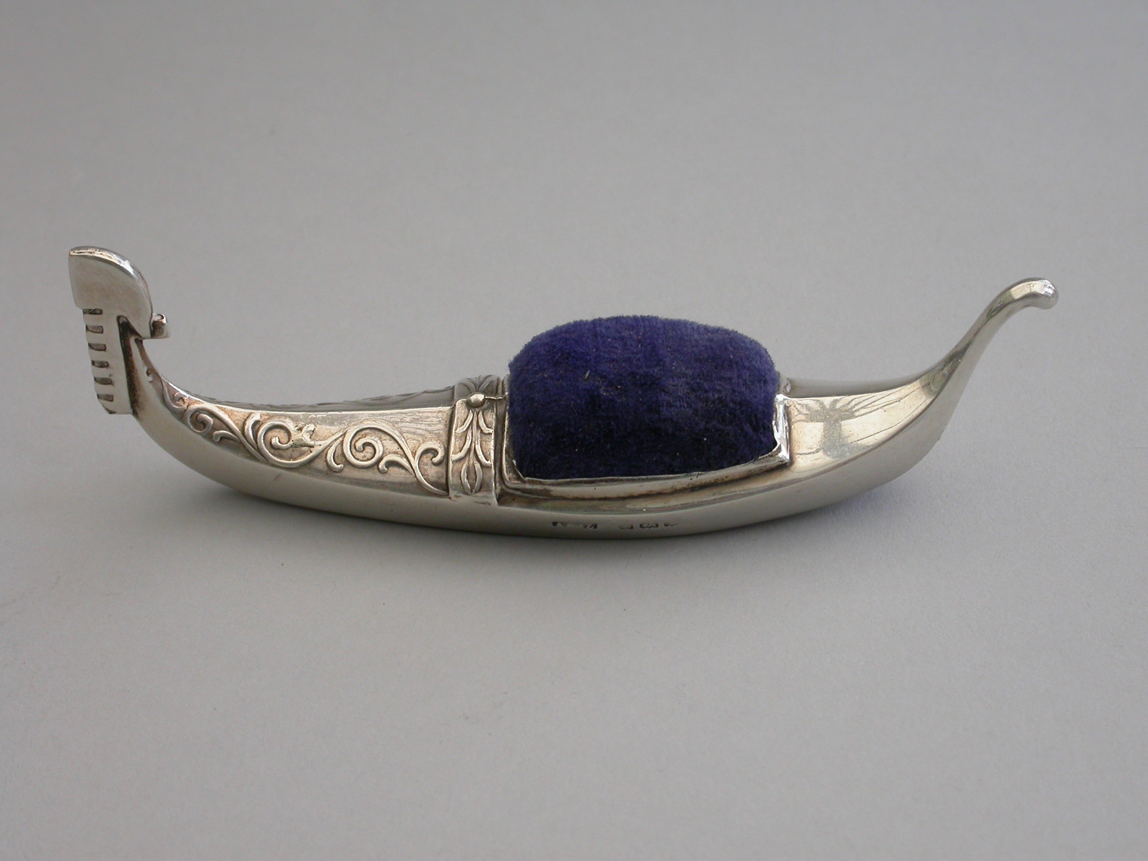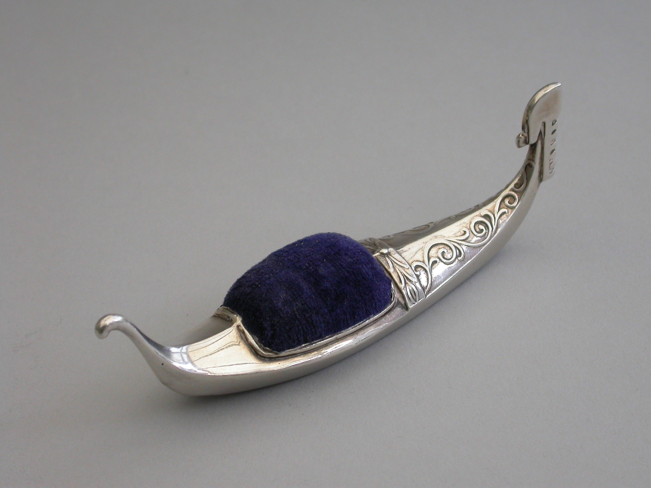 An Edwardian novelty silver Pin Cushion made in the form of a Gondola with scrolled decoration to the front of the boat and blue velvet cushion.