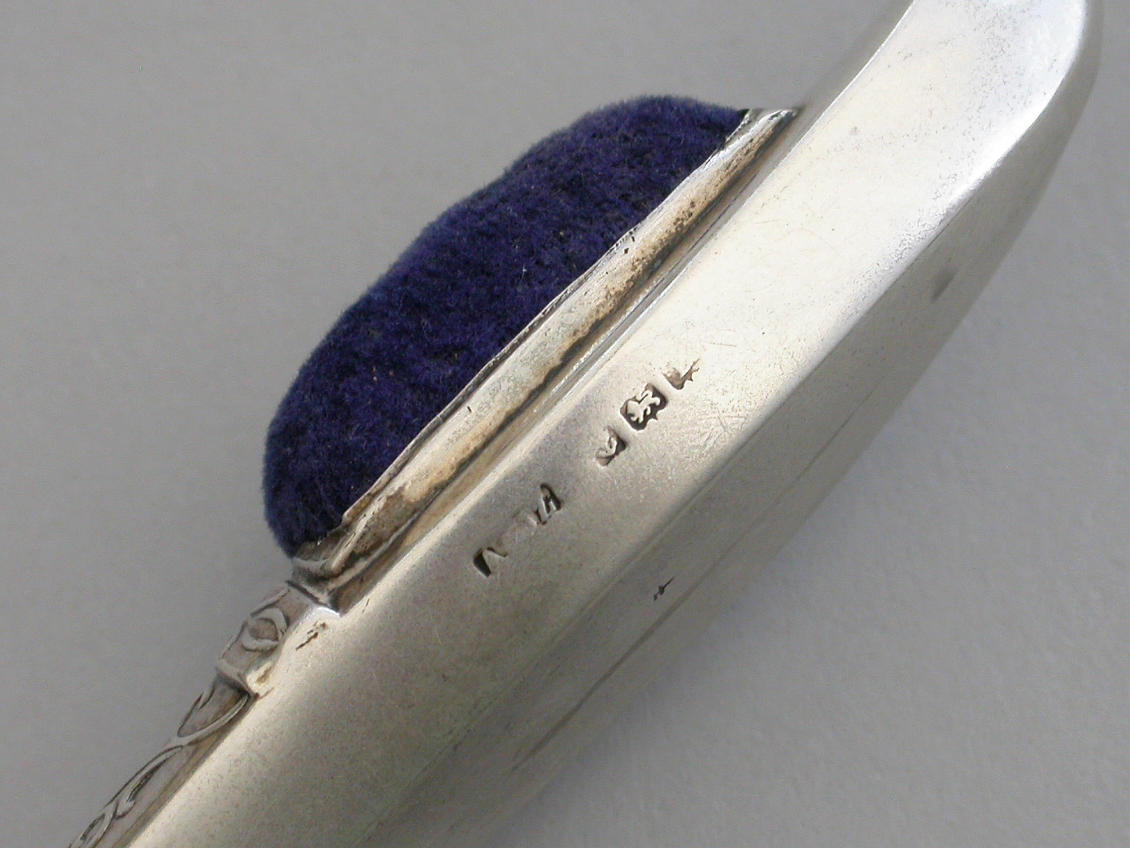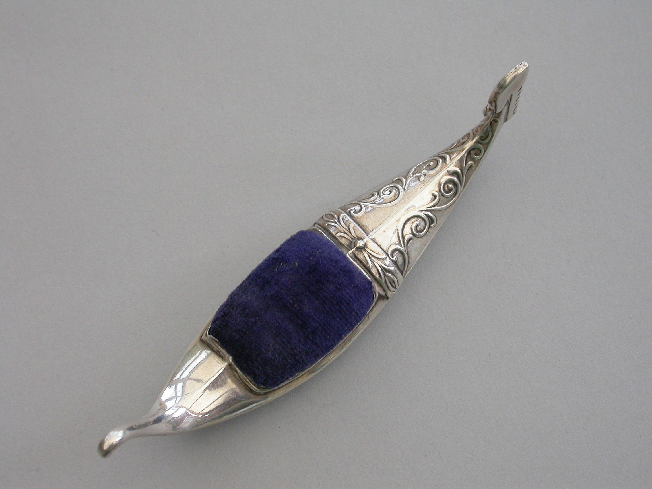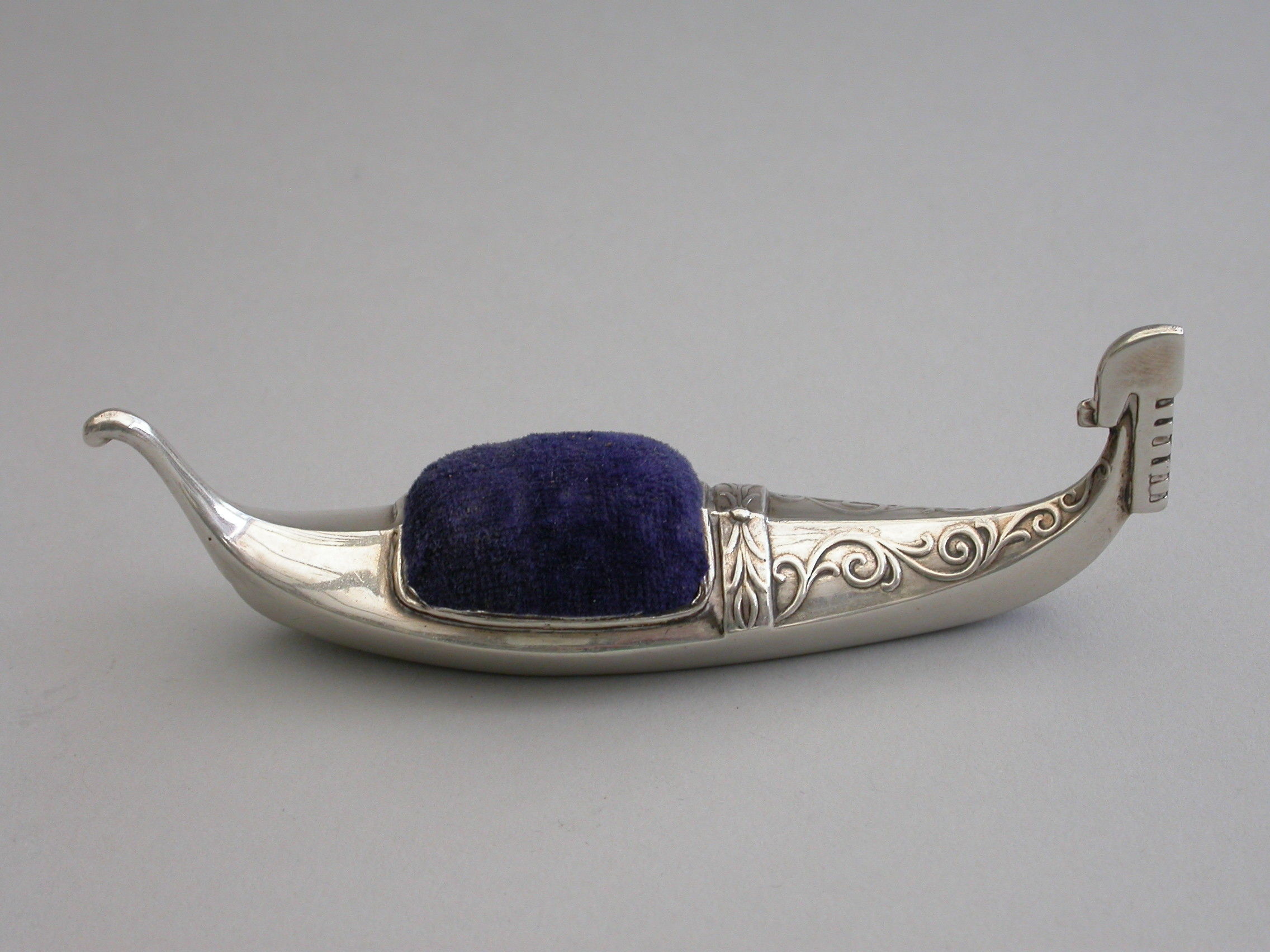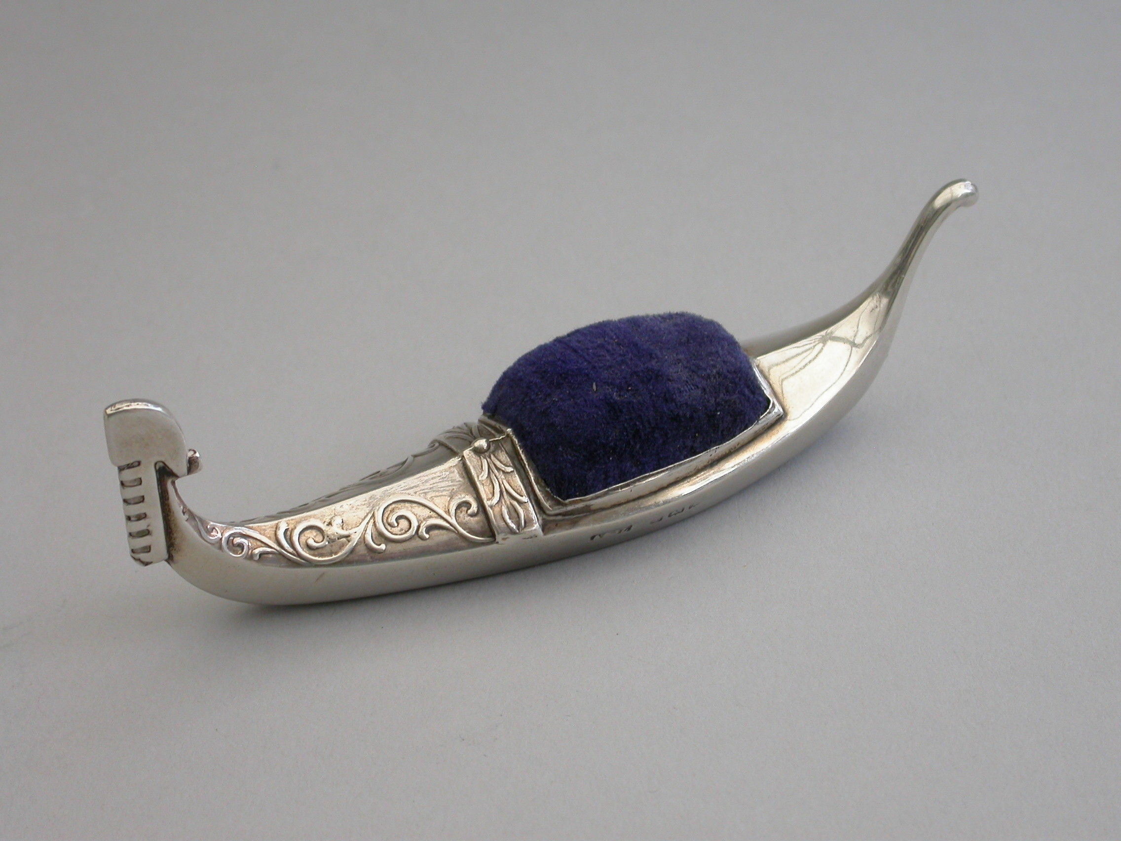 An Edwardian novelty silver Pin Cushion made in the form of a Gondola with scrolled decoration to the front of the boat and blue velvet cushion.
