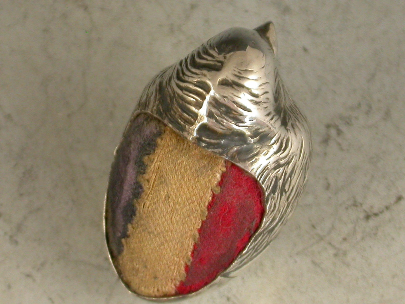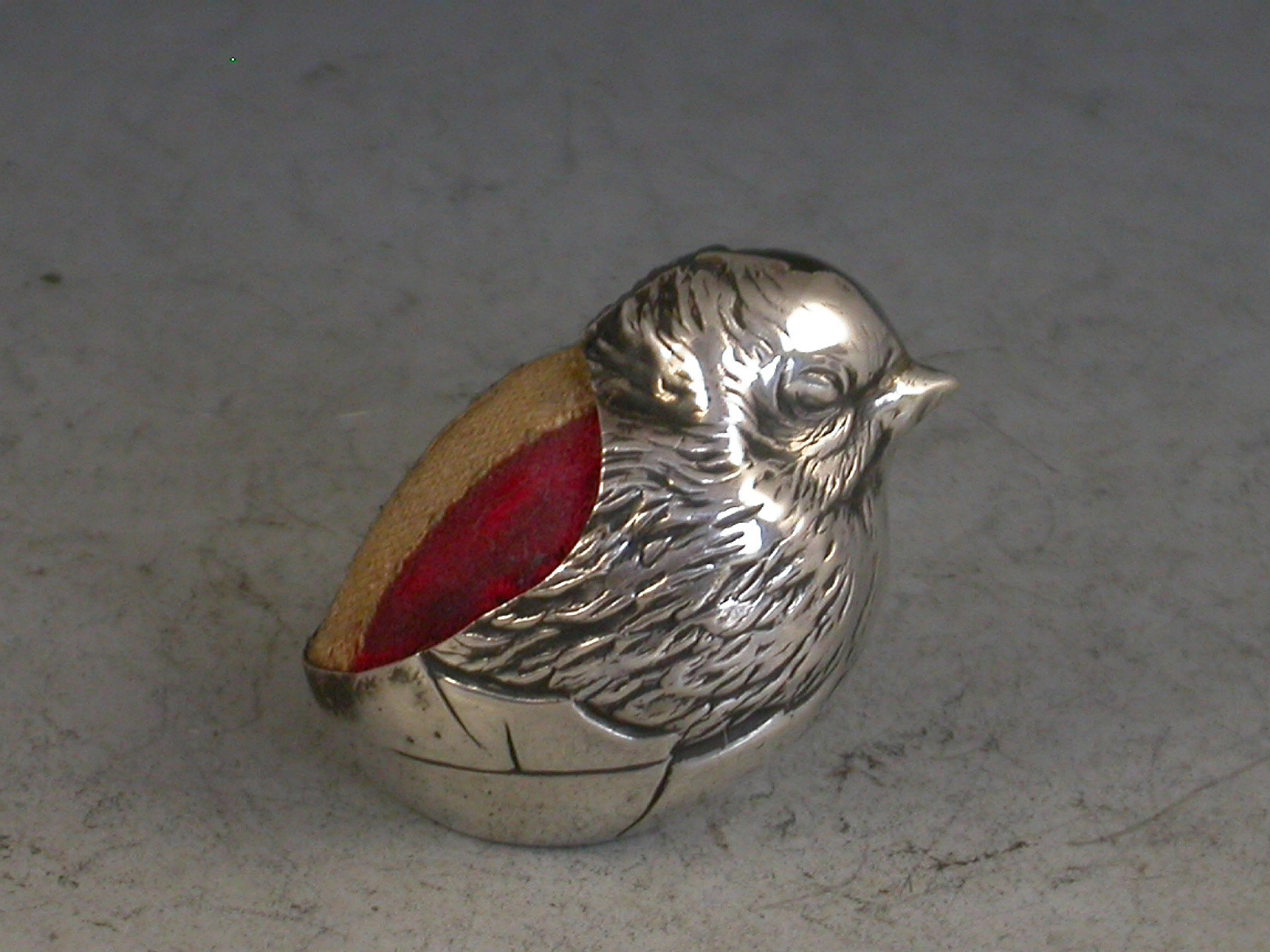 An Edwardian novelty silver Pin Cushion of small size made in the form of a hatching chick, complete with original velvet red, white and blue cushion.