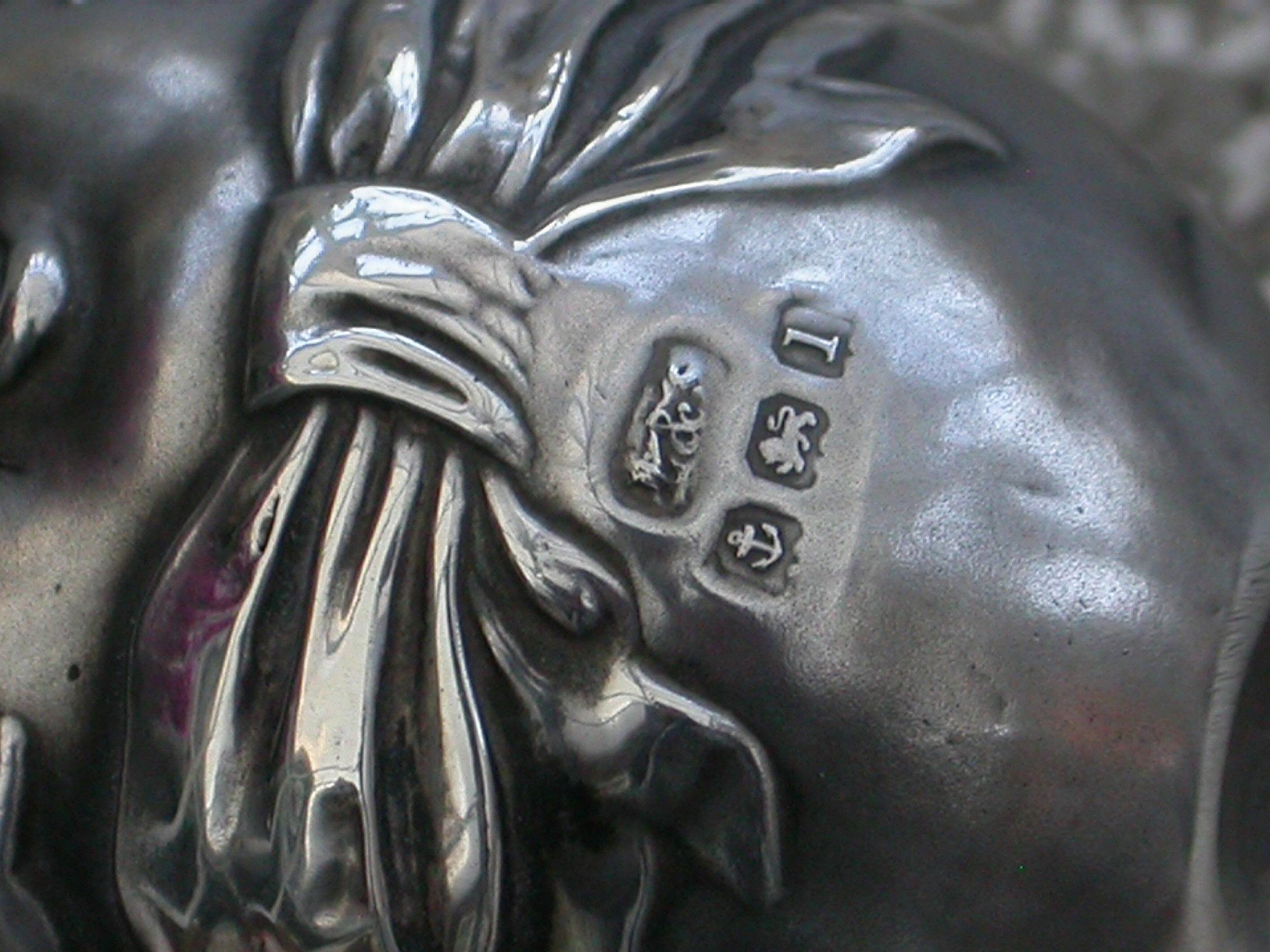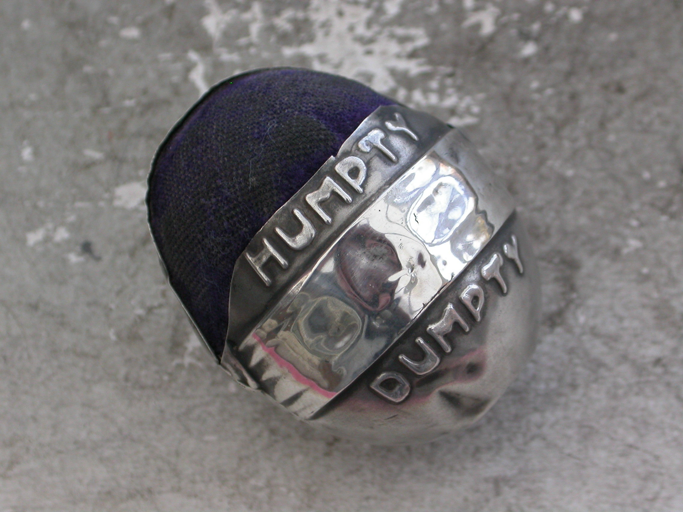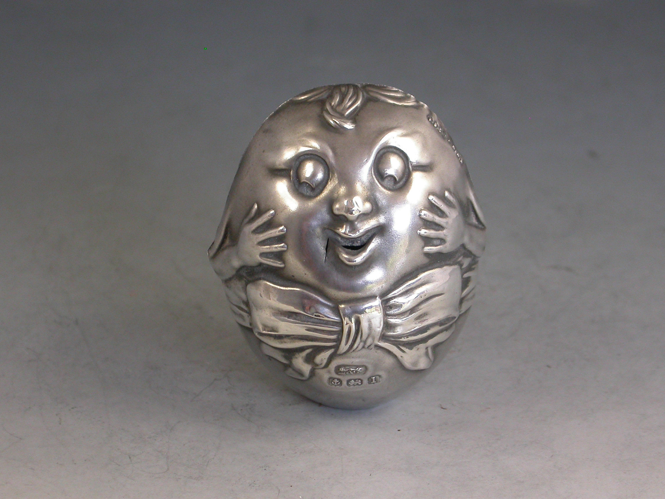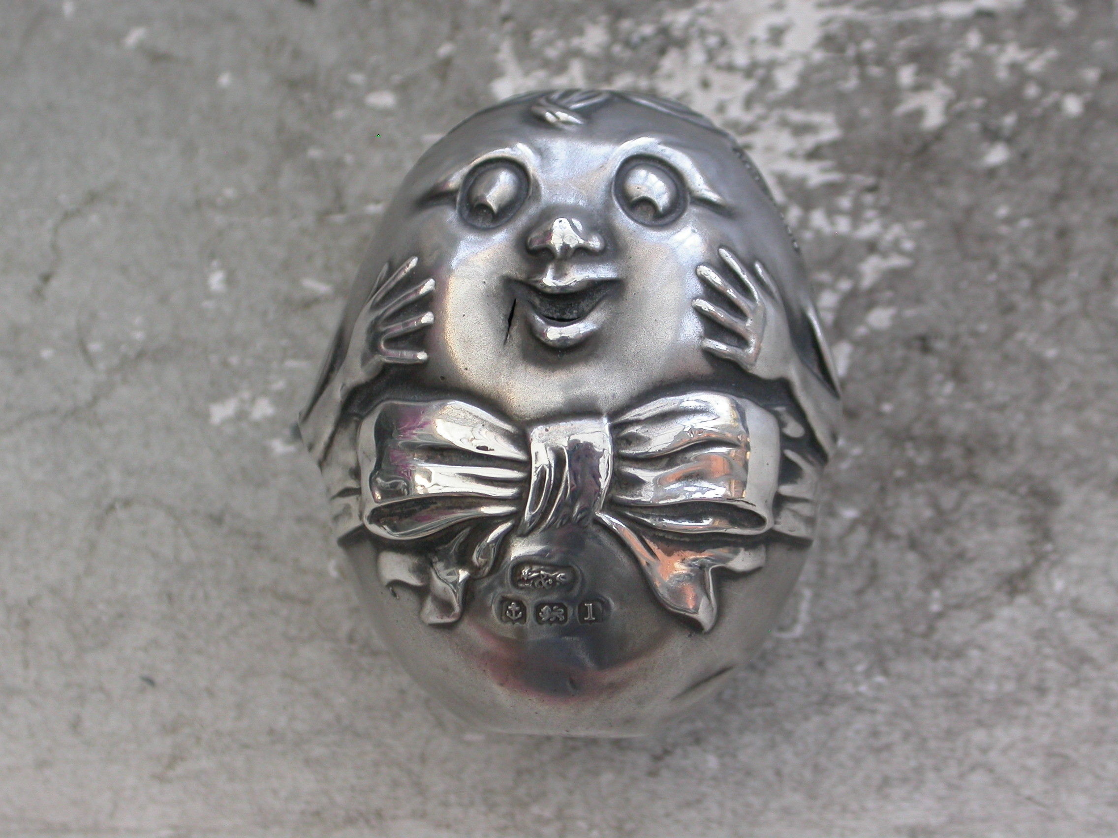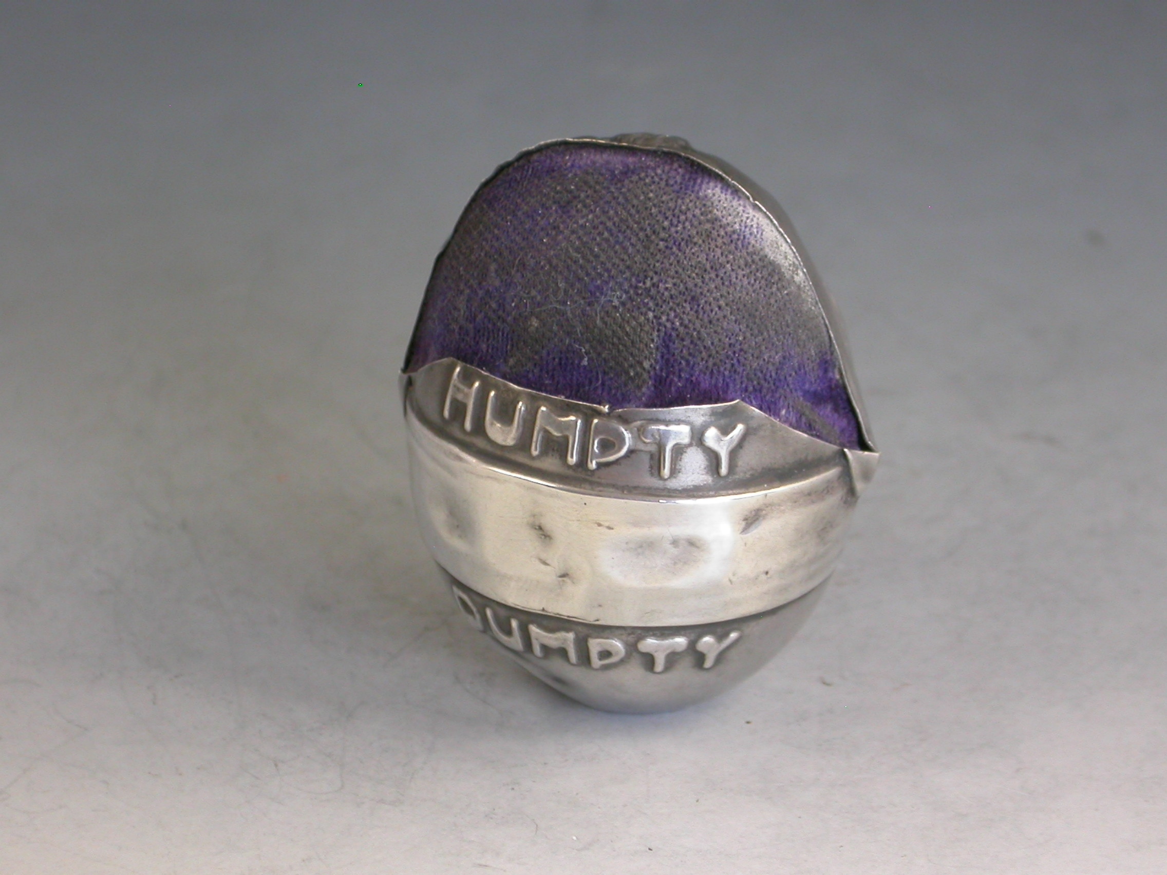An extremely rare Edwardian novelty silver Pin Cushion modeled as Humpty Dumpty, with smiling face and bow tie. Stamped name to reverse. Complete with original cushion. He is weighted so as not to topple over.