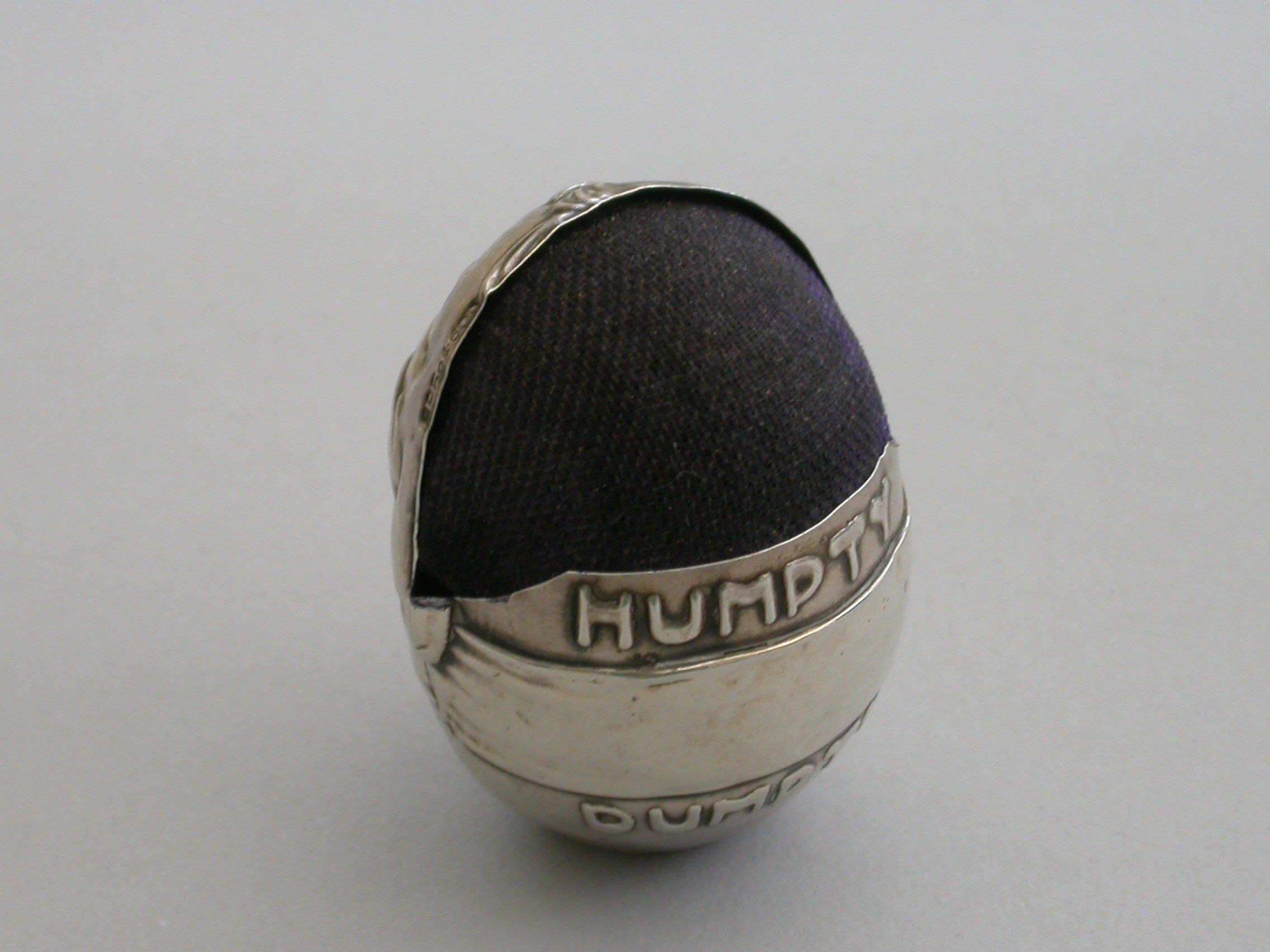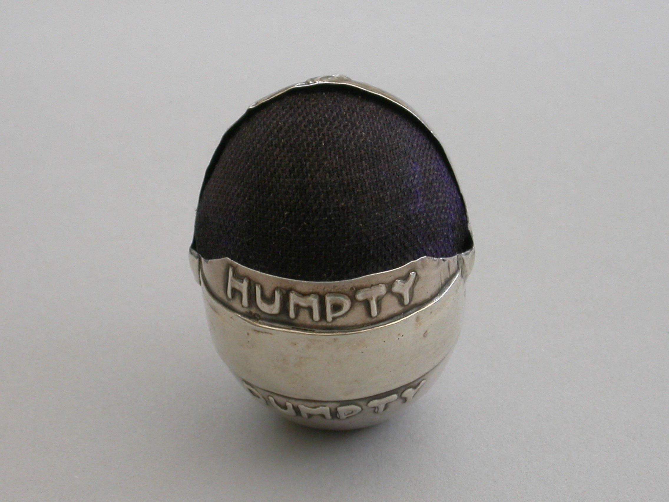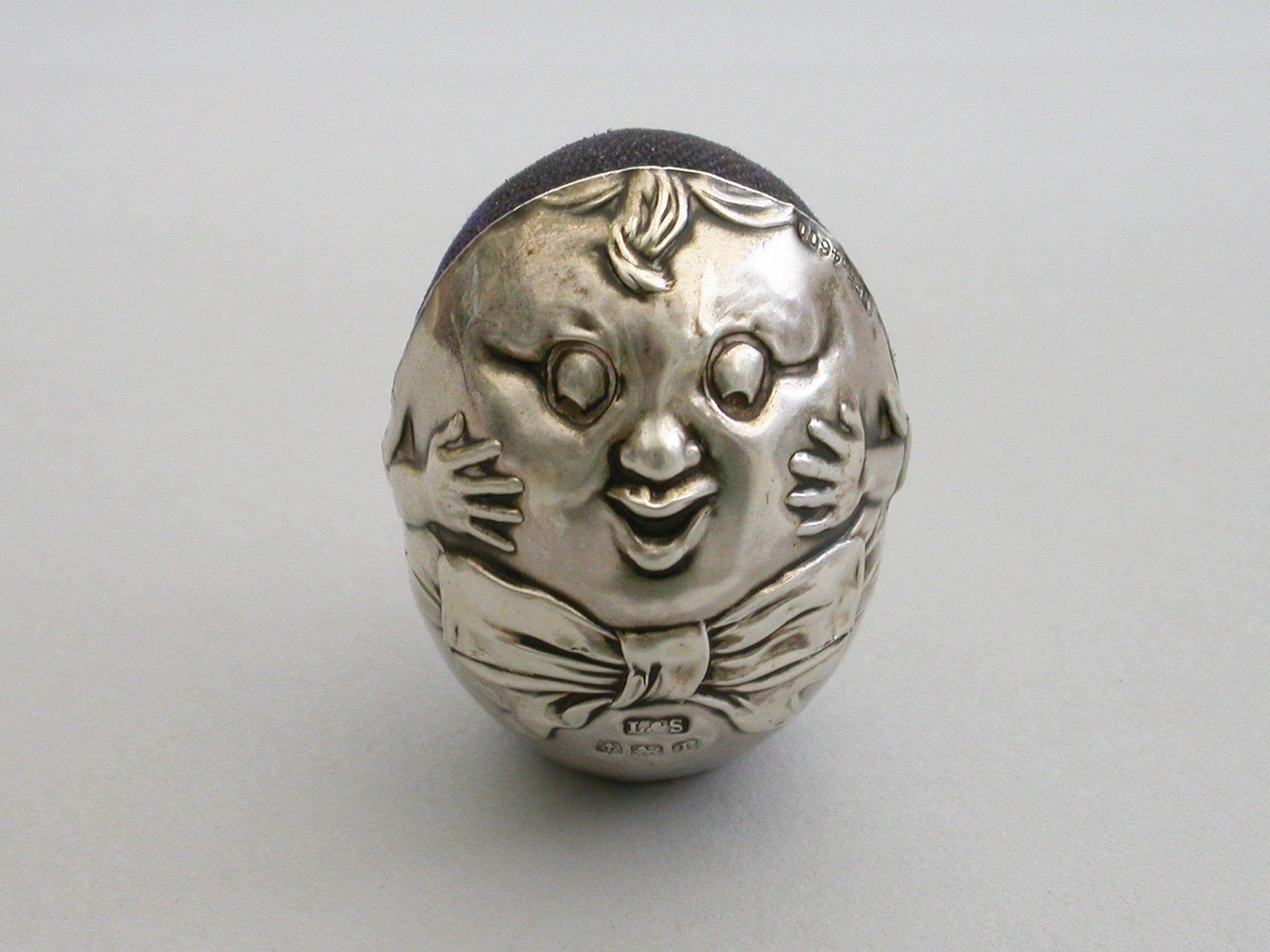 An extremely rare Edwardian novelty silver Pin Cushion modelled as Humpty Dumpty, with smiling face and bow tie. Stamped name to reverse. Complete with original cushion. He is weighted so as not to topple over.