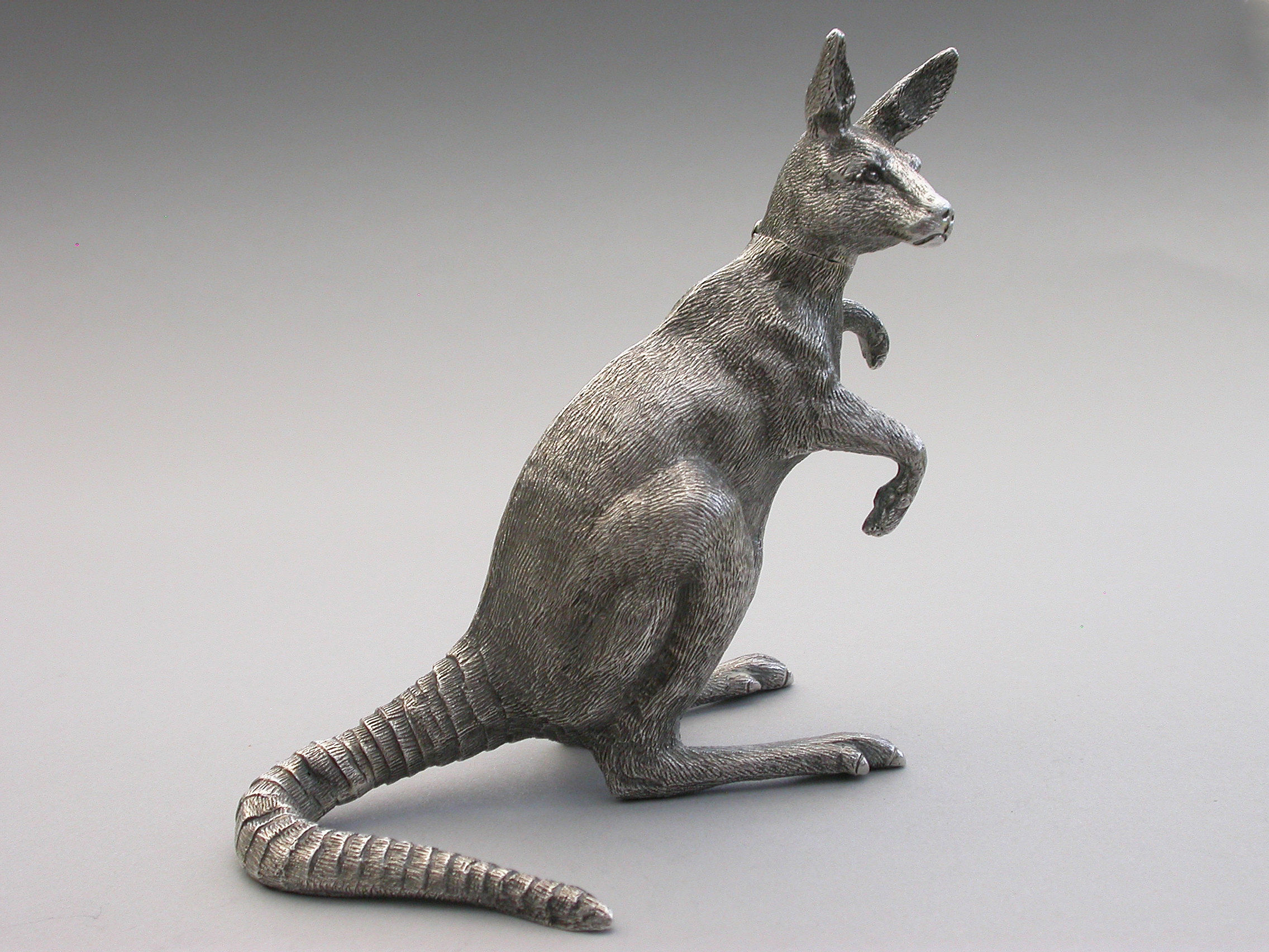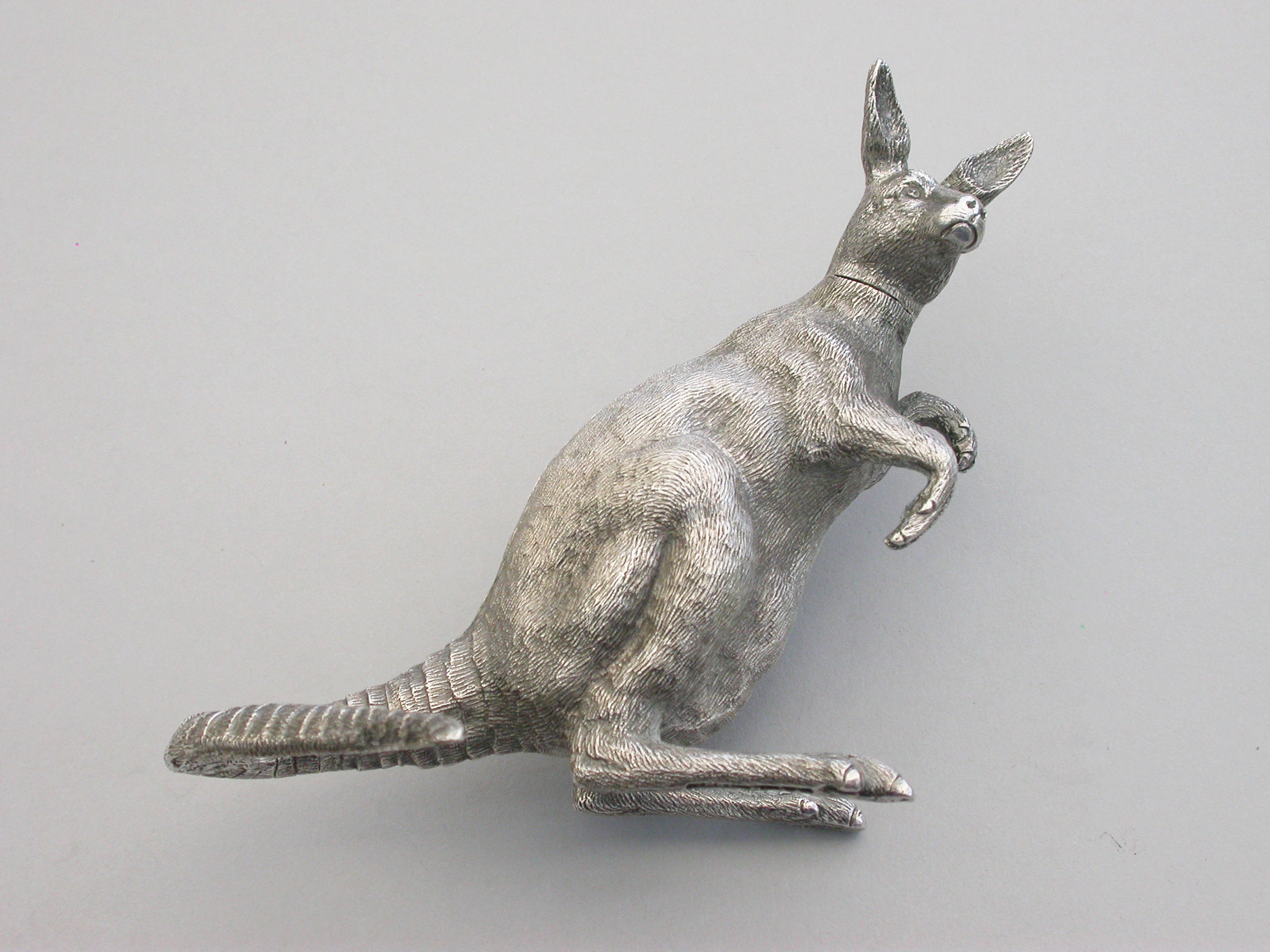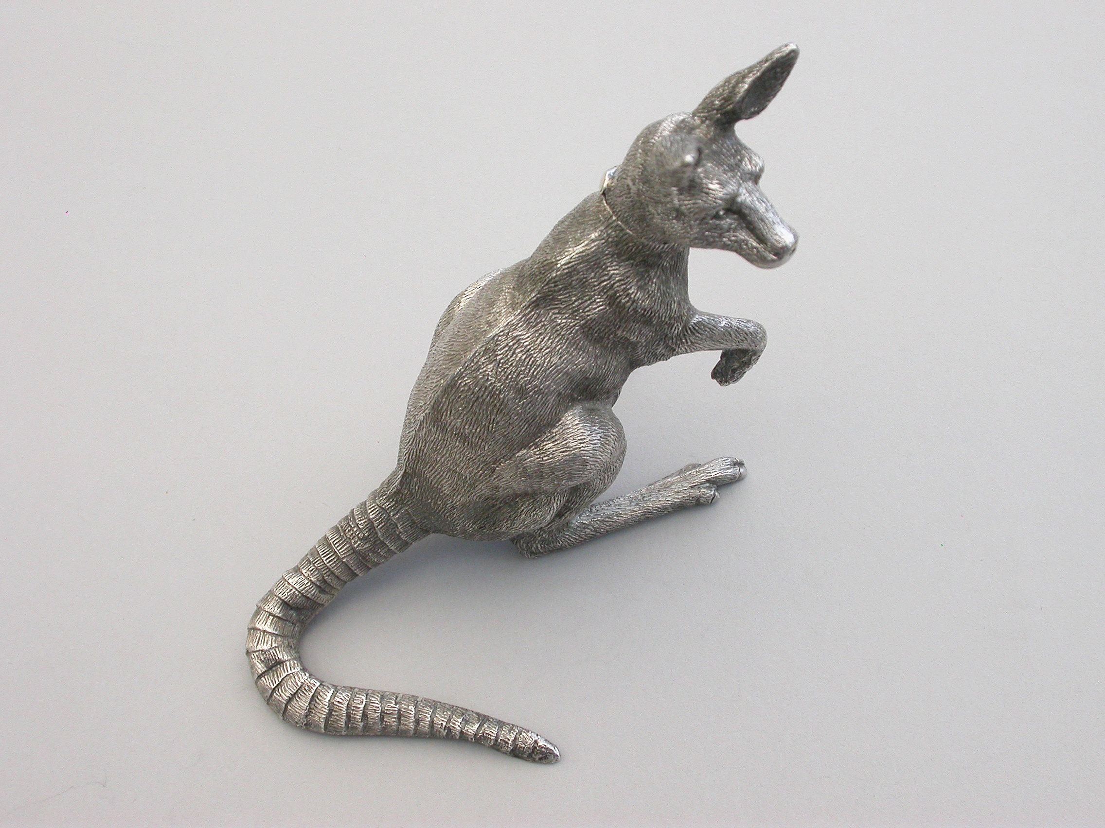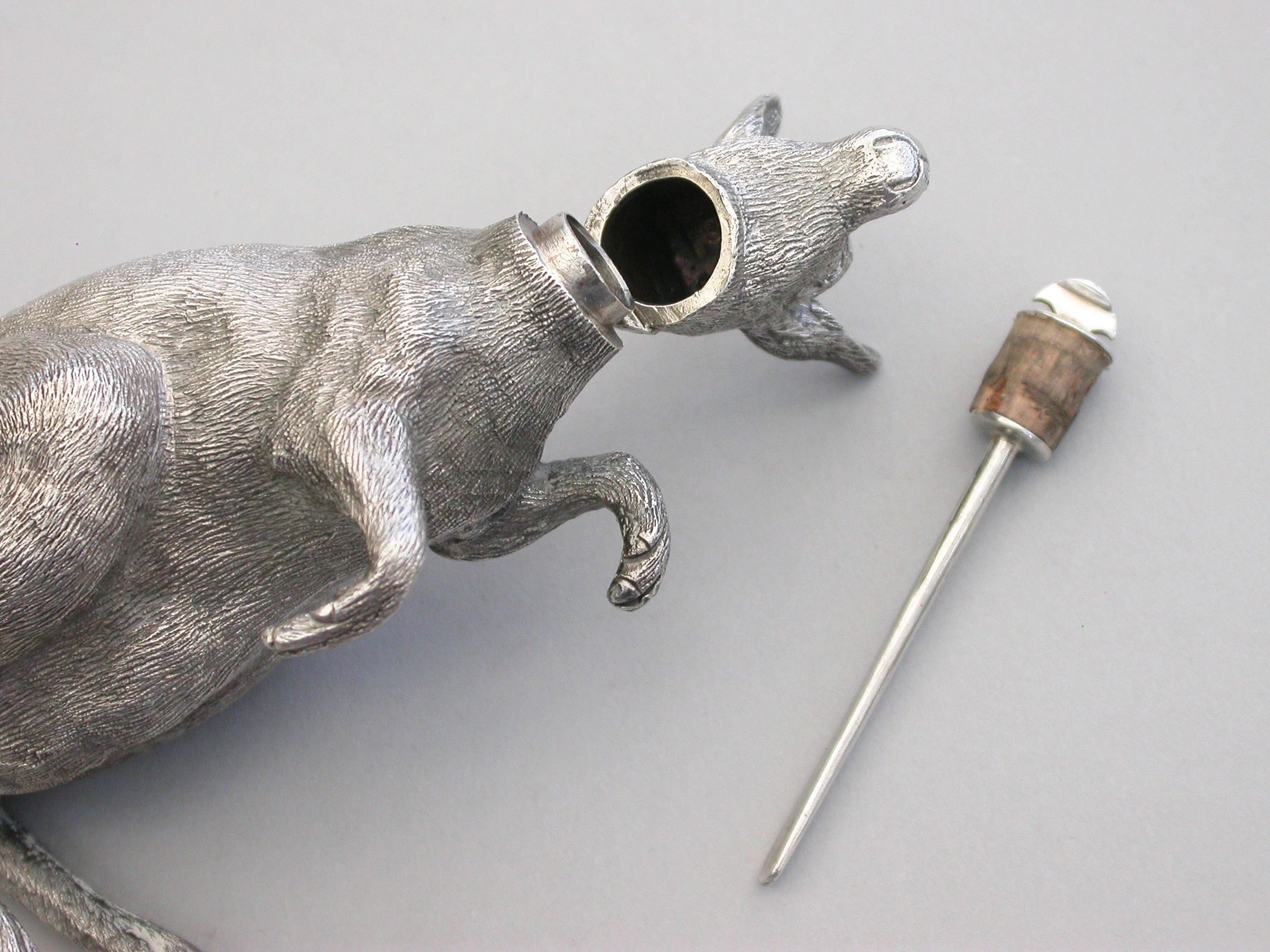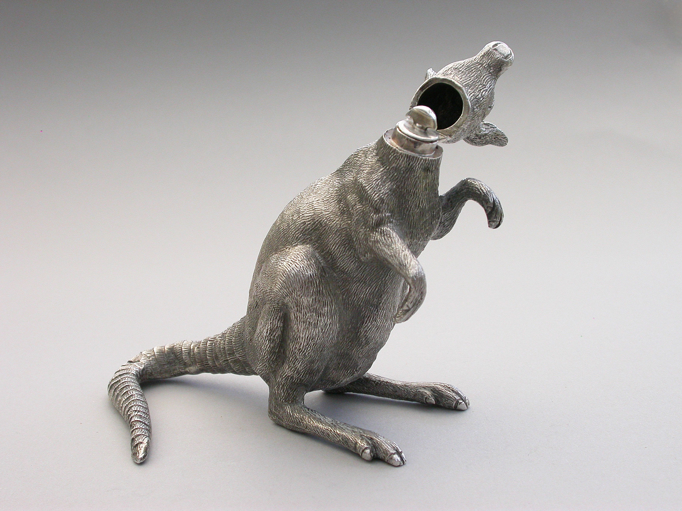 An extremely rare and unusual Edwardian English sterling silver novelty Scent Bottle made in the form of a Kangaroo in a standing position, with hinged head and silver mounted cork stopper and applicator. The body with finely detailed engraving to simulate the fur.
