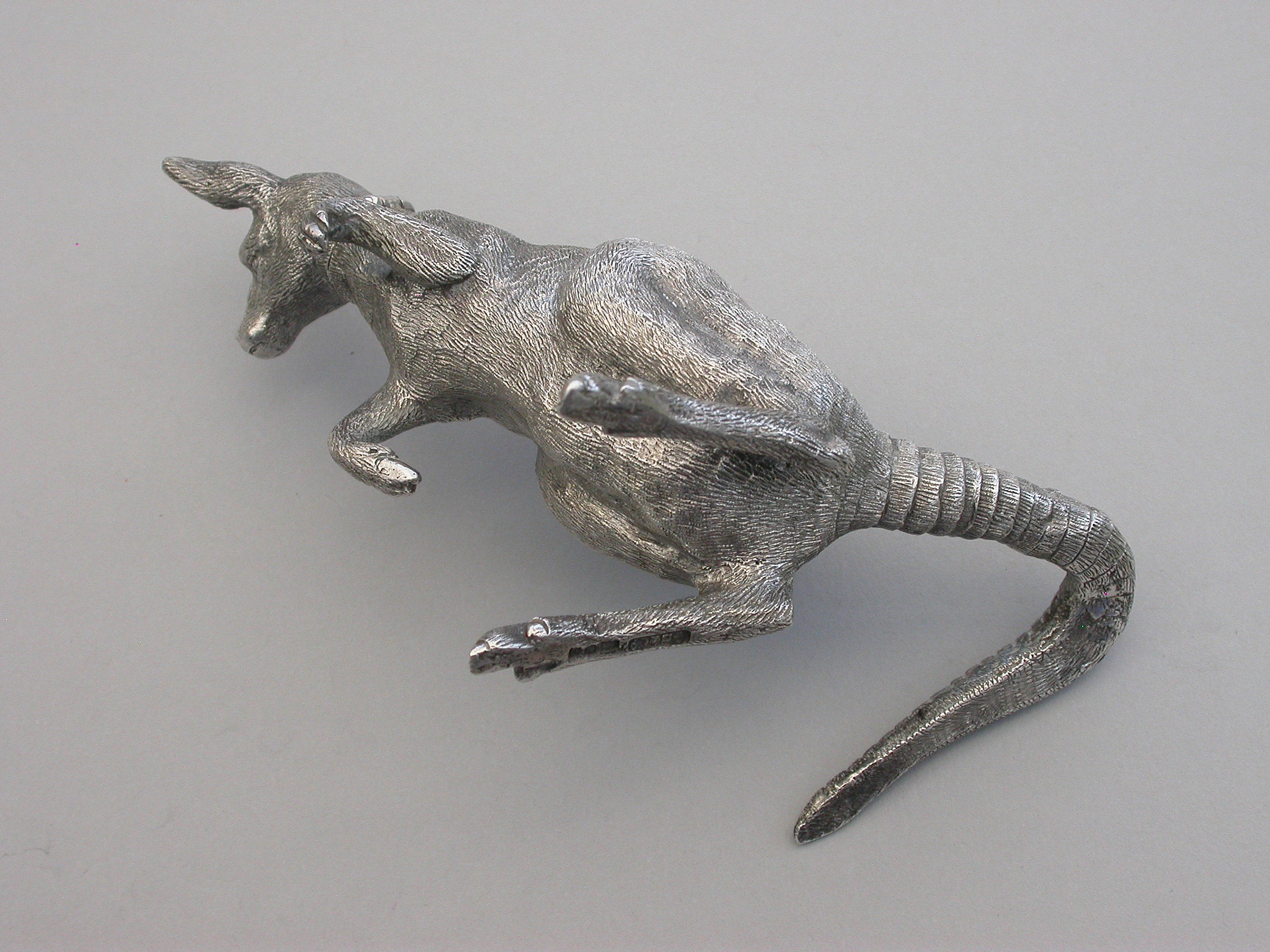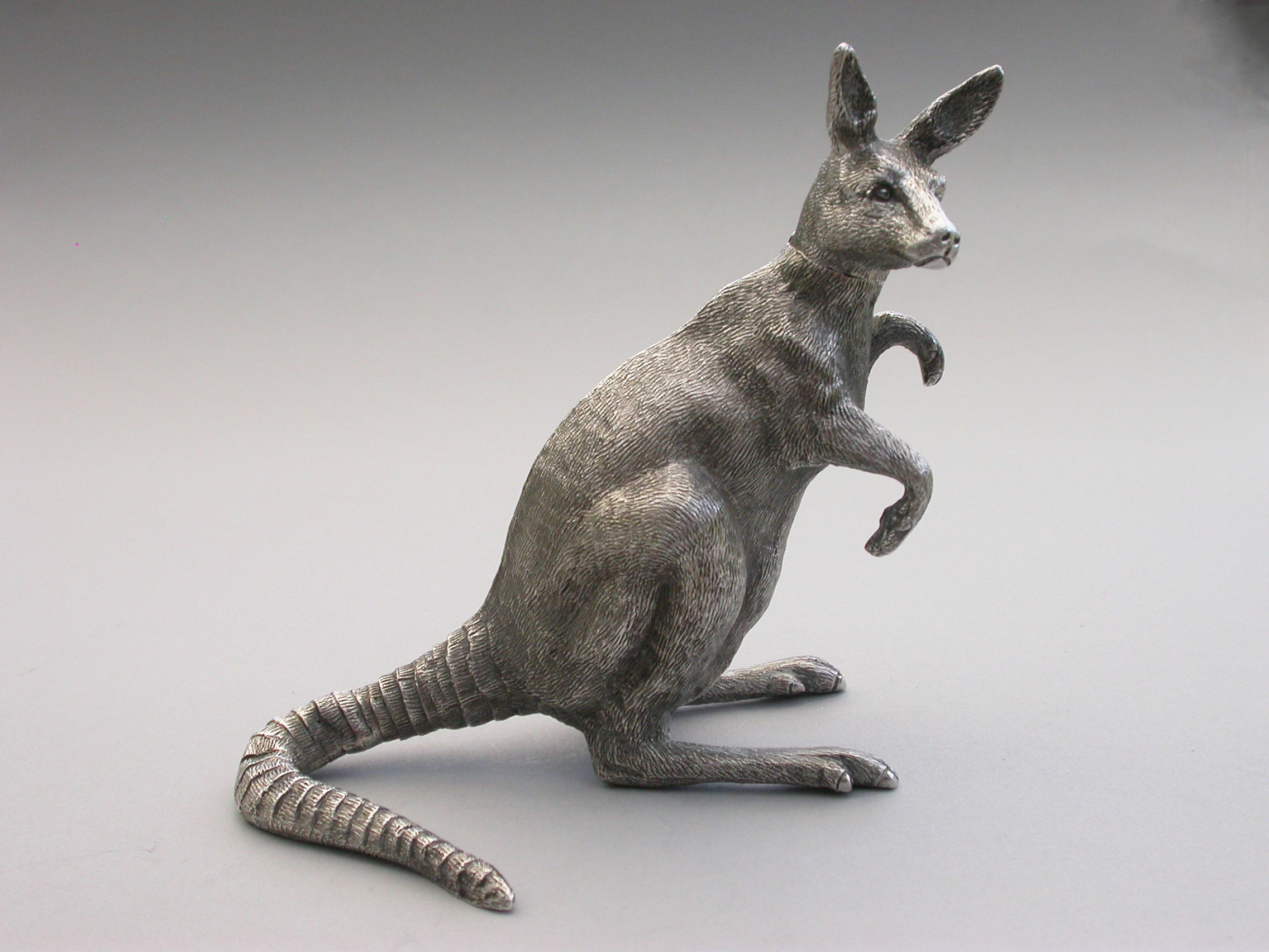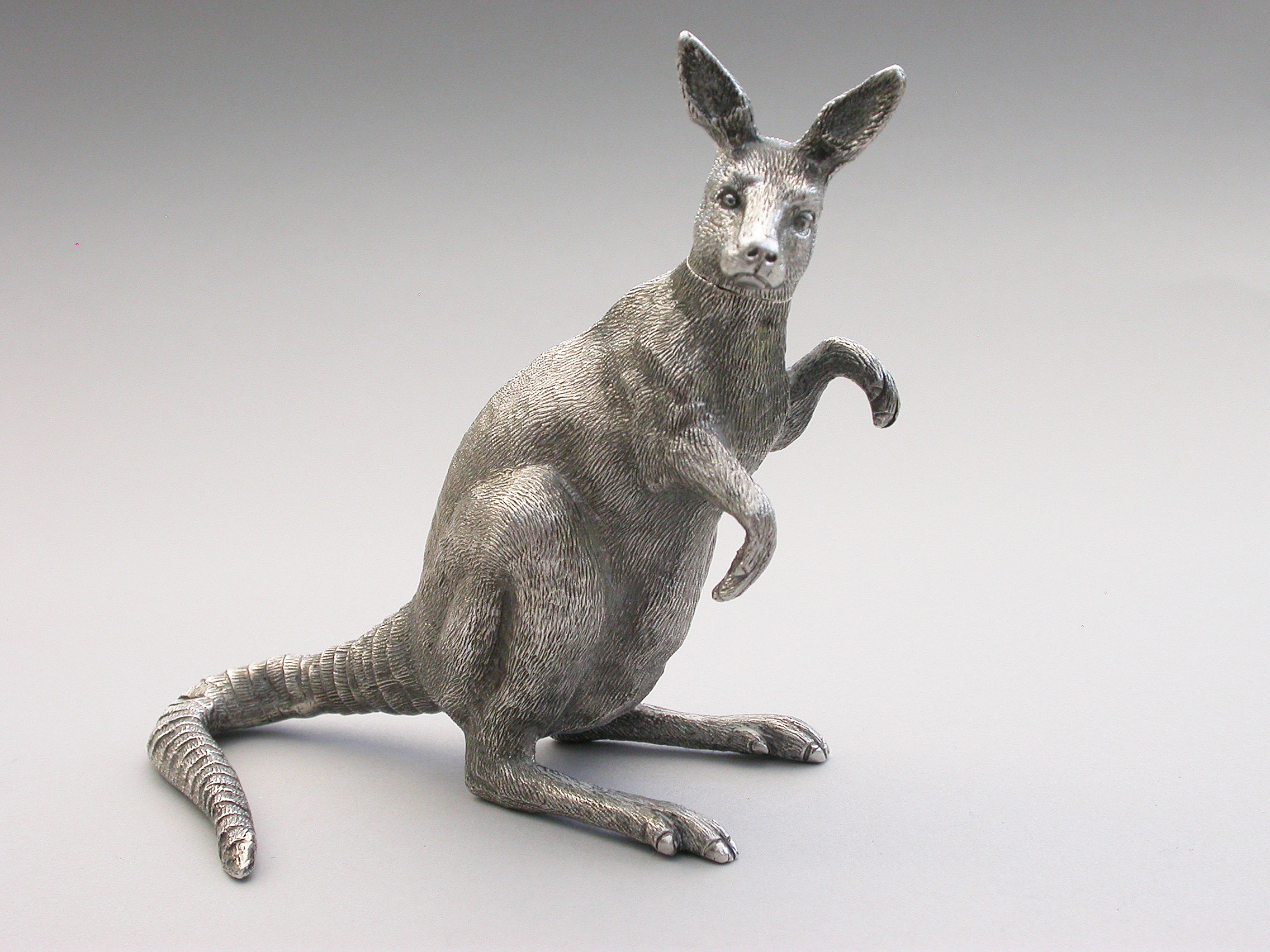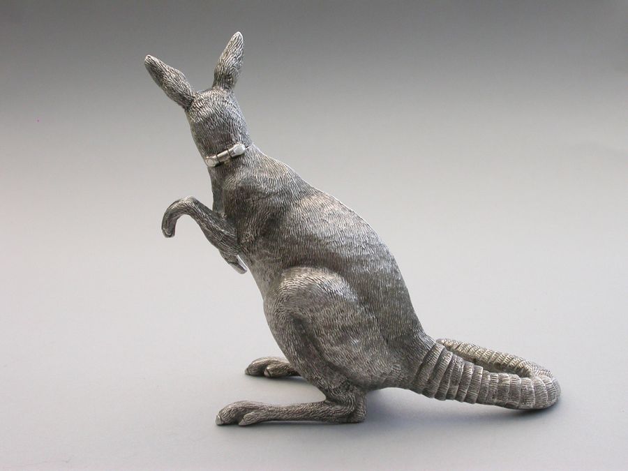 An extremely rare and unusual Edwardian English sterling silver novelty Scent Bottle made in the form of a Kangaroo in a standing position, with hinged head and silver mounted cork stopper and applicator. The body with finely detailed engraving to simulate the fur.