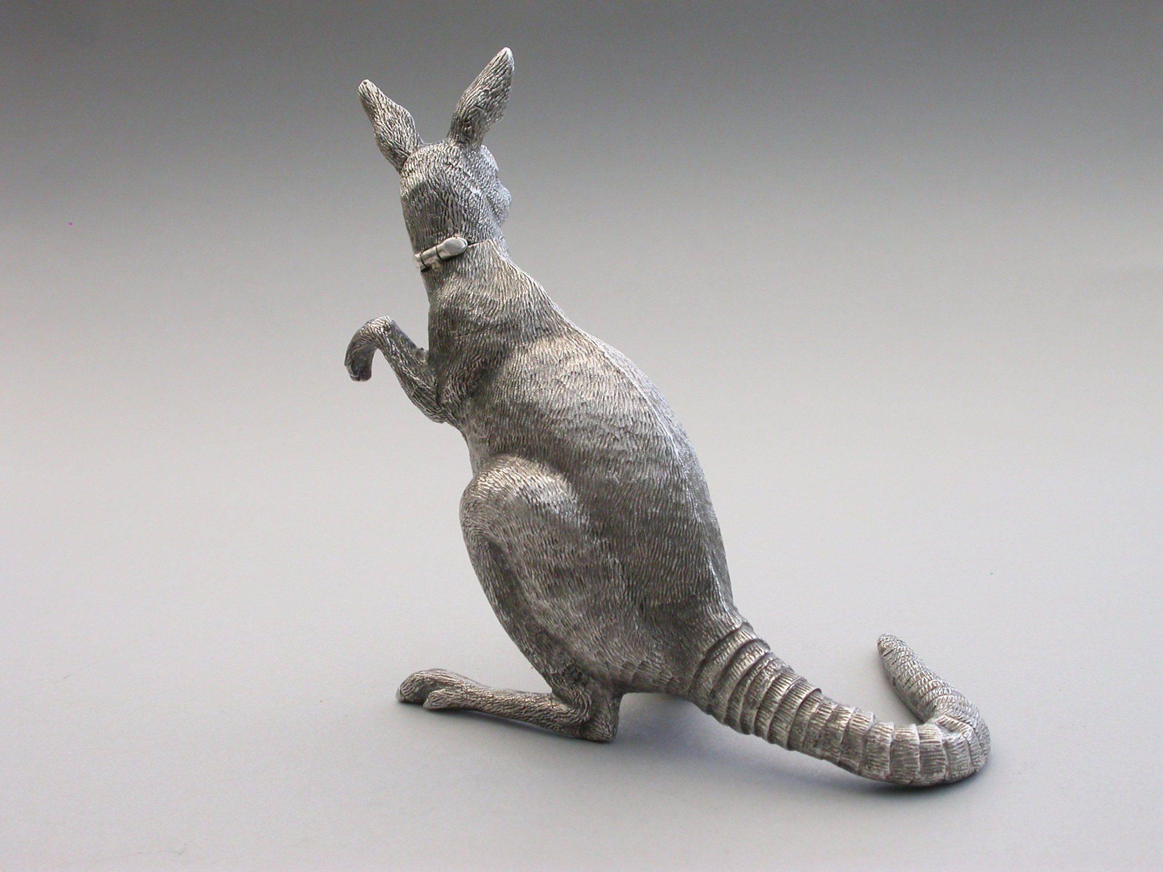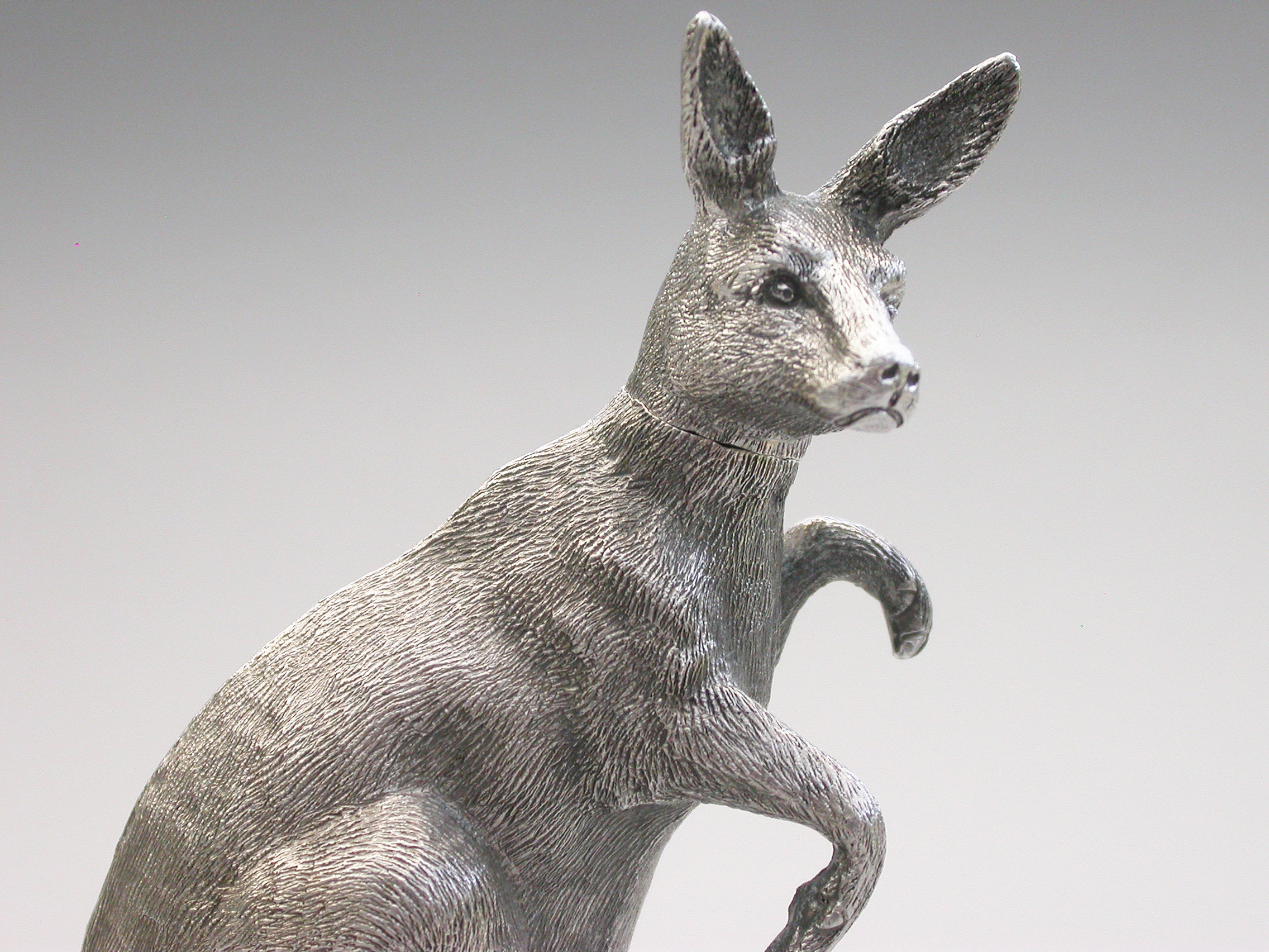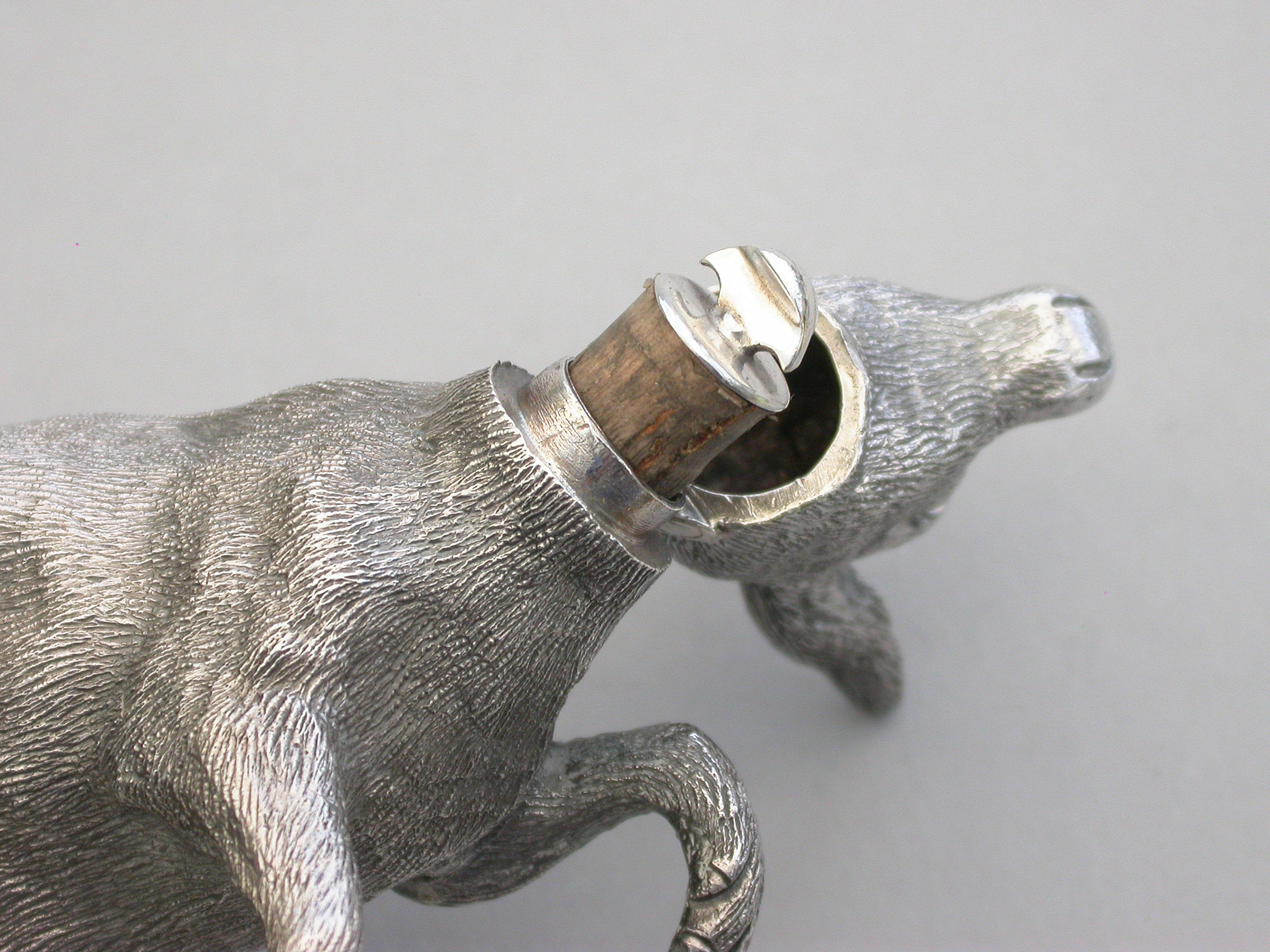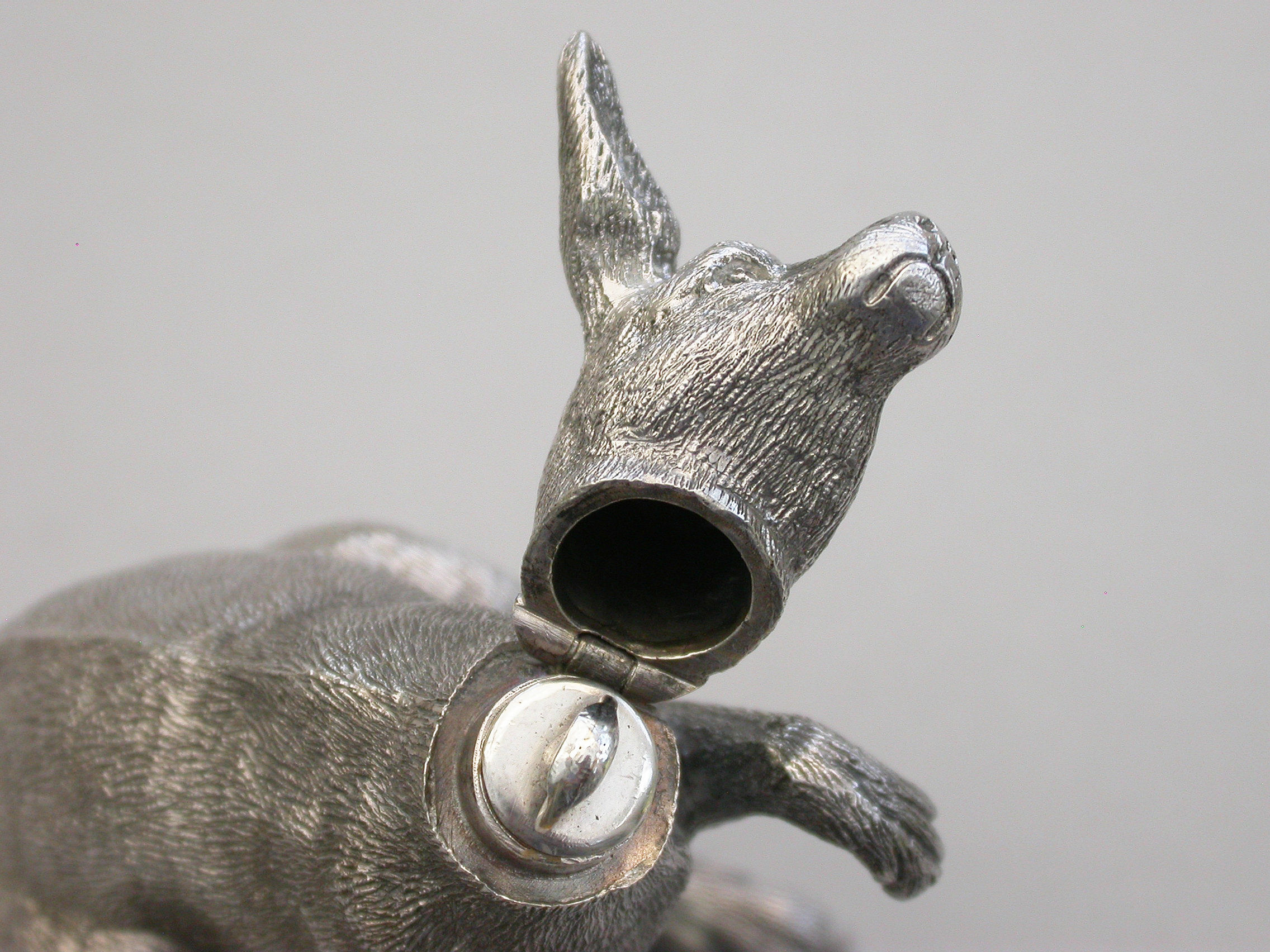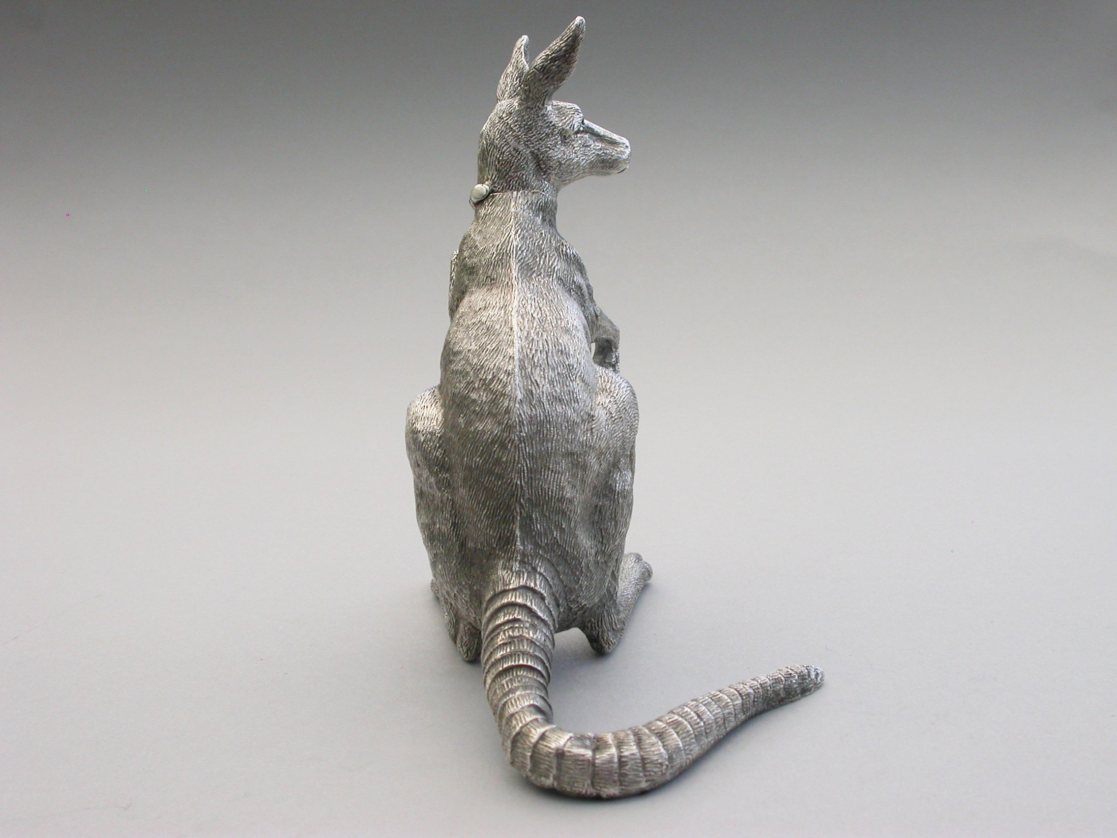 An extremely rare and unusual Edwardian English sterling silver novelty Scent Bottle made in the form of a Kangaroo in a standing position, with hinged head and silver mounted cork stopper and applicator. The body with finely detailed engraving to simulate the fur.