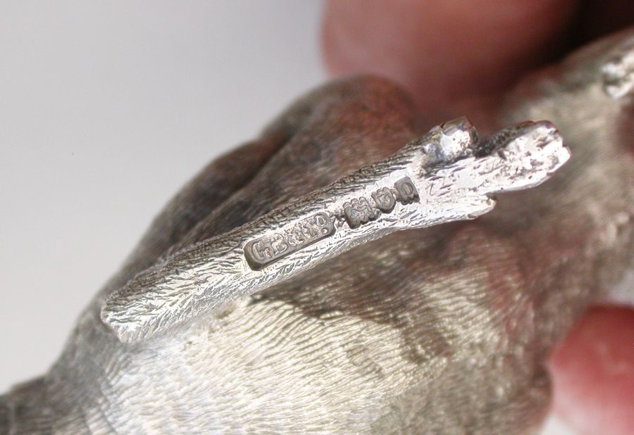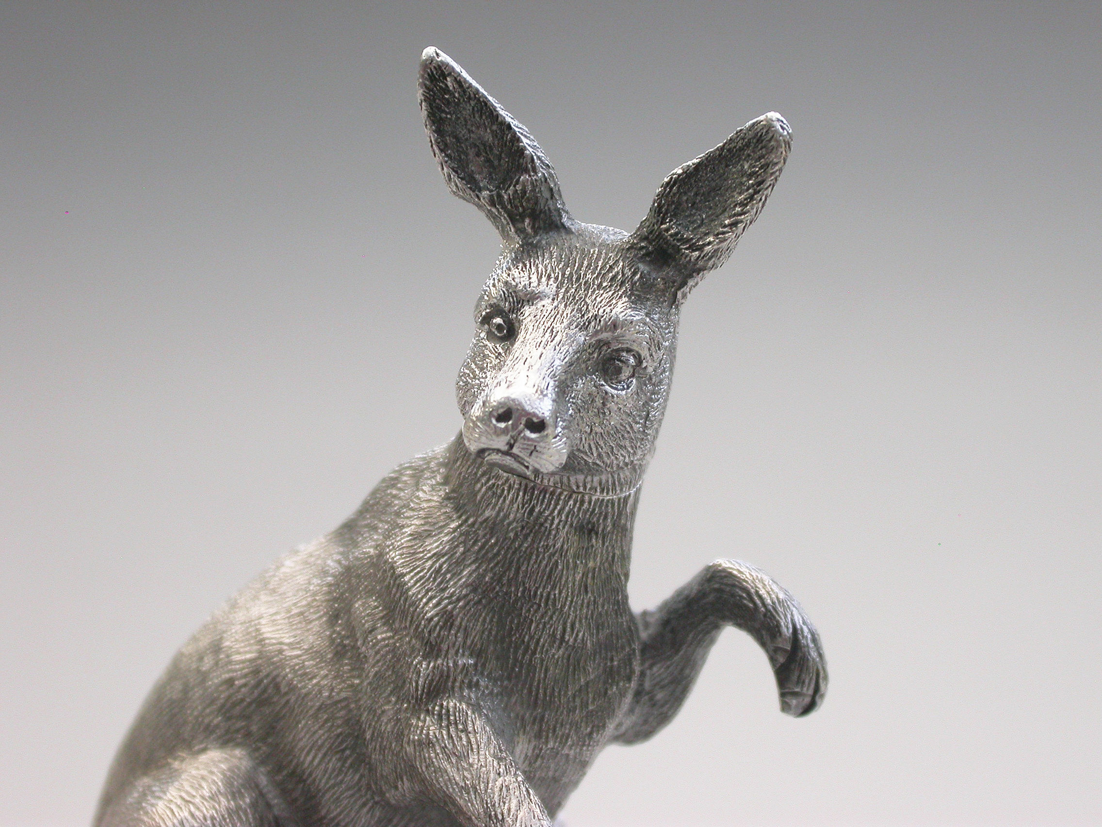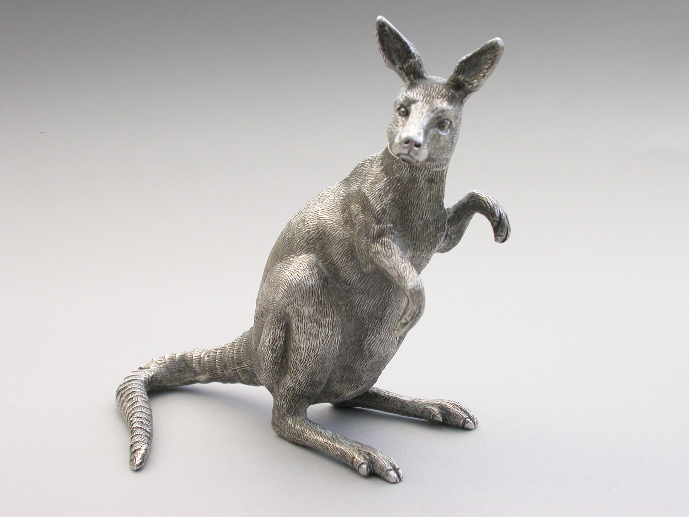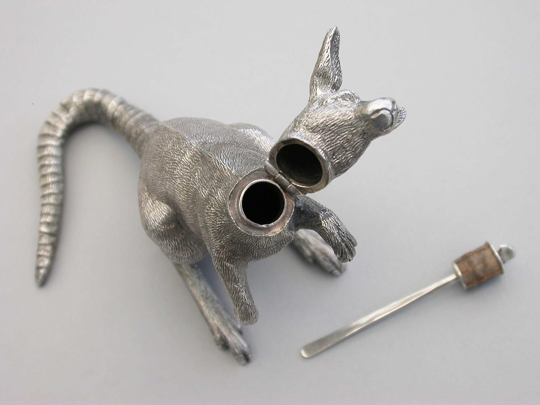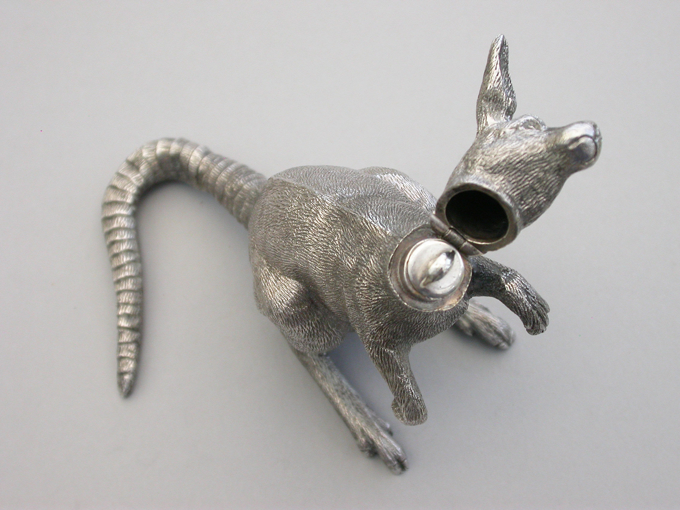 An extremely rare and unusual Edwardian English sterling silver novelty Scent Bottle made in the form of a Kangaroo in a standing position, with hinged head and silver mounted cork stopper and applicator. The body with finely detailed engraving to simulate the fur.
