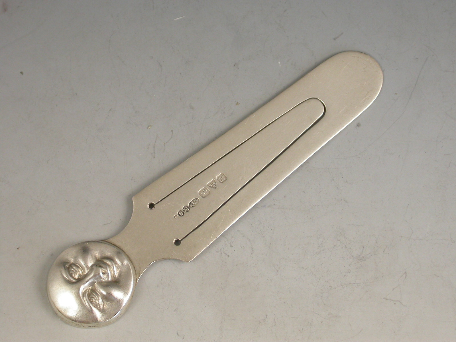 An Edwardian novelty silver Bookmark, the terminal depicting a smiling face of the 'Man in the Moon'.