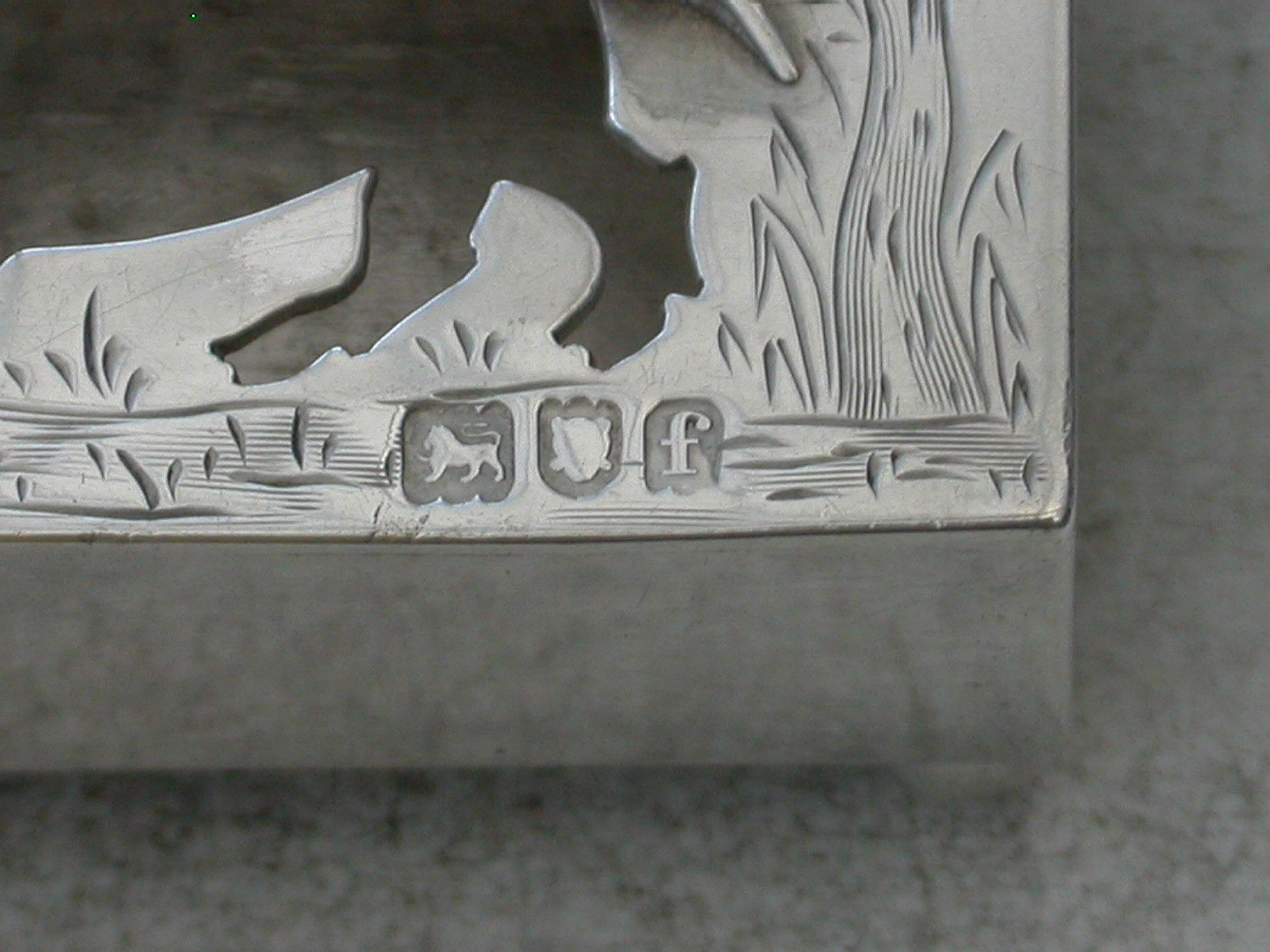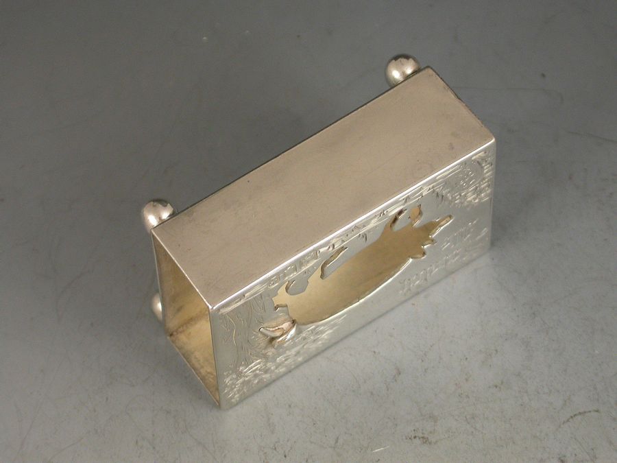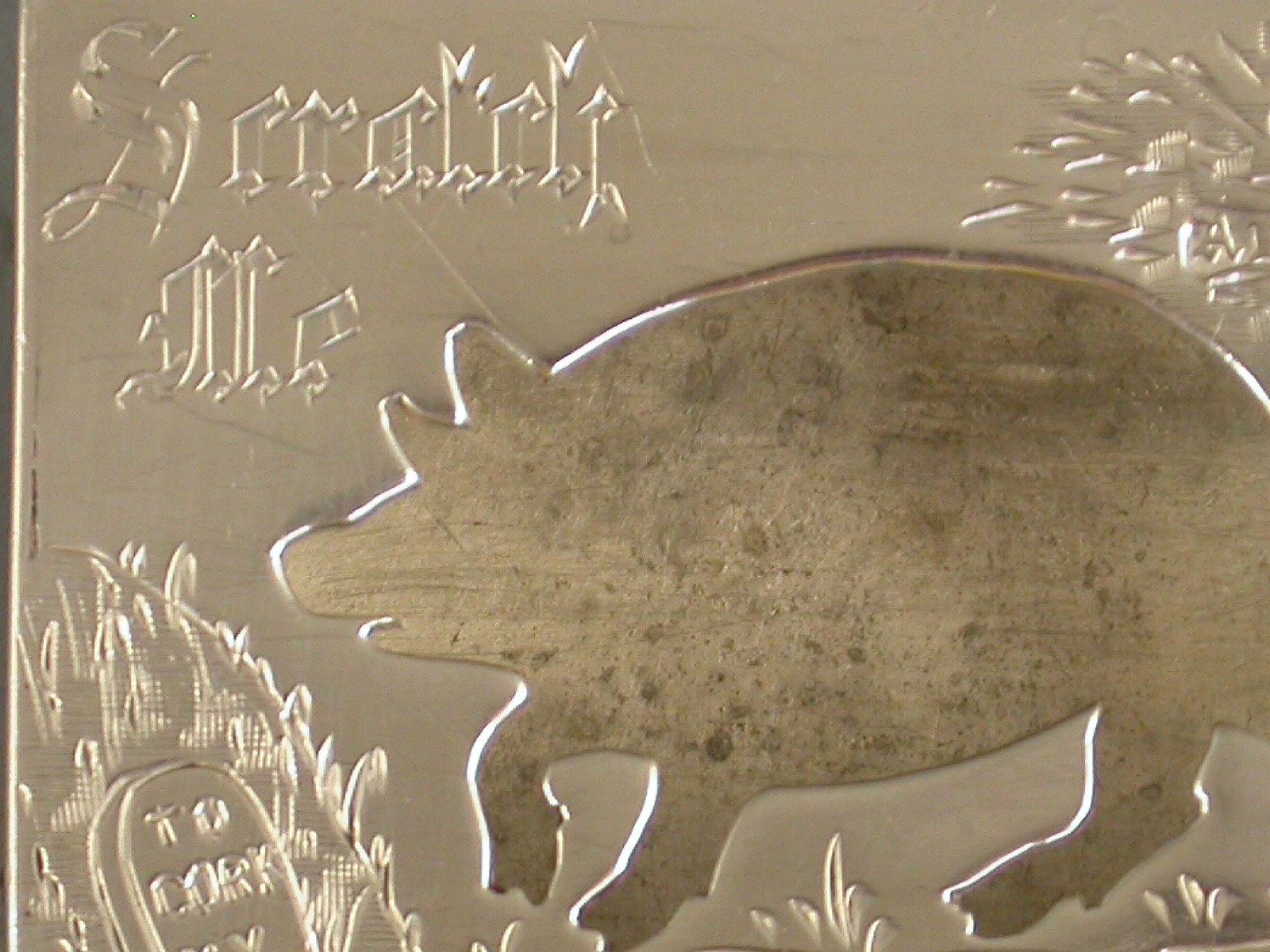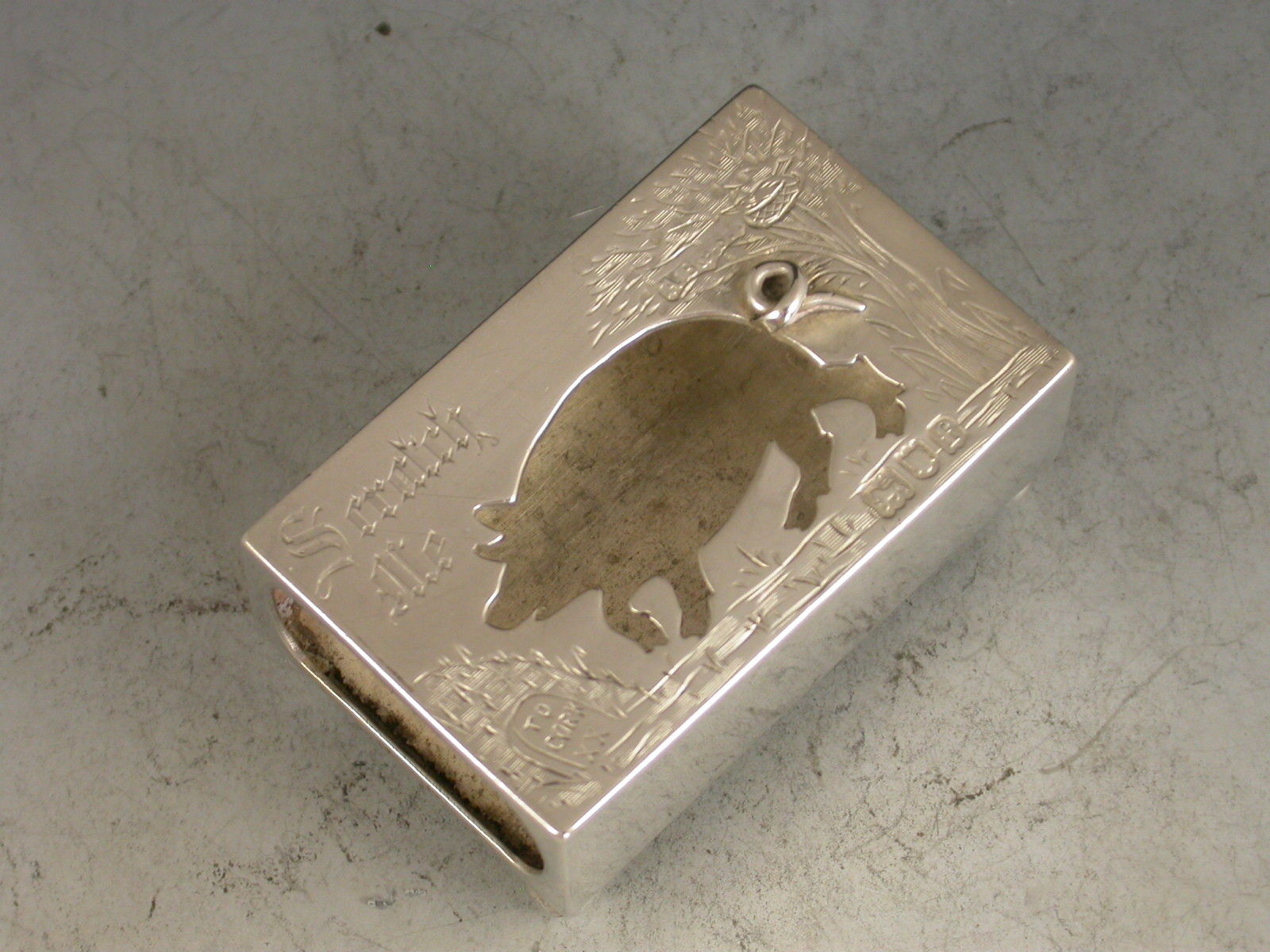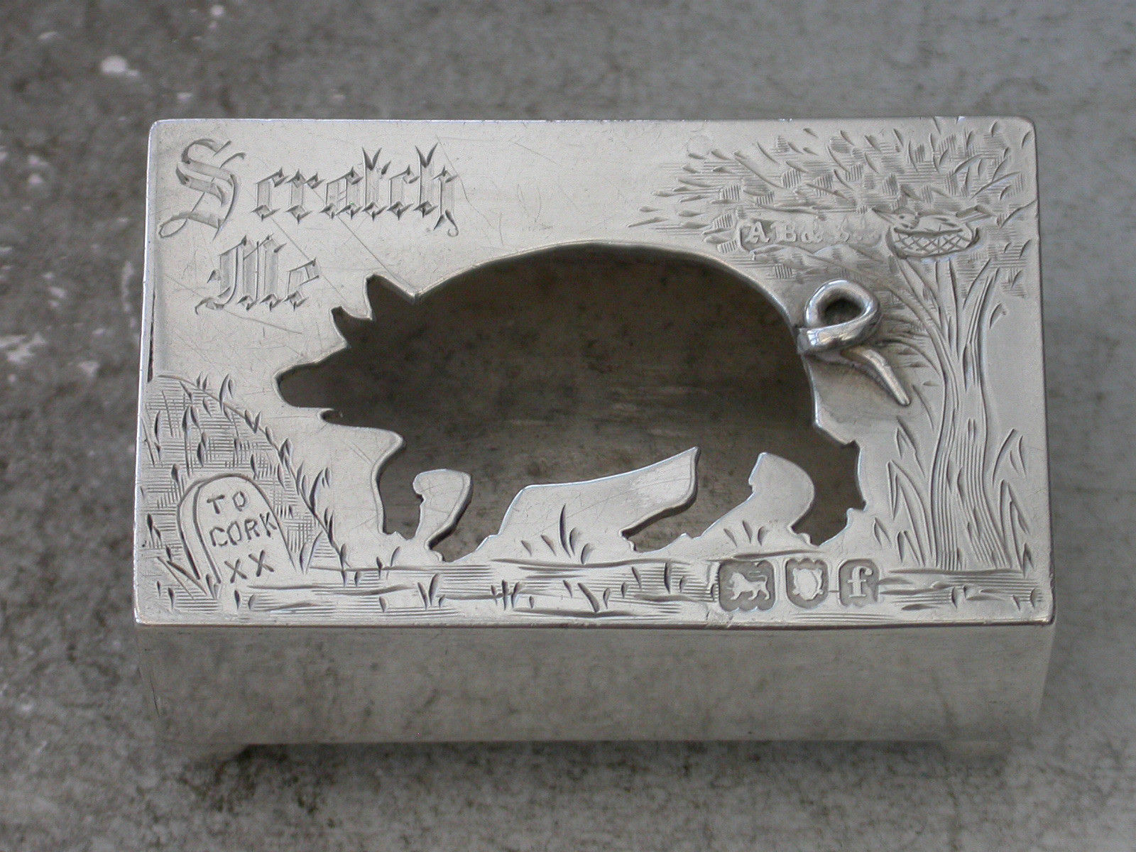 A comical Edwardian novelty silver Matchbox Cover standing on four ball feet, the cover with cut out silhouette of a pig going to Cork and engraved with the legend ""Scratch Me"". A bird sitting on a nest in a tree to the right hand side.