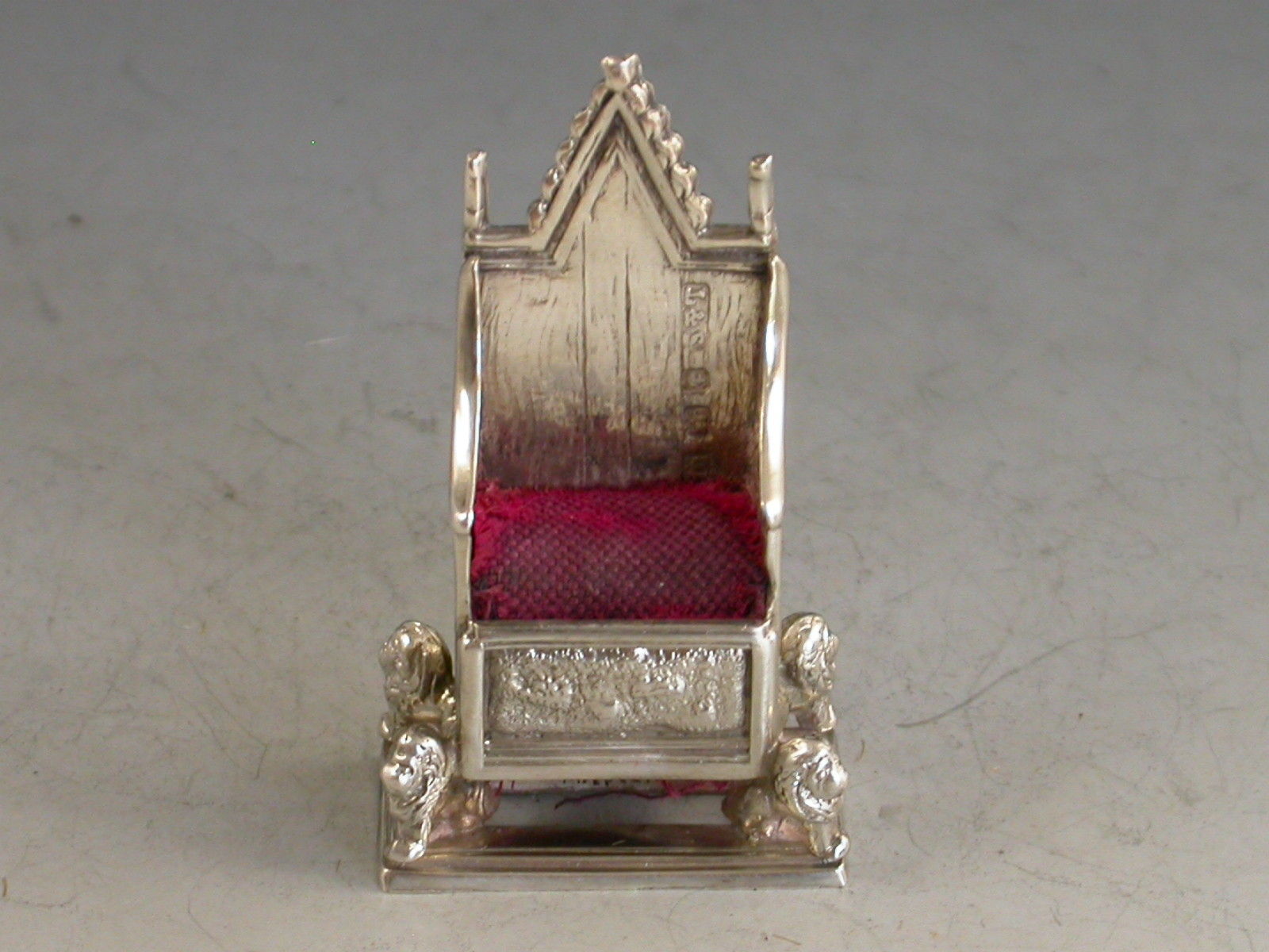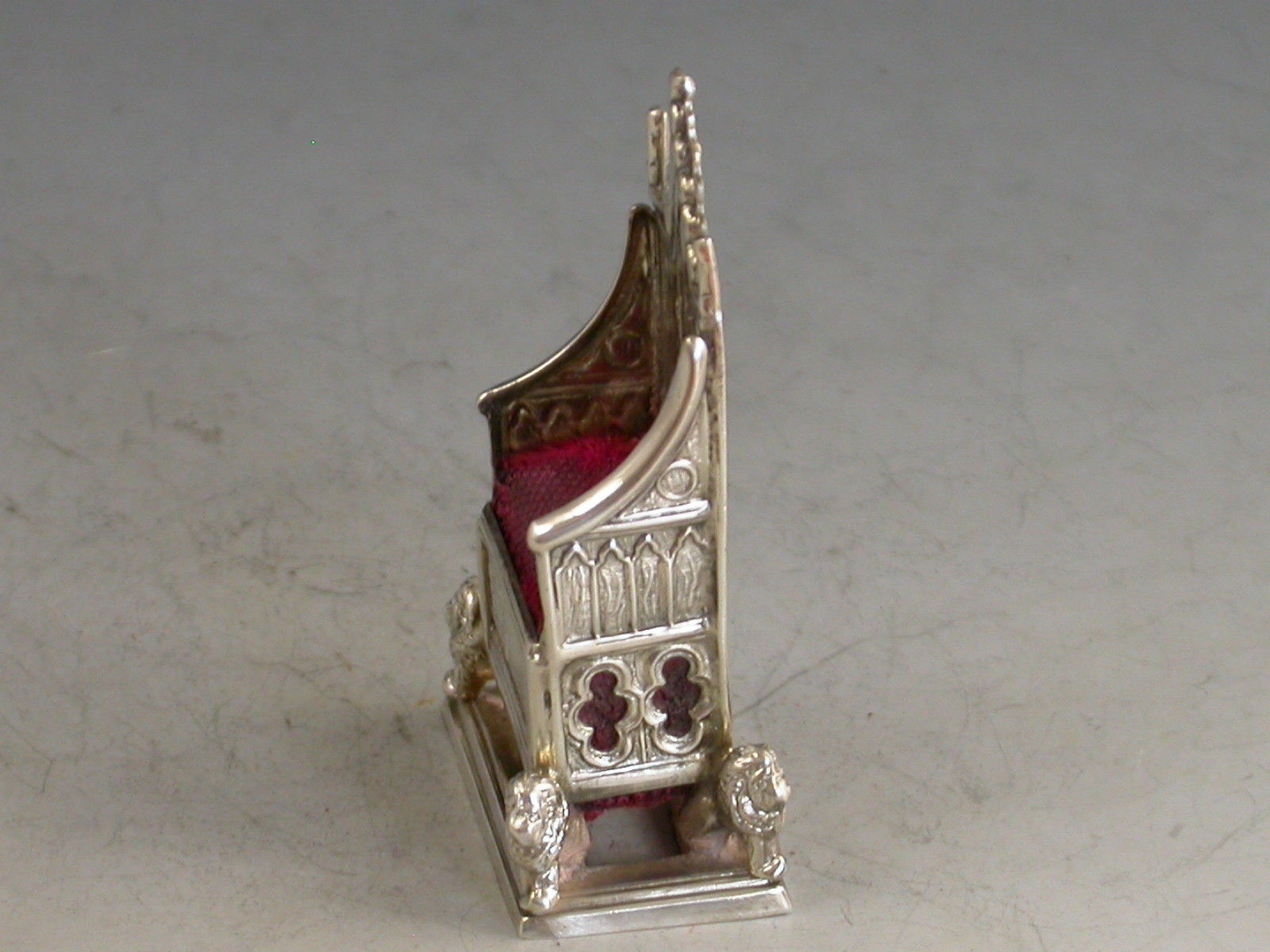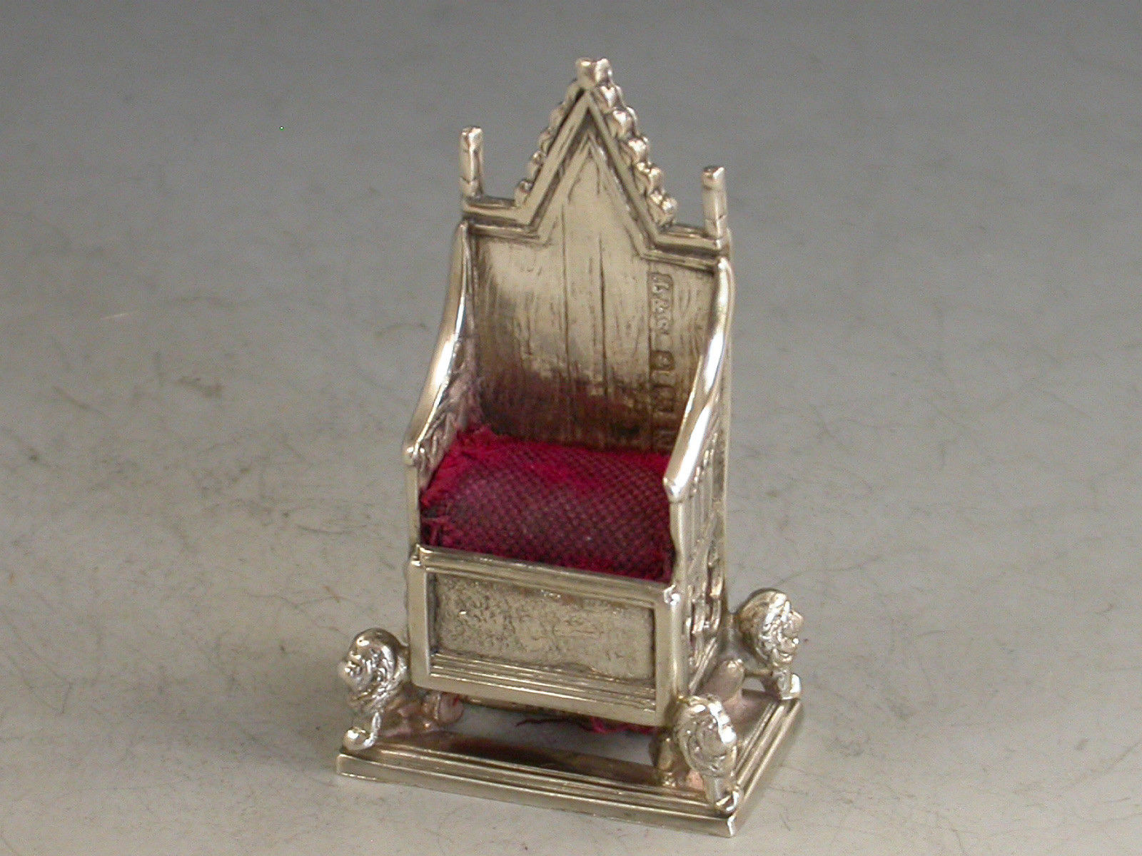 An Edwardian novelty silver Pin Cushion made in the form of a miniature Coronation Chair, an exact replica of King Edward's chair in Westminster Abbey.