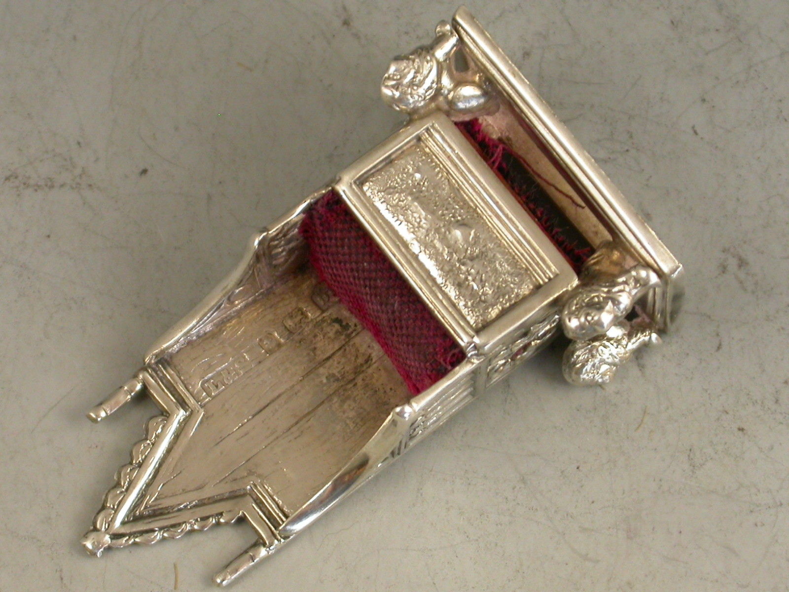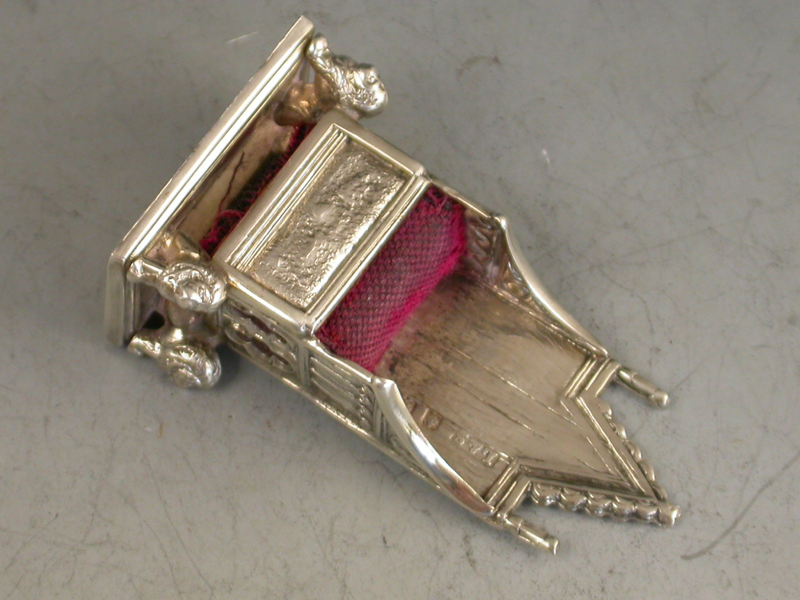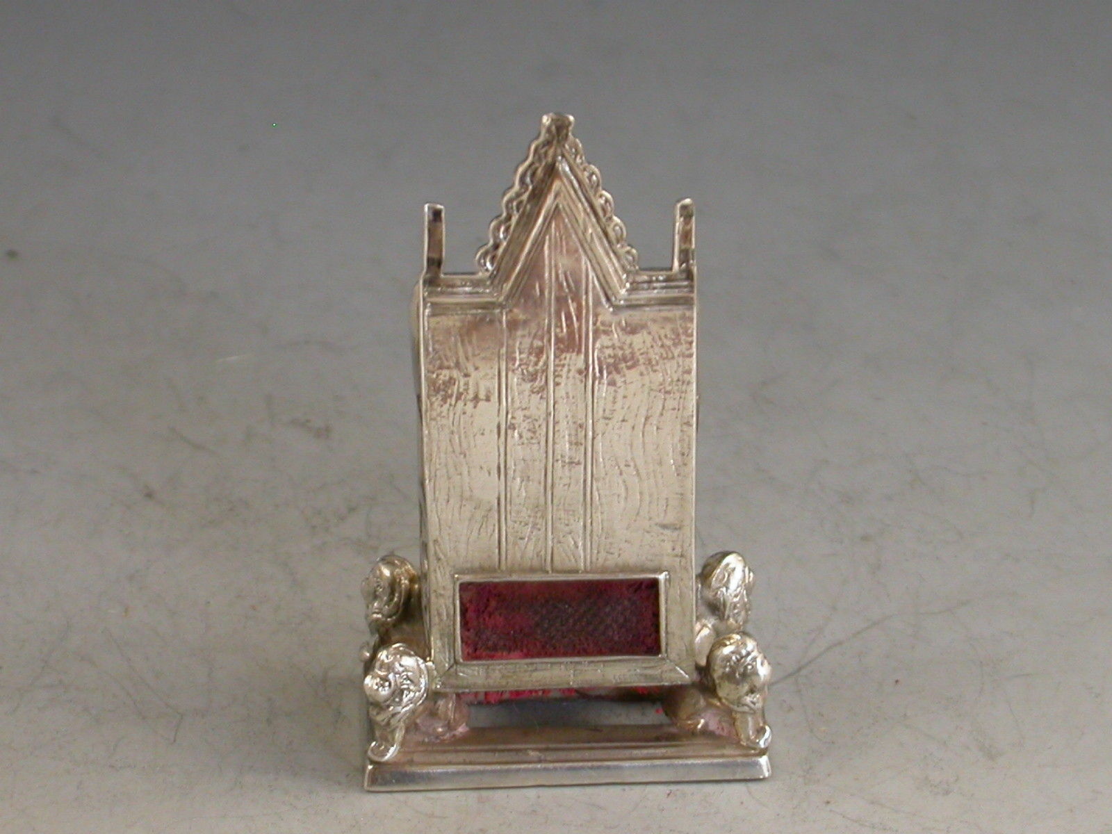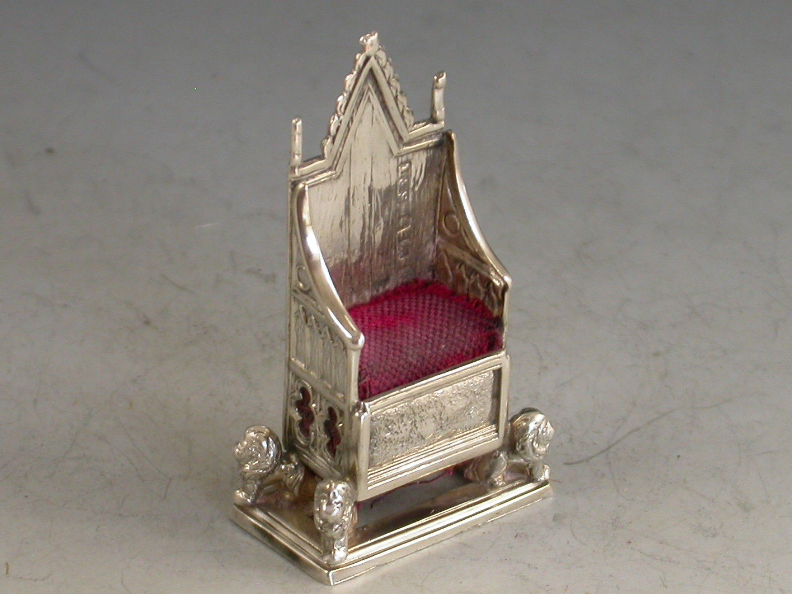An Edwardian novelty silver Pin Cushion made in the form of a miniature Coronation Chair, an exact replica of King Edward's chair in Westminster Abbey.