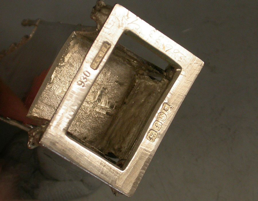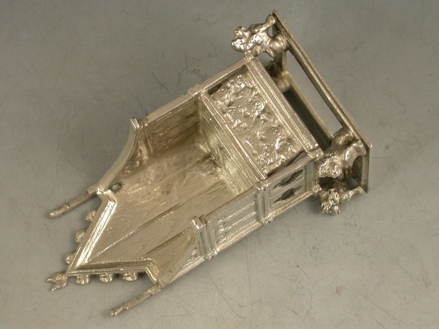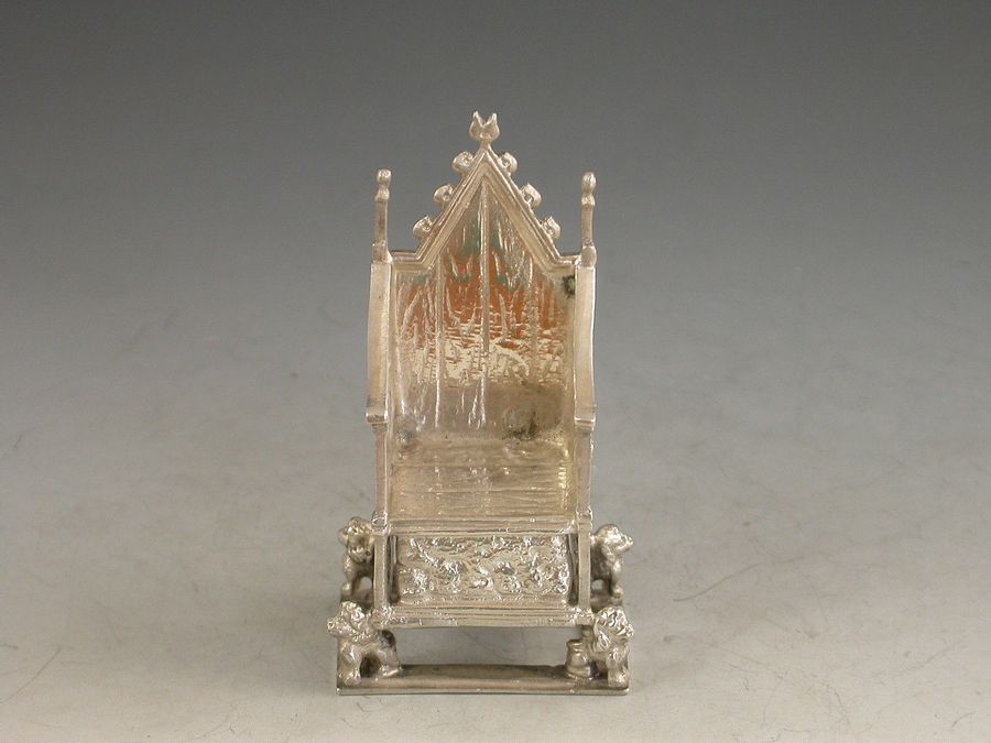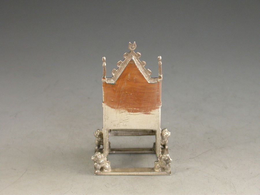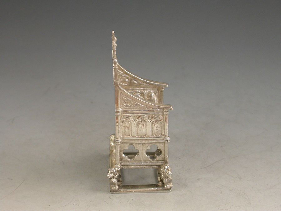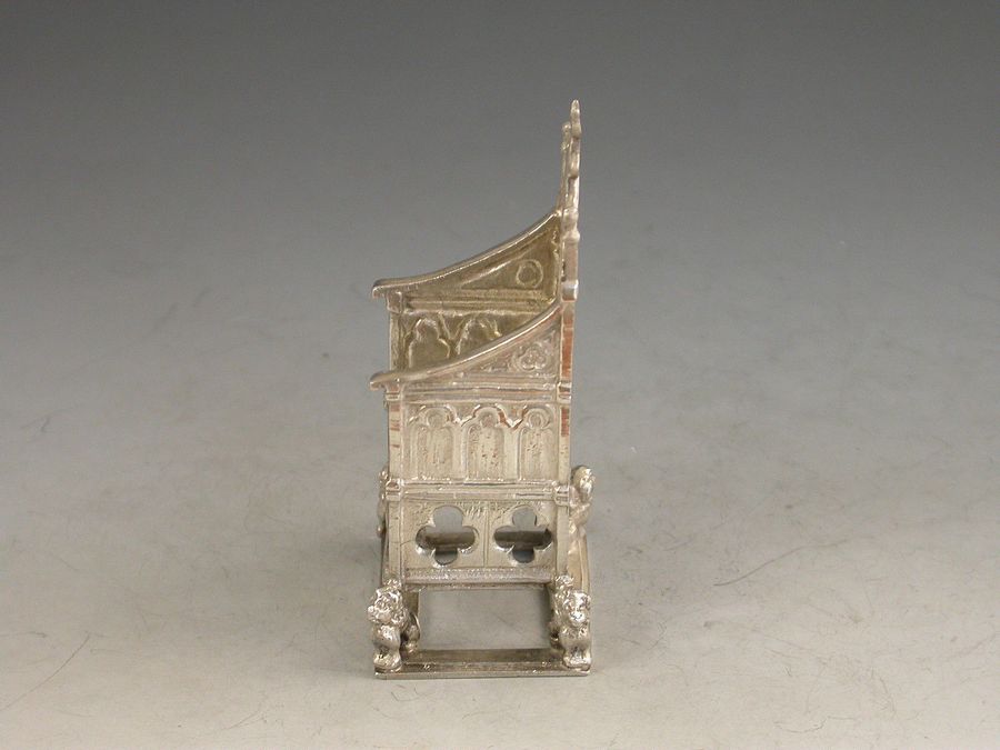 An Edwardian novelty silver miniature Coronation Chair made as an exact replica of King Edward's chair in Westminster Abbey.