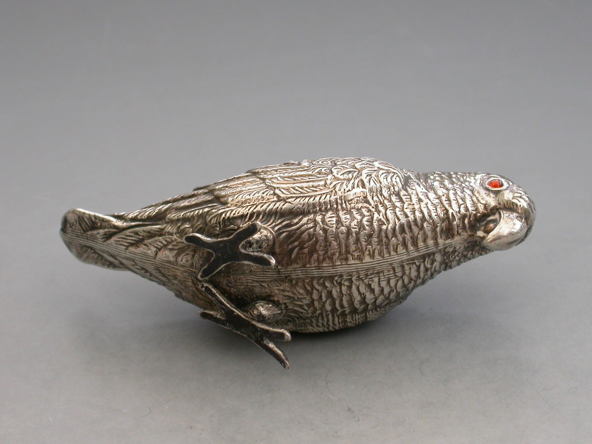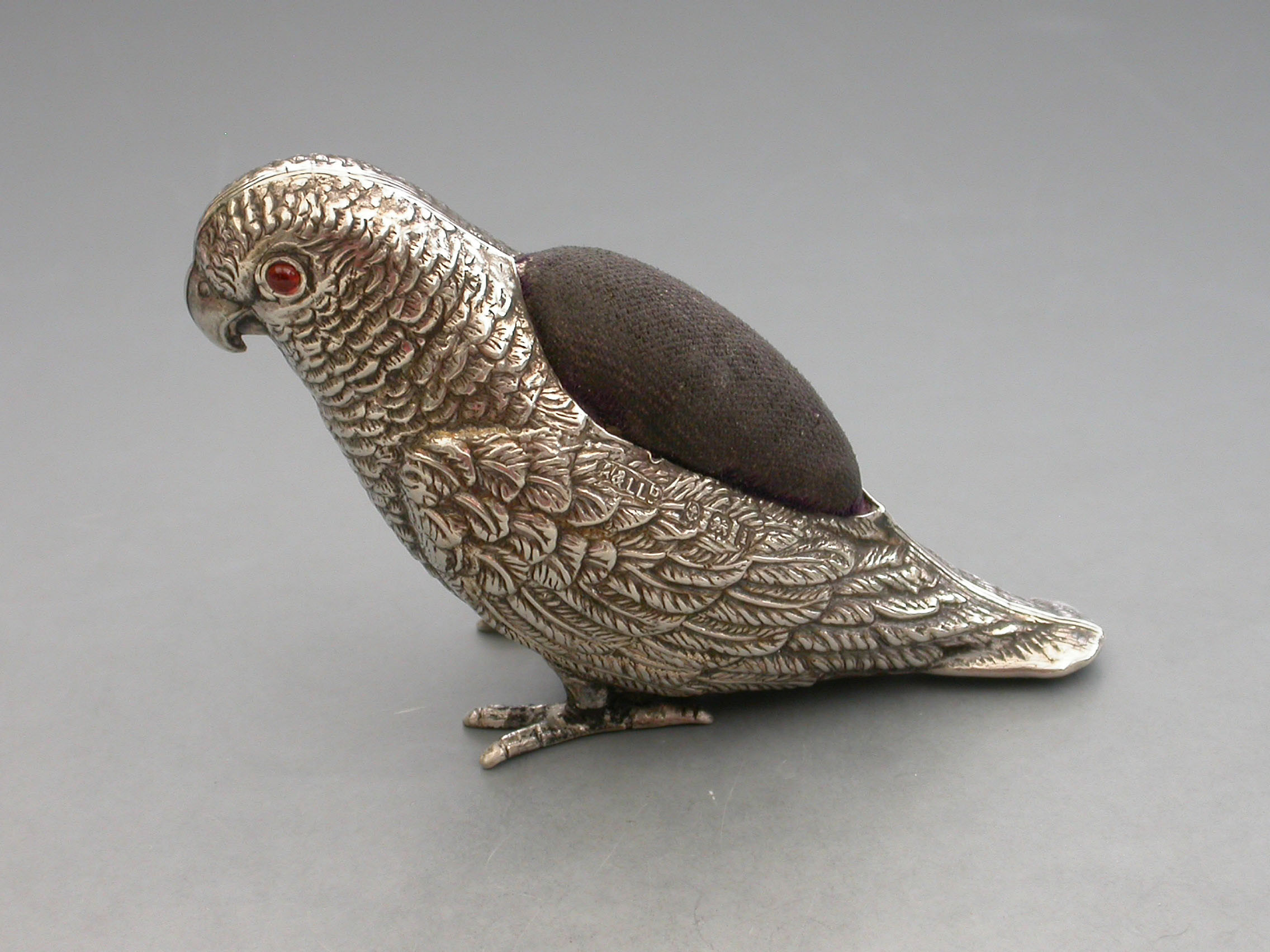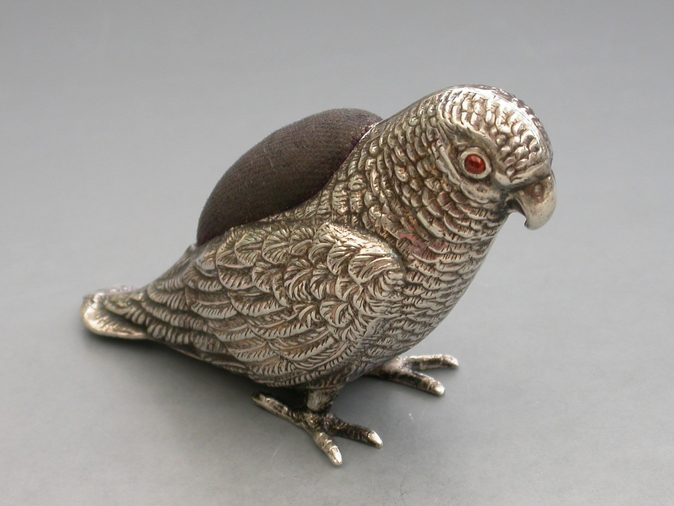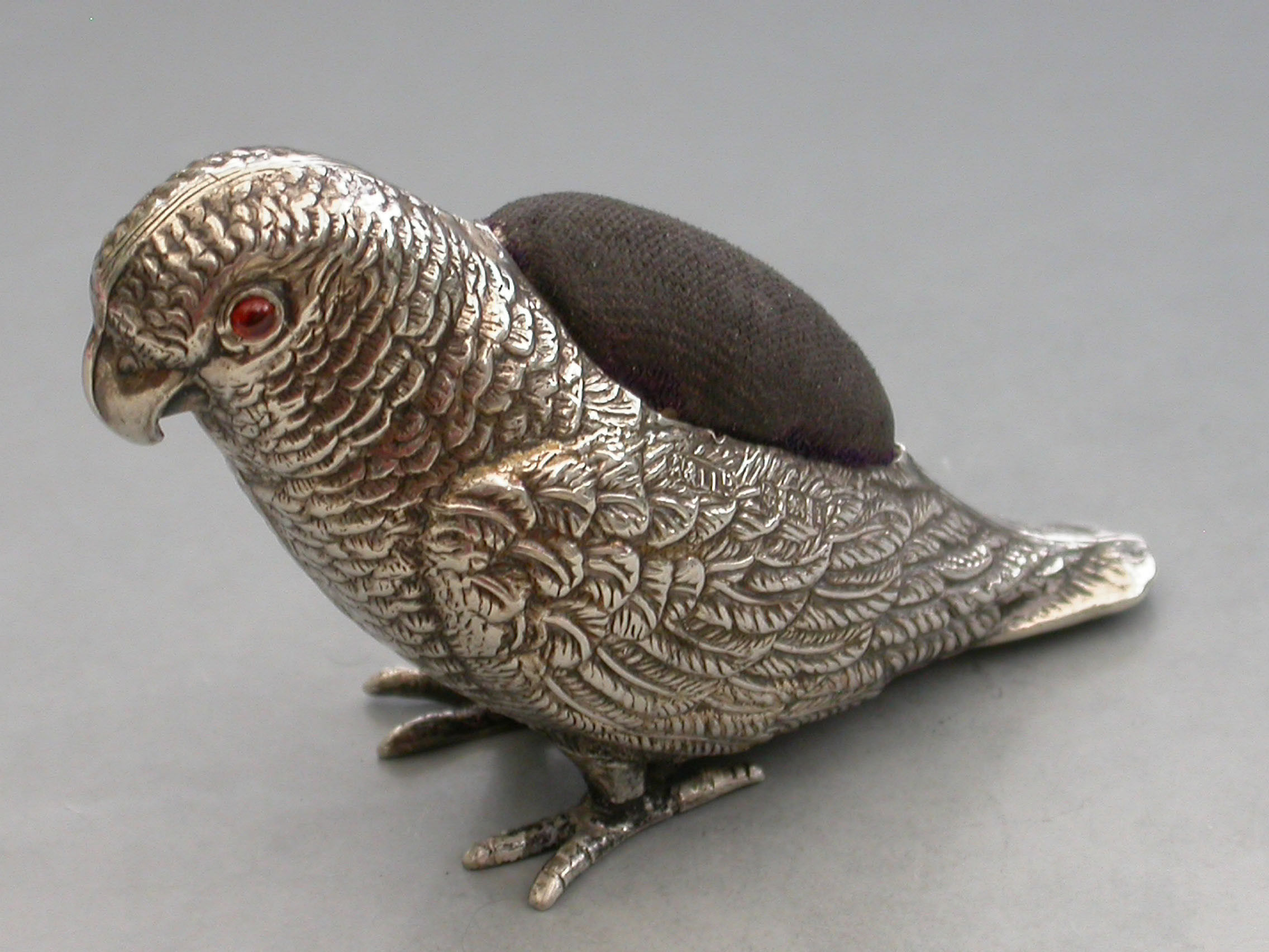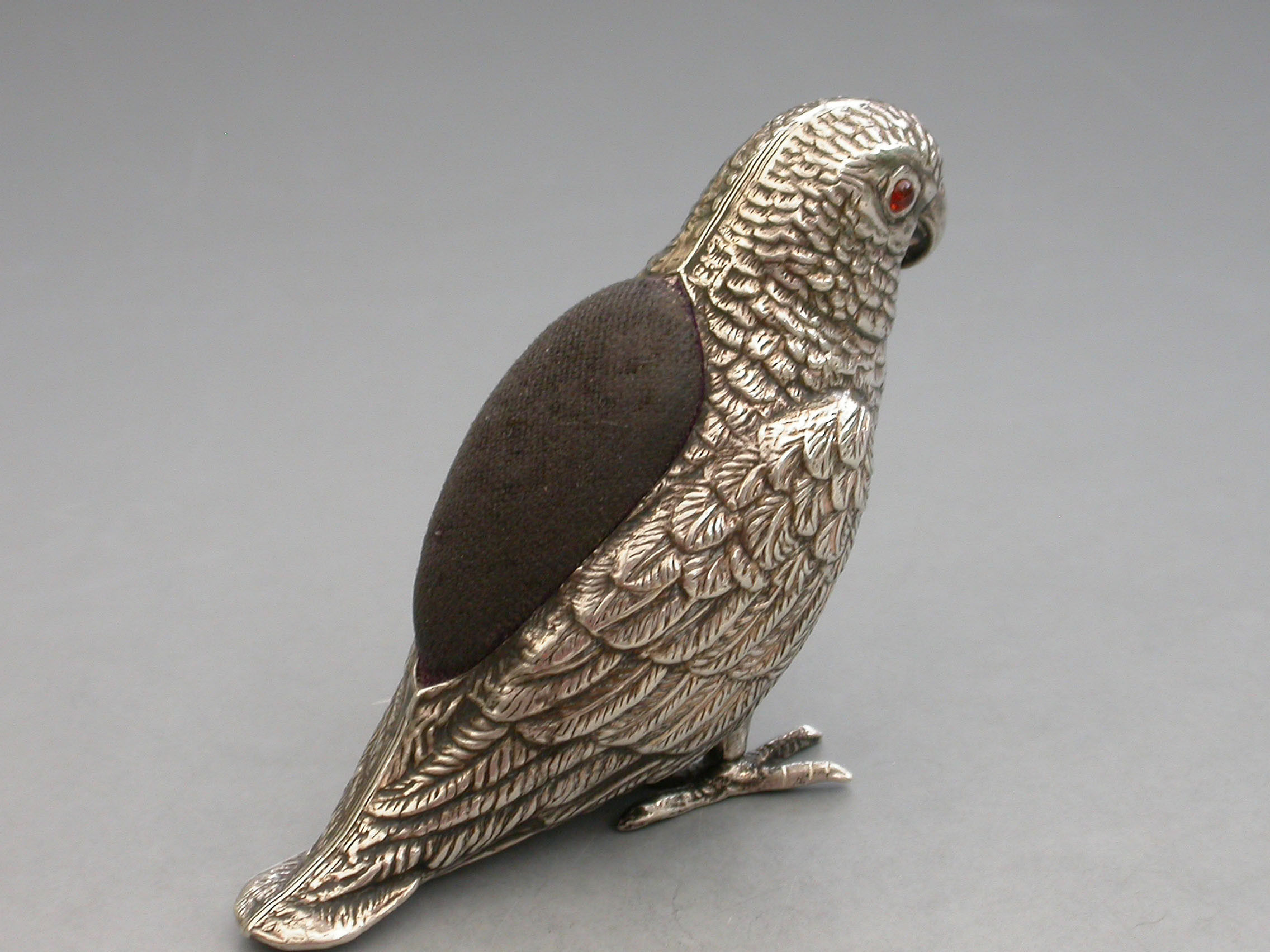 An extremely rare Edwardian novelty silver Pin cushion made in the form of a Parrot, set with garnet eyes and complete with original velvet cushion.