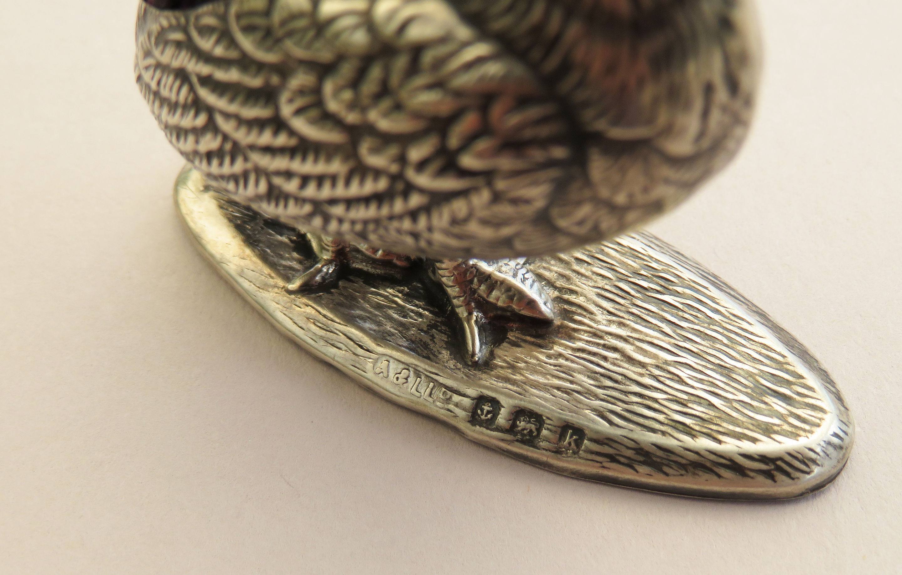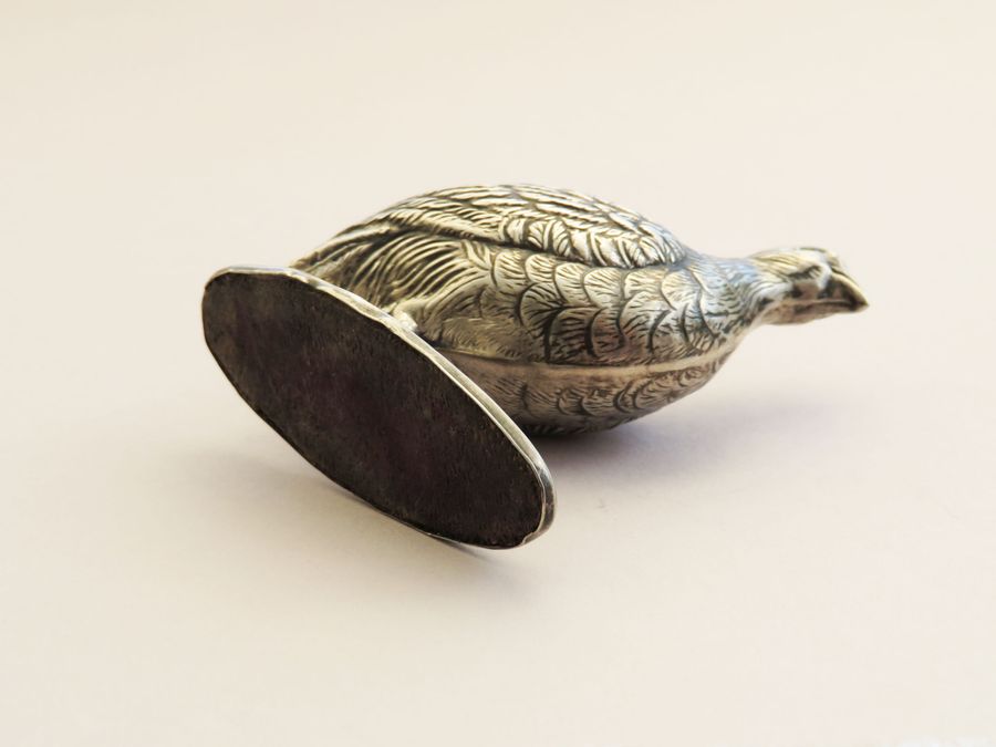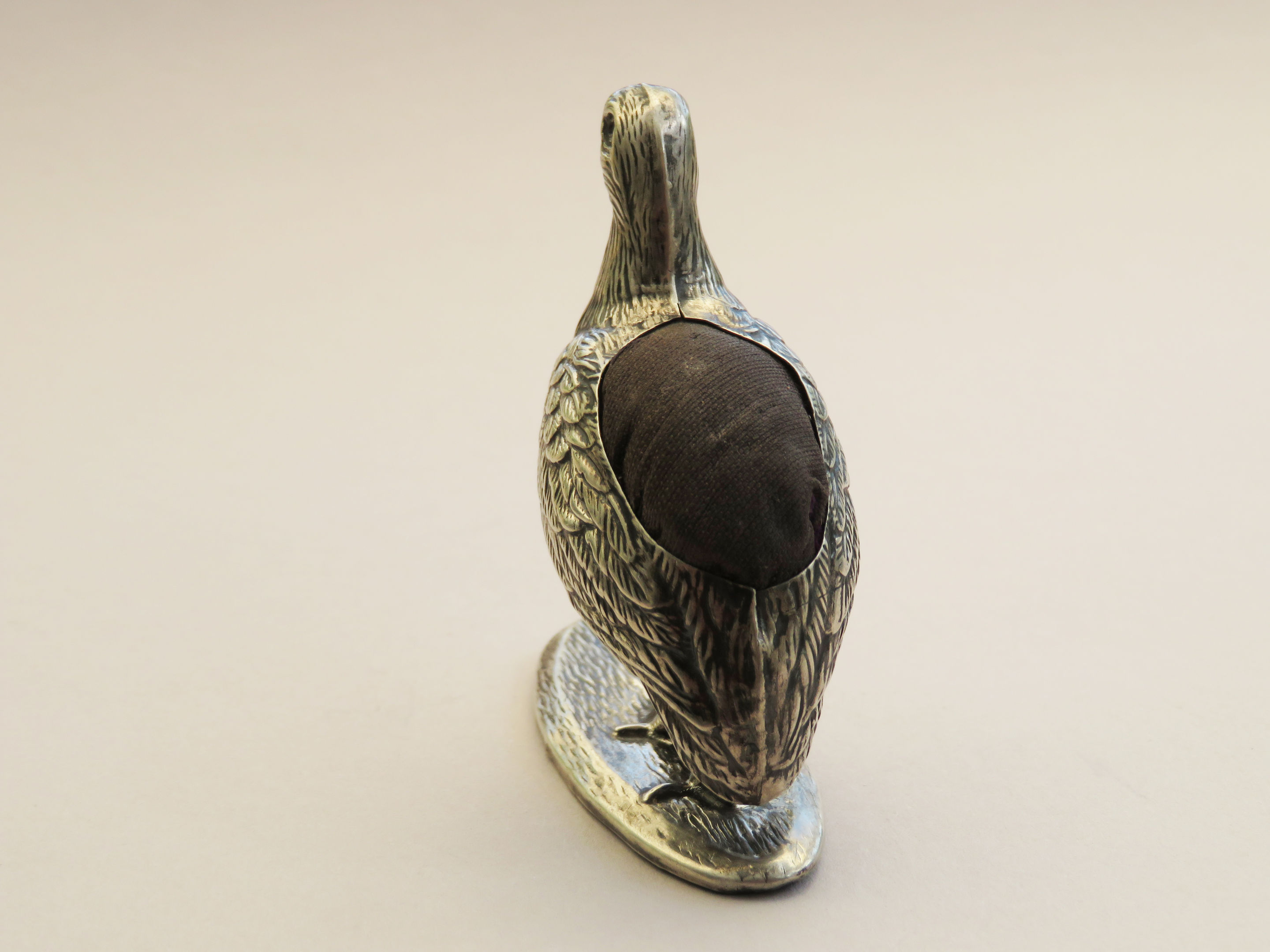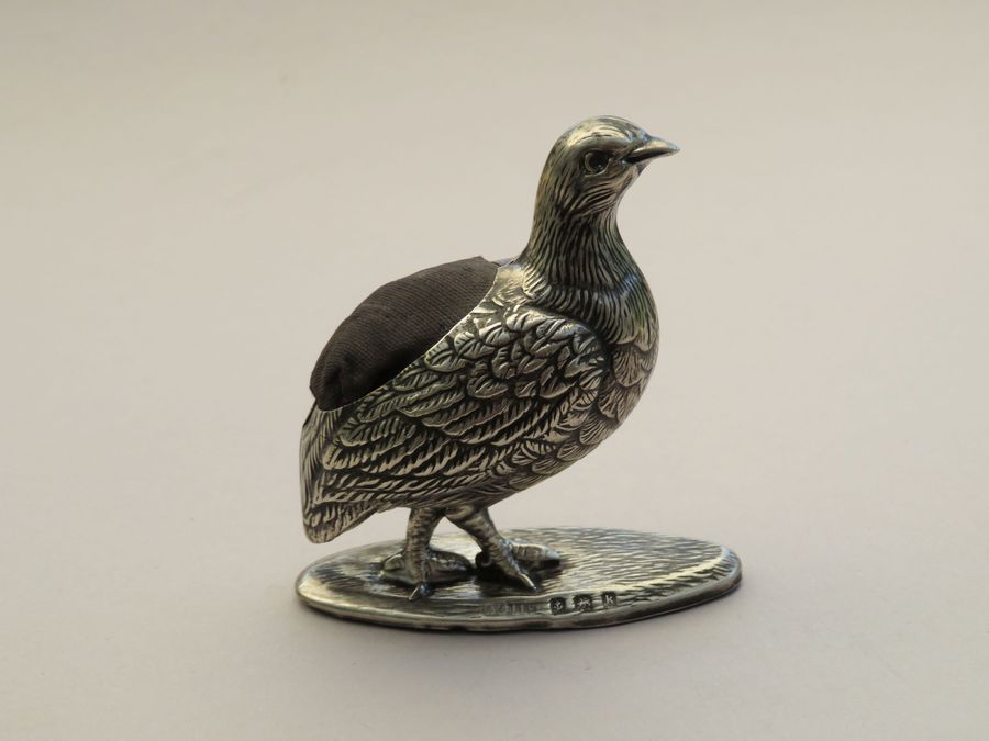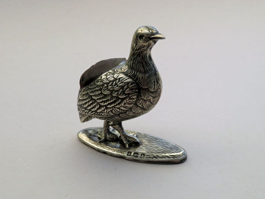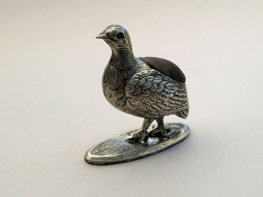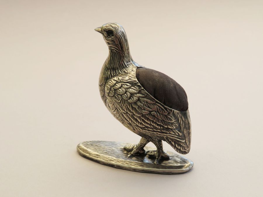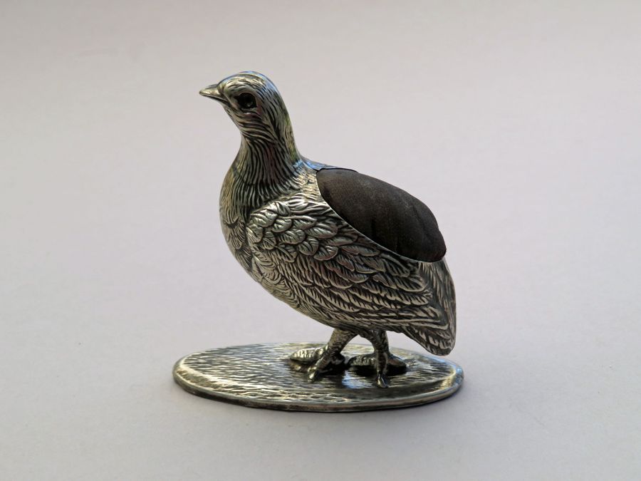 An extremely rare early 20th century novelty silver Pin Cushion made in the form of a Partridge standing on an oval base, with realistically textured feathers. Complete with original cushion and velvet base.