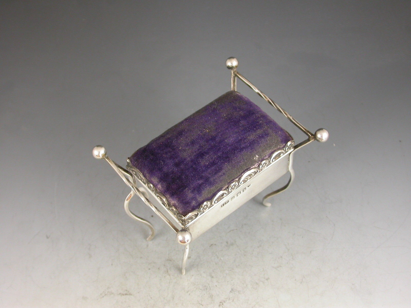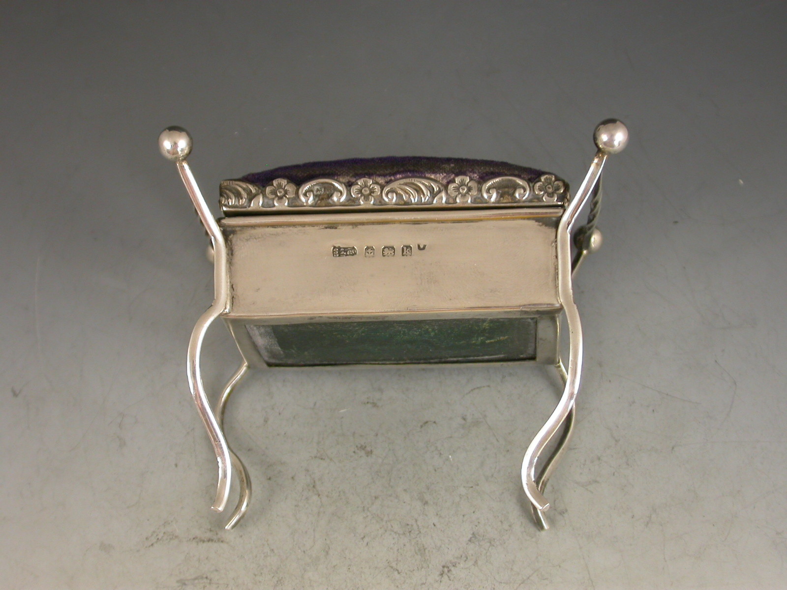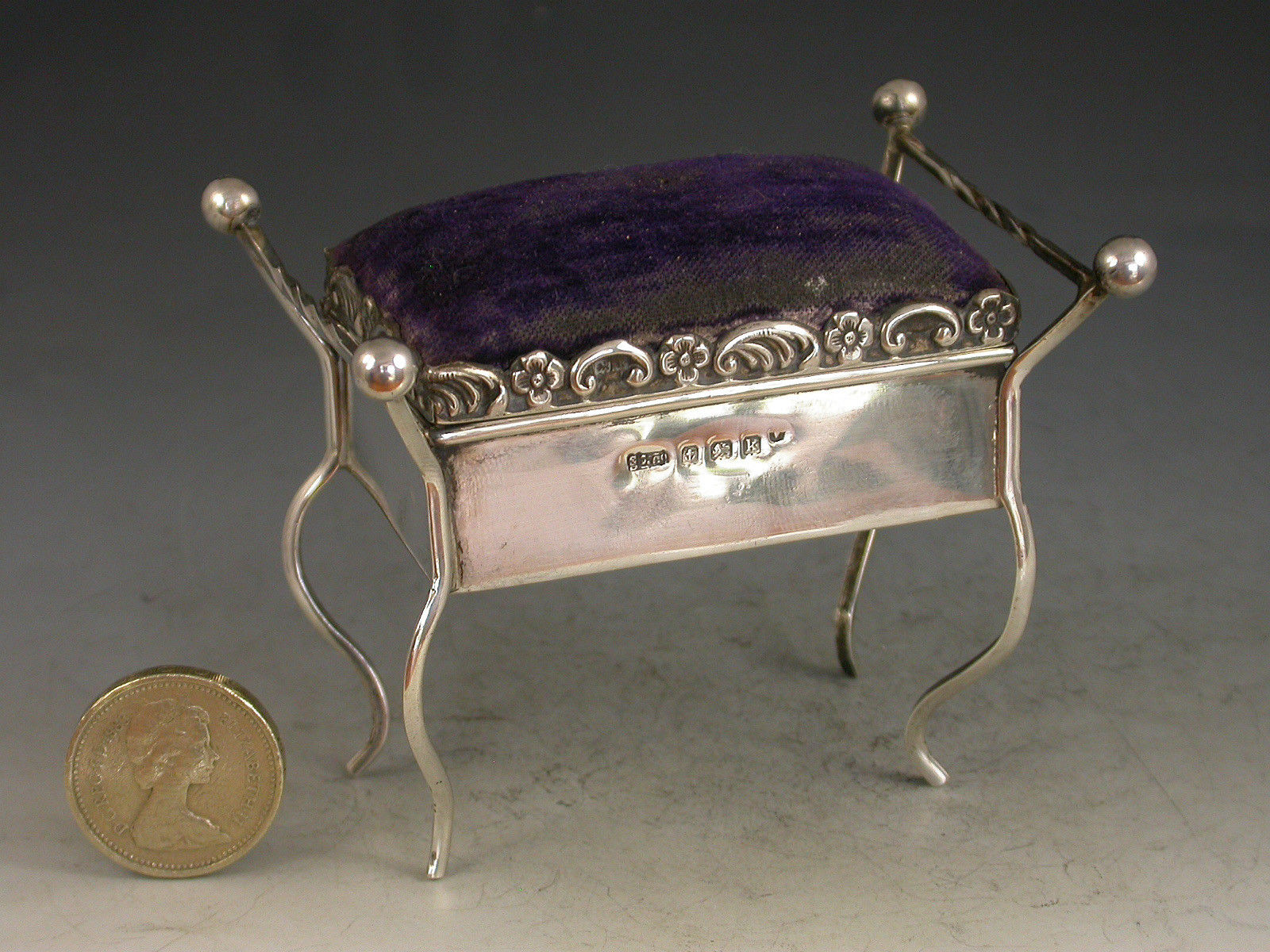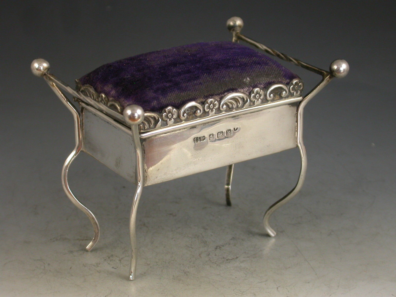 A rare Edwardian novelty silver Pin Cushion / Trinket Box made in the form of a Piano Stool, with scrolled legs and spiraled handles with ball finials. The hinged lid supporting the original blue velvet cushion and opening to reveal the silk lined interior and an original mirror.