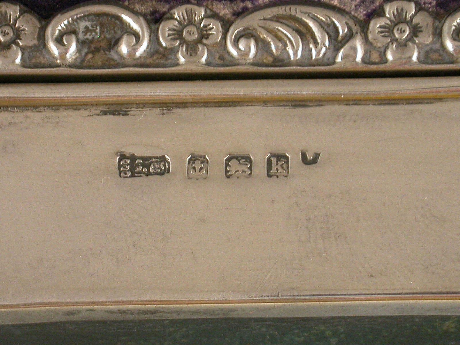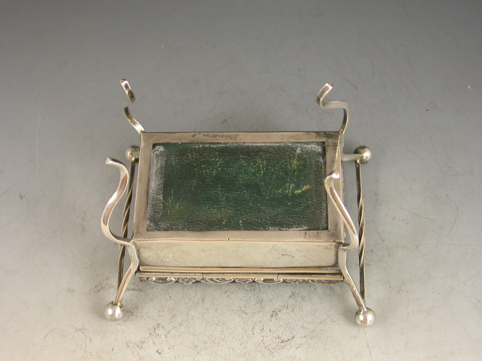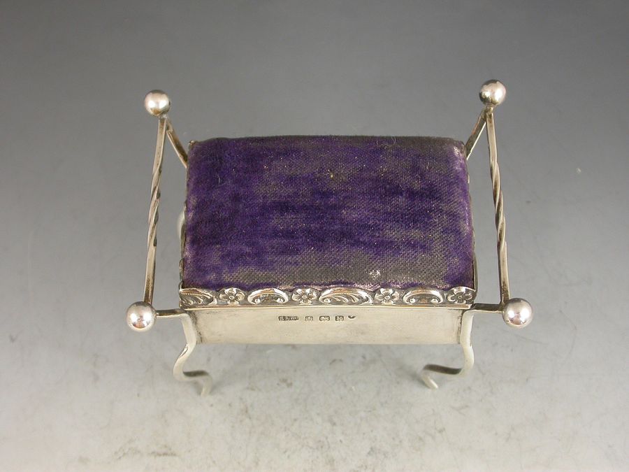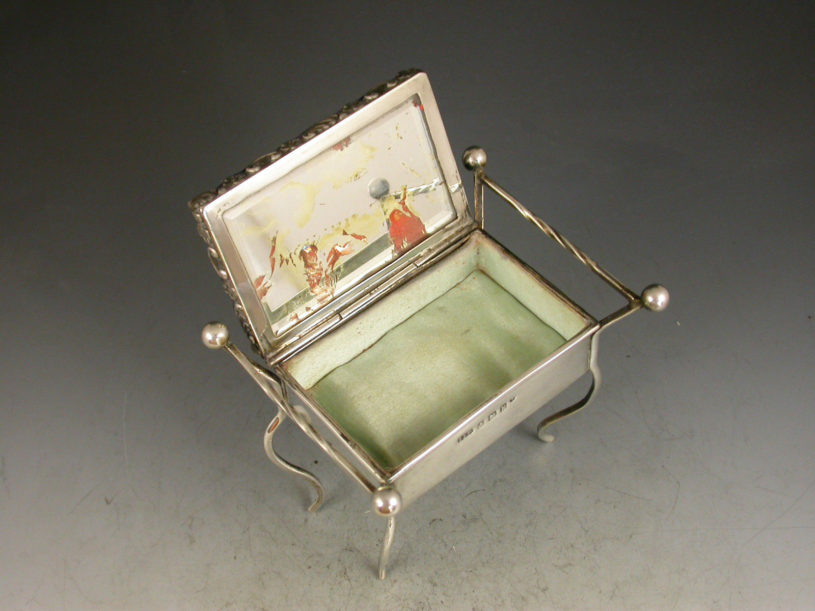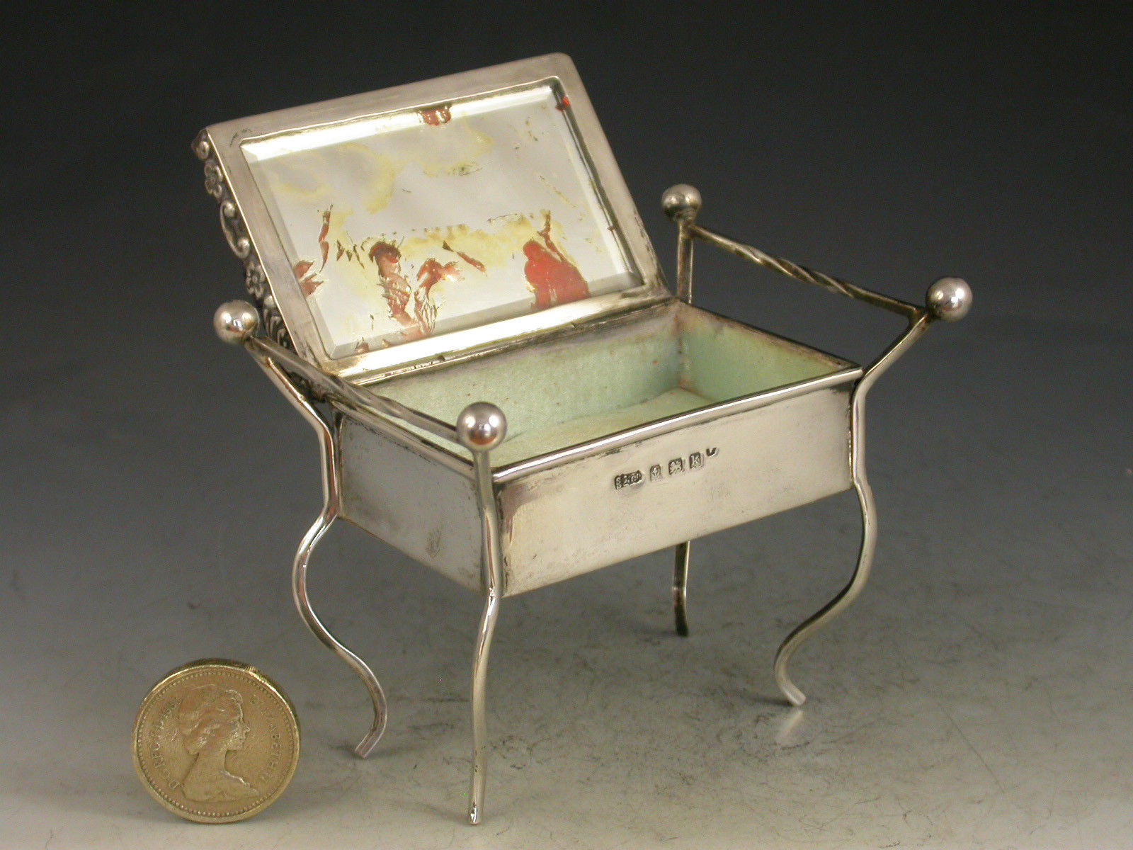 A rare Edwardian novelty silver Pin Cushion / Trinket Box made in the form of a Piano Stool, with scrolled legs and spiraled handles with ball finials. The hinged lid supporting the original blue velvet cushion and opening to reveal the silk lined interior and an original mirror.