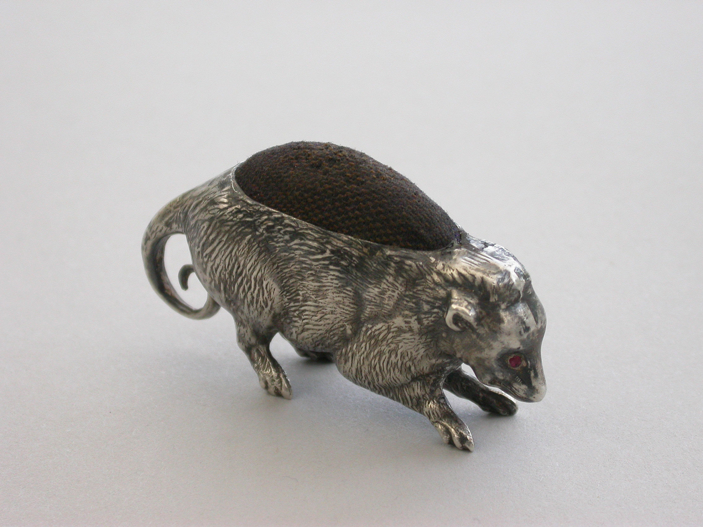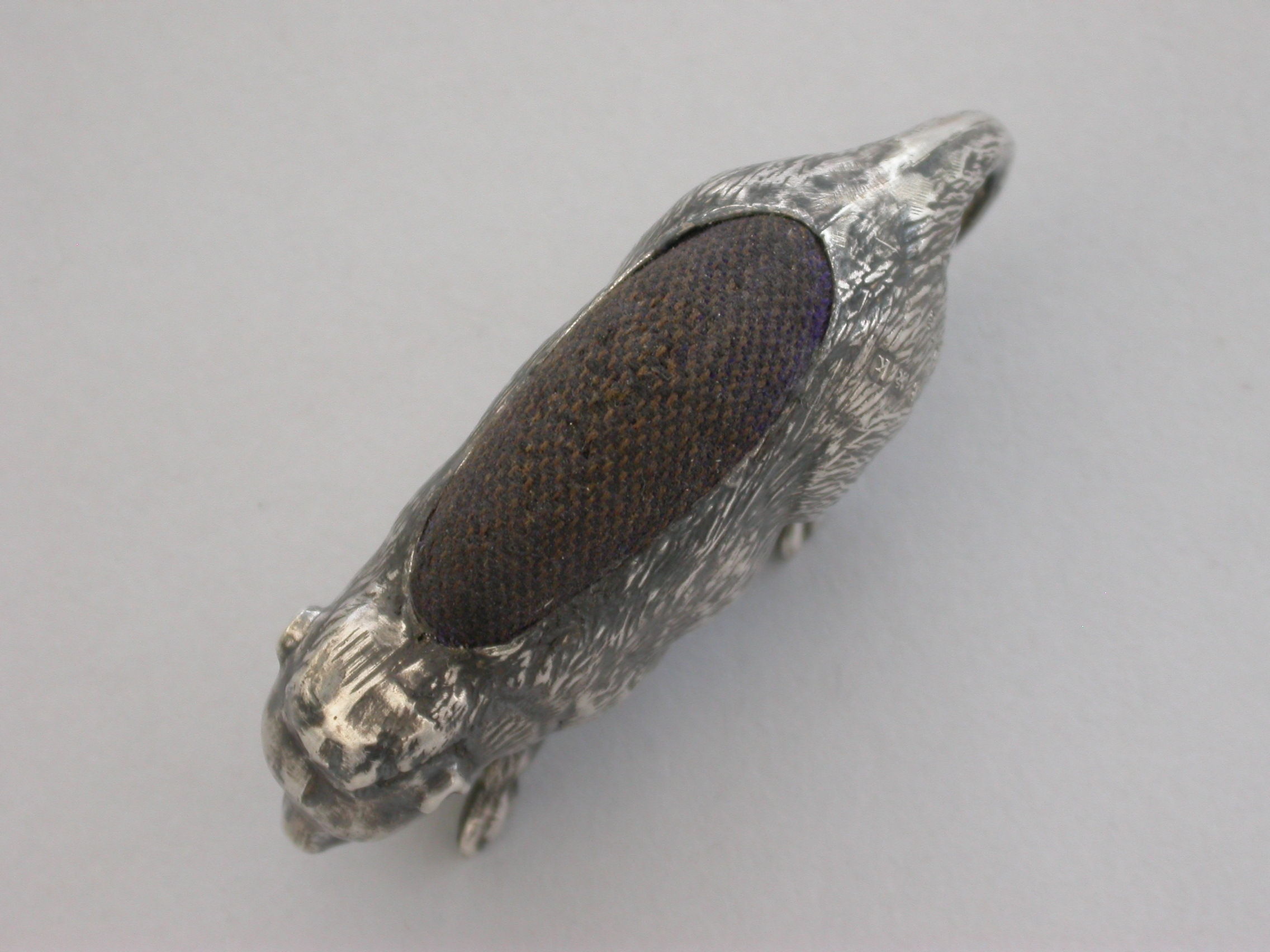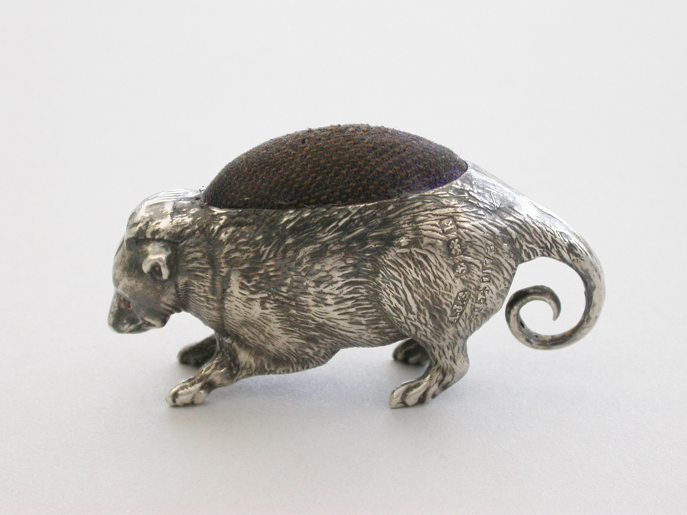 An extremely rare Edwardian novelty silver Pin Cushion made in the form of a Possum, with naturalistically textured fur and complete with original velvet cushion.