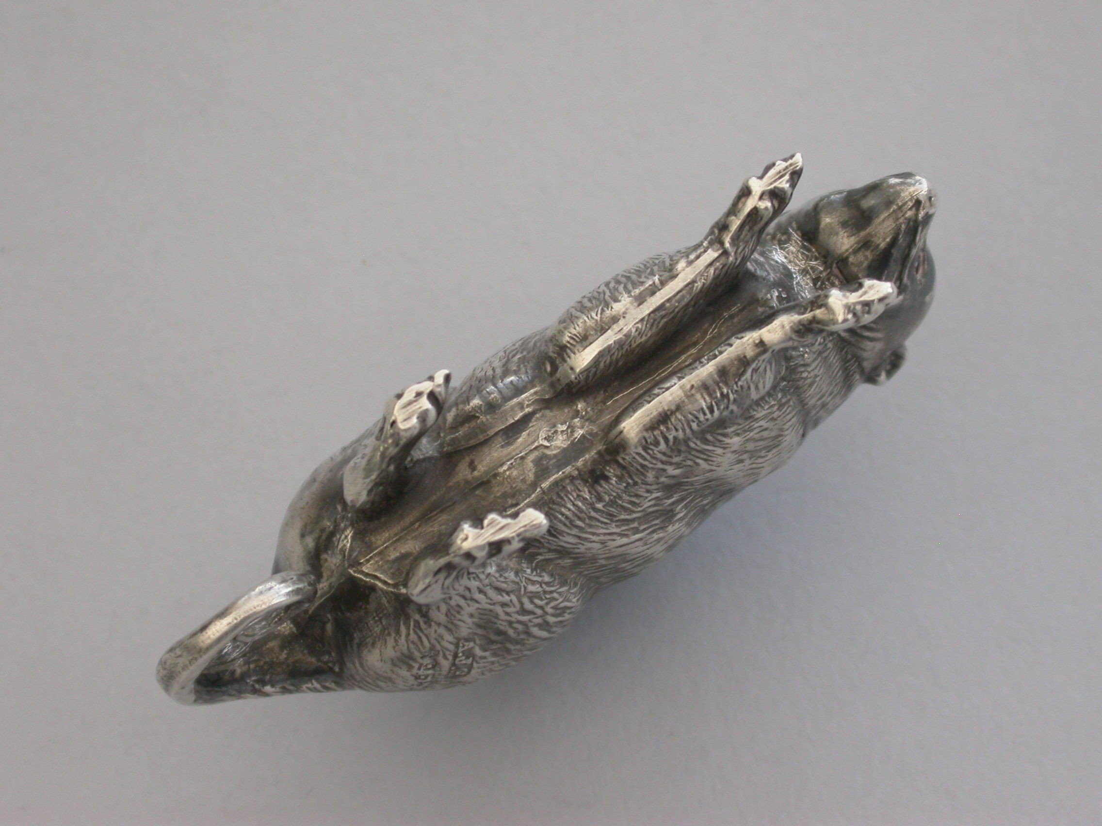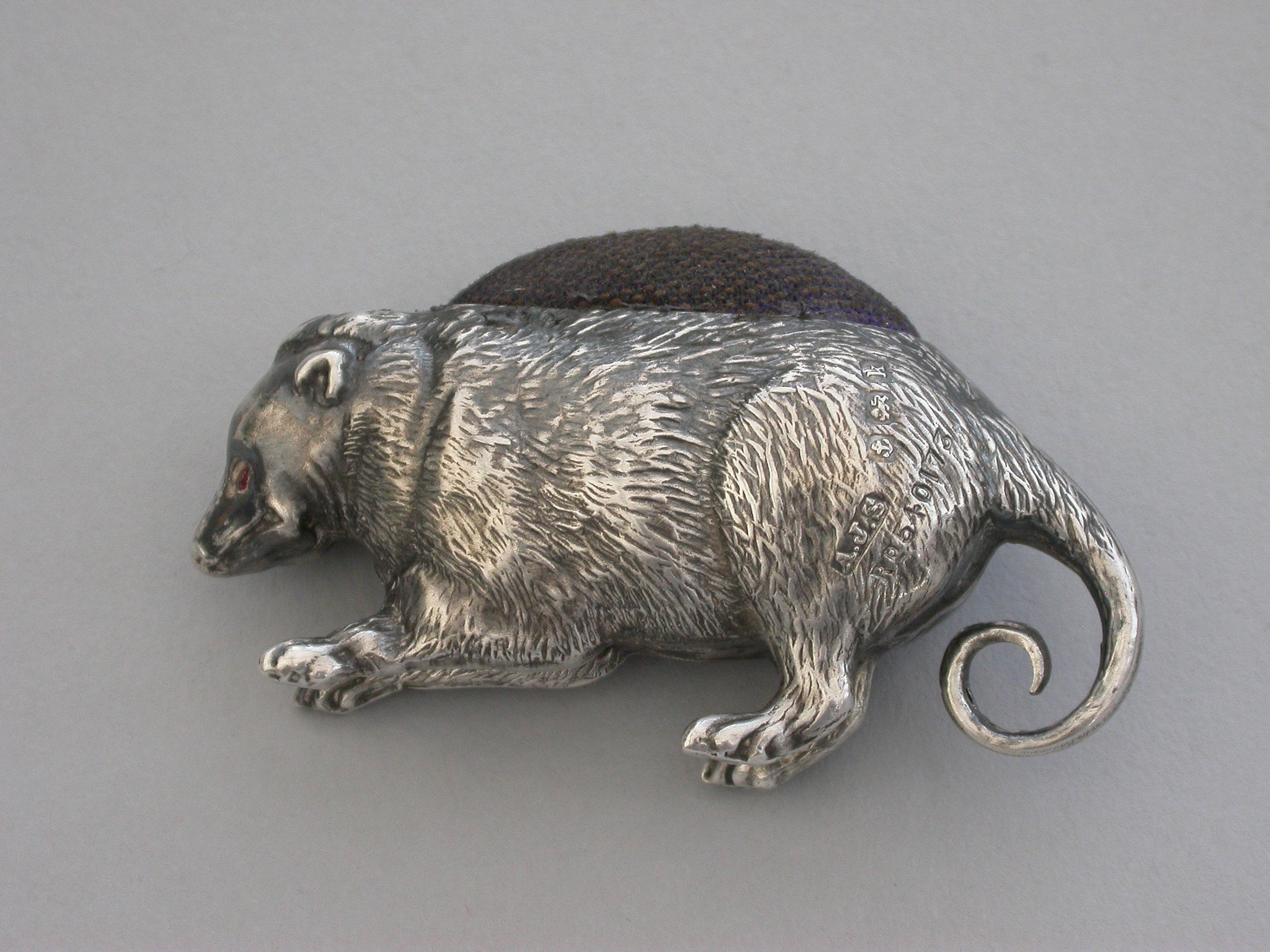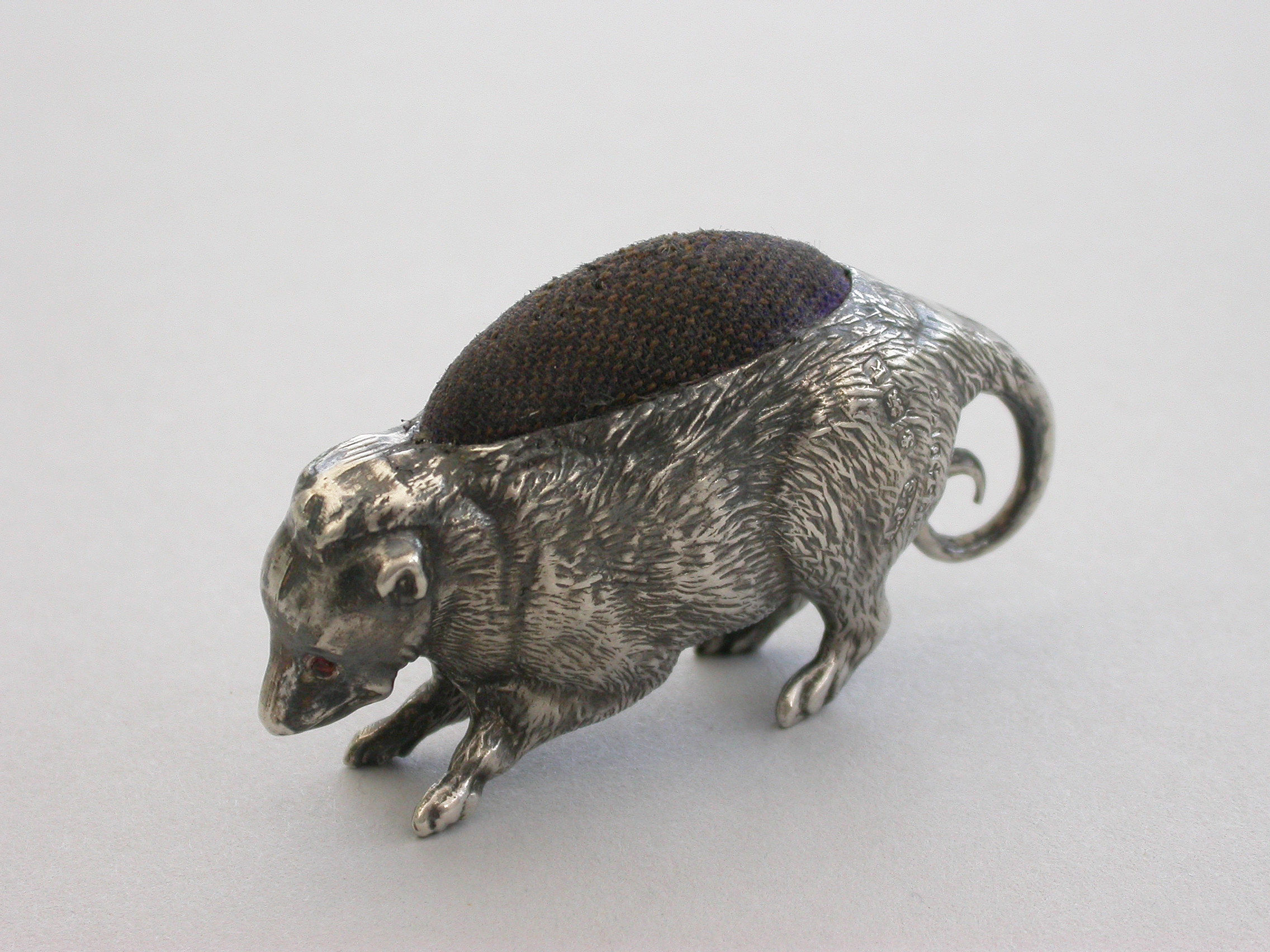 An extremely rare Edwardian novelty silver Pin Cushion made in the form of a Possum, with naturalistically textured fur and complete with original velvet cushion.
