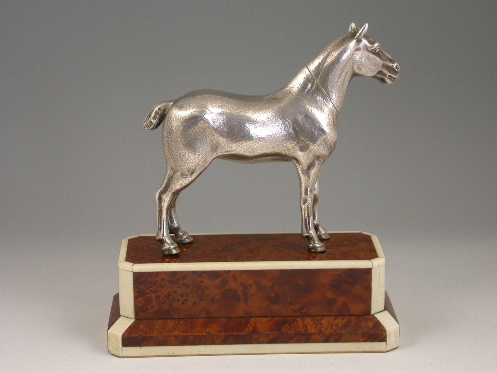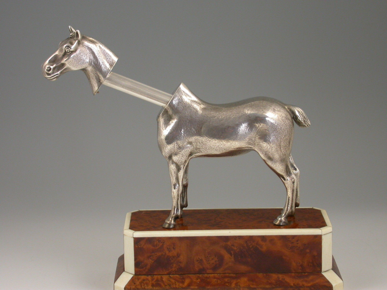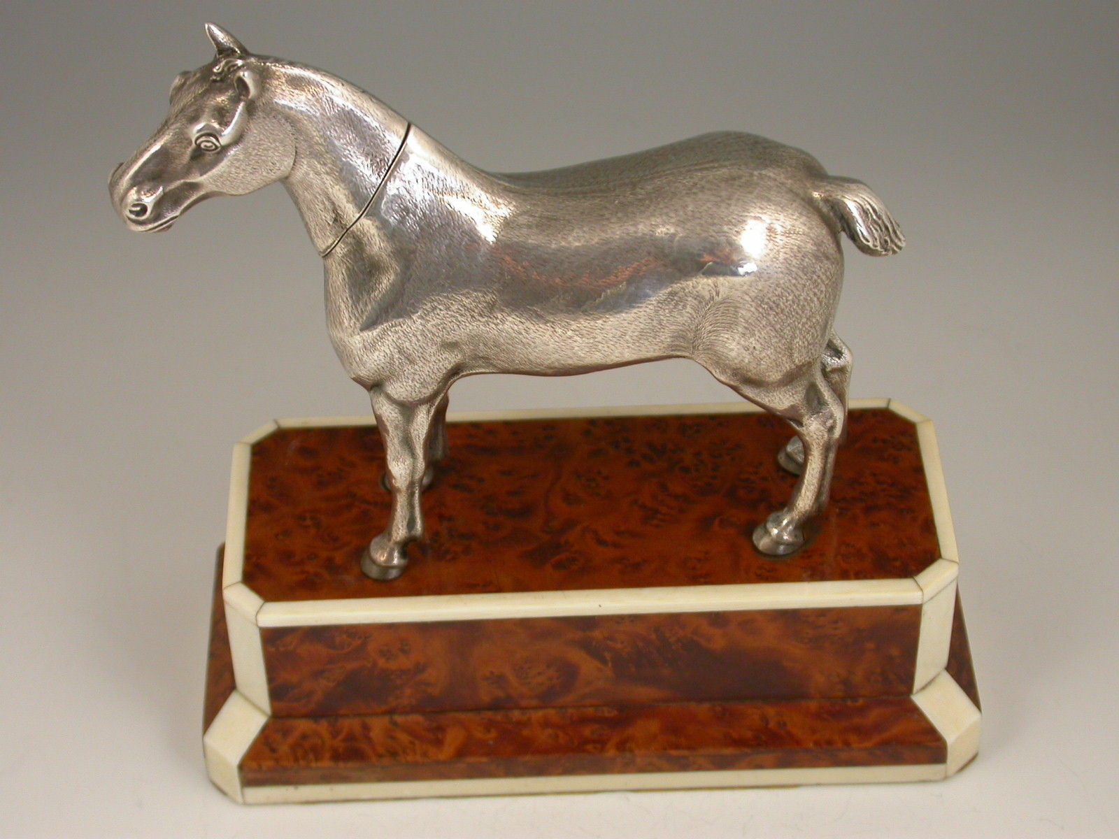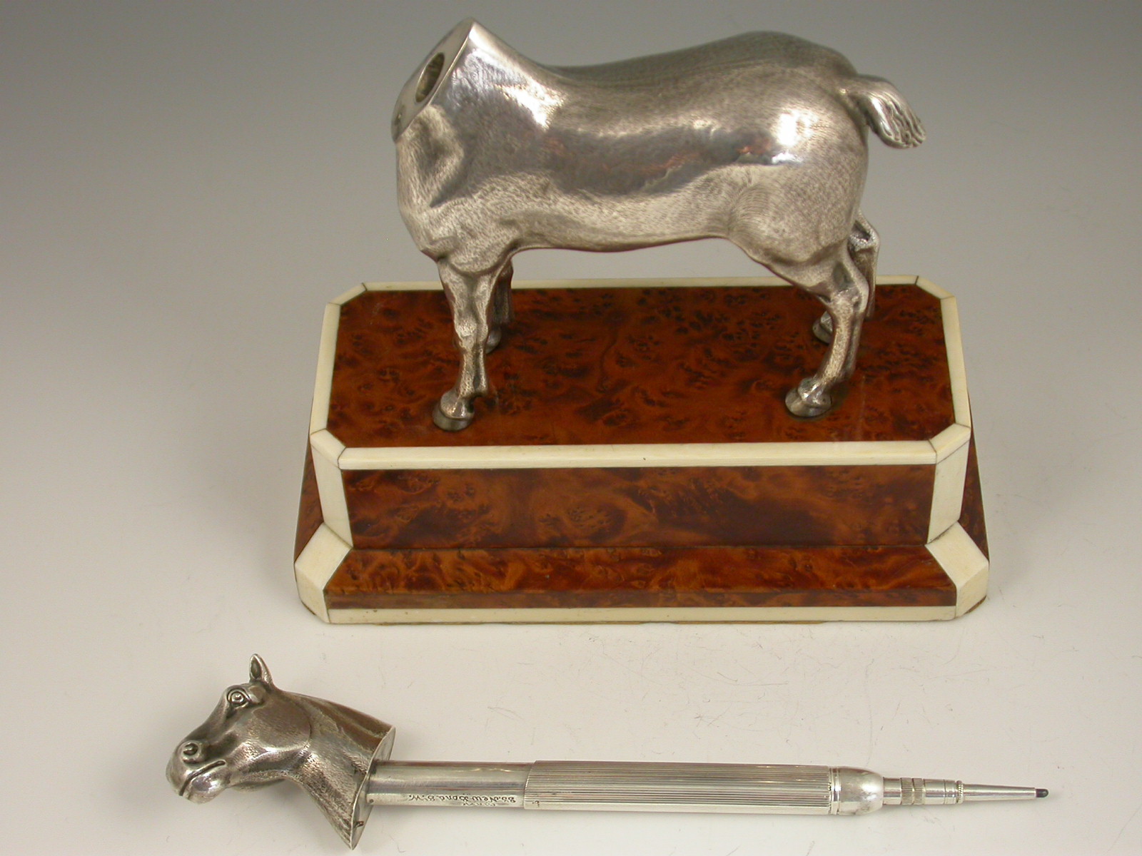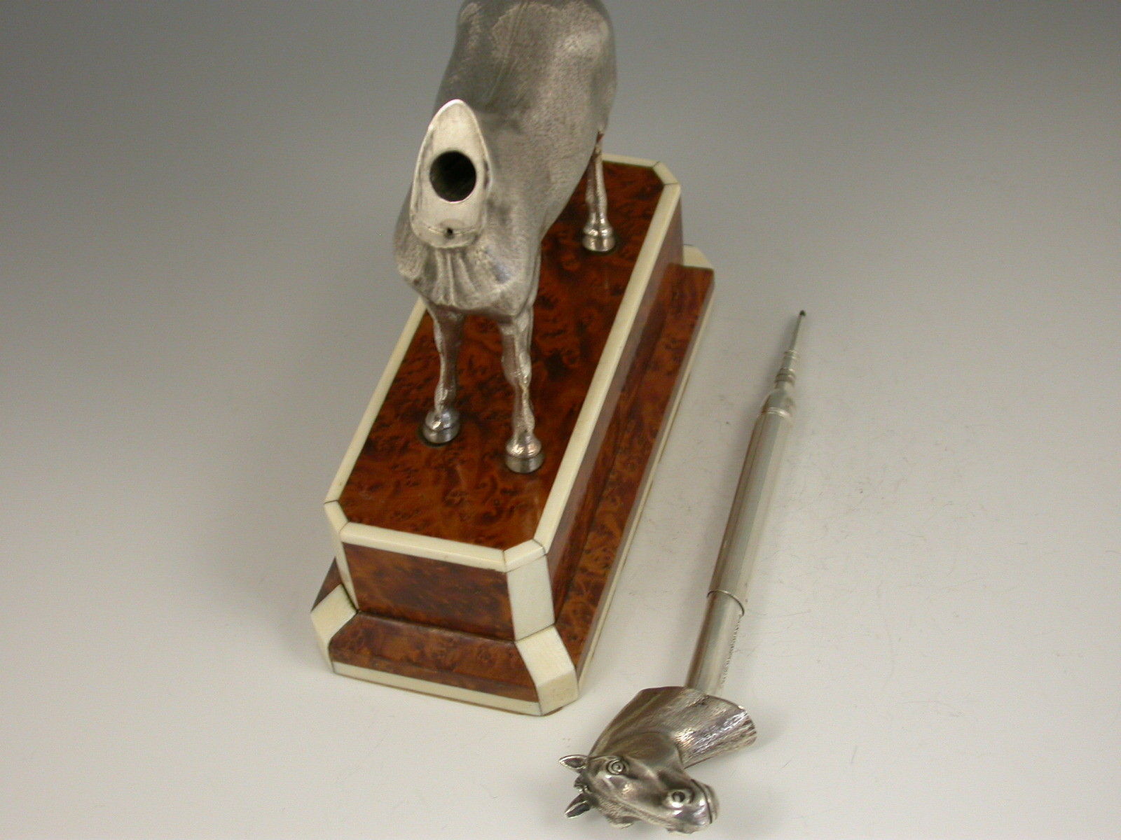 An extremely rare Edwardian novelty silver Propelling Pencil finely modelled as a hunting cob, standing on a walnut and ivory plinth. The detachable head extending into a telescopic Propelling Pencil.