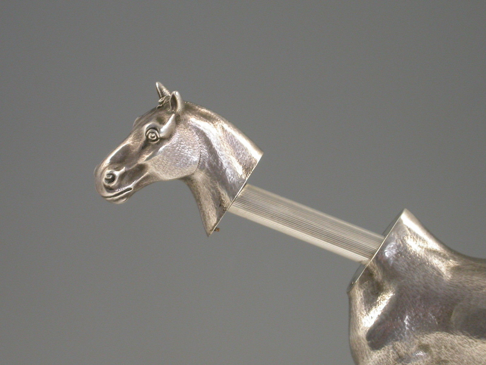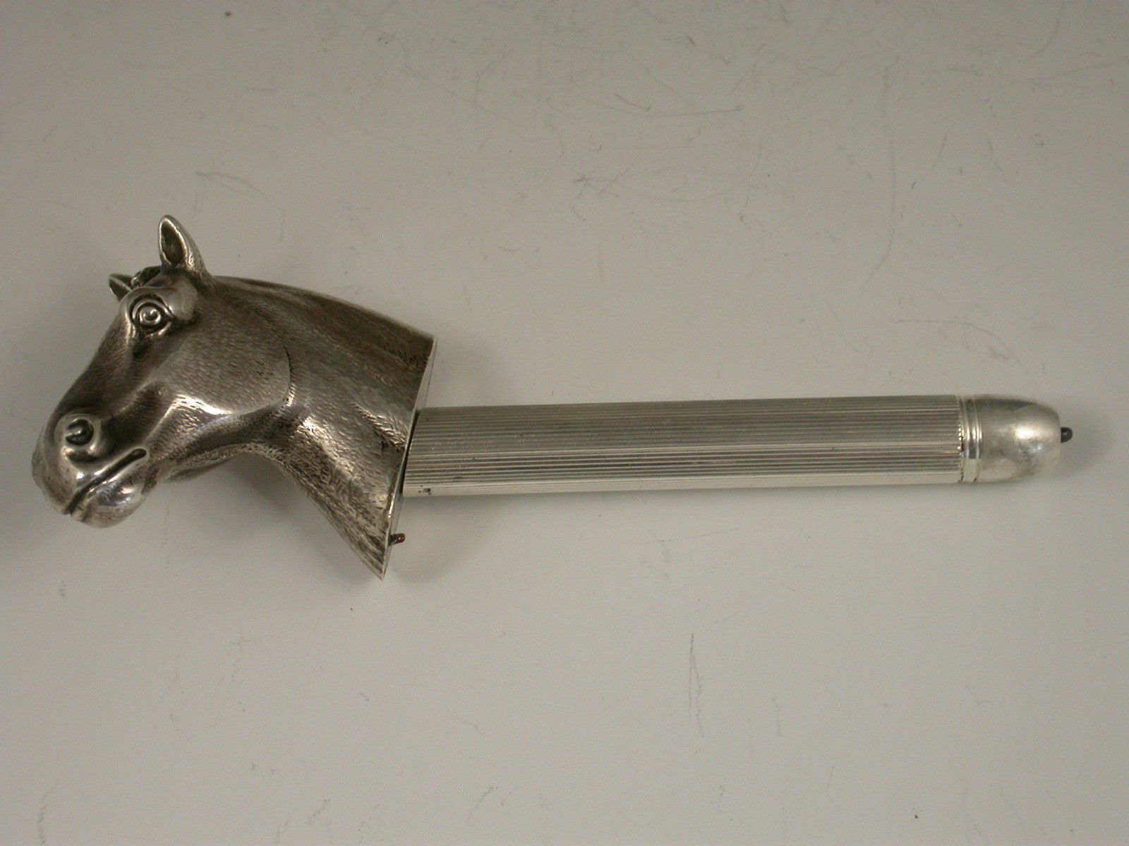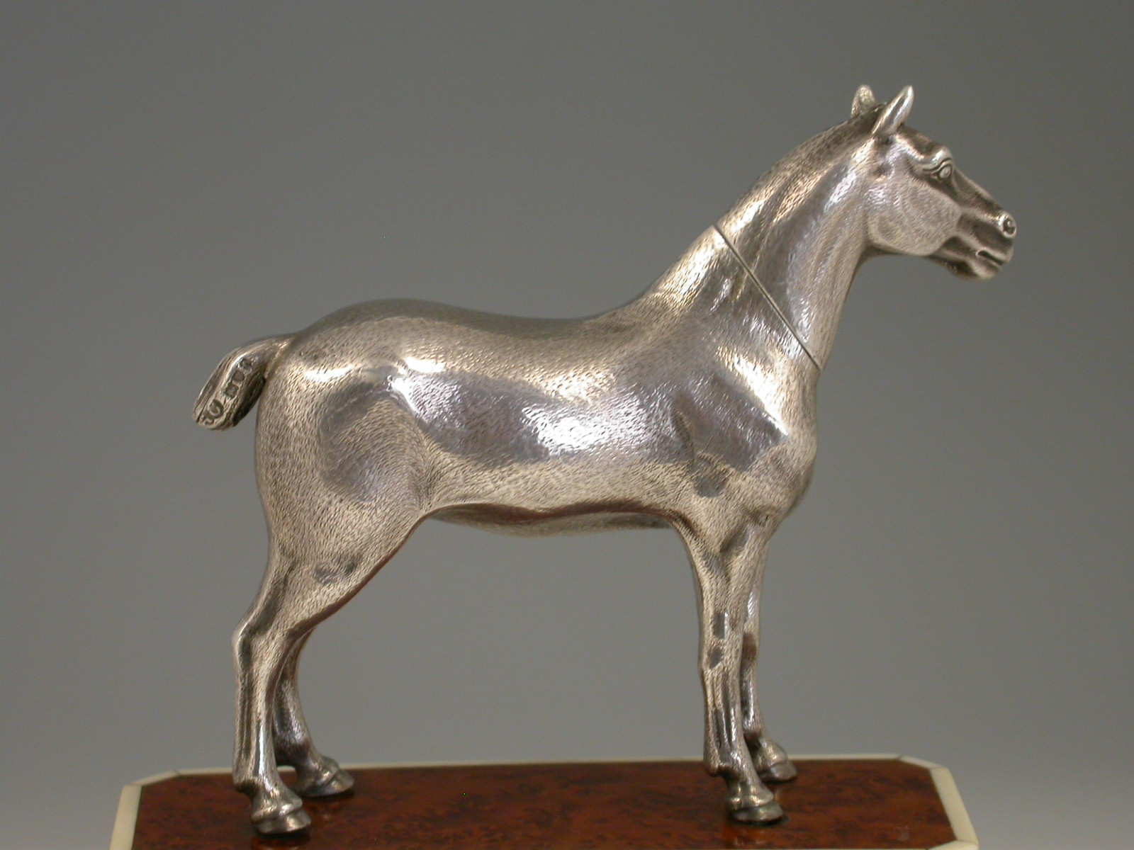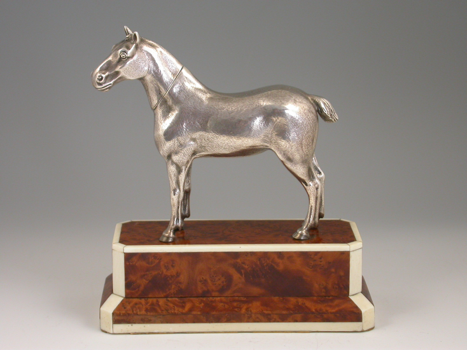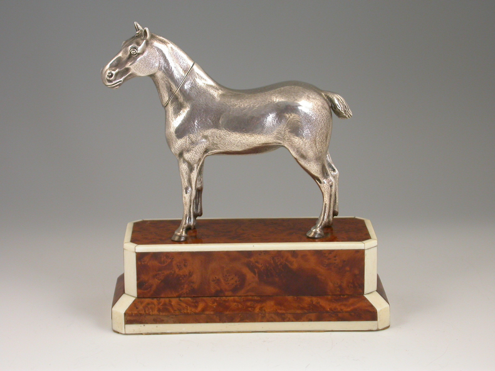 An extremely rare Edwardian novelty silver Propelling Pencil finely modelled as a hunting cob, standing on a walnut and ivory plinth. The detachable head extending into a telescopic Propelling Pencil.