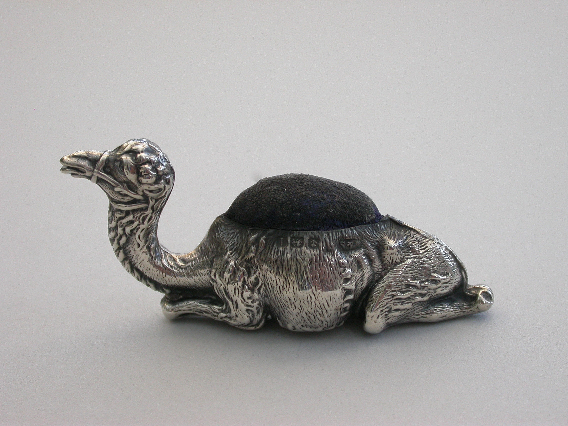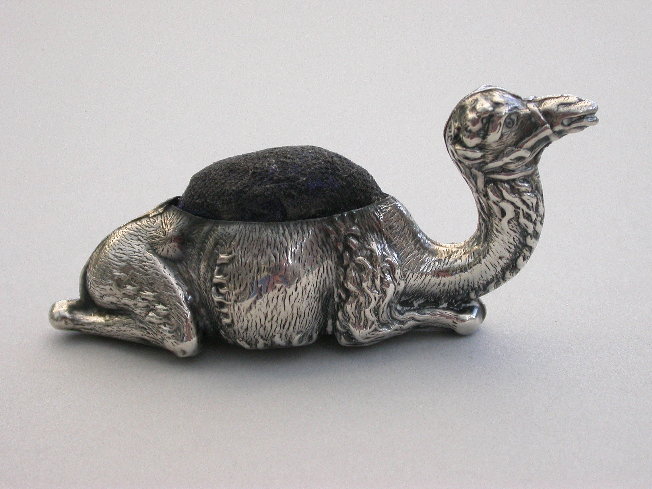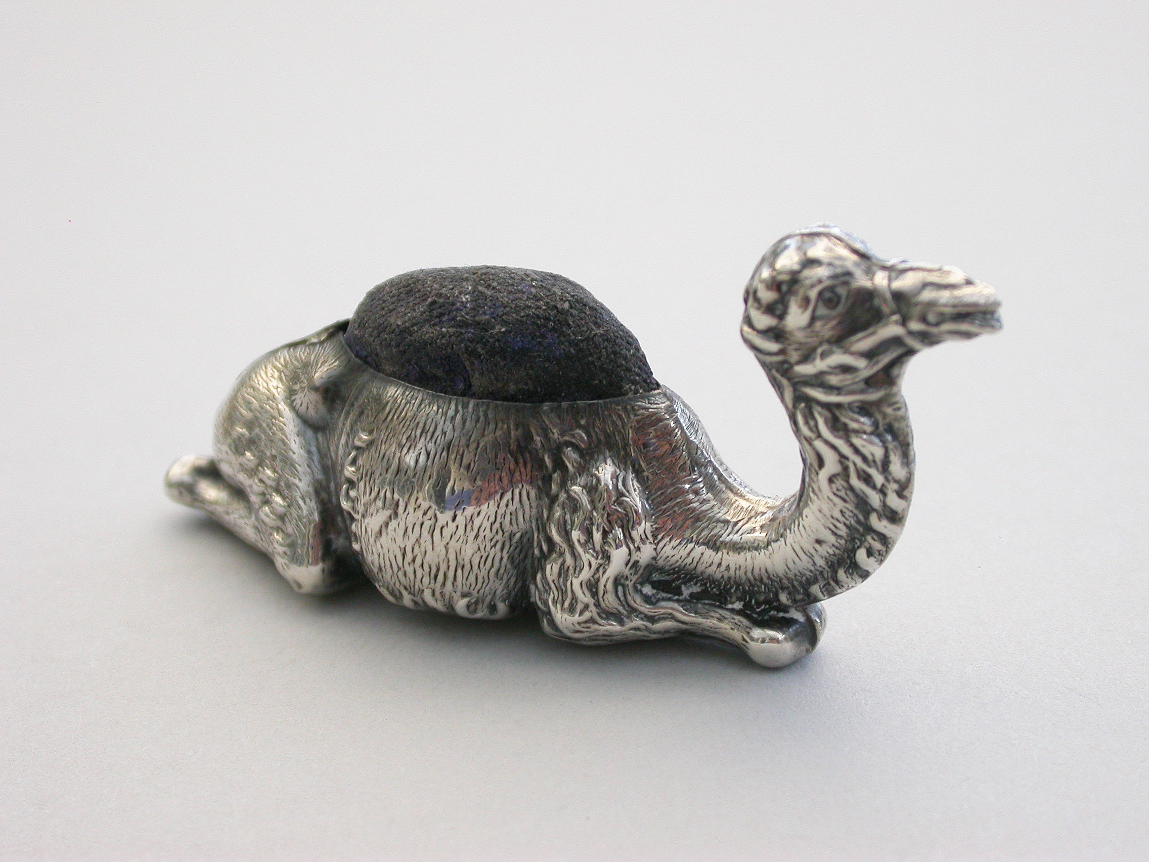 A rare Edwardian novelty silver Pin Cushion made in the form of a recumbent Camel, complete with original cushion and the smaller of the two known sizes.
